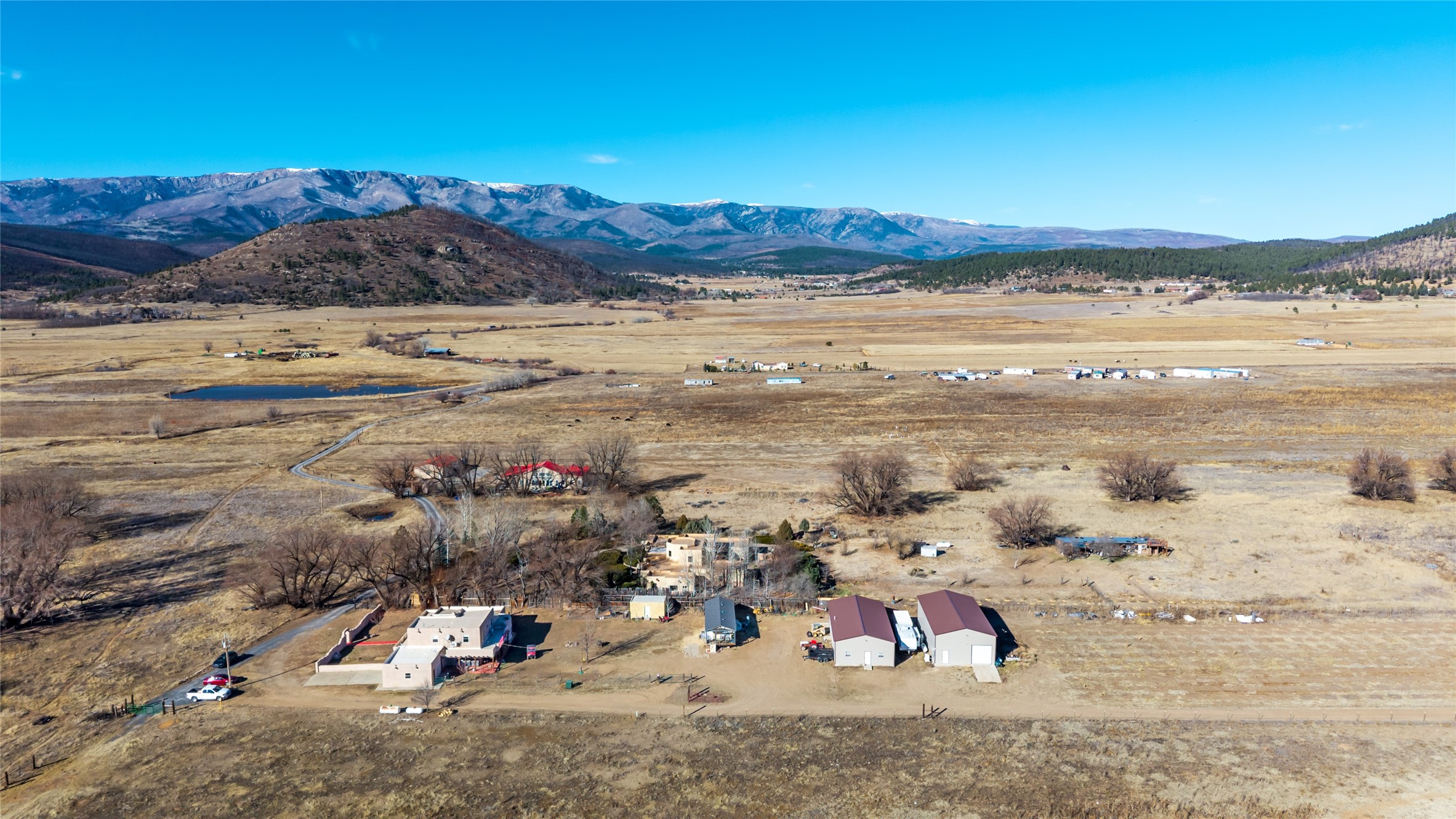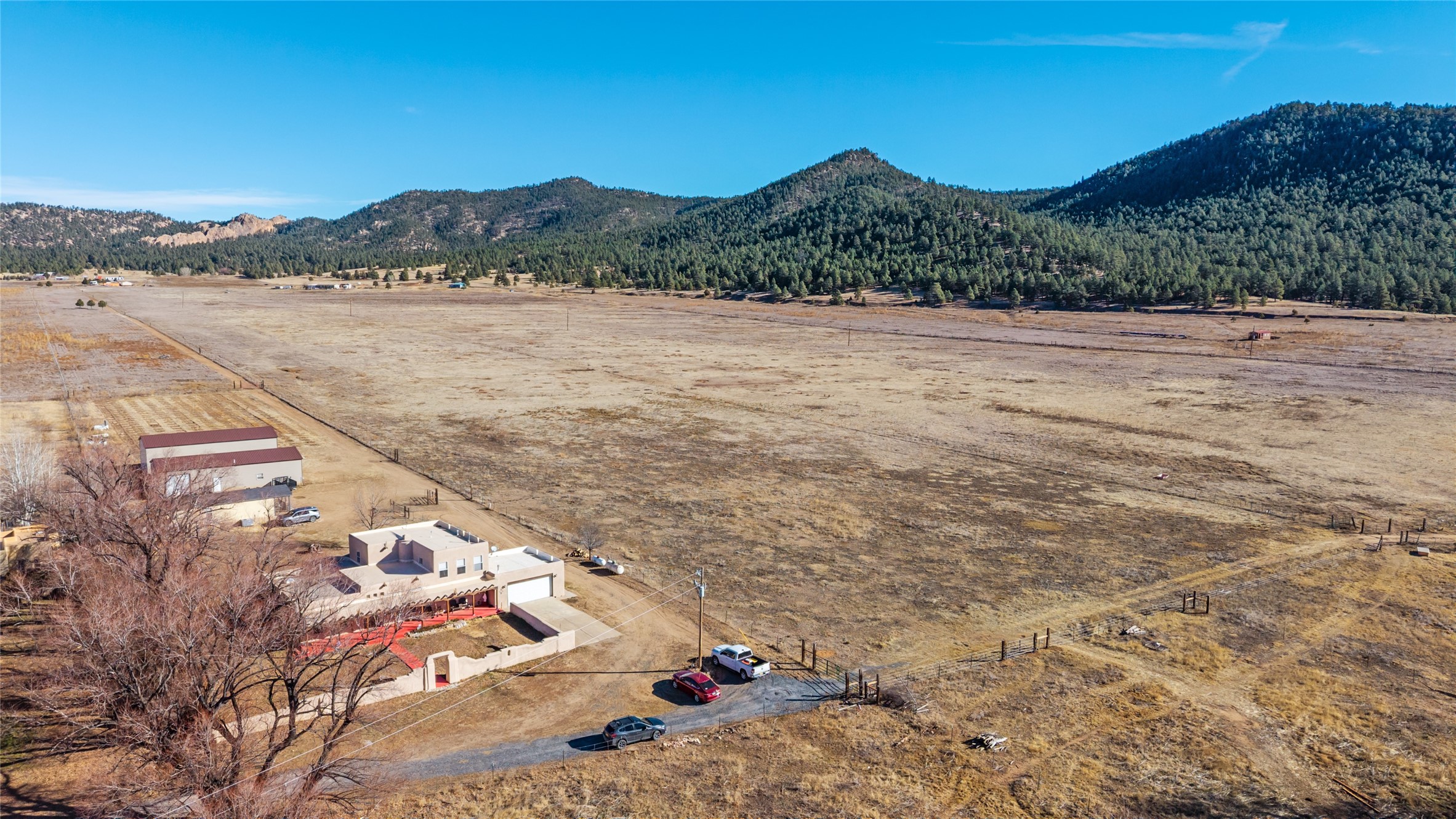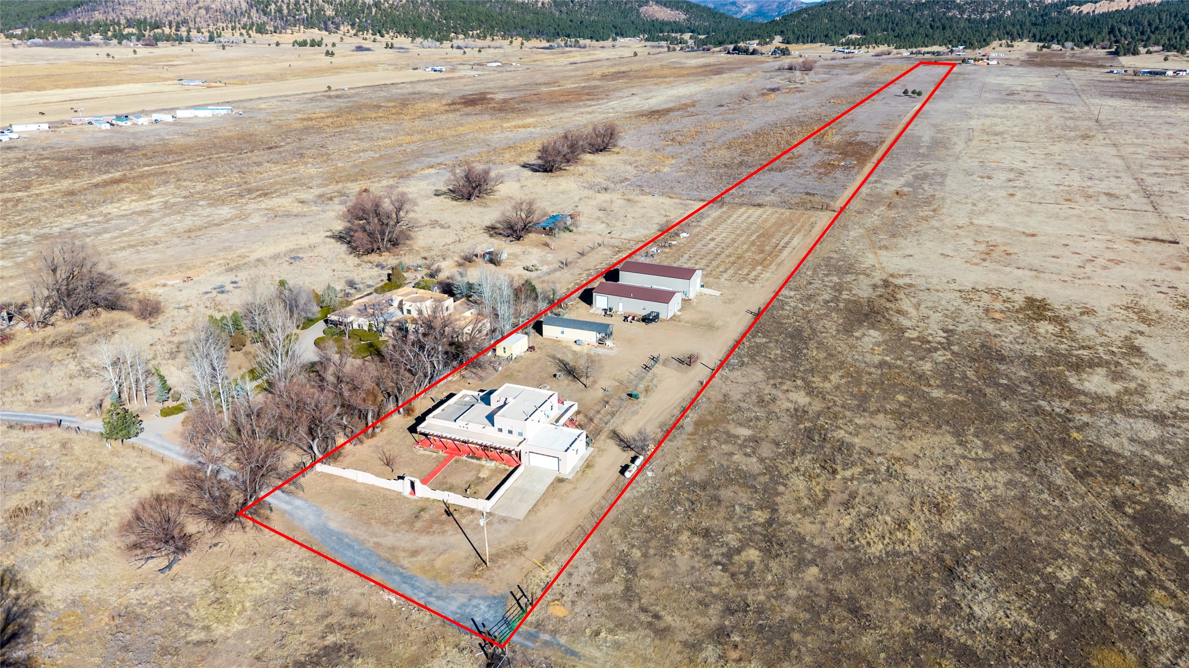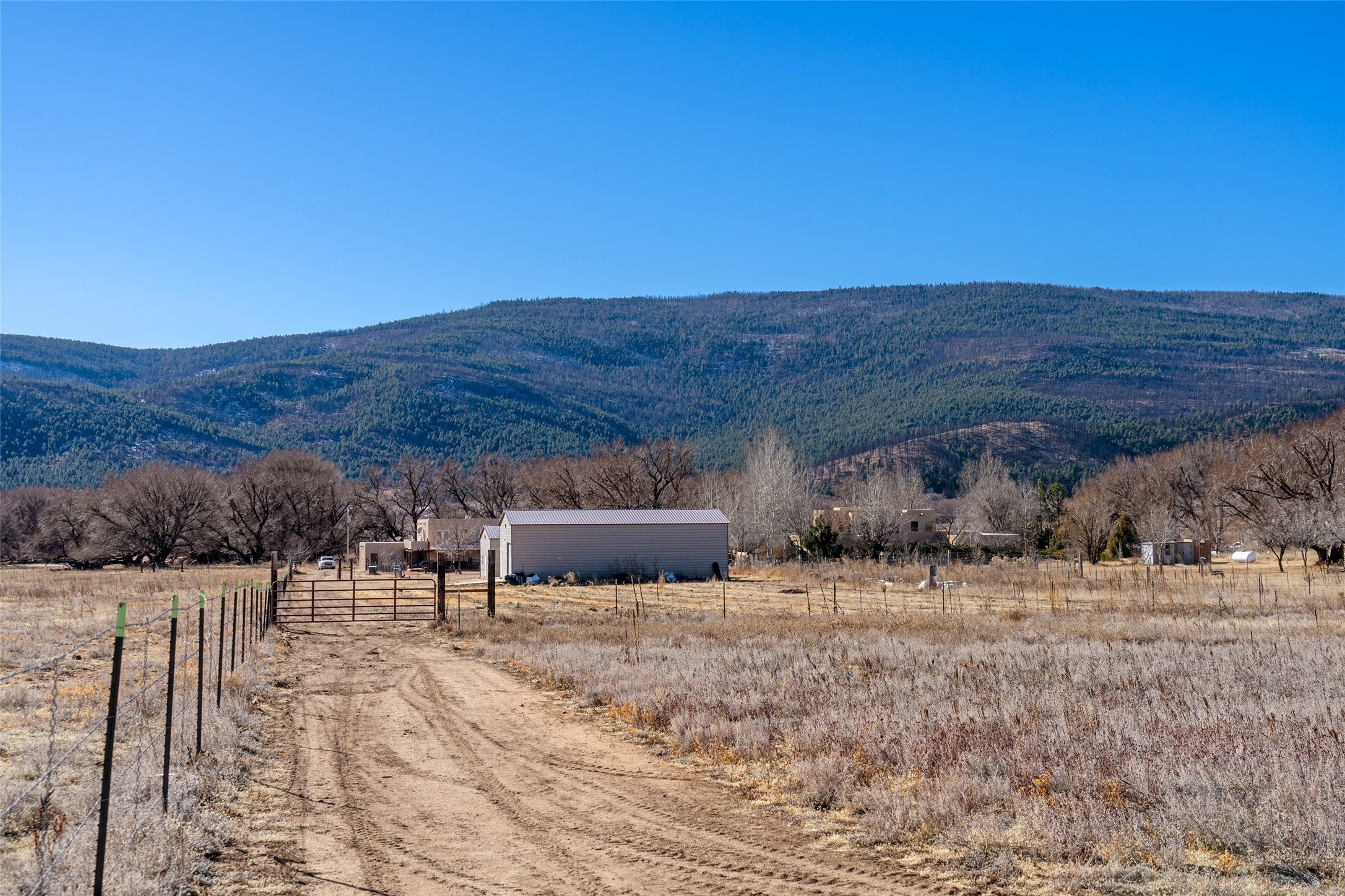 Located in Ledoux, this modern two-story Santa Fe-style estate pairs refined living with a true, working agricultural setup. The main residence spans approximately 3,046 square feet and offers 3 bedrooms and 3 baths, a welcoming front courtyard, and a two-car garage. Thoughtful design elements and elevated views create a home that feels private, open, and built for everyday comfort as well as entertaining. Beyond the main house, the property is equipped for serious, year-round operations. A separate manufactured guest home provides 1 bedroom and 1 baths--ideal for extended family, staff housing, or flexible rental use. Two commercial-grade barns one with climate control and one with dedicated administrative areas support efficient production, storage, and management in every season. The land is flat, usable, and well-suited for equipment access, planting, and expansion. A permitted agricultural well anchors the property's long-term utility and makes this more than a beautiful residence-it's a rare opportunity to own a one-of-a-kind agricultural compound with infrastructure already in place. Enjoy wide-open skies, space to grow, and the convenience of being within reach of Northern New Mexico's towns, recreation, and culture. Properties with this combination of home, guest quarters, and commercial AG facilities are exceptionally hard to find.
