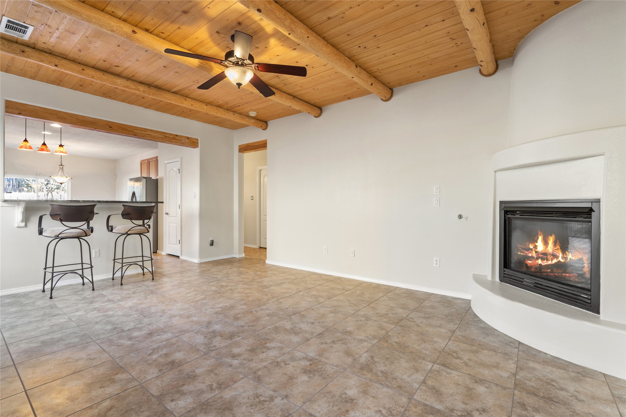 Welcome home to the desirable Villa Sonata neighborhood, where comfort and convenience come together just minutes from Santa Fe's Historic Plaza.Step inside to lofty ceilings that provide the Santa Fe charm with vigas and wood beams, and a warm gas fireplace anchoring the living room, creating an inviting space ideal for both everyday living and entertaining. The open-concept floor plan seamlessly connects the living, dining, and kitchen areas, providing a bright and flexible layout that is perfect for hosting friends and family.This spacious 2-bedroom, 2-bath residence also includes a versatile flex space that can serve as a home gym, media room, office, or potential third bedroom. The kitchen is equipped with new stainless steel appliances, including a gas range, built-in microwave, dishwasher, refrigerator, and double built-in ovens.Additional features include central air conditioning, tile flooring throughout the main living areas, brand-new carpet in the bedrooms, and a new Samsung washer and dryer.The primary suite offers a generous walk-in closet, soaking tub, and step-in shower. Outdoors, enjoy a private back patio and enclosed backyard--ideal for pets, gardening, or relaxing in Santa Fe's beautiful climate.A two-car garage and a new TPO roof with a warranty provide peace of mind and long-term value.Located just moments from coffee shops, Trader Joe's, Whole Foods, acclaimed restaurants, and all the culture and charm of downtown Santa Fe, this home delivers the perfect balance of lifestyle and location.