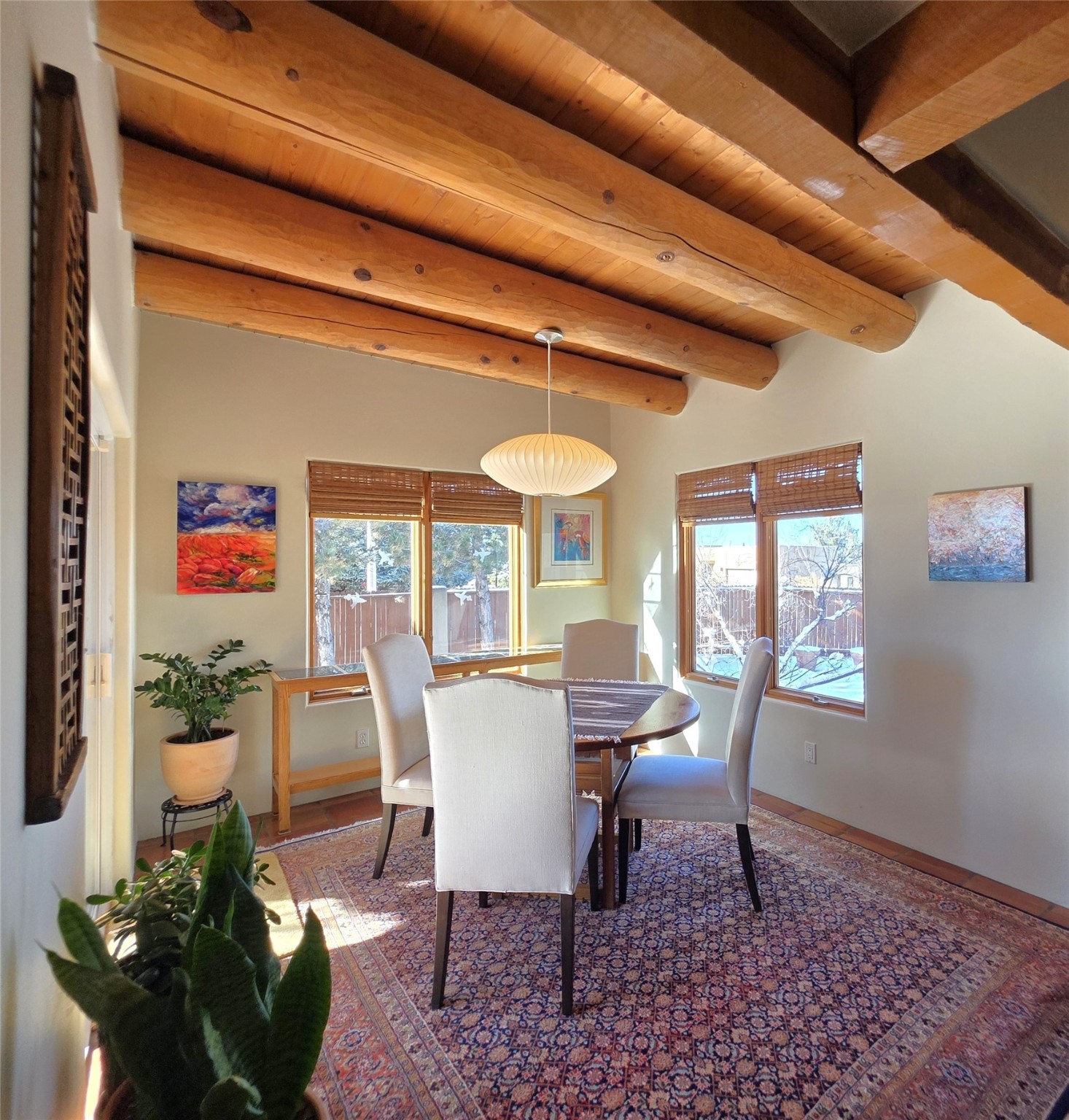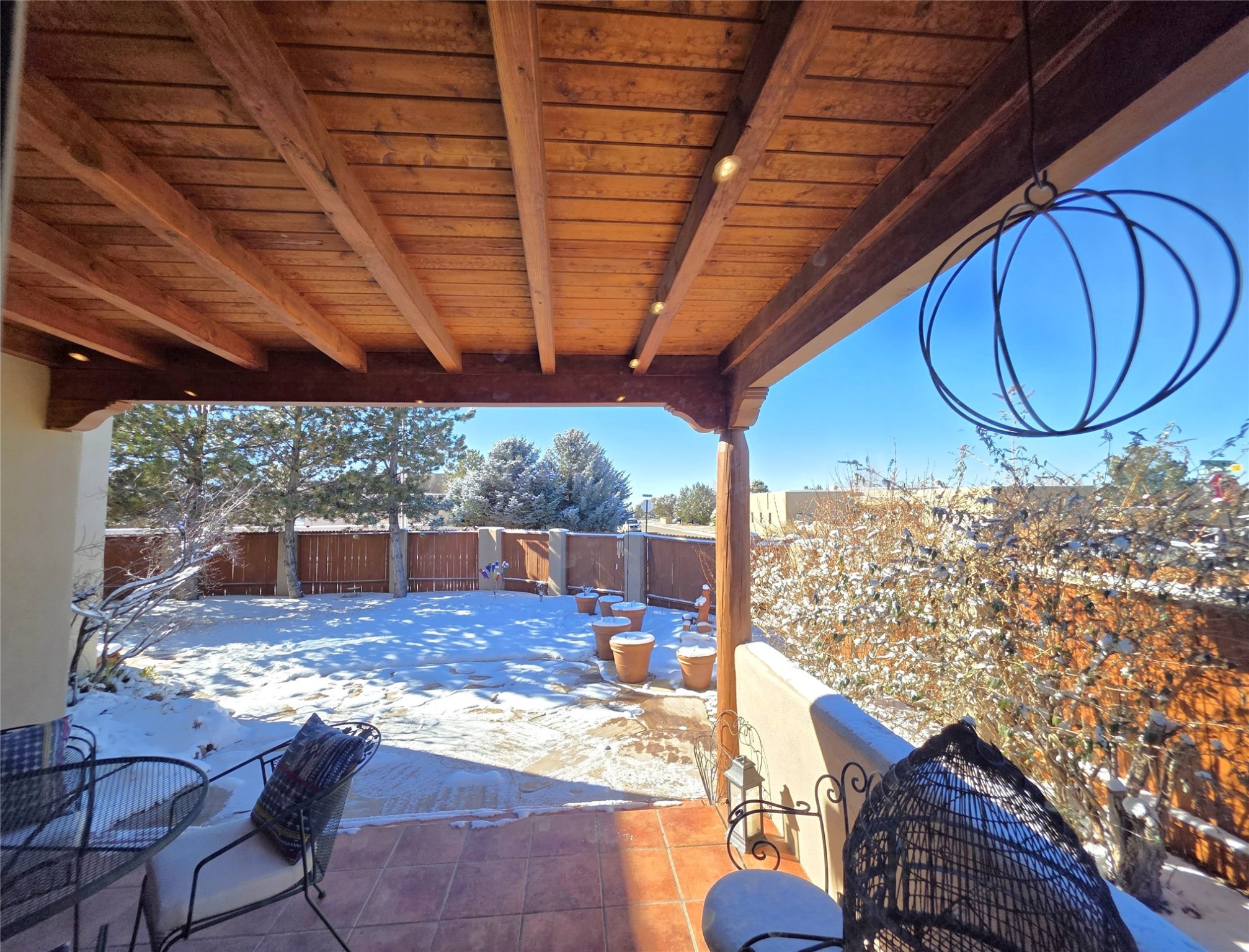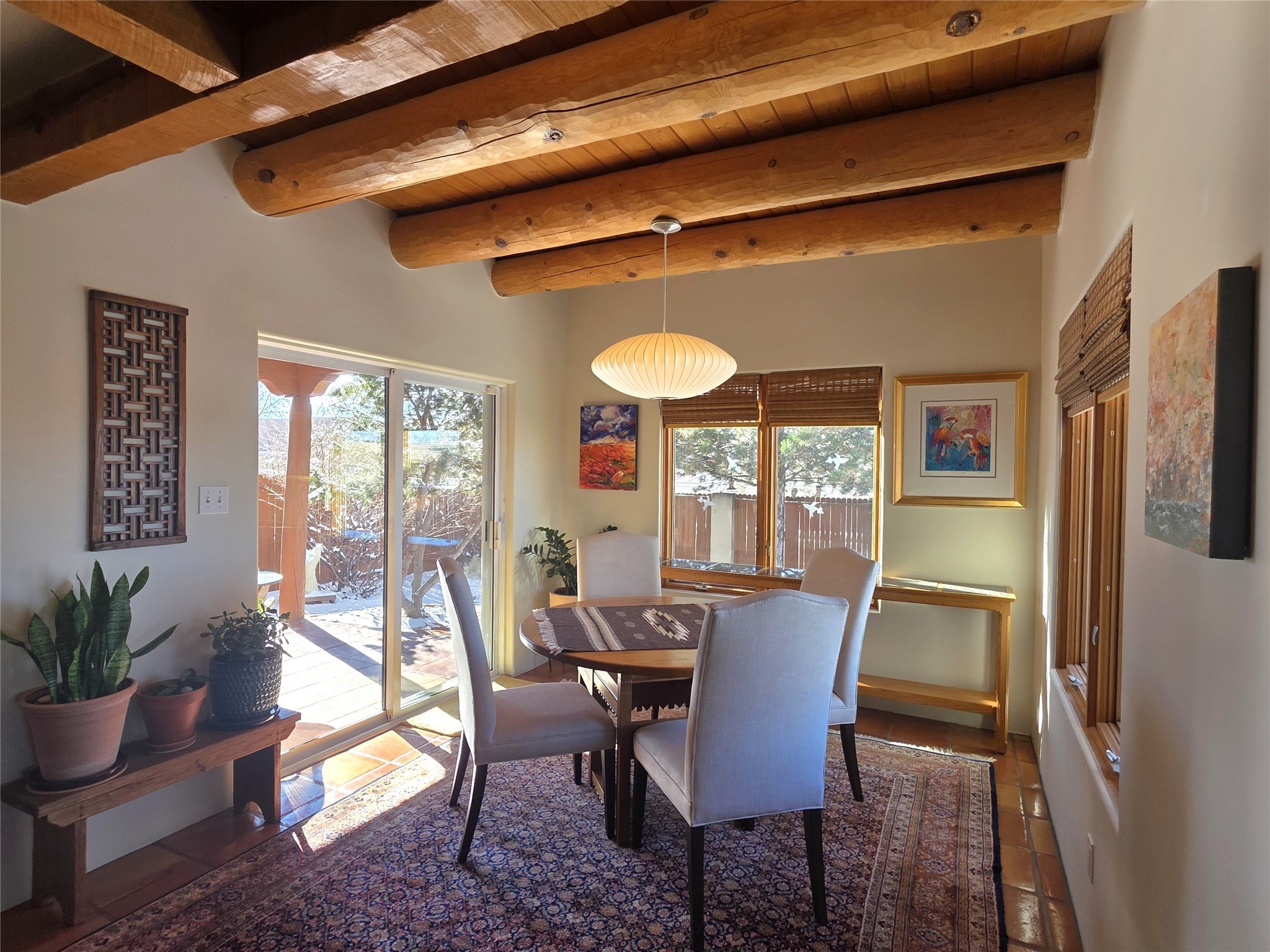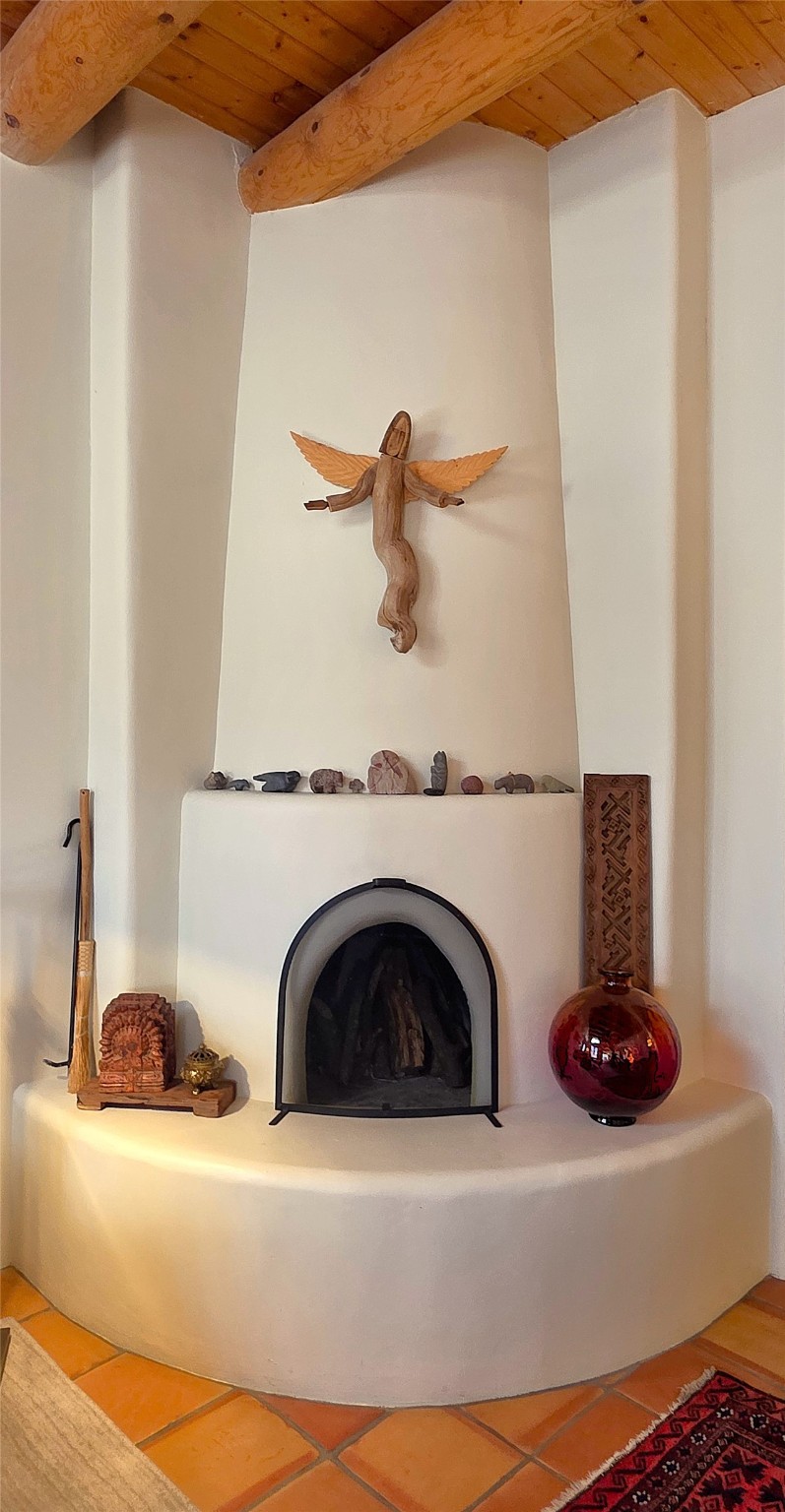 Set on a corner lot in Pueblos Del Sol, 3 bedrooms, 2 full baths 1,468 sq.ft., this inviting Santa Fe-style home blends timeless architecture with thoughtful livability. From the moment you enter, soaring ceilings, hand-crafted vigas and beams, a traditional kiva fireplace, and warm Saltillo tile floors create an atmosphere that feels both authentic and welcoming. The dining room frames beautiful views, opening to a covered patio where mature landscaping and quiet surroundings invite morning coffee or evening gatherings. The well-designed floor plan offers excellent separation, with a serene primary suite featuring a walk-out patio, westerly views, a generous walk-in closet, and a private bath.With radiant in-floor heating, a finished two-car garage, and a fully fenced yard, this home offers comfort, privacy, and ease -- a true Santa Fe retreat that is ready to enjoy.