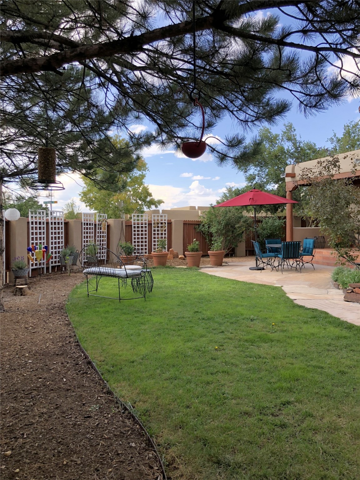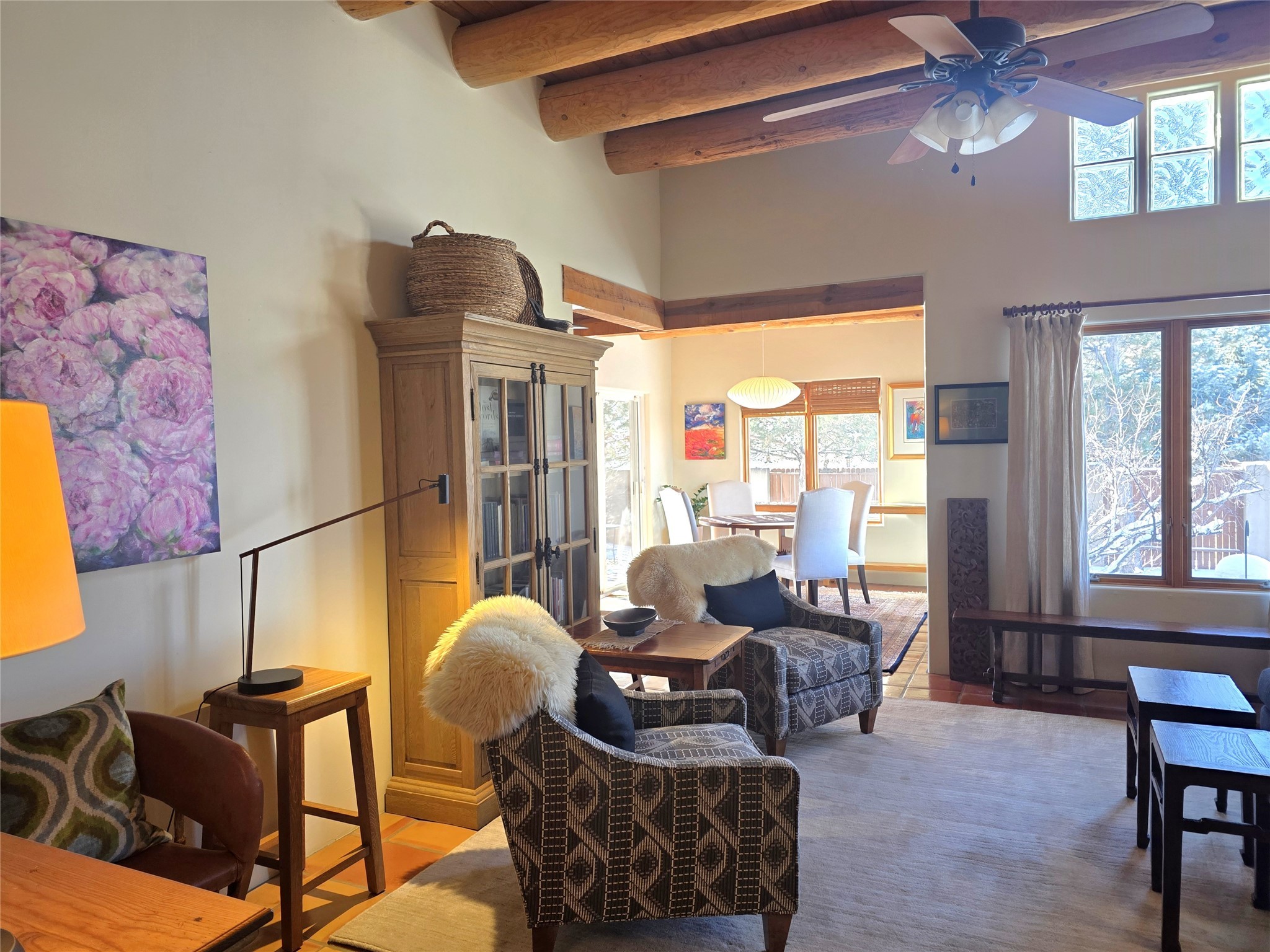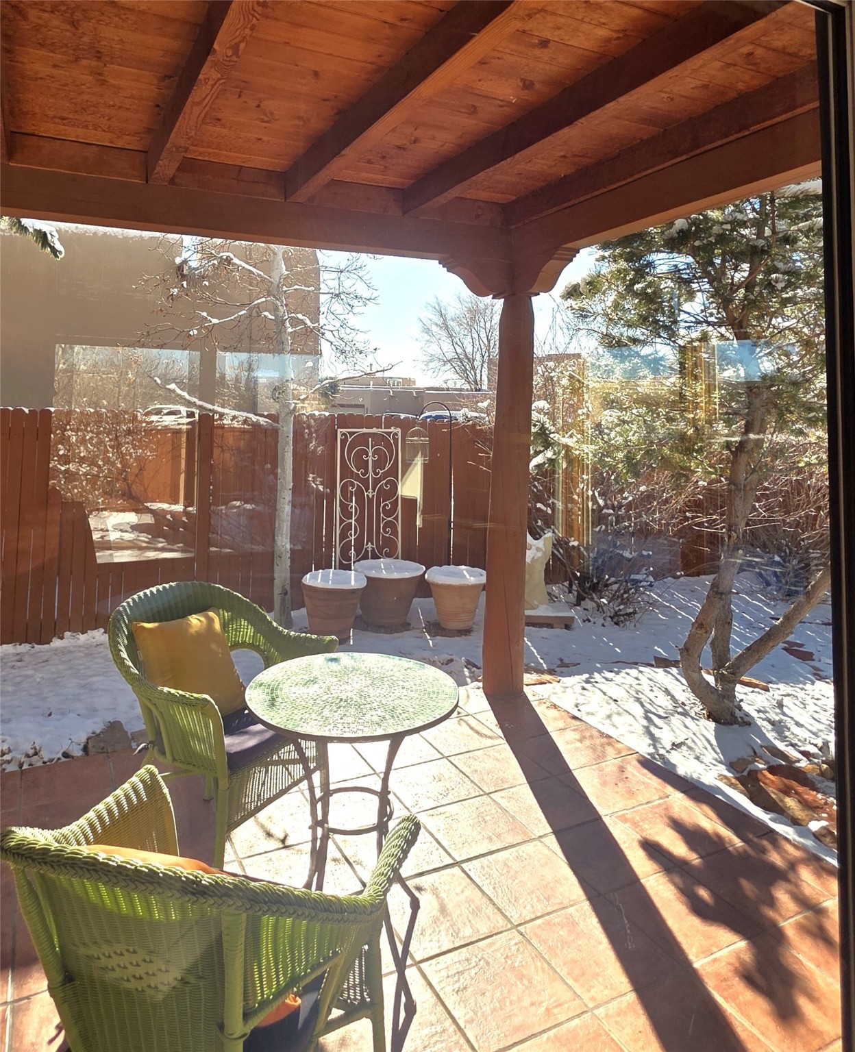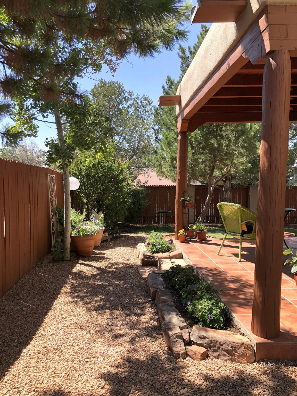 Set on a corner lot in Pueblos Del Sol, 3 bedrooms, 2 full baths 1,468 sq.ft., this inviting Santa Fe-style home blends timeless architecture with thoughtful livability. From the moment you enter, soaring ceilings, hand-crafted vigas and beams, a traditional kiva fireplace, and warm Saltillo tile floors create an atmosphere that feels both authentic and welcoming. The dining room frames beautiful views, opening to a covered patio where mature landscaping and quiet surroundings invite morning coffee or evening gatherings. The well-designed floor plan offers excellent separation, with a serene primary suite featuring a walk-out patio, westerly views, a generous walk-in closet, and a private bath.With radiant in-floor heating, a finished two-car garage, and a fully fenced yard, this home offers comfort, privacy, and ease -- a true Santa Fe retreat that is ready to enjoy.