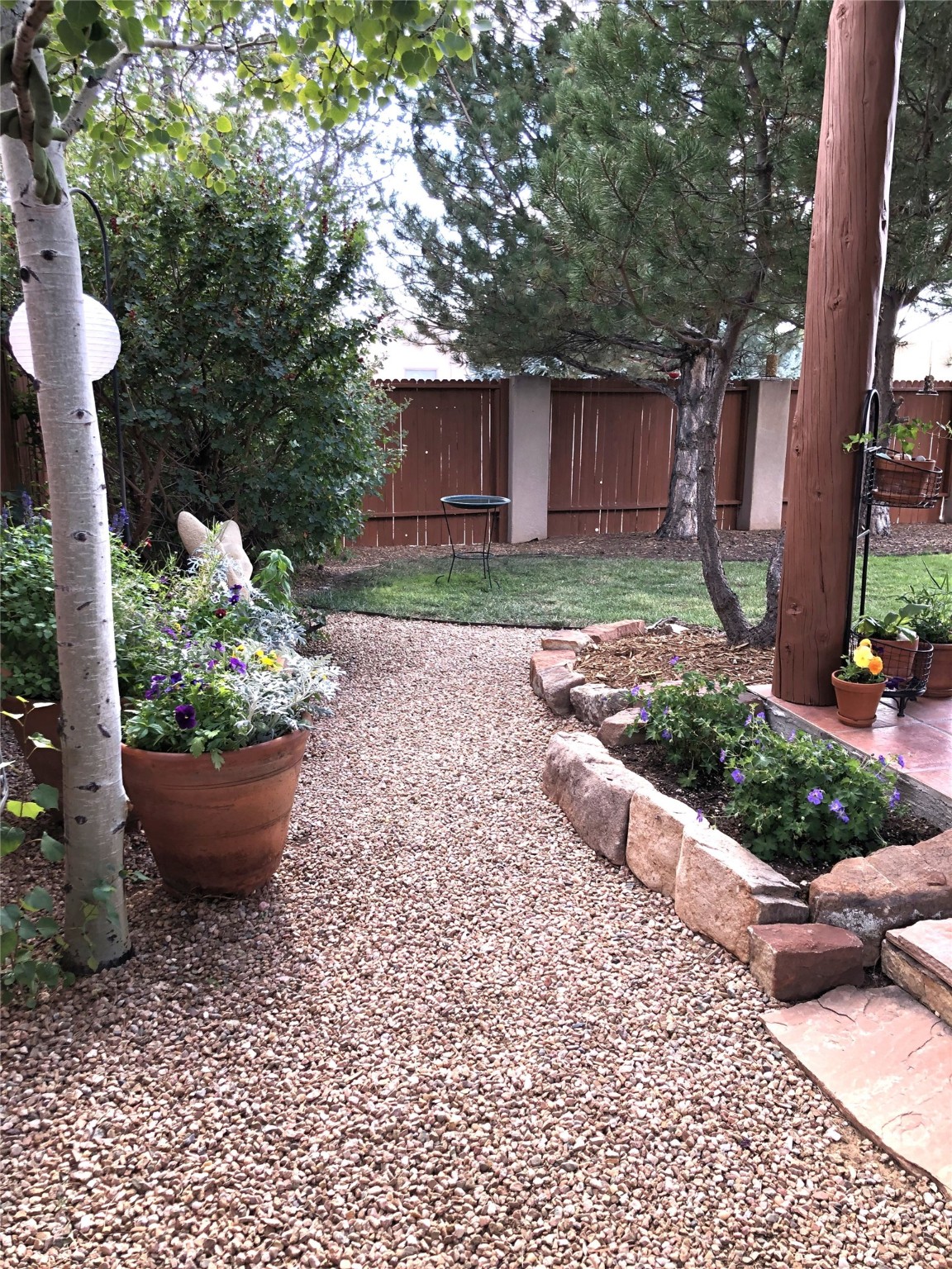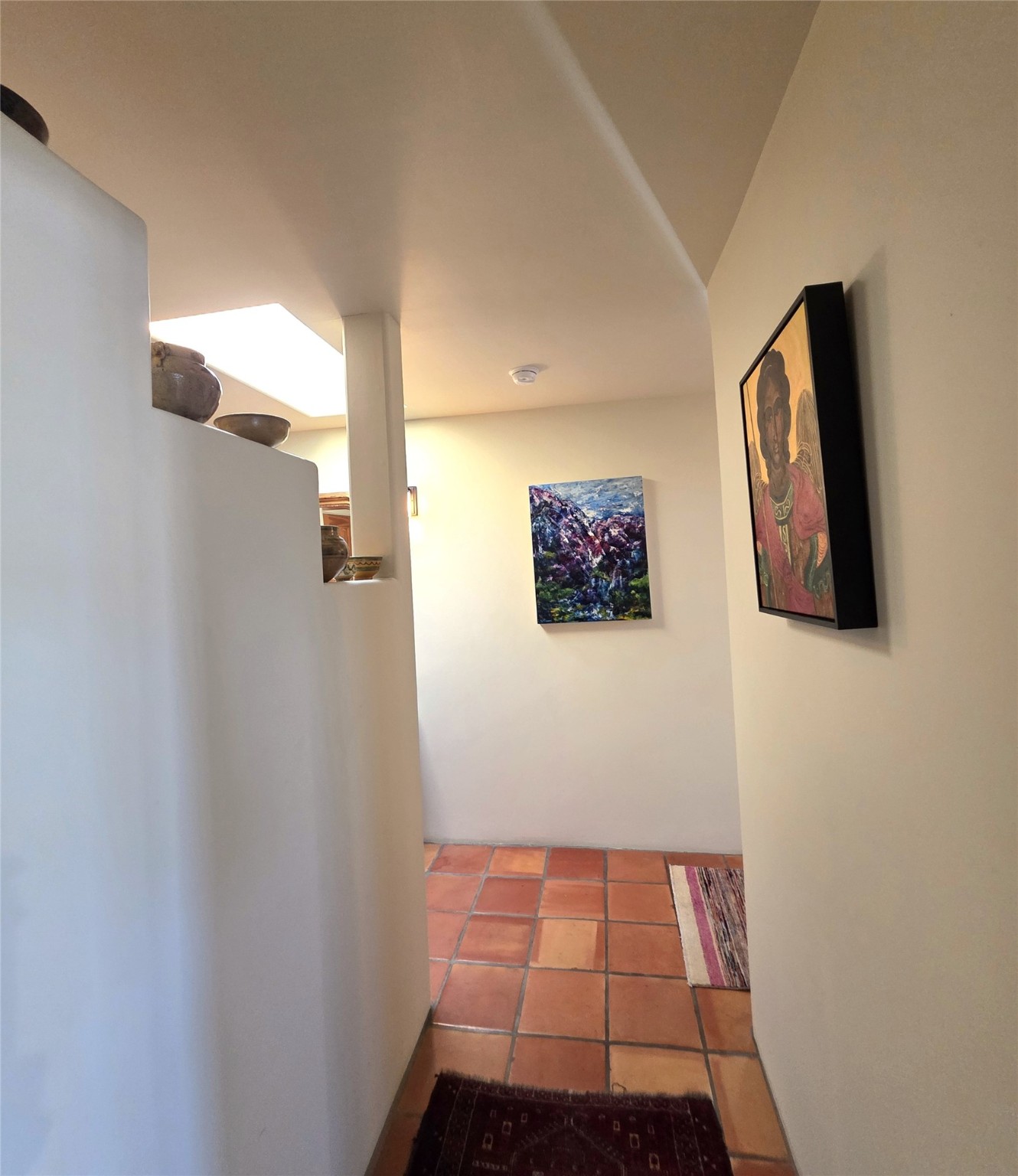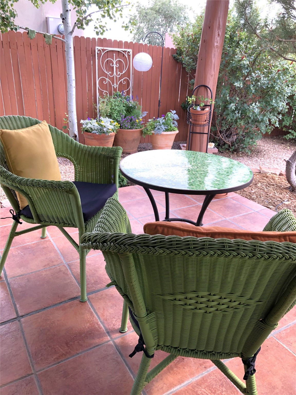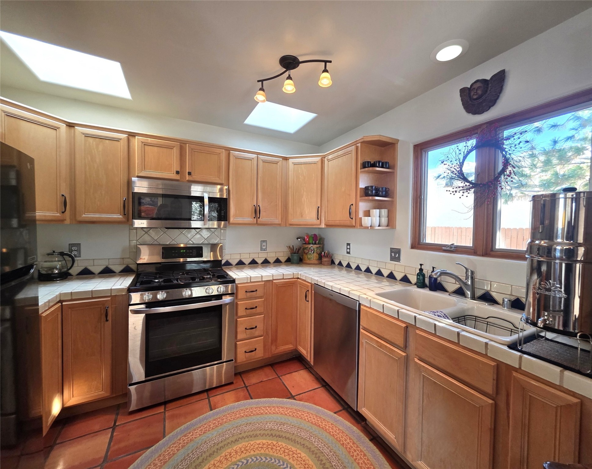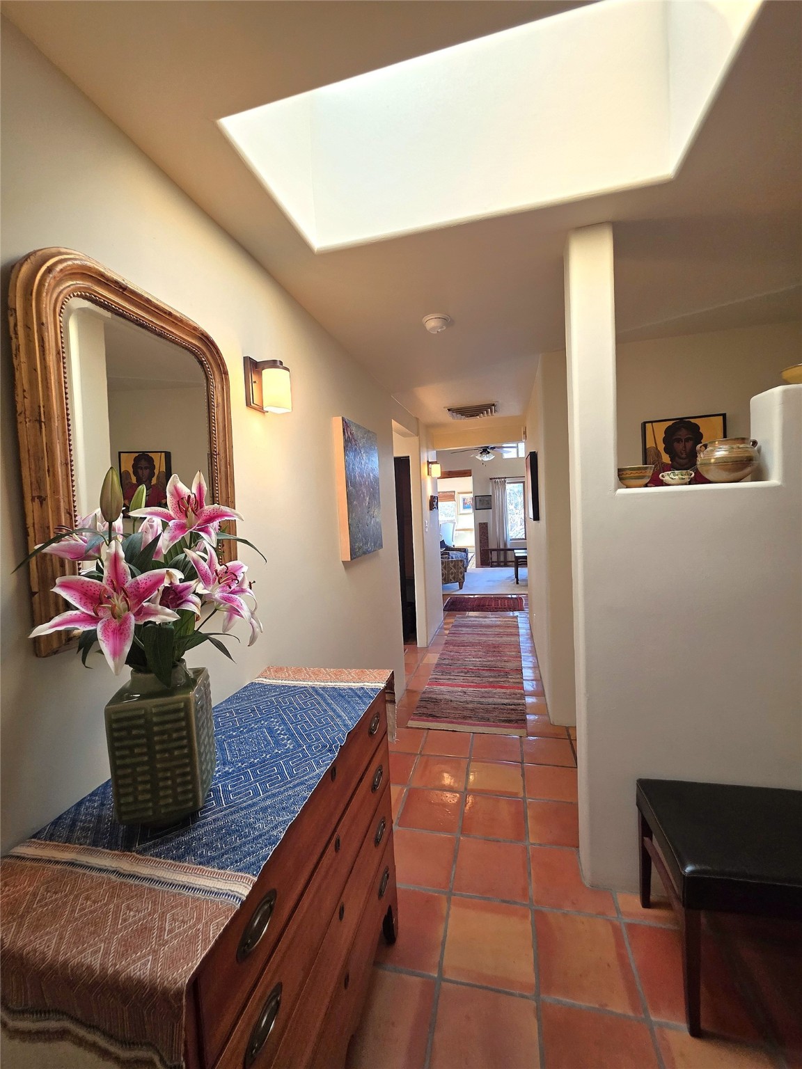 Set on a corner lot in Pueblos Del Sol, 3 bedrooms, 2 full baths 1,468 sq.ft., this inviting Santa Fe-style home blends timeless architecture with thoughtful livability. From the moment you enter, soaring ceilings, hand-crafted vigas and beams, a traditional kiva fireplace, and warm Saltillo tile floors create an atmosphere that feels both authentic and welcoming. The dining room frames beautiful views, opening to a covered patio where mature landscaping and quiet surroundings invite morning coffee or evening gatherings. The well-designed floor plan offers excellent separation, with a serene primary suite featuring a walk-out patio, westerly views, a generous walk-in closet, and a private bath.With radiant in-floor heating, a finished two-car garage, and a fully fenced yard, this home offers comfort, privacy, and ease -- a true Santa Fe retreat that is ready to enjoy.