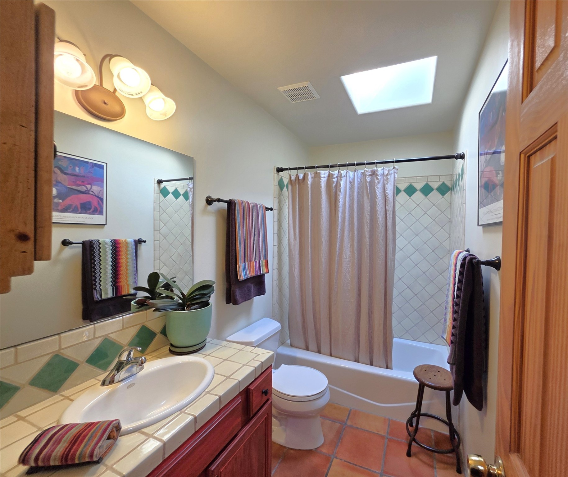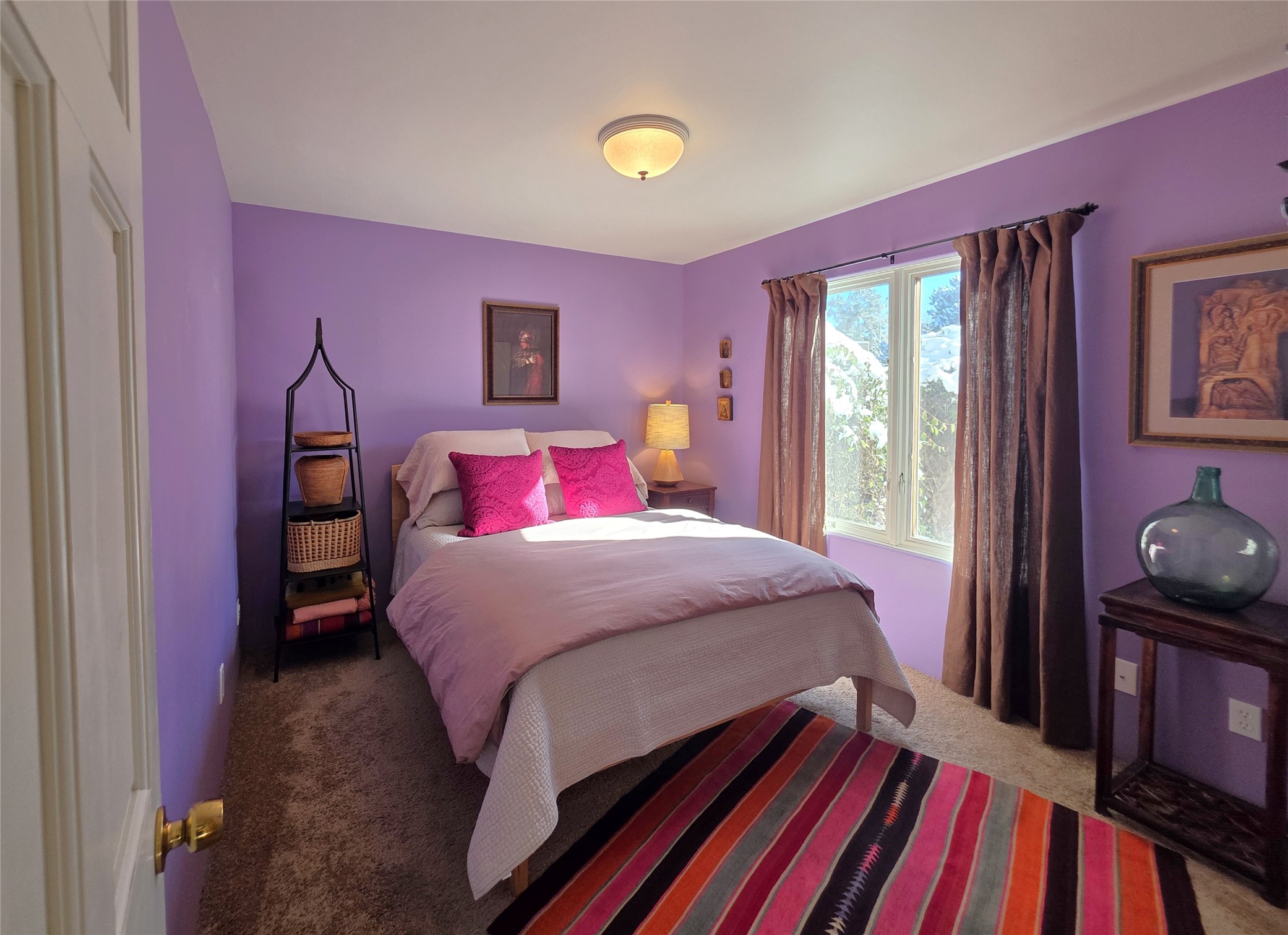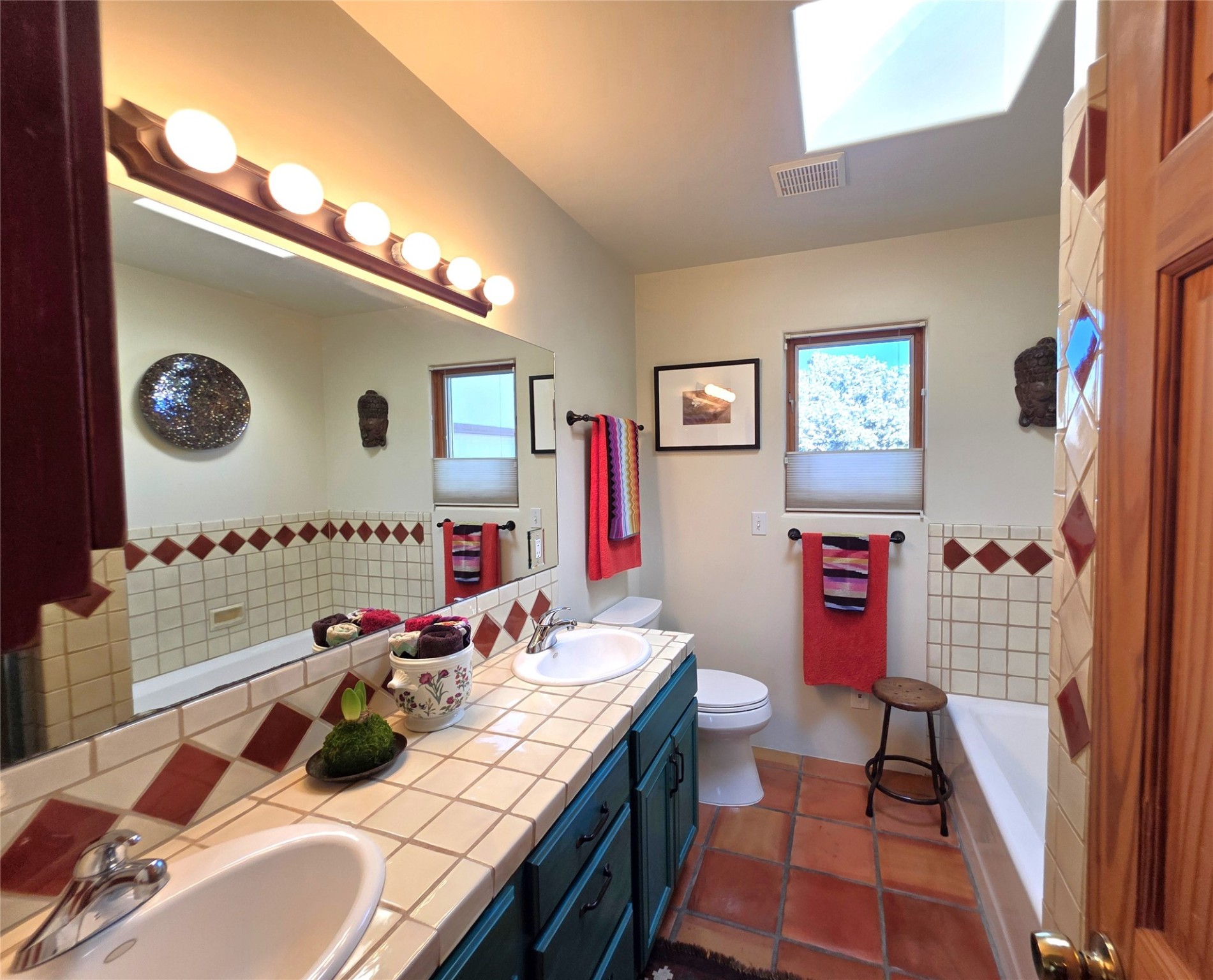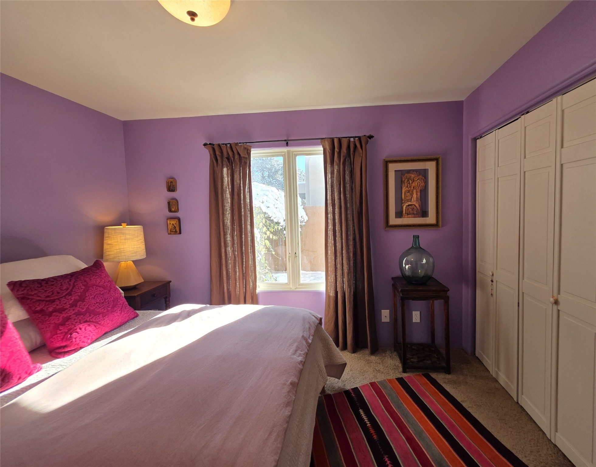 Set on a corner lot in Pueblos Del Sol, 3 bedrooms, 2 full baths 1,468 sq.ft., this inviting Santa Fe-style home blends timeless architecture with thoughtful livability. From the moment you enter, soaring ceilings, hand-crafted vigas and beams, a traditional kiva fireplace, and warm Saltillo tile floors create an atmosphere that feels both authentic and welcoming. The dining room frames beautiful views, opening to a covered patio where mature landscaping and quiet surroundings invite morning coffee or evening gatherings. The well-designed floor plan offers excellent separation, with a serene primary suite featuring a walk-out patio, westerly views, a generous walk-in closet, and a private bath.With radiant in-floor heating, a finished two-car garage, and a fully fenced yard, this home offers comfort, privacy, and ease -- a true Santa Fe retreat that is ready to enjoy.