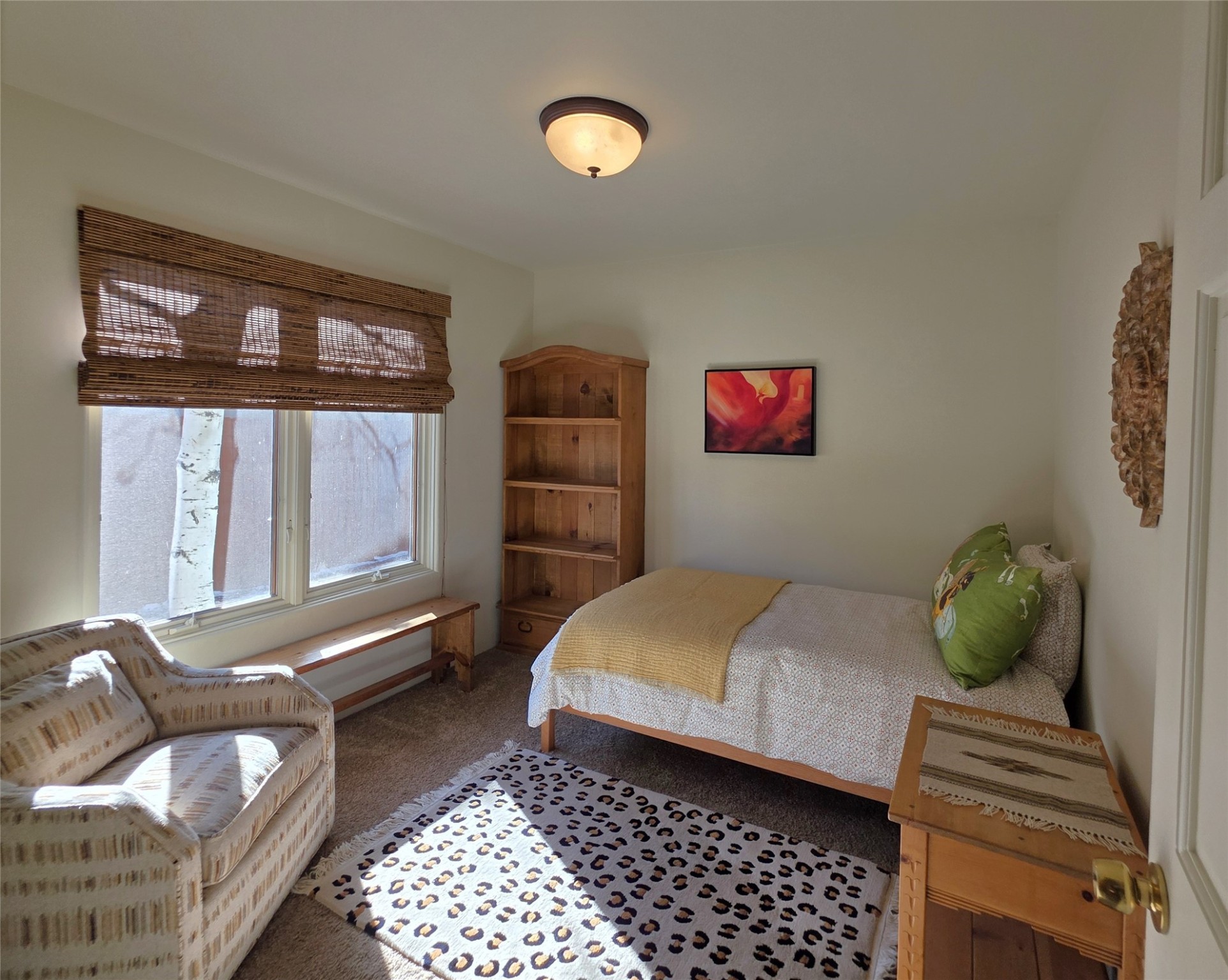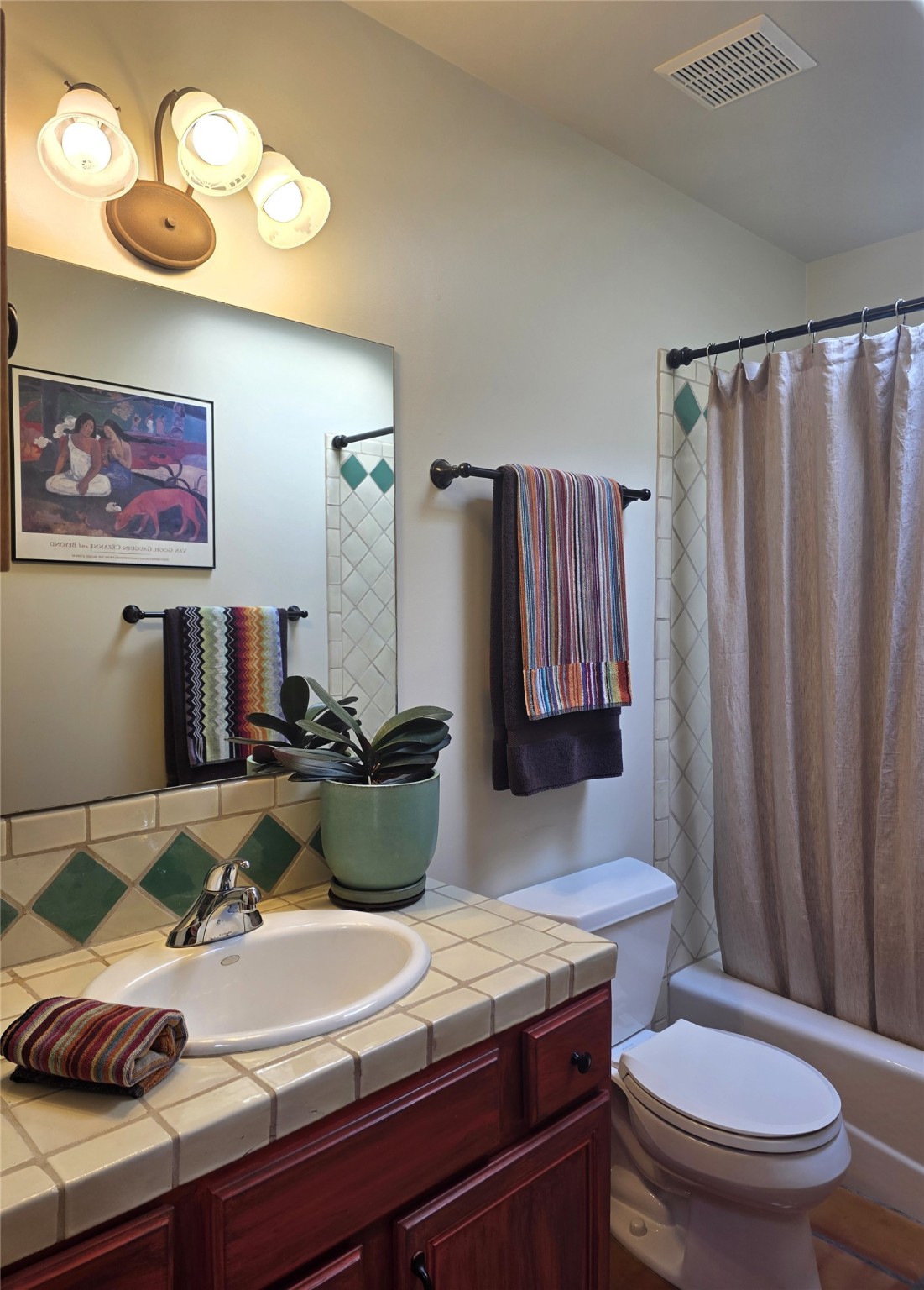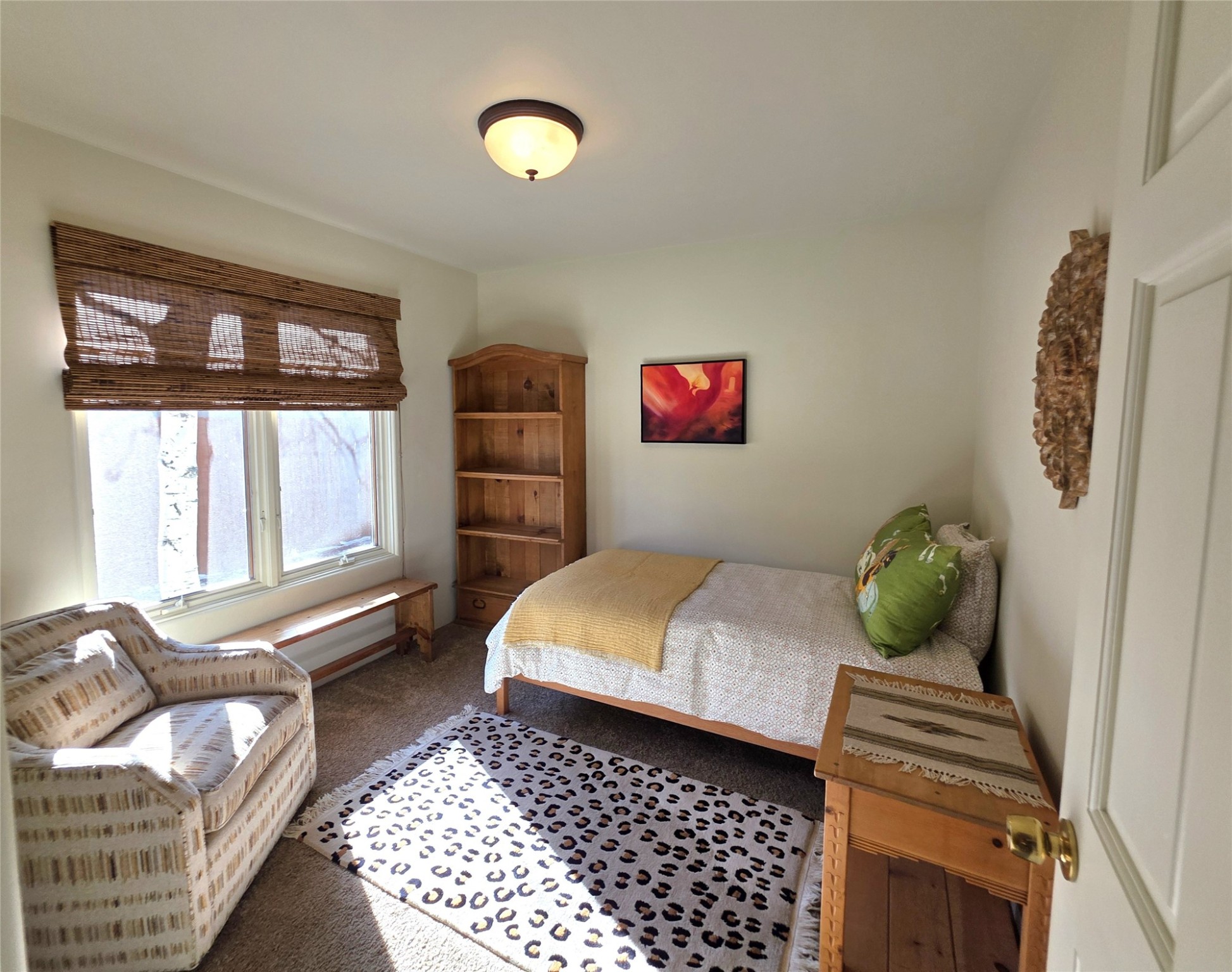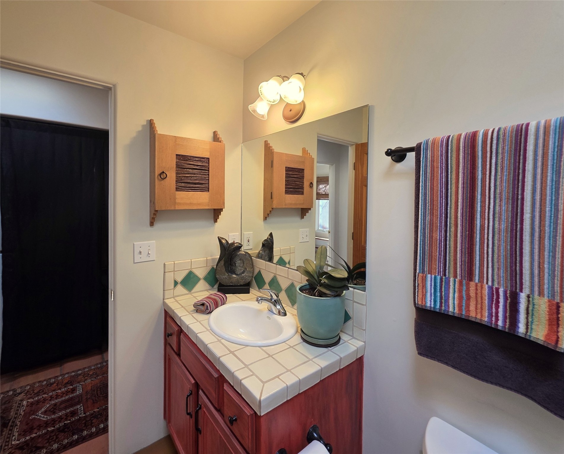 Set on a corner lot in Pueblos Del Sol, 3 bedrooms, 2 full baths 1,468 sq.ft., this inviting Santa Fe-style home blends timeless architecture with thoughtful livability. From the moment you enter, soaring ceilings, hand-crafted vigas and beams, a traditional kiva fireplace, and warm Saltillo tile floors create an atmosphere that feels both authentic and welcoming. The dining room frames beautiful views, opening to a covered patio where mature landscaping and quiet surroundings invite morning coffee or evening gatherings. The well-designed floor plan offers excellent separation, with a serene primary suite featuring a walk-out patio, westerly views, a generous walk-in closet, and a private bath.With radiant in-floor heating, a finished two-car garage, and a fully fenced yard, this home offers comfort, privacy, and ease -- a true Santa Fe retreat that is ready to enjoy.