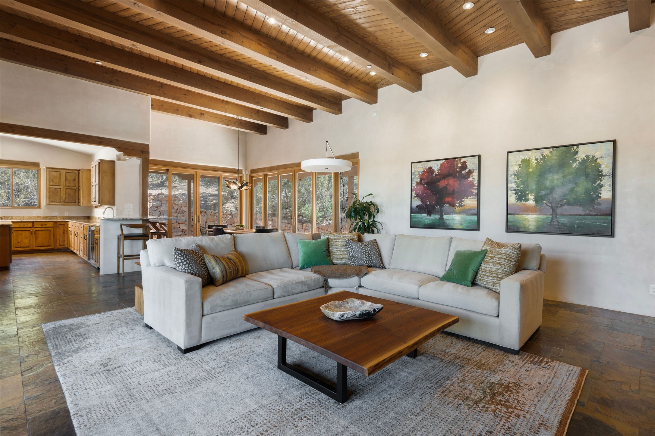 This custom-built 3 bedroom, 3 bathroom home in the gated community of Tesuque Hills offers the perfect escape from the downtown frenzy, while being less than 15 minutes from the heart of Santa Fe. Here, you enjoy the tranquility of the northern foothills with quick access to everything the city has to offer. Set on a tree-covered, 1-acre lot, the home is surrounded by wooded views that create a peaceful and private retreat. Multiple portals invite you to relax and take in the natural beauty, while sunsets filter through the trees and paint the sky in unforgettable color. The spacious interior is thoughtfully designed to feel open to nature, with generous living areas that capture both light and views, seamlessly blending indoor comfort with the outdoors. At the heart of the home is an amazing Chef's kitchen, built for cooking and entertaining. Wrap-around granite countertops, custom cabinetry, double ovens, stainless steel appliances, and a wine refrigerator make it ideal for everything type of chef. The open flow into the main living areas ensures the cook is always part of the conversation. Nearly all of the home is single level, with the primary suite set up a few steps above the main floor. From its own deck, enjoy stunning mountain views and peaceful mornings. One guest room offers an ensuite bathroom while the third bedroom could be used as an office. Slate floors with in-floor radiant heat and classic viga/beamed ceilings further enhance the warmth and authenticity of the home. A secluded hot tub provides the perfect place to stargaze beneath New Mexico's brilliant night skies. Even further up the hill, a fire table creates a magical gathering space. Imagine spending evenings there with friends and family, taking in sweeping, "killer" views of the majestic Sangre de Cristo Mountains--a truly unforgettable backdrop. Experience for yourself why the serenity--yet close proximity--of the northern foothills remains one of Santa Fe's best-kept secrets.
