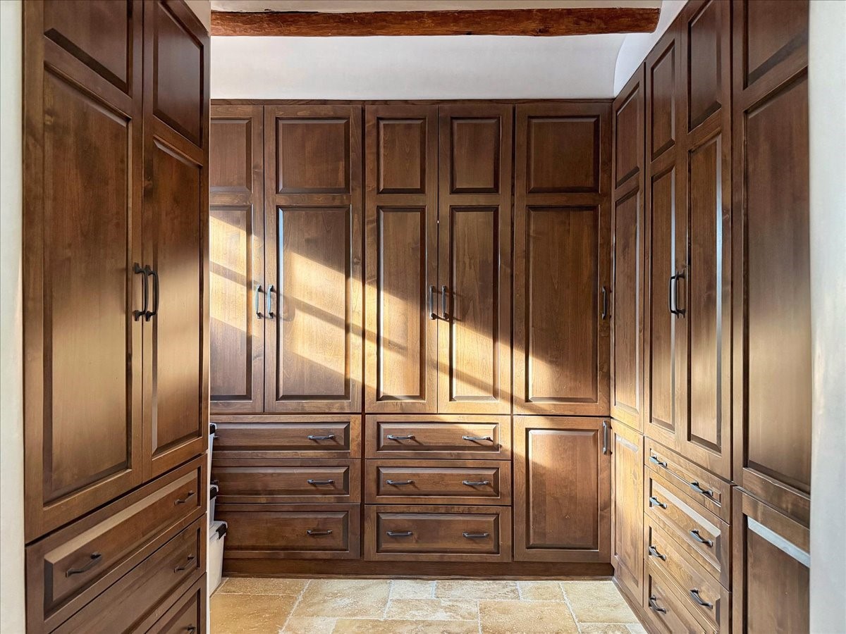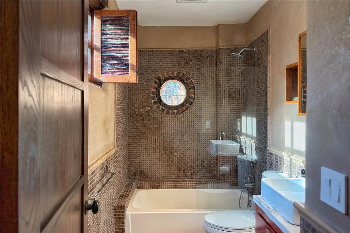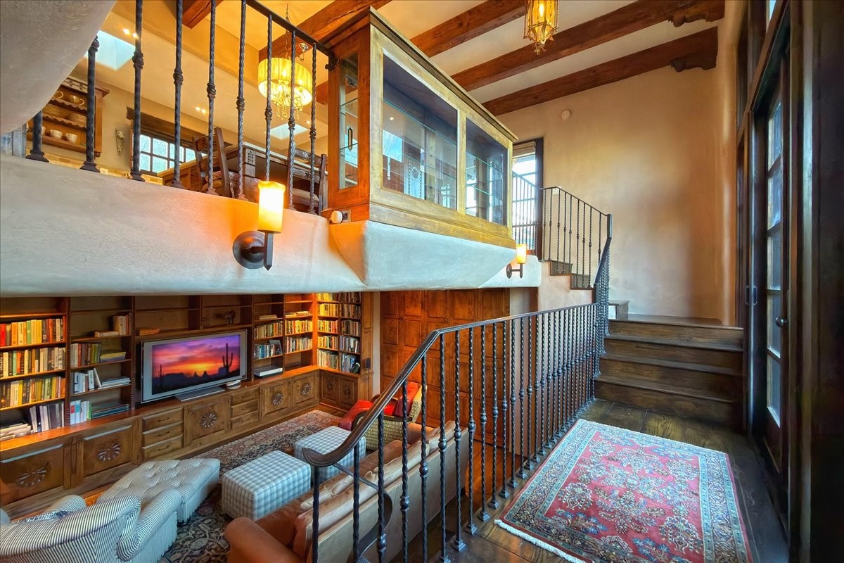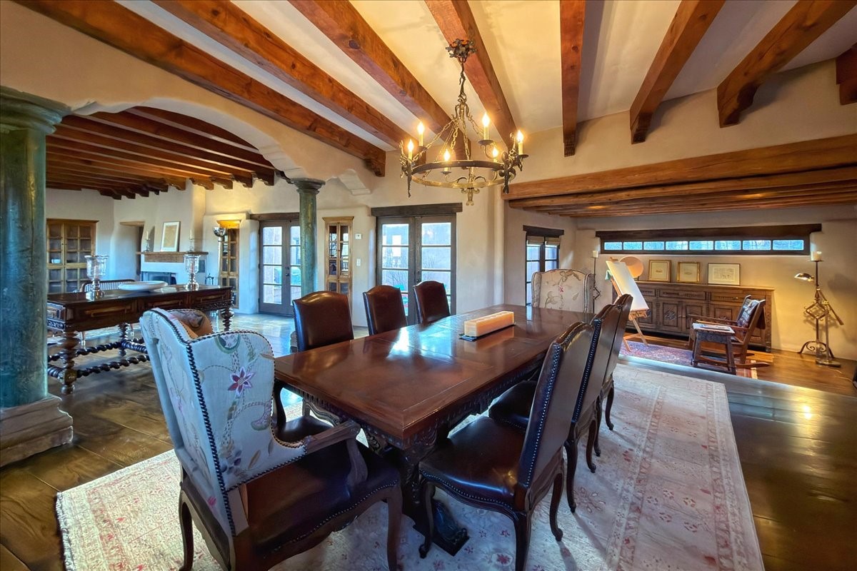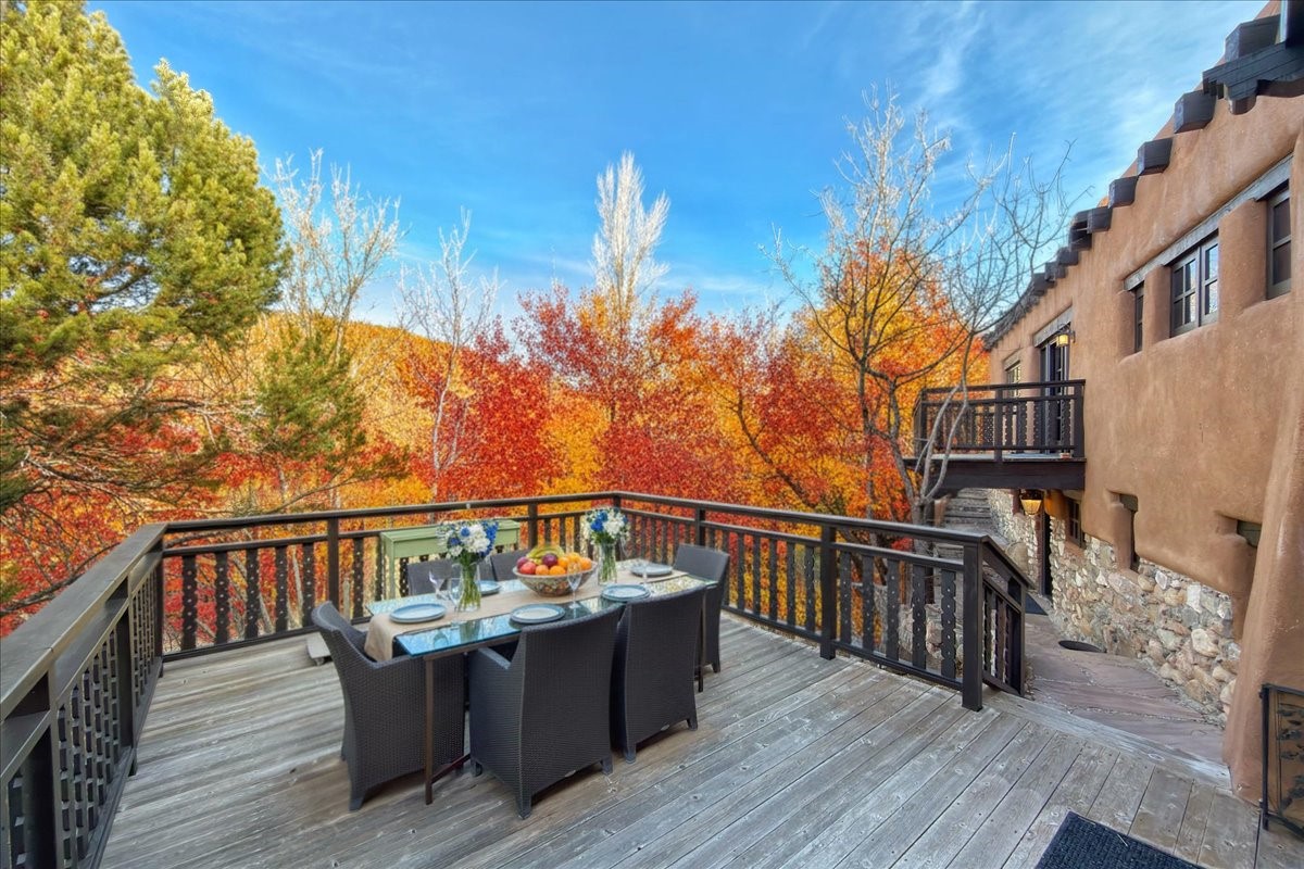 Discover Las Crucitas, a fully restored 1950s Santa Fe adobe blending timeless Southwestern charm with modern luxury, ideally located on coveted Upper Canyon Road in the Historic East Side. This remarkable property offers four bedrooms and four bathrooms (two full, one three-quarter, and one half) within 4,258 square feet of refined living space. A 492-square-foot attached casita, detached two-car garage, and over 200 linear feet of Santa Fe River frontage creates a rare and private setting. The upper level features a beautifully appointed chef's kitchen with top-of-the-line appliances, custom hood, two dishwashers, quartz countertops, custom Ernest Thompson cabinetry, and travertine floors. A spacious great room showcases classic Santa Fe details including columns, vigas with corbels, latillas, and wide-plank oak floors, American clay and plaster walls. Three sets of French doors open to a serene interior courtyard, while an additional set leads to a balcony ideal for sunset views. Also on the upper level are a guest suite with a three-quarter bath and an elegant owner's suite featuring two corner kiva wood-burning fireplaces, a luxurious en-suite full bath with mosaic tile shower and travertine floors, a walk-in closet with custom built-ins, and French doors opening to the outdoor area. The lower level offers a media area with custom Ernest Thompson cabinetry, a study nook, an additional guest bedroom with exposed rock walls, a powder room, and a three-quarter bath. The attached casita includes a wood-burning kiva fireplace, kitchenette, and full bath ideal for guests. Outdoor spaces include a back deck, a floating terrace with sunset views, and a flagstone path with direct river access. Additional features include in-floor radiant heat, 6 fireplaces, a rock garden, and a dog run with room to expand. Las Crucitas is a rare opportunity to own a property that seldom changes hands--just minutes from Canyon Road's galleries and restaurants and the Santa Fe Plaza.