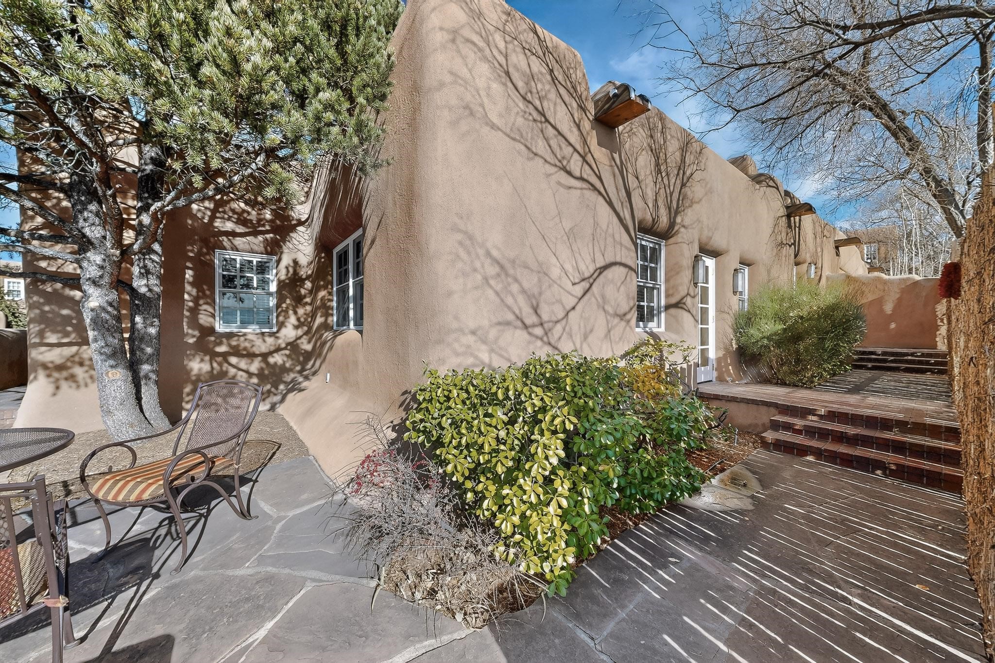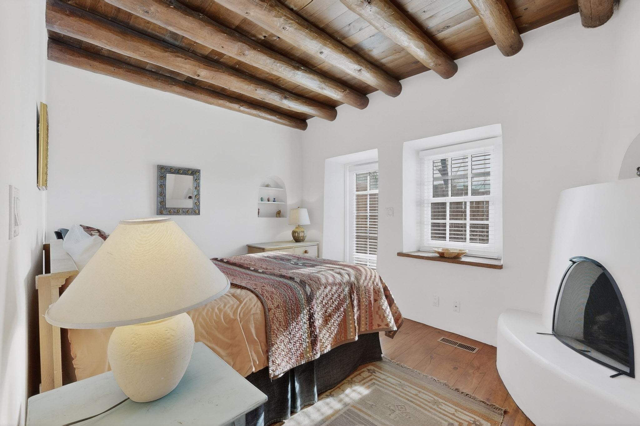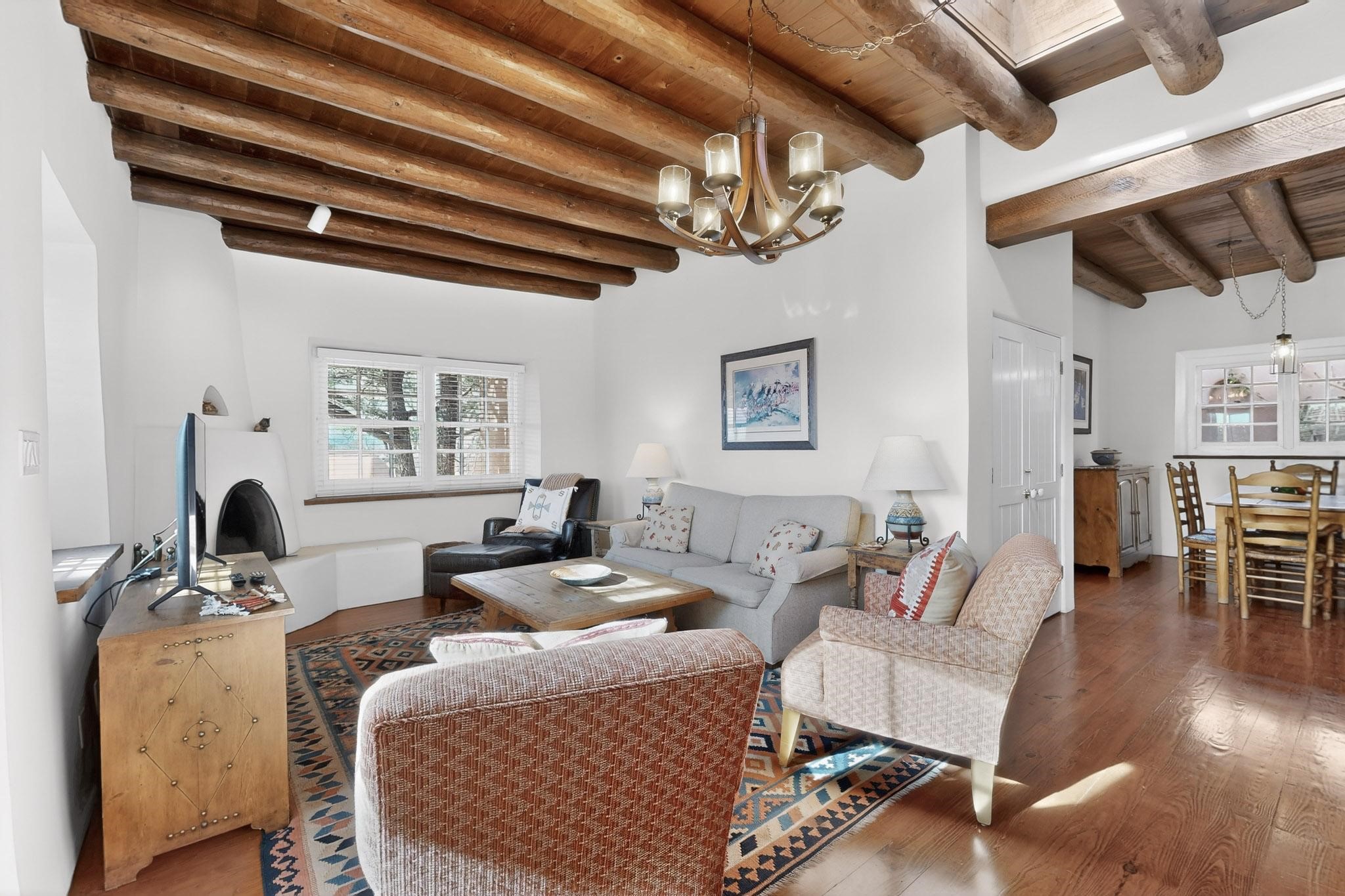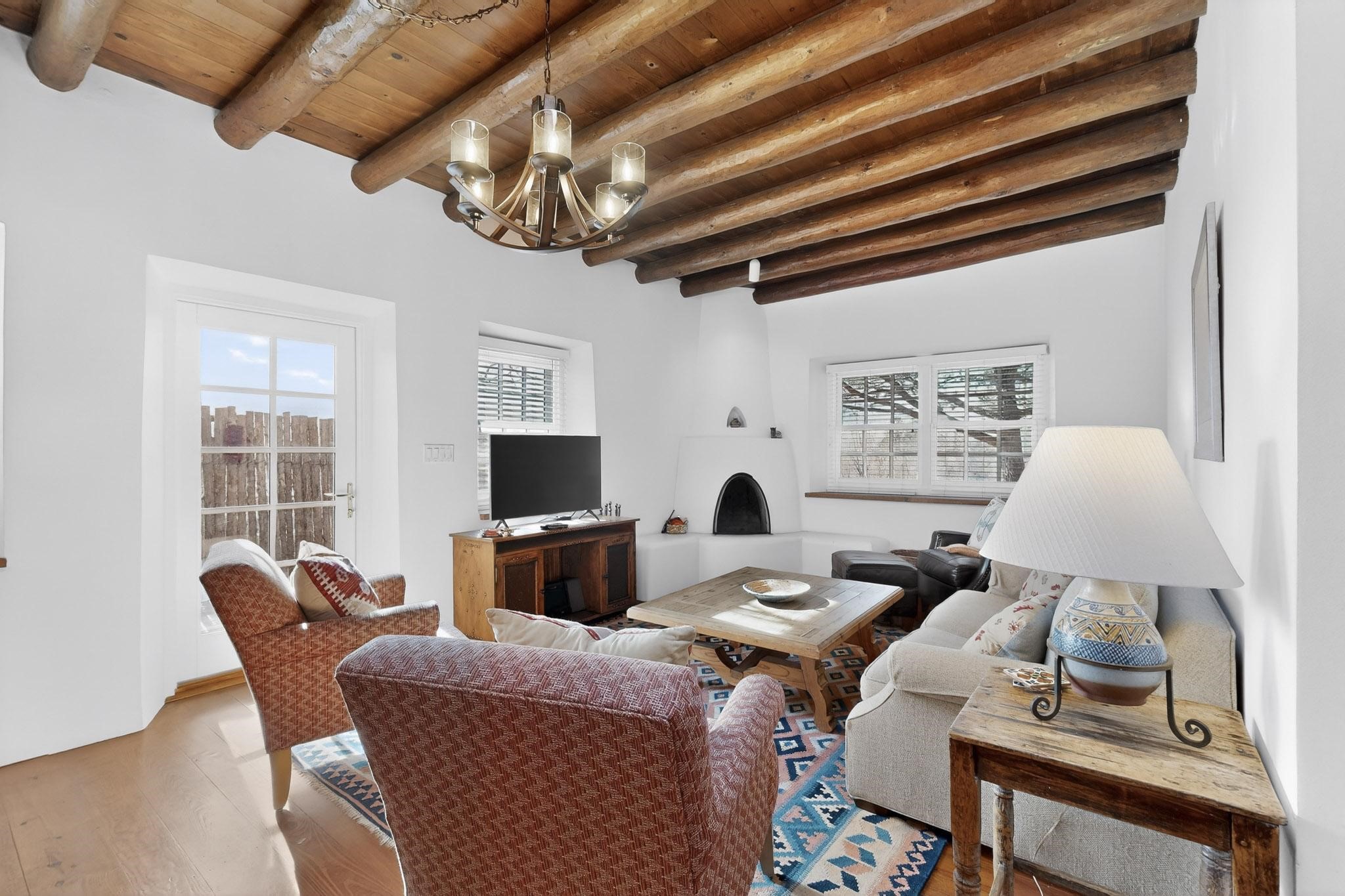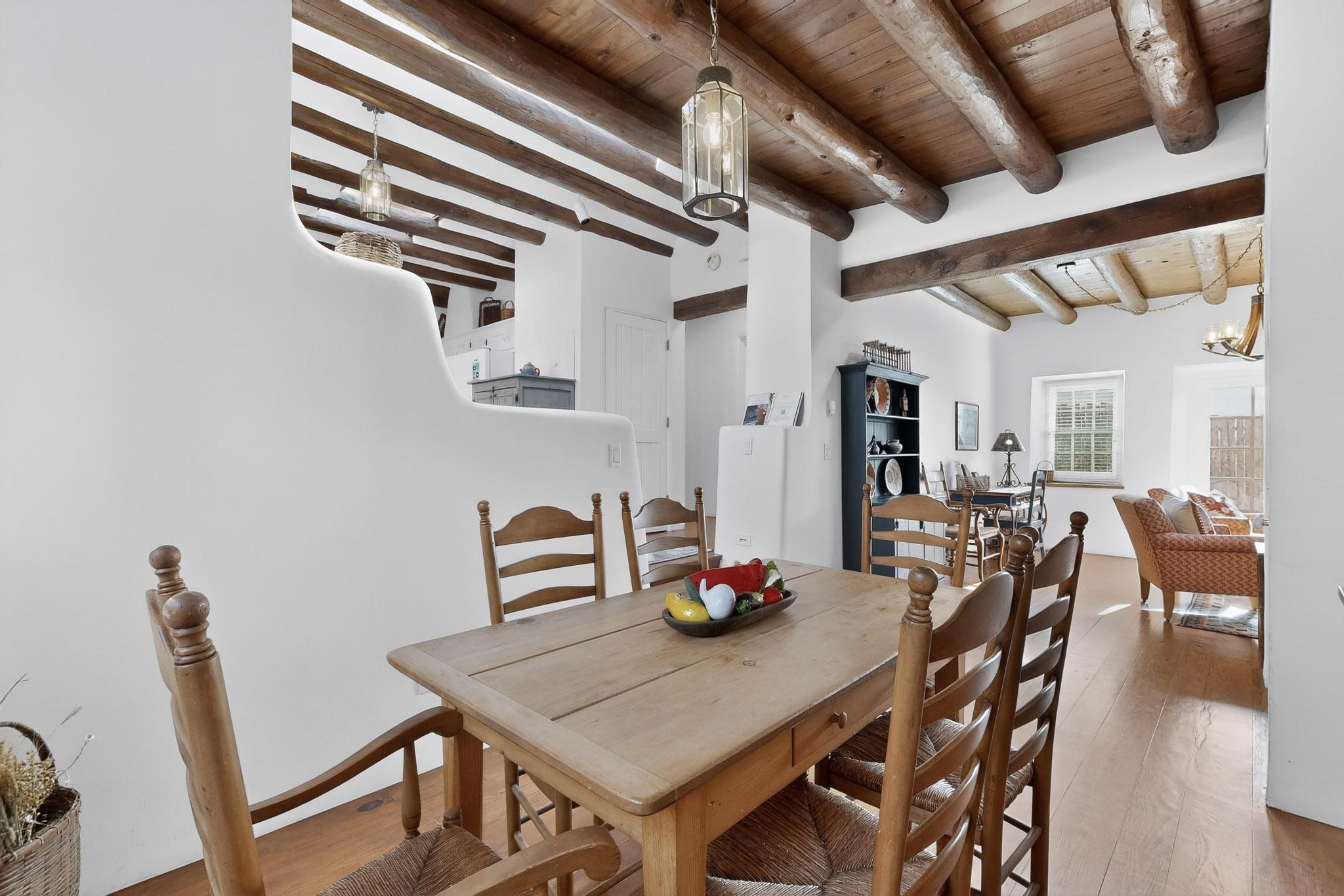 A charming condominium quarter share ownership near the Plaza, just a few blocks away! You'll find beautiful architectural details in the gracious old adobe homes, like vigas, coved plaster ceilings, kiva fireplaces, smooth plaster walls, hand-adzed lintels above windows and doors. Plus, you'll have a Talavera tile kitchen and baths. There are also walled, landscaped patio areas both in front and back of the house. Views of the downtown plaza areas from the living room and patio. The COA takes care of all the furnishings and maintenance, both inside and out. It's fully compliant with the short-term rental program.