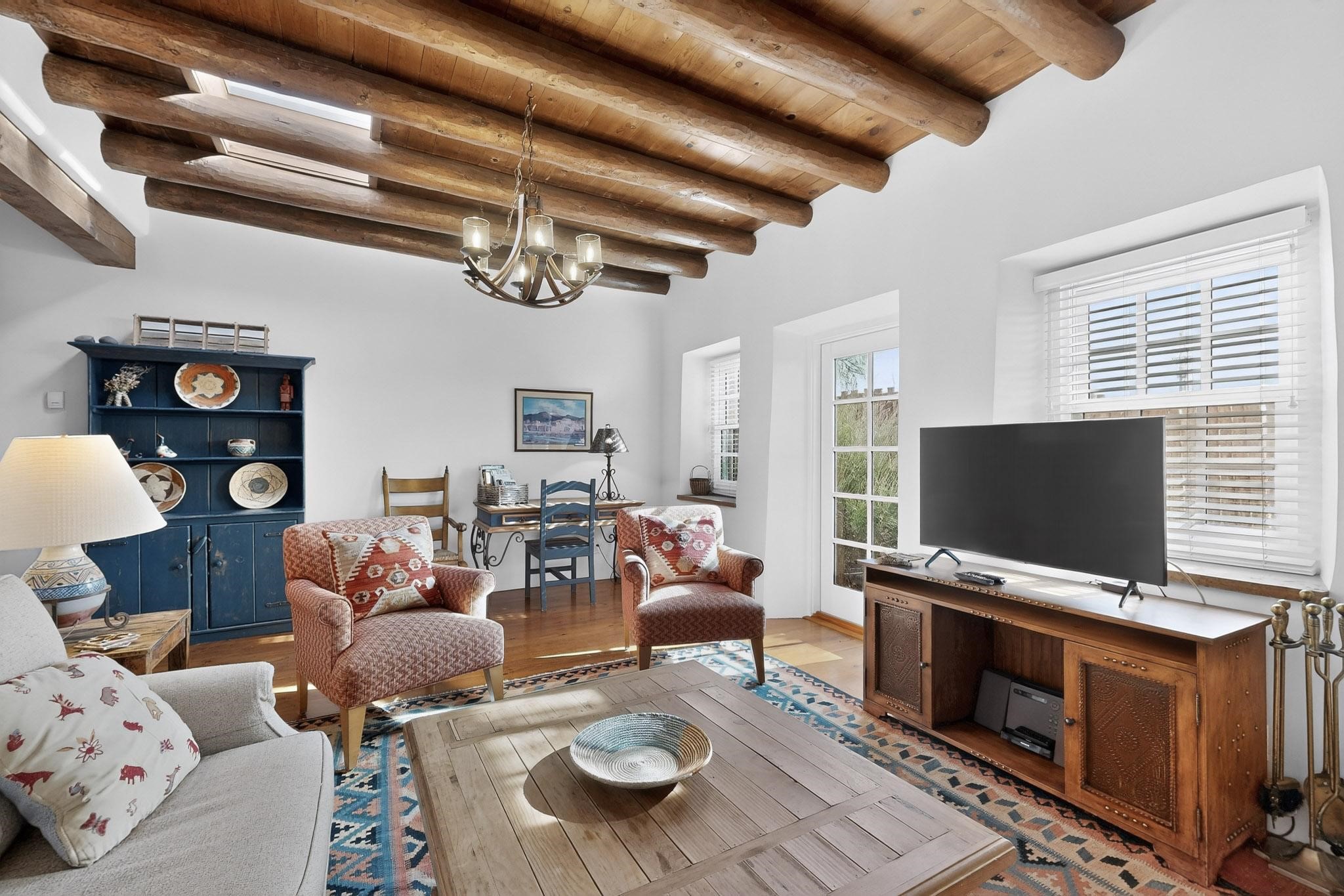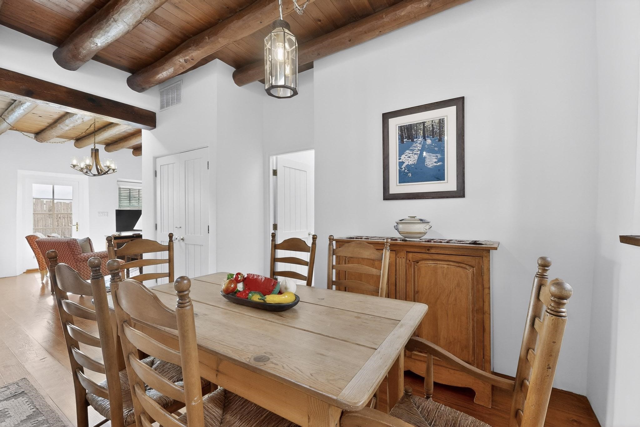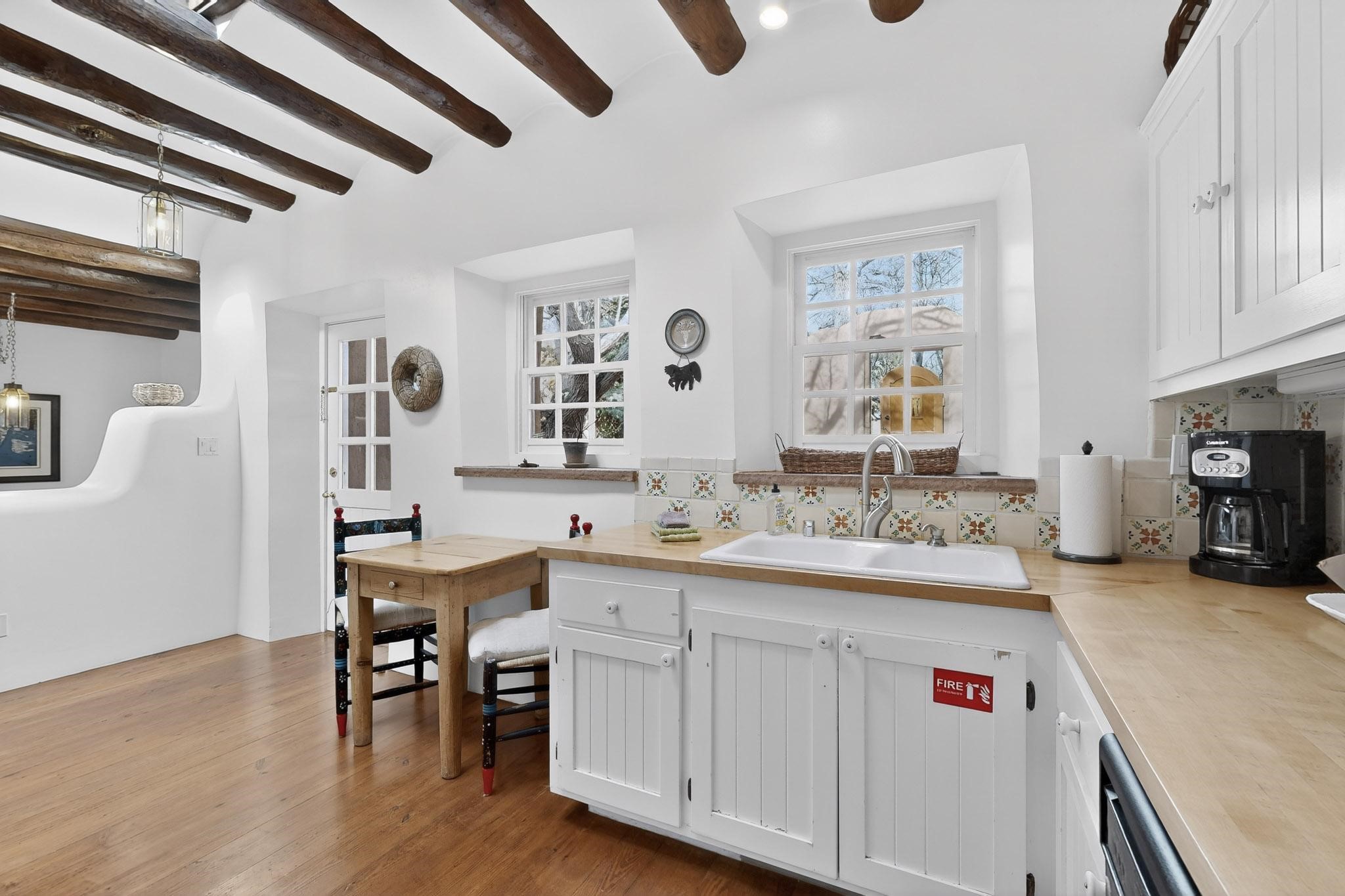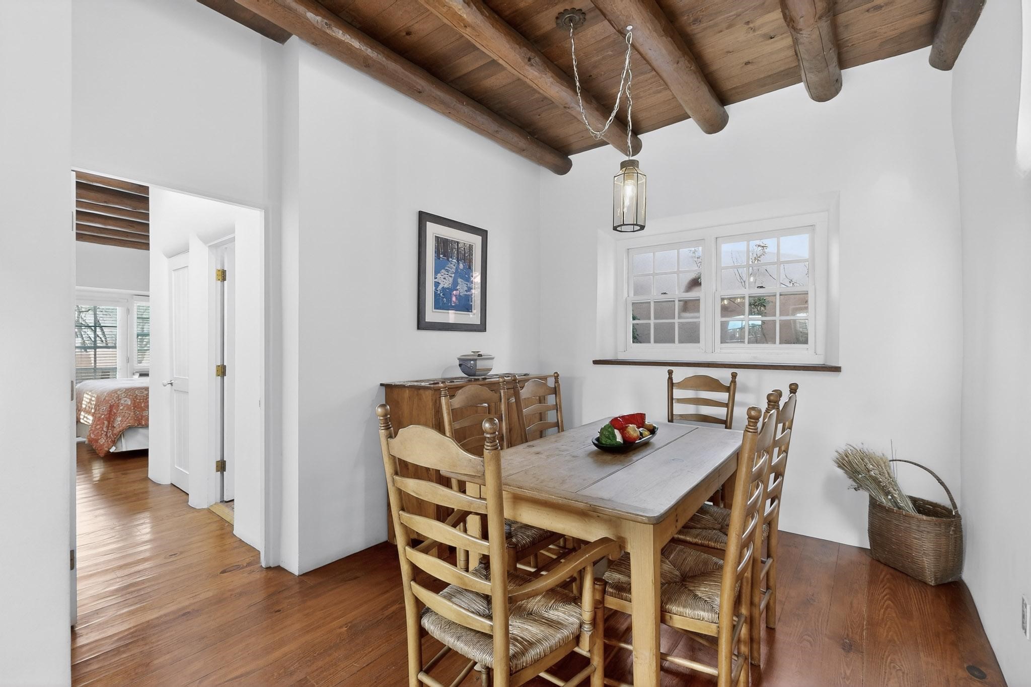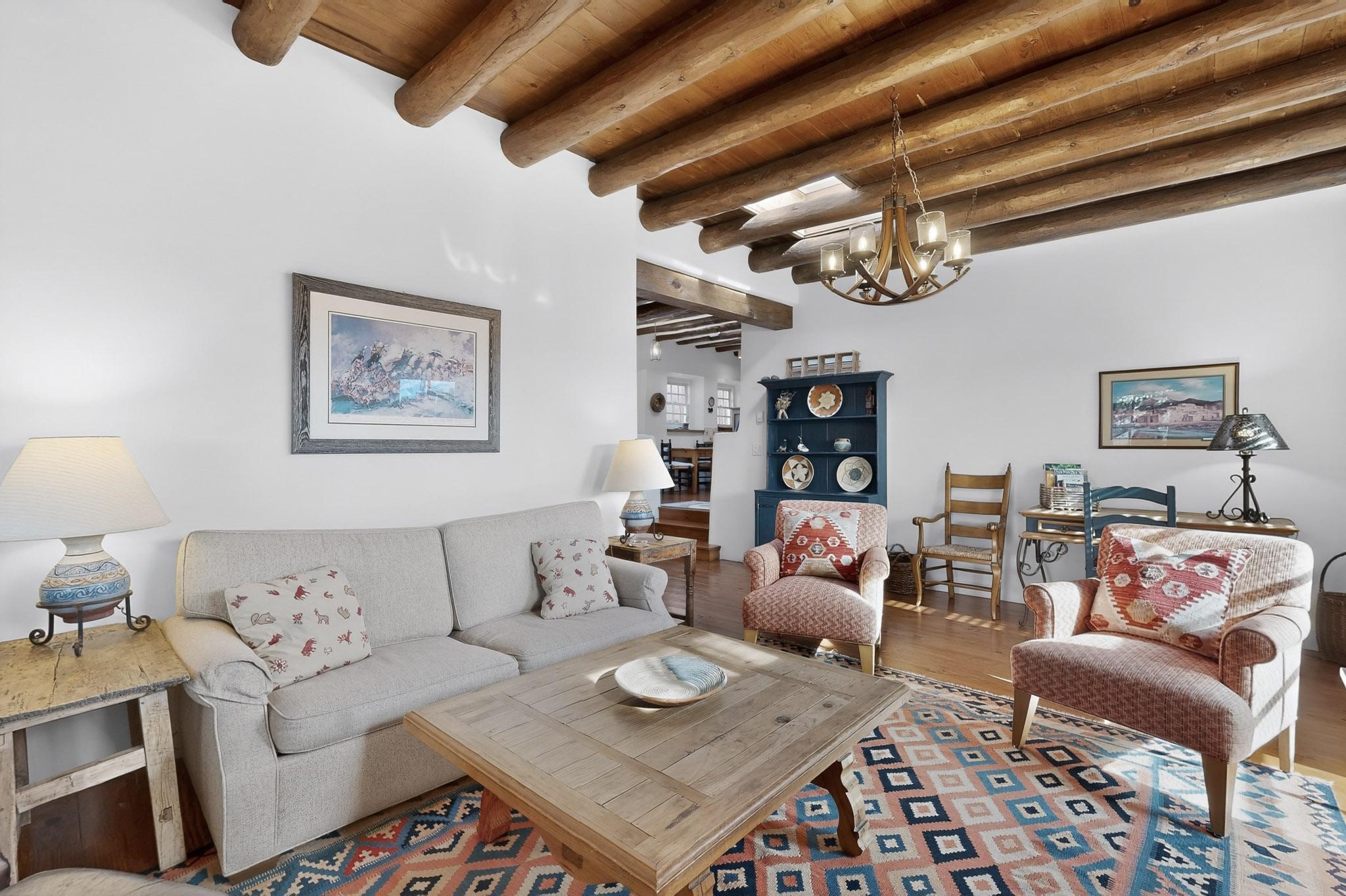 A charming condominium quarter share ownership near the Plaza, just a few blocks away! You'll find beautiful architectural details in the gracious old adobe homes, like vigas, coved plaster ceilings, kiva fireplaces, smooth plaster walls, hand-adzed lintels above windows and doors. Plus, you'll have a Talavera tile kitchen and baths. There are also walled, landscaped patio areas both in front and back of the house. Views of the downtown plaza areas from the living room and patio. The COA takes care of all the furnishings and maintenance, both inside and out. It's fully compliant with the short-term rental program.