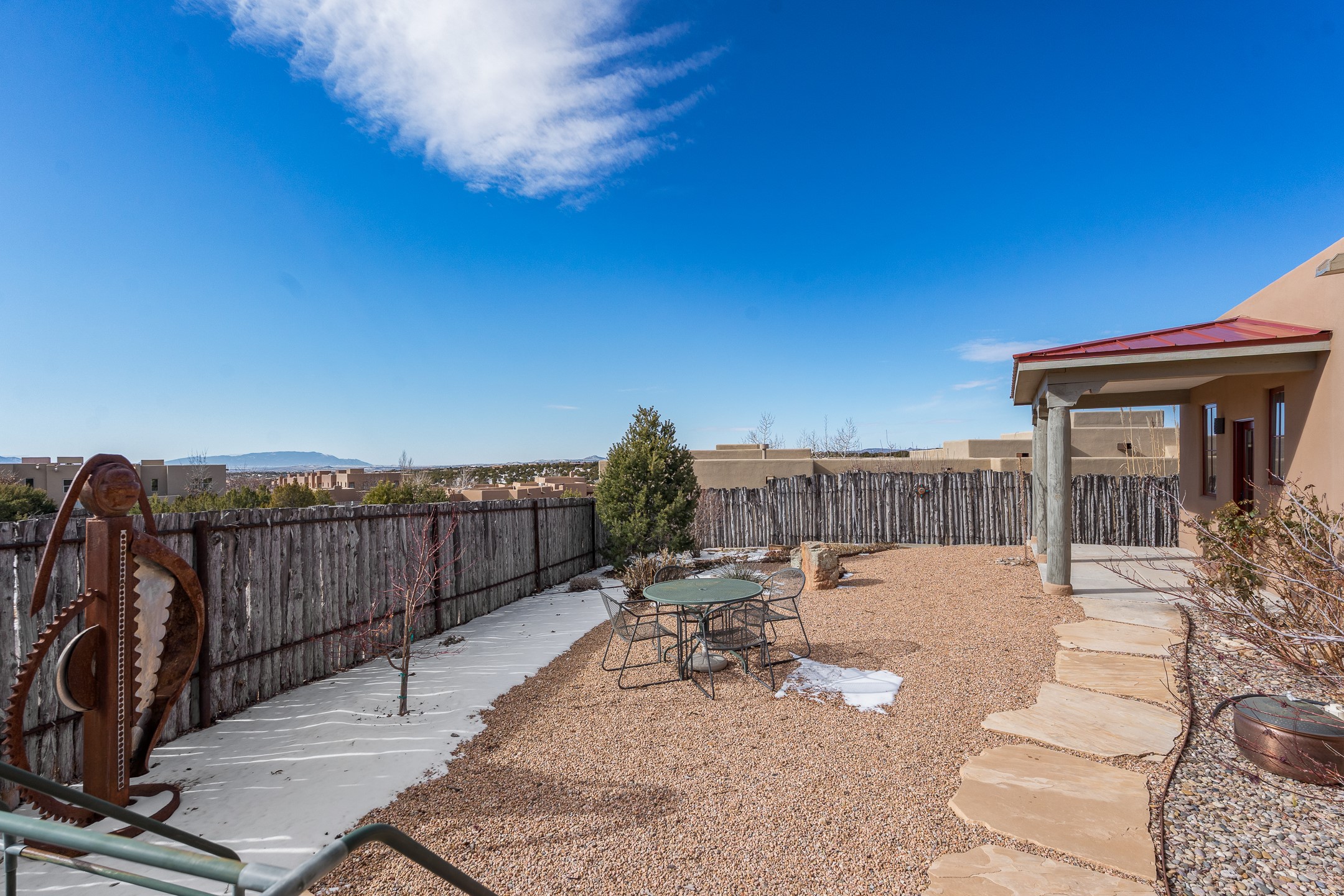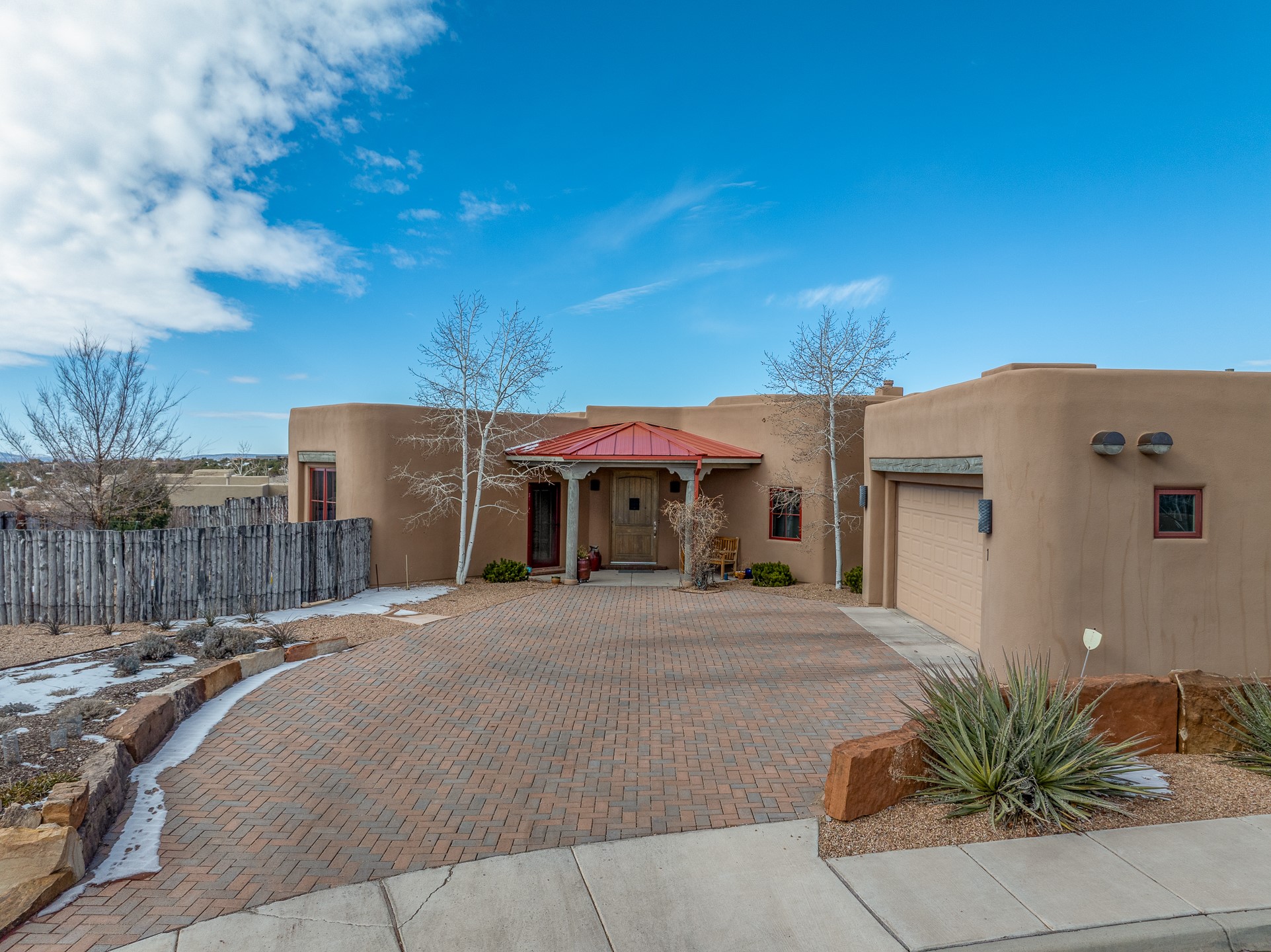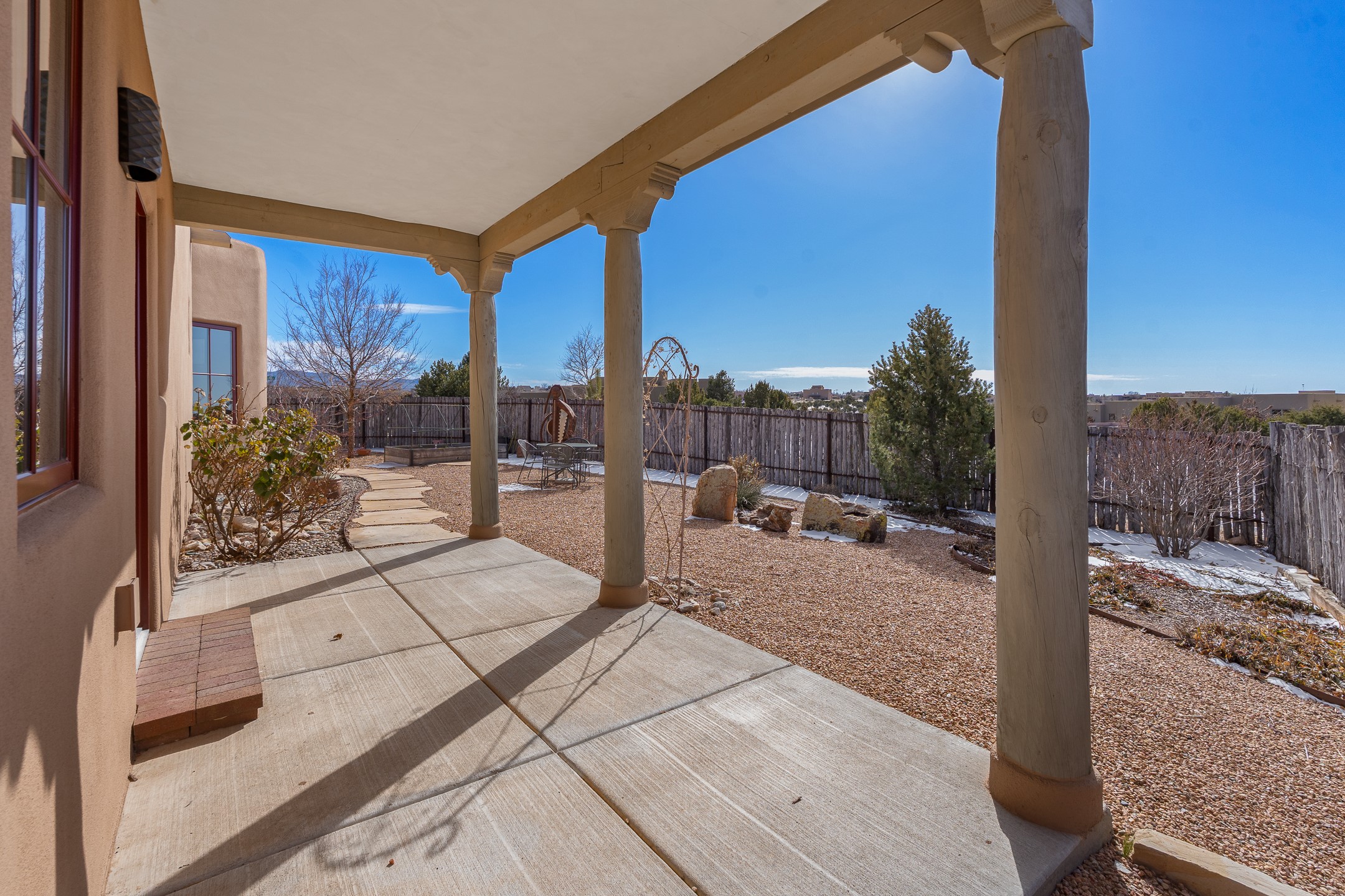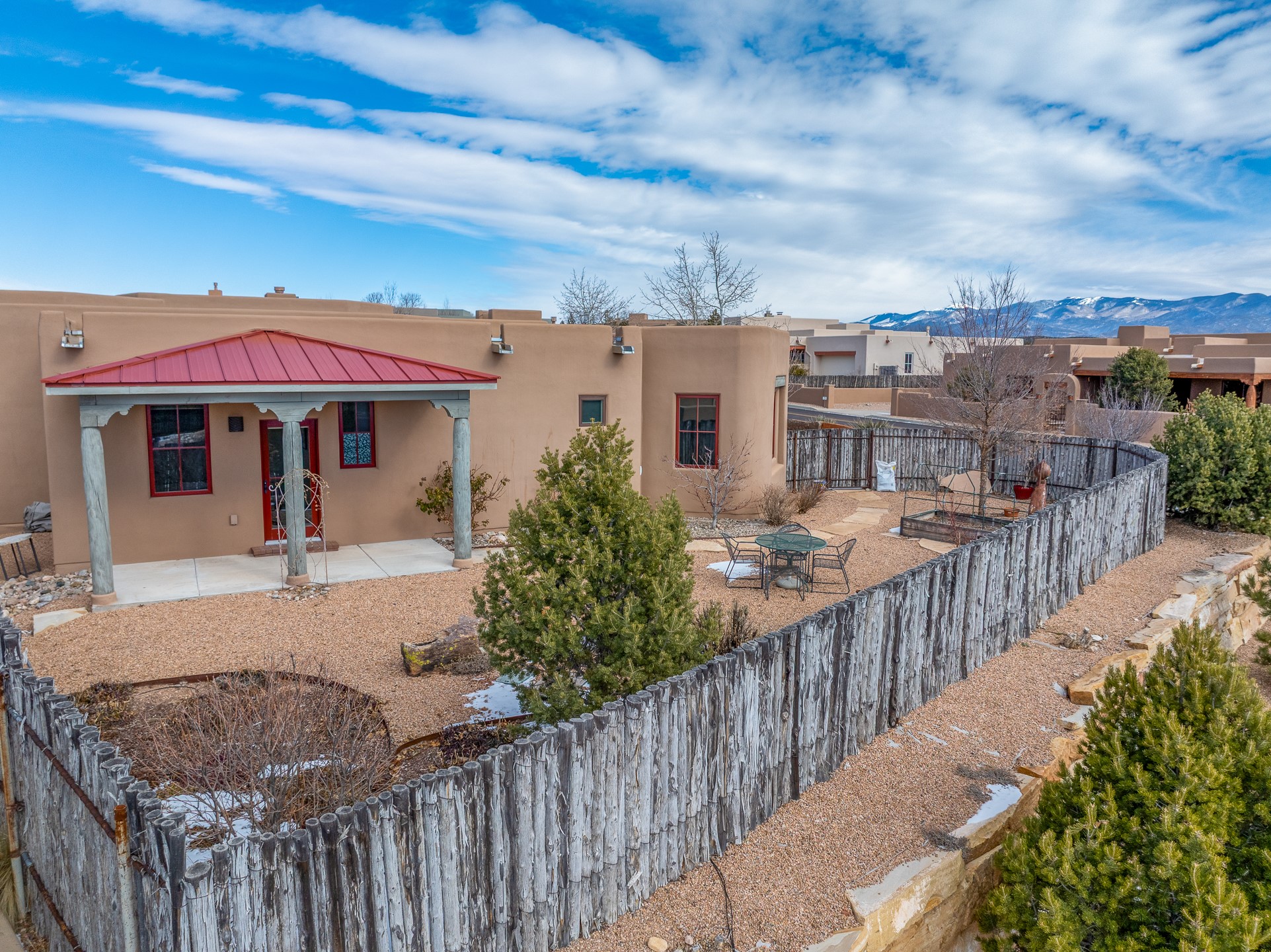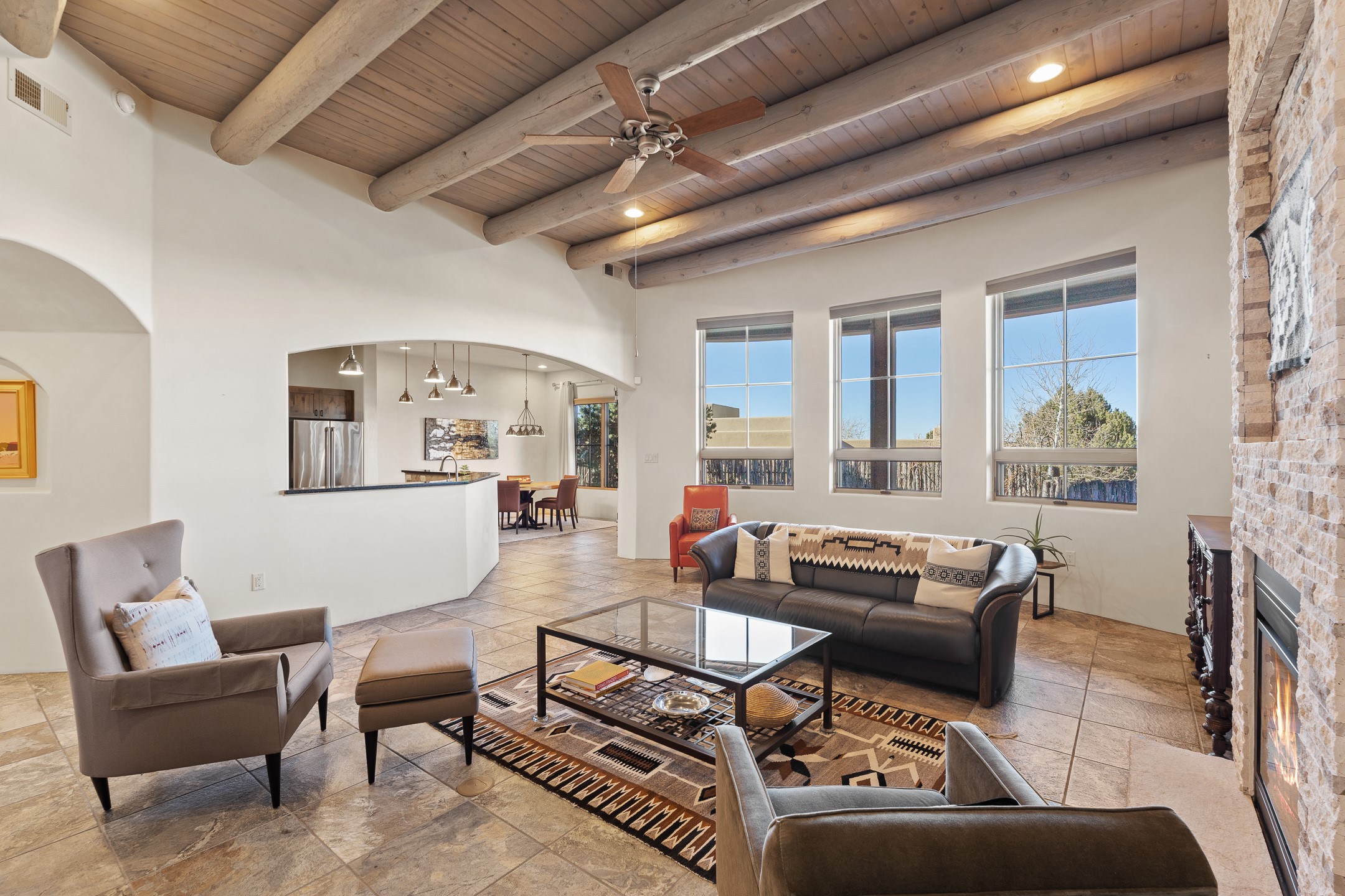 Sophisticated soft-contemporary living awaits in this beautifully designed single-level home, ideally situated on a desirable corner lot in the vibrant community of Aldea de Santa Fe. Built in 2014, this thoughtfully planned residence offers approximately 2,746 square feet of elegant living space, including three bedrooms, three baths, and a two-car garage.The well-designed floor plan provides excellent separation of spaces. A generous guest bedroom features an en-suite bath, while a versatile office or third bedroom includes a private exterior entrance--perfect for guests, creative pursuits, or a home office. Stone flooring throughout creates a clean, modern aesthetic, complemented by forced air heating and air conditioning for year-round comfort.The open-concept living, dining, and kitchen areas offer a seamless yet well-defined flow. The living room is highlighted by exposed beams, a gas fireplace, and tall windows that flood the space with natural light. The spacious kitchen is appointed with knotty alder cabinetry, extensive solid-surface countertops for food preparation, a stainless-steel range with exterior venting, a center island, and a built-in desk area--ideal for everyday living and entertaining.The primary suite serves as a serene retreat, featuring two spacious walk-in closets and a spa-inspired bath. Light-filled living and dining areas open effortlessly to the rear patio, where mature landscaping, raised garden beds for homegrown vegetables, and a charming peek-a-boo view of the Jemez Mountains create a tranquil outdoor setting for relaxation or gatherings.Aldea de Santa Fe is known for its village-style charm and active lifestyle, offering residents miles of walking trails, expansive shared open space, a community center, and tennis, basketball, and bocce courts. Annual art tours, community garage sales, and a variety of social clubs foster a welcoming and connected neighborhood atmosphere.This home presents a rare opportunity to enjoy refined comfort, thoughtful design, and a true sense of community--Santa Fe living at its best.
