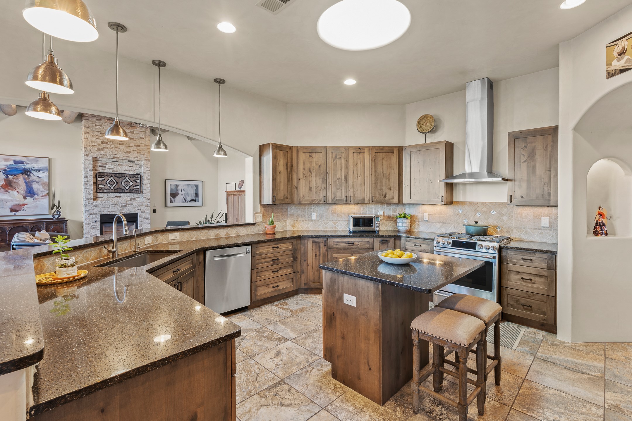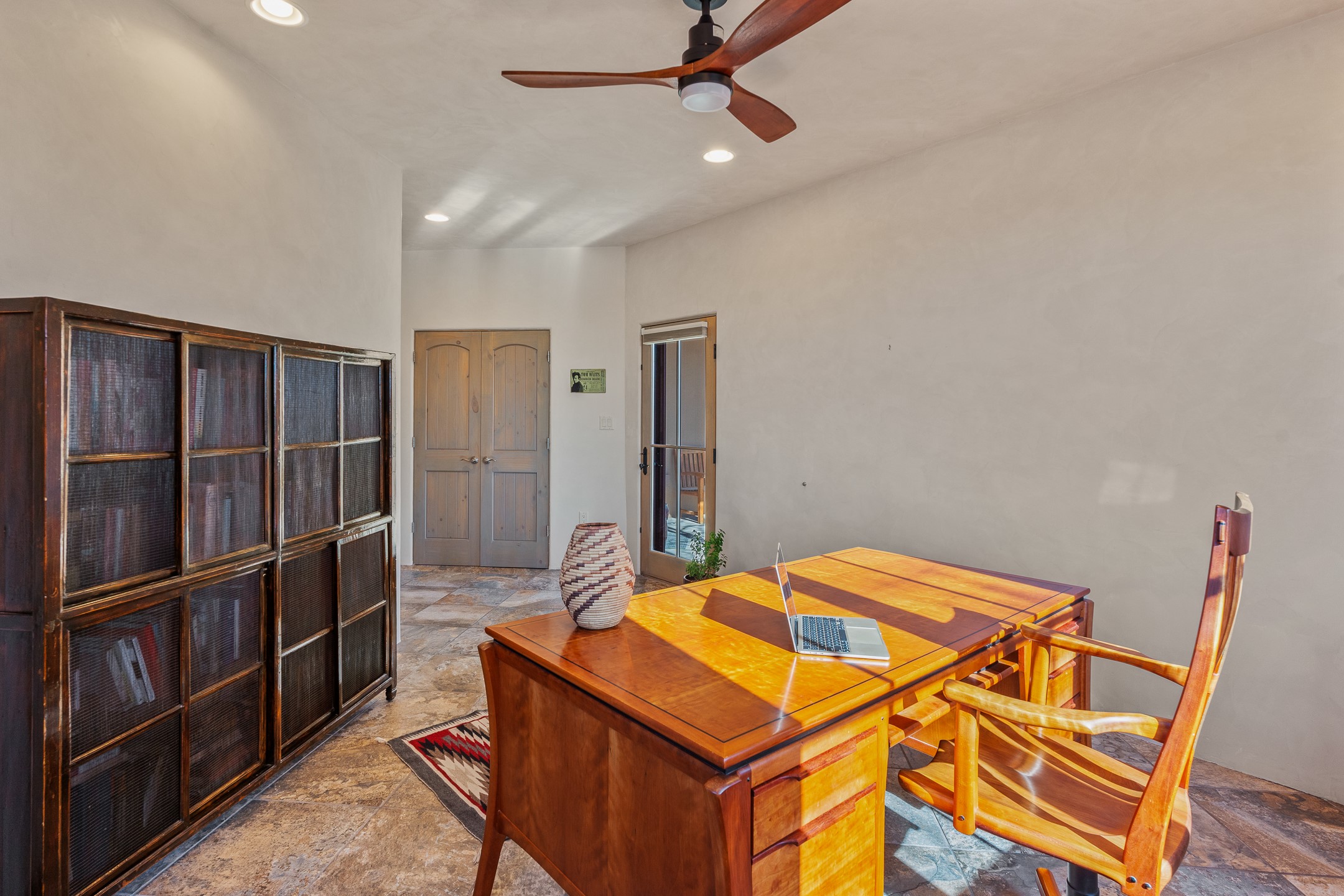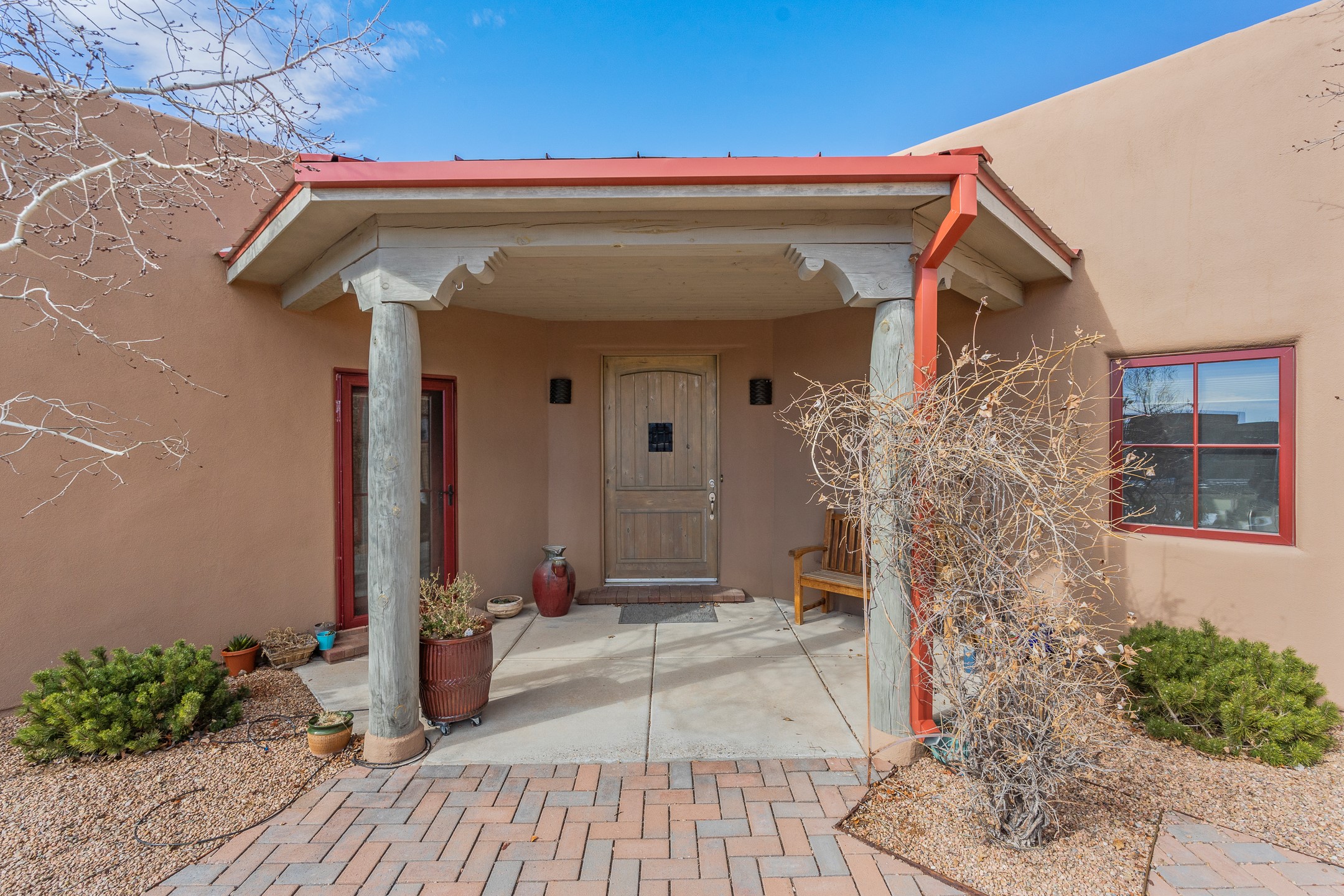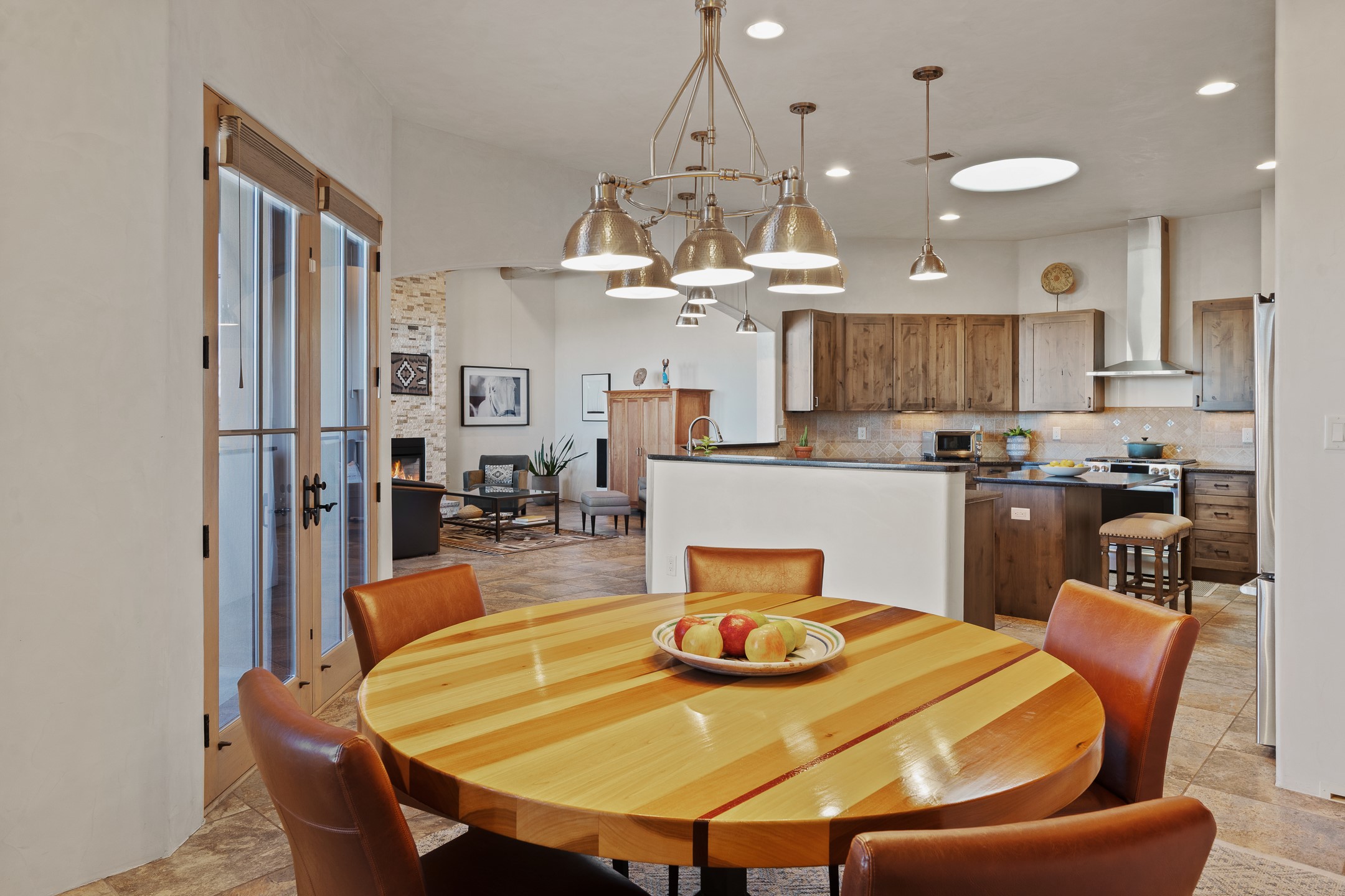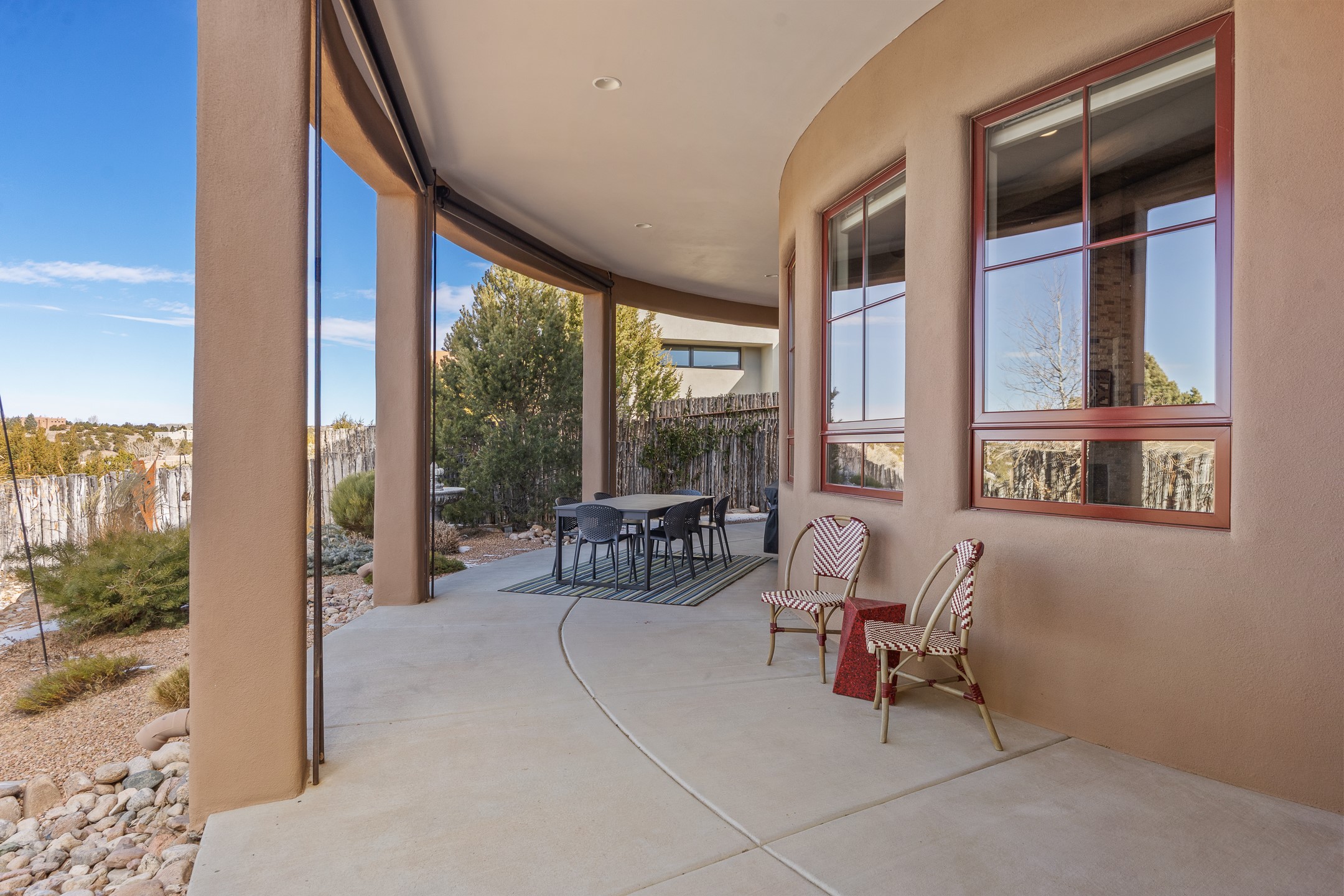Sophisticated soft-contemporary living awaits in this beautifully designed single-level home, ideally situated on a desirable corner lot in the vibrant community of Aldea de Santa Fe. Built in 2014, this thoughtfully planned residence offers approximately 2,746 square feet of elegant living space, including three bedrooms, three baths, and a two-car garage.The well-designed floor plan provides excellent separation of spaces. A generous guest bedroom features an en-suite bath, while a versatile office or third bedroom includes a private exterior entrance--perfect for guests, creative pursuits, or a home office. Stone flooring throughout creates a clean, modern aesthetic, complemented by forced air heating and air conditioning for year-round comfort.The open-concept living, dining, and kitchen areas offer a seamless yet well-defined flow. The living room is highlighted by exposed beams, a gas fireplace, and tall windows that flood the space with natural light. The spacious kitchen is appointed with knotty alder cabinetry, extensive solid-surface countertops for food preparation, a stainless-steel range with exterior venting, a center island, and a built-in desk area--ideal for everyday living and entertaining.The primary suite serves as a serene retreat, featuring two spacious walk-in closets and a spa-inspired bath. Light-filled living and dining areas open effortlessly to the rear patio, where mature landscaping, raised garden beds for homegrown vegetables, and a charming peek-a-boo view of the Jemez Mountains create a tranquil outdoor setting for relaxation or gatherings.Aldea de Santa Fe is known for its village-style charm and active lifestyle, offering residents miles of walking trails, expansive shared open space, a community center, and tennis, basketball, and bocce courts. Annual art tours, community garage sales, and a variety of social clubs foster a welcoming and connected neighborhood atmosphere.This home presents a rare opportunity to enjoy refined comfort, thoughtful design, and a true sense of community--Santa Fe living at its best.