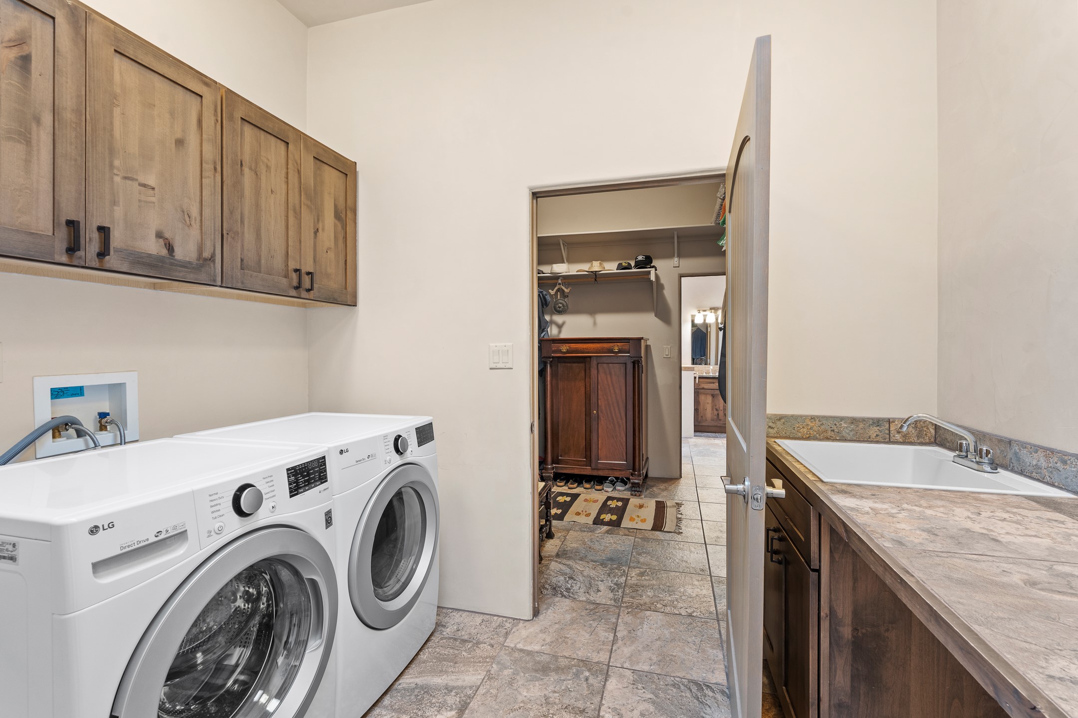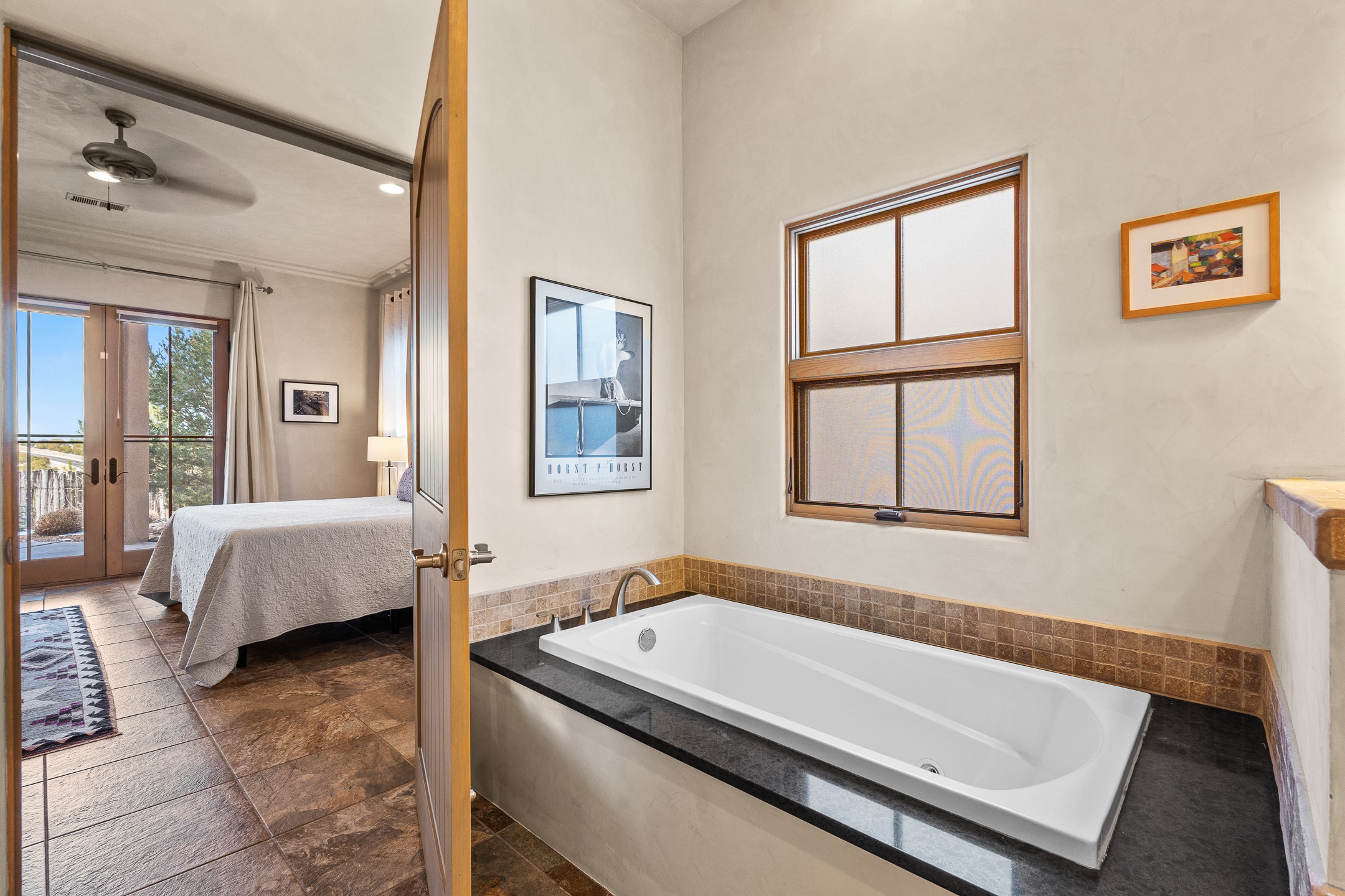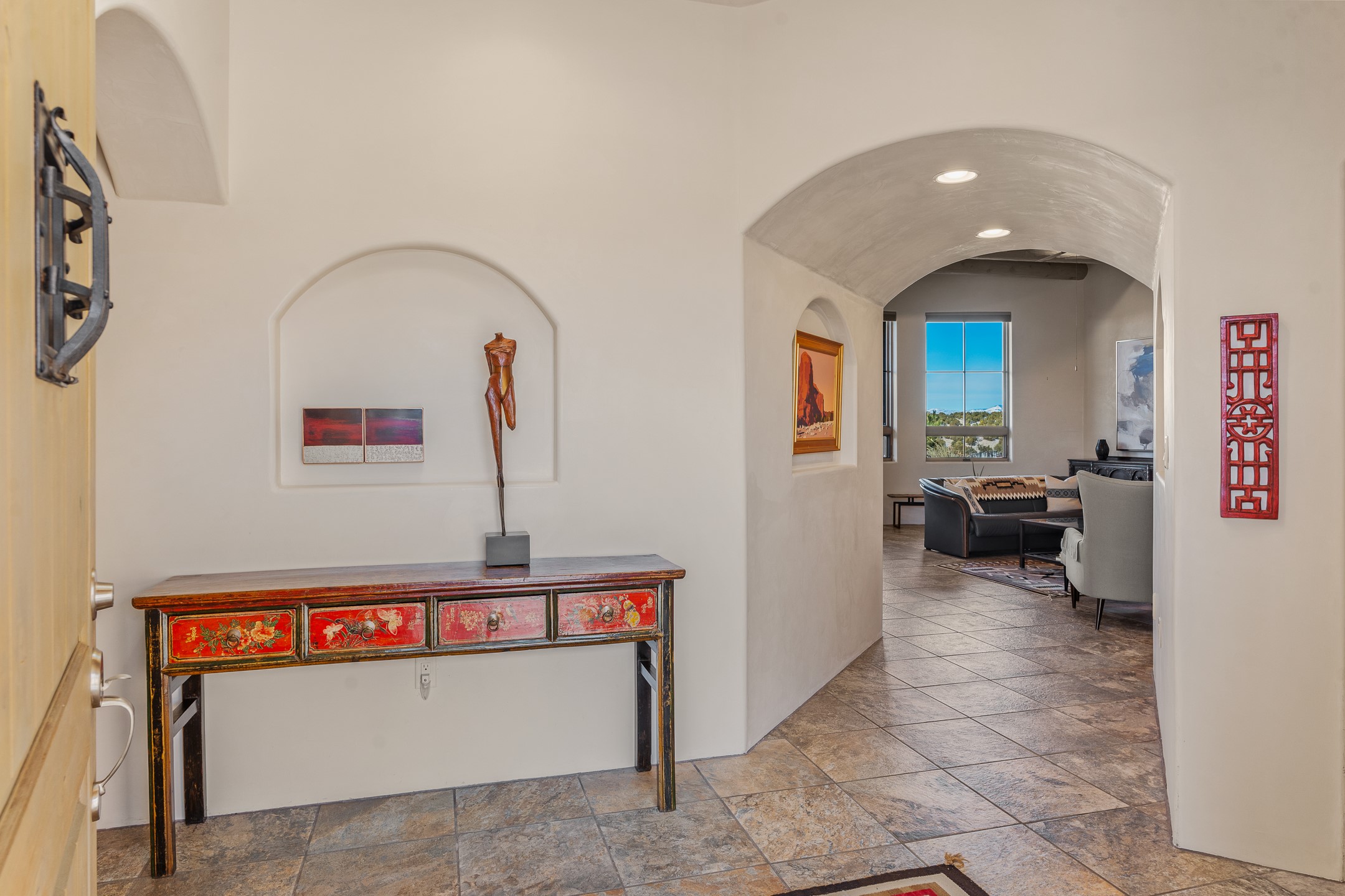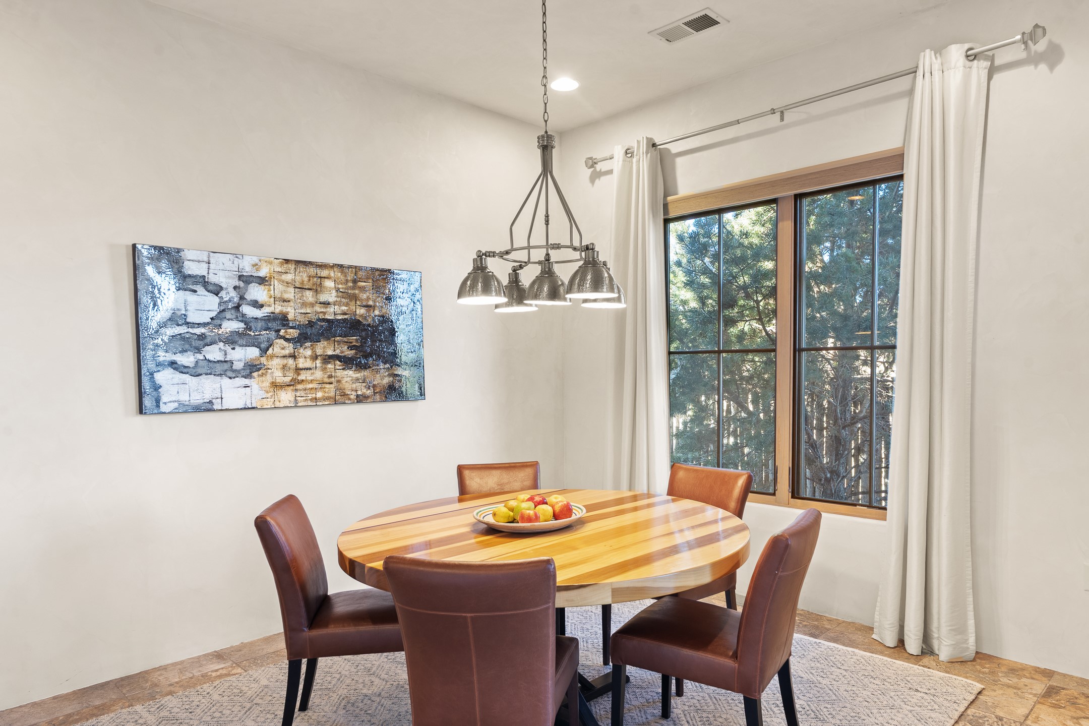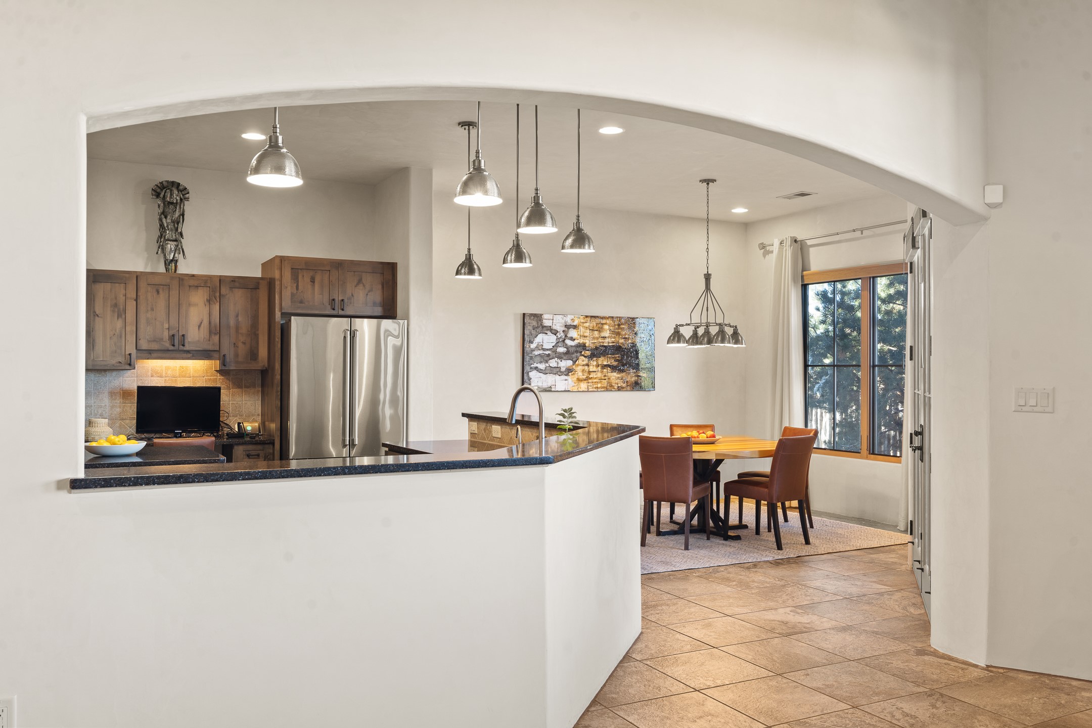 Sophisticated soft-contemporary living awaits in this beautifully designed single-level home, ideally situated on a desirable corner lot in the vibrant community of Aldea de Santa Fe. Built in 2014, this thoughtfully planned residence offers approximately 2,746 square feet of elegant living space, including three bedrooms, three baths, and a two-car garage.The well-designed floor plan provides excellent separation of spaces. A generous guest bedroom features an en-suite bath, while a versatile office or third bedroom includes a private exterior entrance--perfect for guests, creative pursuits, or a home office. Stone flooring throughout creates a clean, modern aesthetic, complemented by forced air heating and air conditioning for year-round comfort.The open-concept living, dining, and kitchen areas offer a seamless yet well-defined flow. The living room is highlighted by exposed beams, a gas fireplace, and tall windows that flood the space with natural light. The spacious kitchen is appointed with knotty alder cabinetry, extensive solid-surface countertops for food preparation, a stainless-steel range with exterior venting, a center island, and a built-in desk area--ideal for everyday living and entertaining.The primary suite serves as a serene retreat, featuring two spacious walk-in closets and a spa-inspired bath. Light-filled living and dining areas open effortlessly to the rear patio, where mature landscaping, raised garden beds for homegrown vegetables, and a charming peek-a-boo view of the Jemez Mountains create a tranquil outdoor setting for relaxation or gatherings.Aldea de Santa Fe is known for its village-style charm and active lifestyle, offering residents miles of walking trails, expansive shared open space, a community center, and tennis, basketball, and bocce courts. Annual art tours, community garage sales, and a variety of social clubs foster a welcoming and connected neighborhood atmosphere.This home presents a rare opportunity to enjoy refined comfort, thoughtful design, and a true sense of community--Santa Fe living at its best.