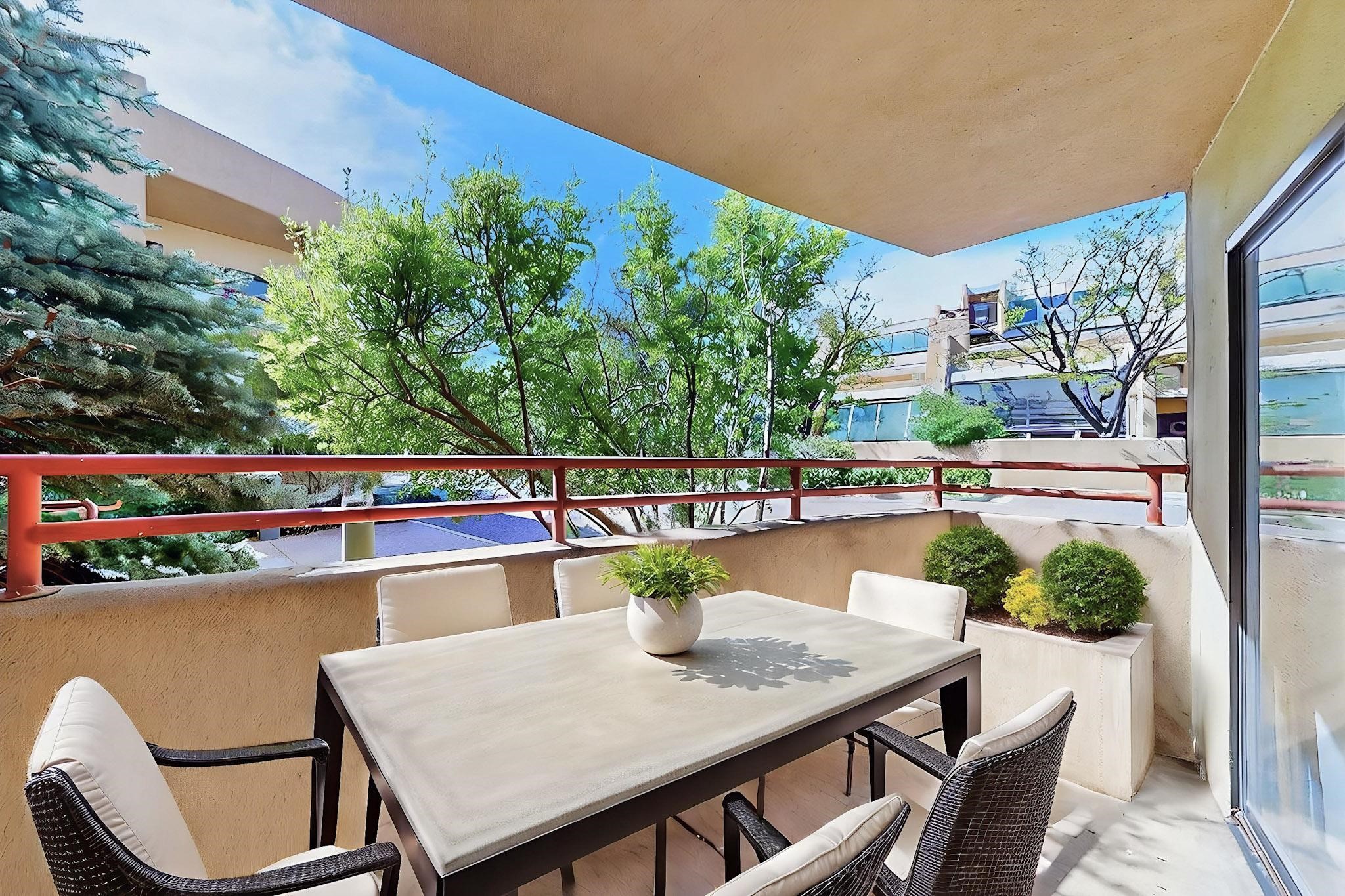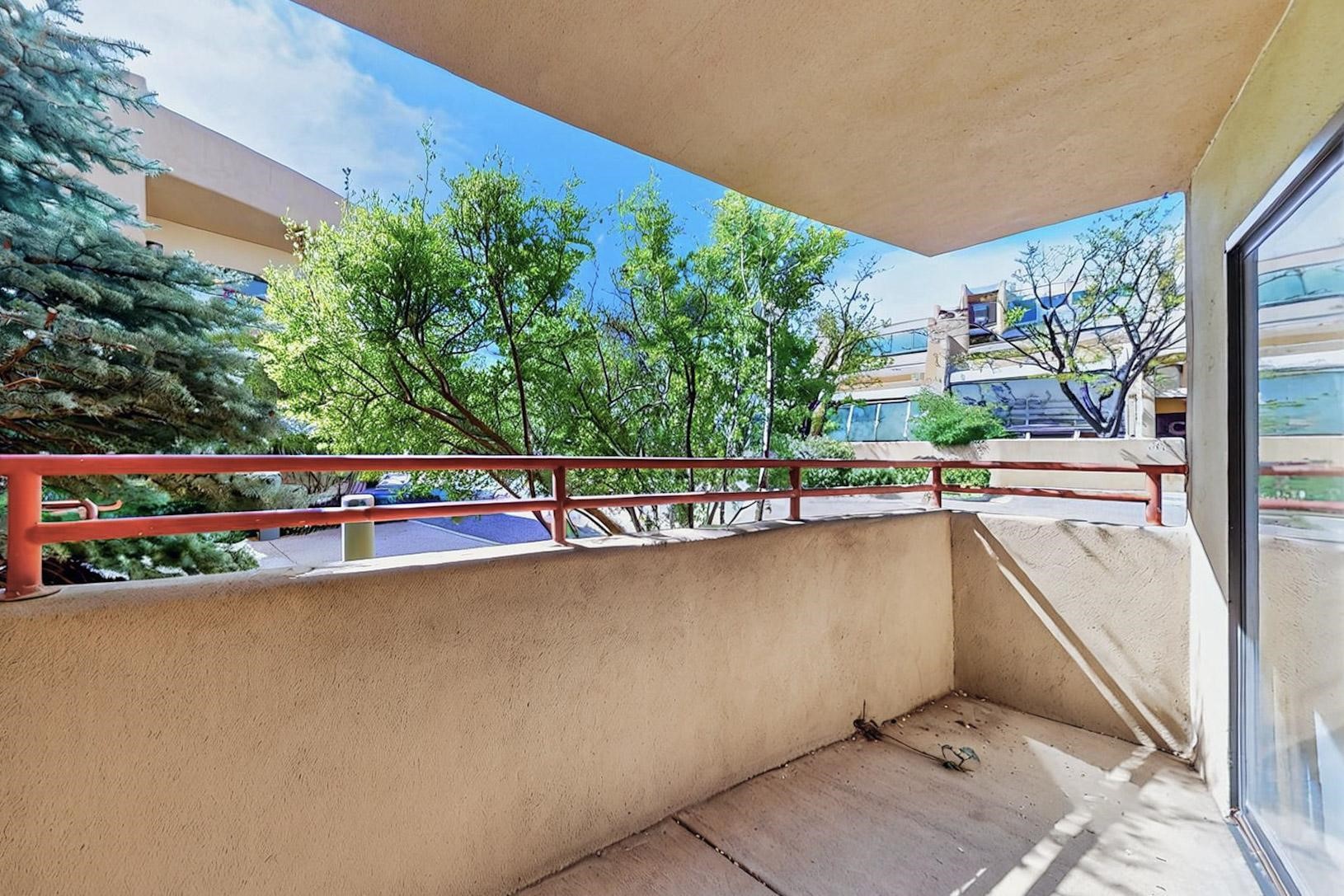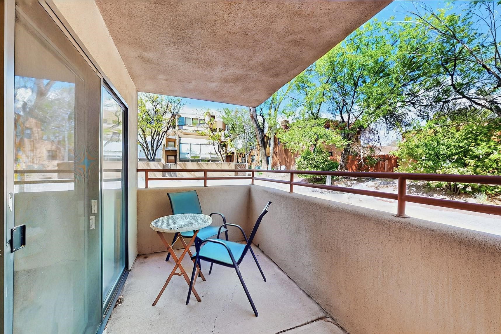 Grandparents need a crash pad? Student without campus housing? Or, just downsizing? Midtown ground floor end unit with secured direct entry right off the assigned covered carport and no stairs! Huge 17' x 6 1/2' storage closet perfect for skis, biclycles, etc., to free up condo space. Close to Trader Joe's, State buildings, shopping and restaurants. Contemporary spacious layout flanked by 2 private terraces; east for breakfast and west for sunset cocktails. Open concept living/dining/kitchen with 10' ceilings. Large galley kitchen with laundry and central A/C. Public transportation to The Plaza is about 5 to 10 minutes away and the close by Rail Runner takes about an hour to Albuquerque. This small complex is close to everything yet discretely hidden for quiet and privacy with a nicely landscaped courtyard.