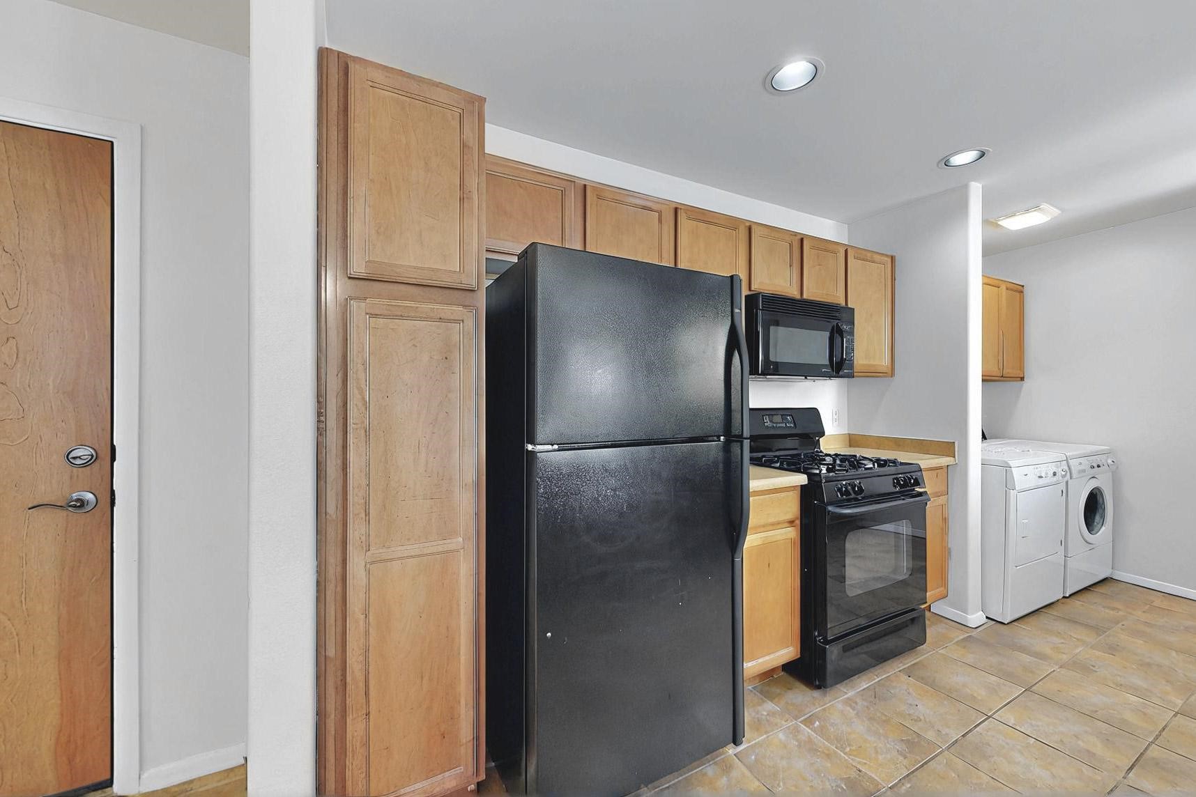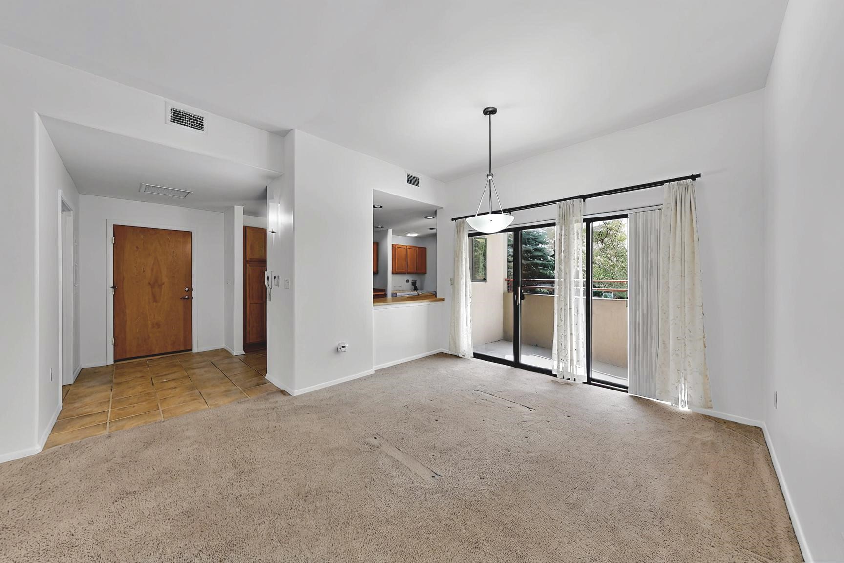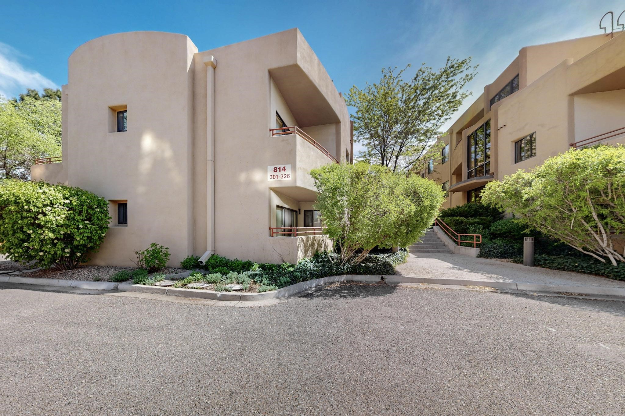 Grandparents need a crash pad? Student without campus housing? Or, just downsizing? Midtown ground floor end unit with secured direct entry right off the assigned covered carport and no stairs! Huge 17' x 6 1/2' storage closet perfect for skis, biclycles, etc., to free up condo space. Close to Trader Joe's, State buildings, shopping and restaurants. Contemporary spacious layout flanked by 2 private terraces; east for breakfast and west for sunset cocktails. Open concept living/dining/kitchen with 10' ceilings. Large galley kitchen with laundry and central A/C. Public transportation to The Plaza is about 5 to 10 minutes away and the close by Rail Runner takes about an hour to Albuquerque. This small complex is close to everything yet discretely hidden for quiet and privacy with a nicely landscaped courtyard.