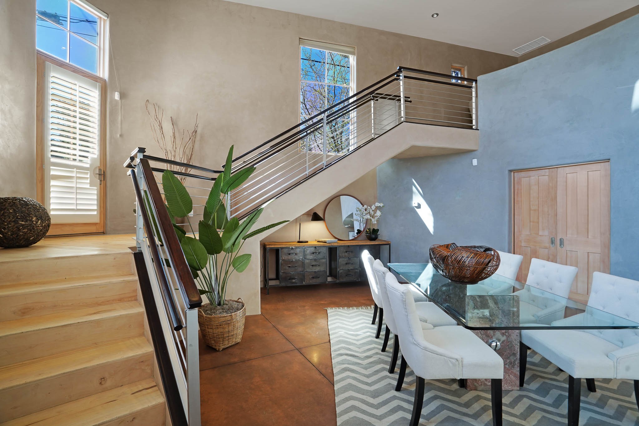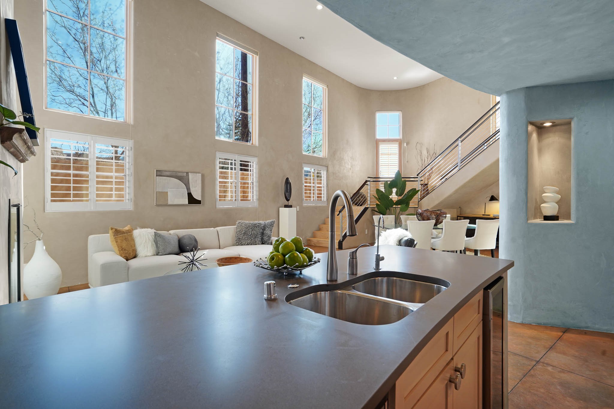 Stylish and thoughtfully designed, this light-filled condo is just steps from Kaune's Neighborhood Market and within walking distance of many of Santa Fe's most beloved destinations. Blending modern comfort with timeless Southwest charm, this home offers an ideal balance of convenience, elegance, and versatility. A private gated front courtyard shaded by graceful Aspen trees welcomes you home and provides a peaceful setting for morning coffee or evening relaxation. Inside, the open-concept main level features soaring ceilings, expansive windows, and American clay walls that beautifully reflect the natural light. A gas log fireplace adds warmth and ambiance, while the chef's kitchen is equipped with high-end appliances and a spacious island perfect for gathering with family and friends. The first floor also includes a comfortable guest bedroom and full bathroom, offering privacy and convenience for visitors. Upstairs, a sunlit landing creates an inviting space for a home office or reading nook. The primary suite serves as a tranquil retreat with picturesque views and a sleek ensuite bathroom. A dedicated laundry area within the primary closet adds everyday ease. Designed for low-maintenance living, this home is an ideal lock-and-leave property. Enjoy year-round comfort with radiant heat, central air conditioning, and a two-car garage.Zoned RAC for multi-purpose use, the property offers rare flexibility in one of Santa Fe's most desirable locations. Schedule your showing today and experience the very best of Santa Fe living.