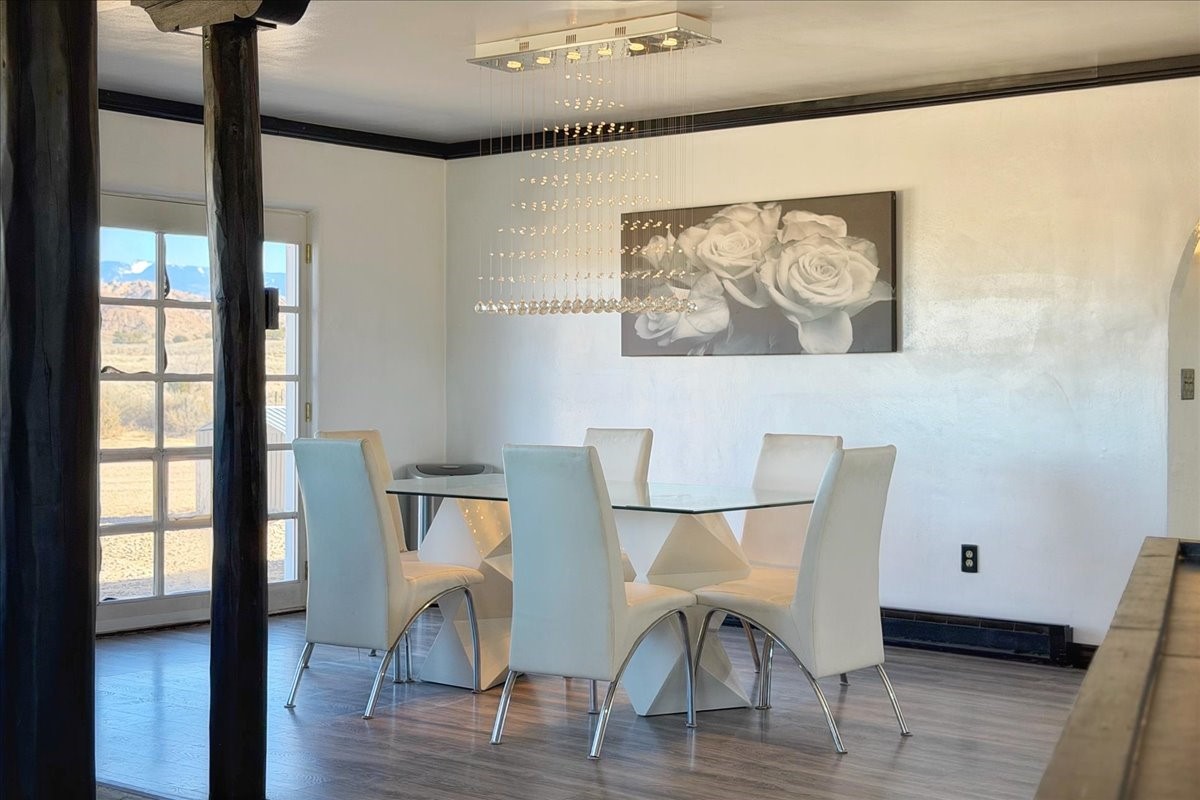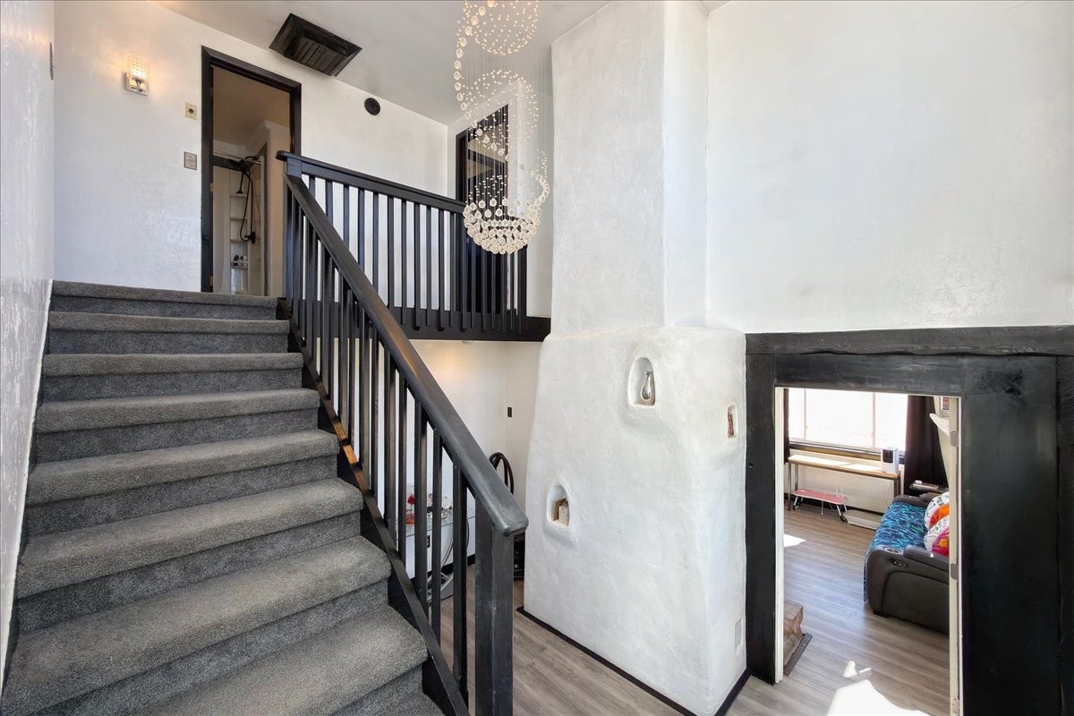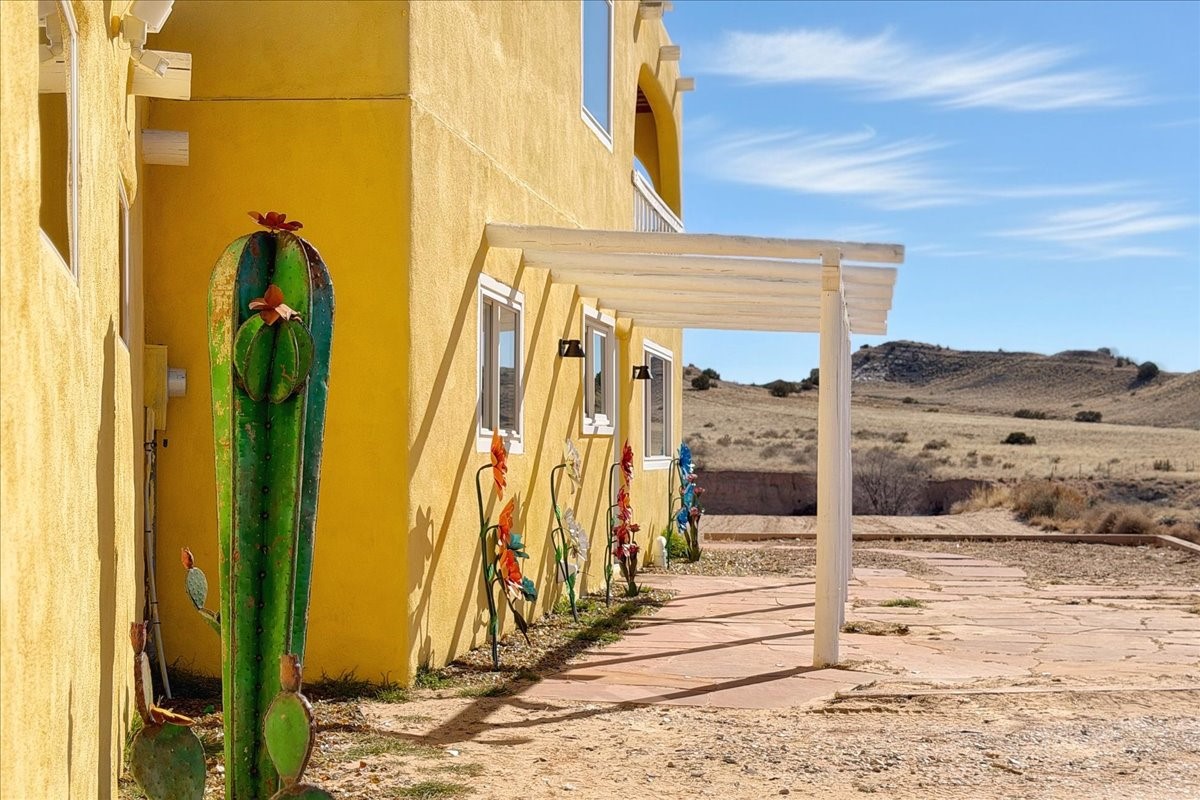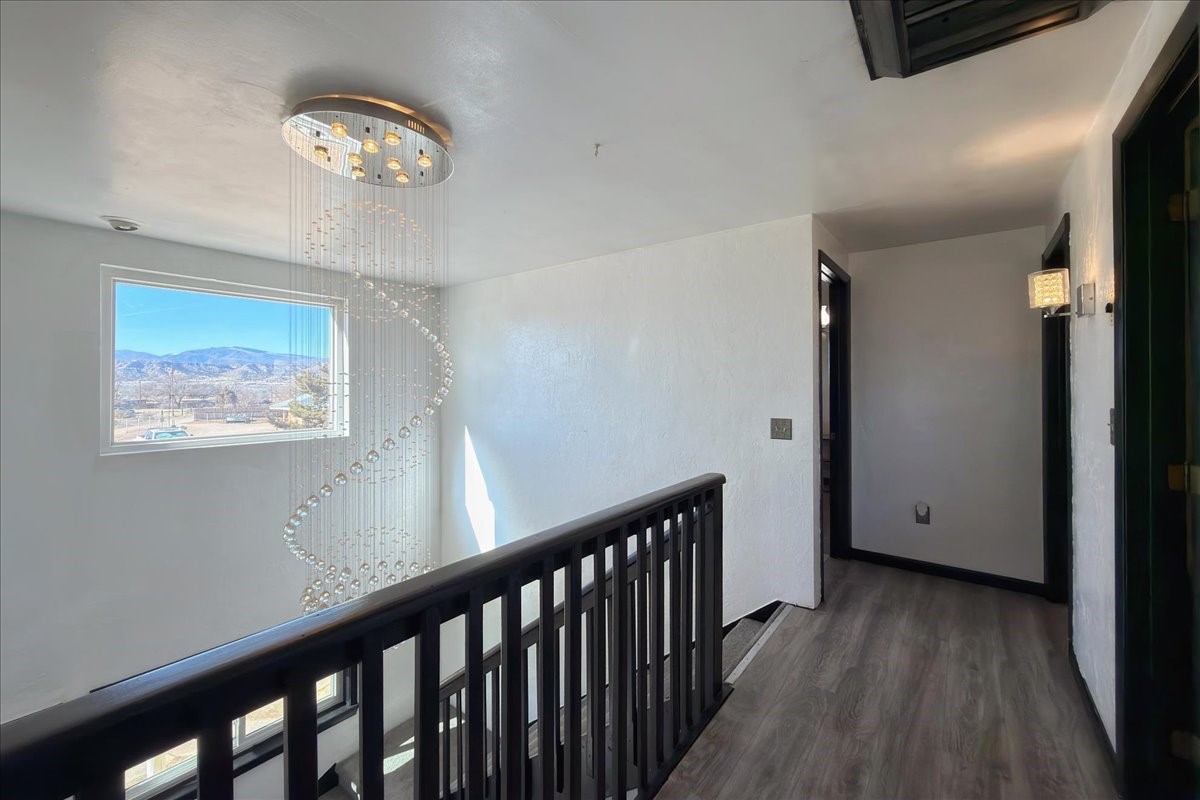 Set on 1.5 private acres with stunning 360-degree views, this beautifully updated home blends sparkle, warmth, and comfort in a peaceful cul-de-sac setting. Featuring 3-4 bedrooms and 3 bathrooms, the home welcomes you with a grand entry, striking lighting, and an open-concept layout designed for both everyday living and entertaining. The main level offers a spacious living area with a cozy pellet stove, a formal dining space highlighted by a gorgeous light fixture, and a bright kitchen updated with granite countertops, a shimmering backsplash, and picturesque views from the sink. A conveniently located laundry room and half bath add ease, while a bonus room or bedroom showcases a beautiful wood-burning fireplace for extra charm. Upstairs, you'll find two generously sized bedrooms with an updated full bath, plus a serene primary suite with an en-suite bathroom and private deck to take in even more breathtaking scenery. Additional features include newer windows, a fenced yard, outbuildings with a detached garage/shop and large shed for storage or projects. The roof and septic system are only seven years old, offering peace of mind. Enjoy quiet country living with easy access to Santa Fe, Espaola, and Los Alamos--privacy, beauty, and convenience all in one sparkling, welcoming home.