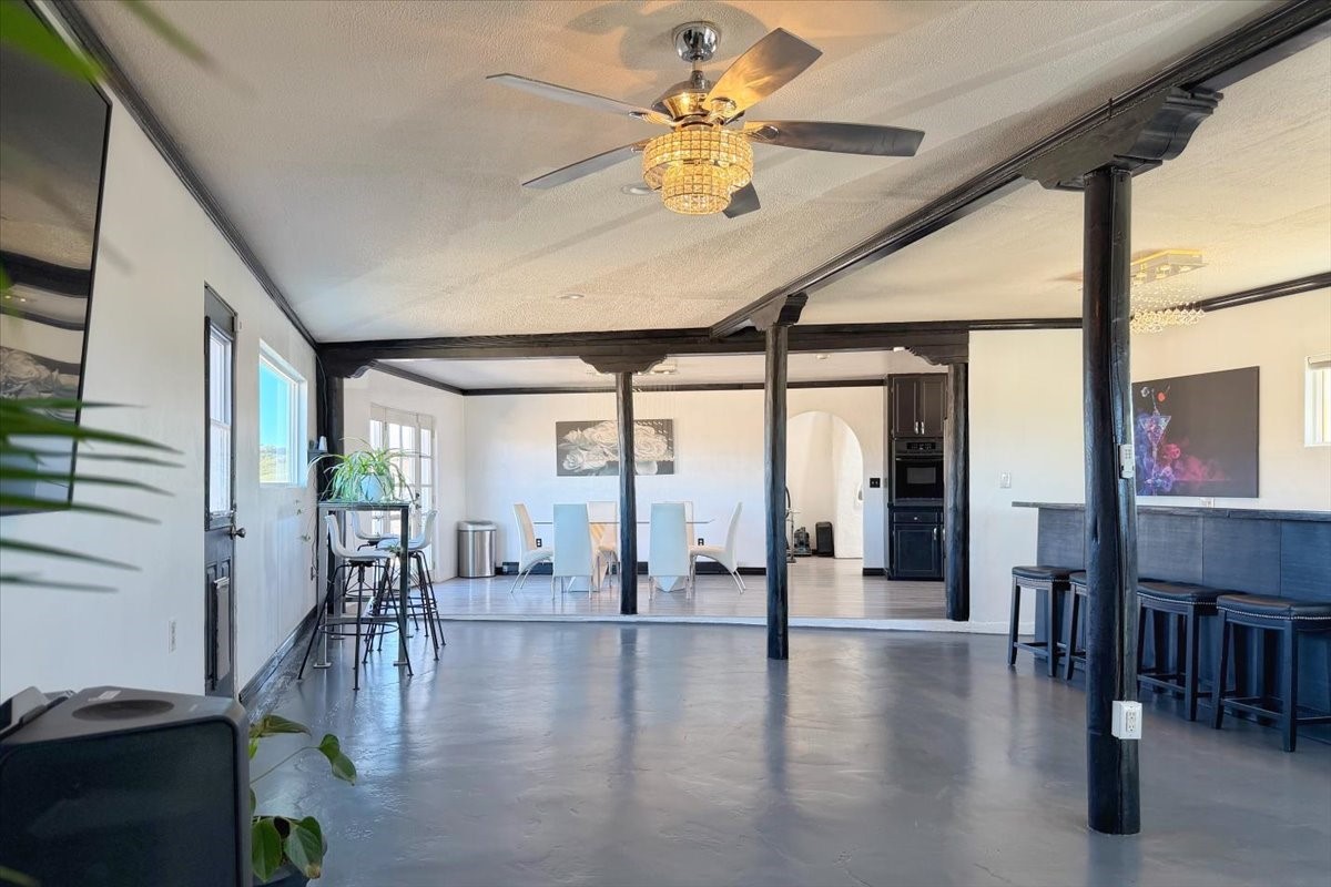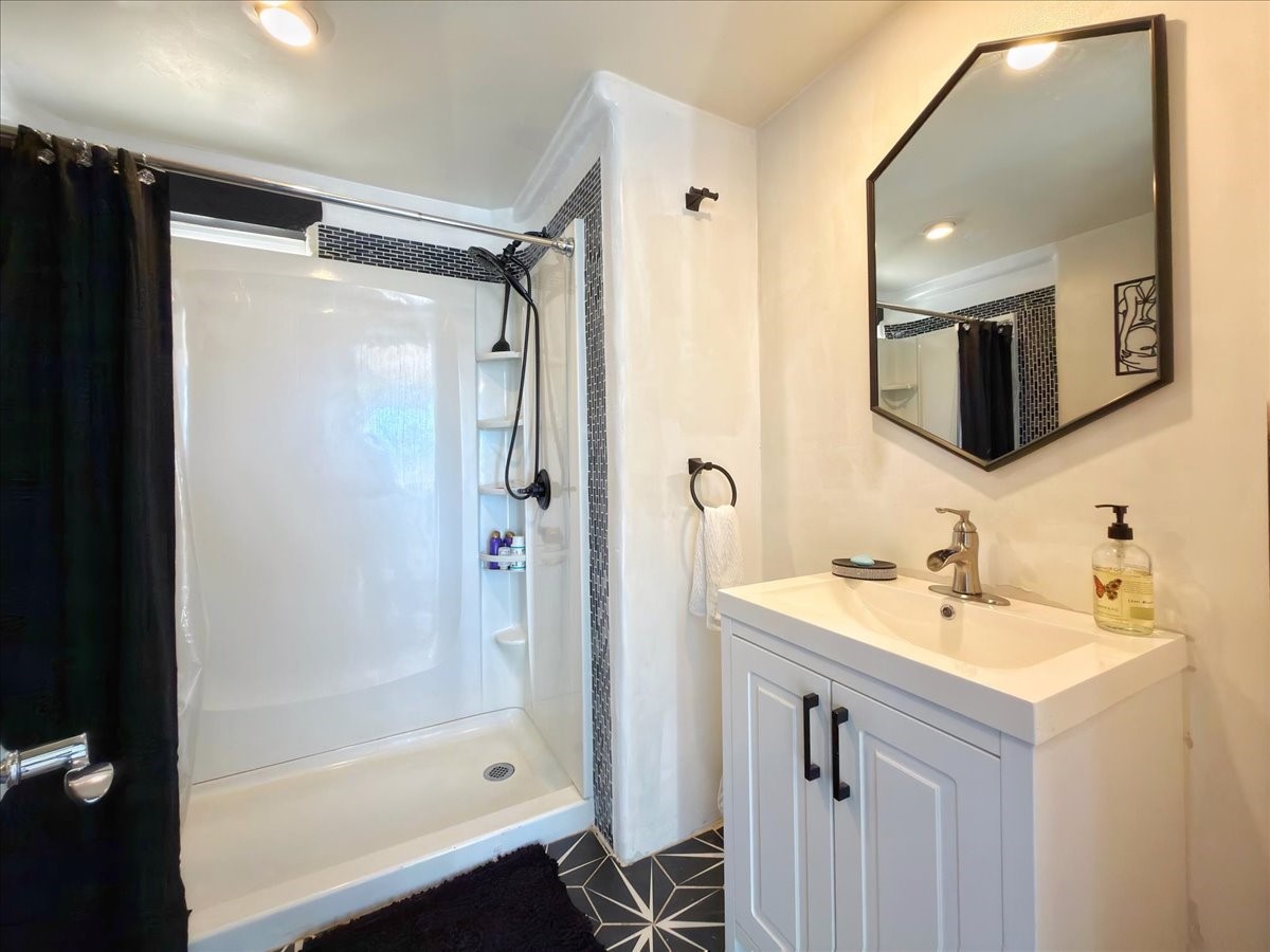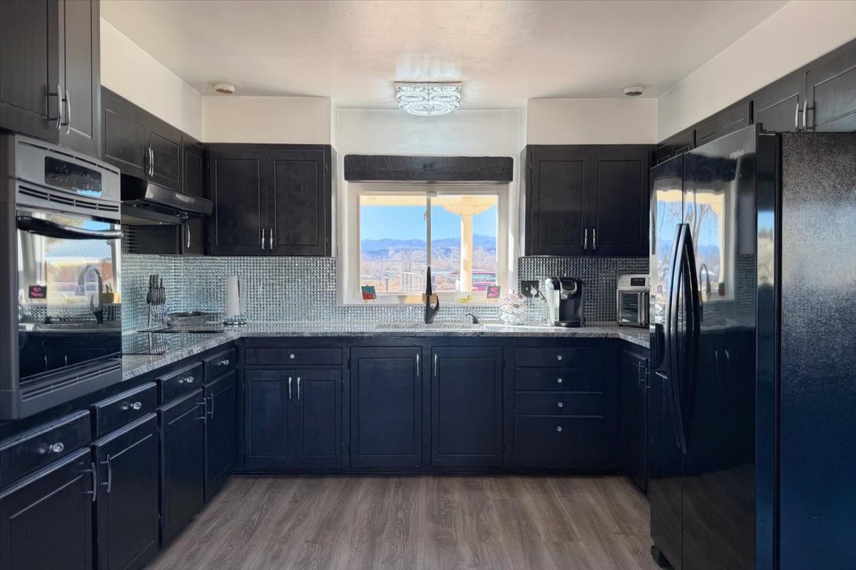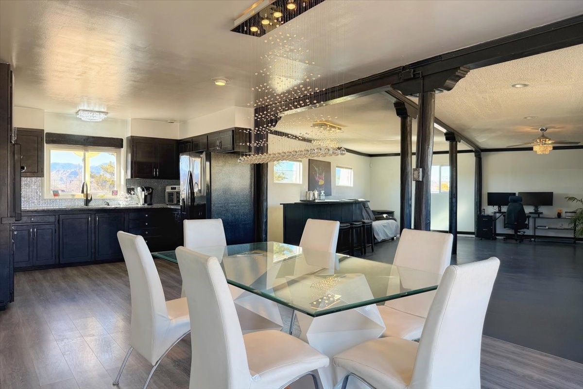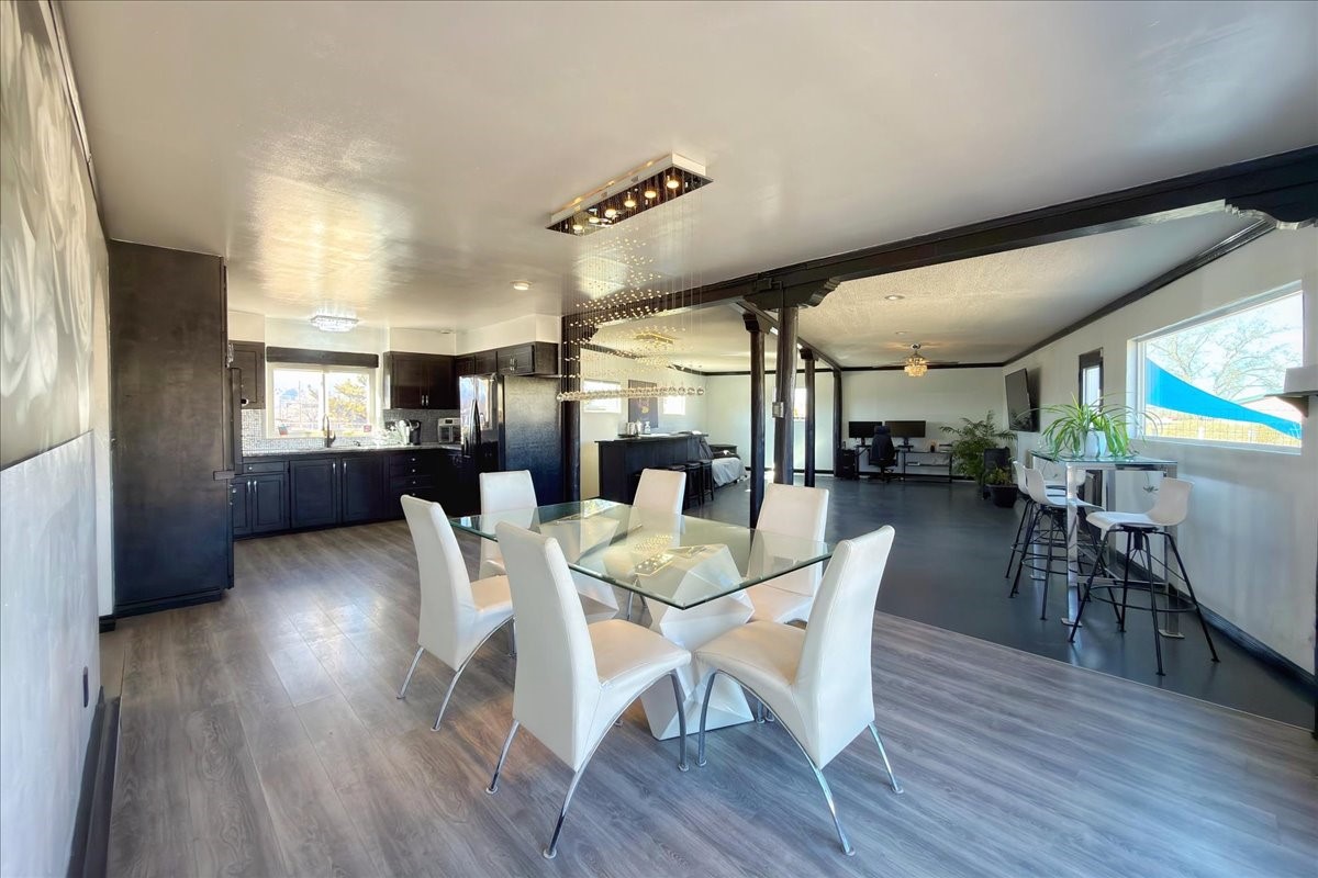 Set on 1.5 private acres with stunning 360-degree views, this beautifully updated home blends sparkle, warmth, and comfort in a peaceful cul-de-sac setting. Featuring 3-4 bedrooms and 3 bathrooms, the home welcomes you with a grand entry, striking lighting, and an open-concept layout designed for both everyday living and entertaining. The main level offers a spacious living area with a cozy pellet stove, a formal dining space highlighted by a gorgeous light fixture, and a bright kitchen updated with granite countertops, a shimmering backsplash, and picturesque views from the sink. A conveniently located laundry room and half bath add ease, while a bonus room or bedroom showcases a beautiful wood-burning fireplace for extra charm. Upstairs, you'll find two generously sized bedrooms with an updated full bath, plus a serene primary suite with an en-suite bathroom and private deck to take in even more breathtaking scenery. Additional features include newer windows, a fenced yard, outbuildings with a detached garage/shop and large shed for storage or projects. The roof and septic system are only seven years old, offering peace of mind. Enjoy quiet country living with easy access to Santa Fe, Espaola, and Los Alamos--privacy, beauty, and convenience all in one sparkling, welcoming home.