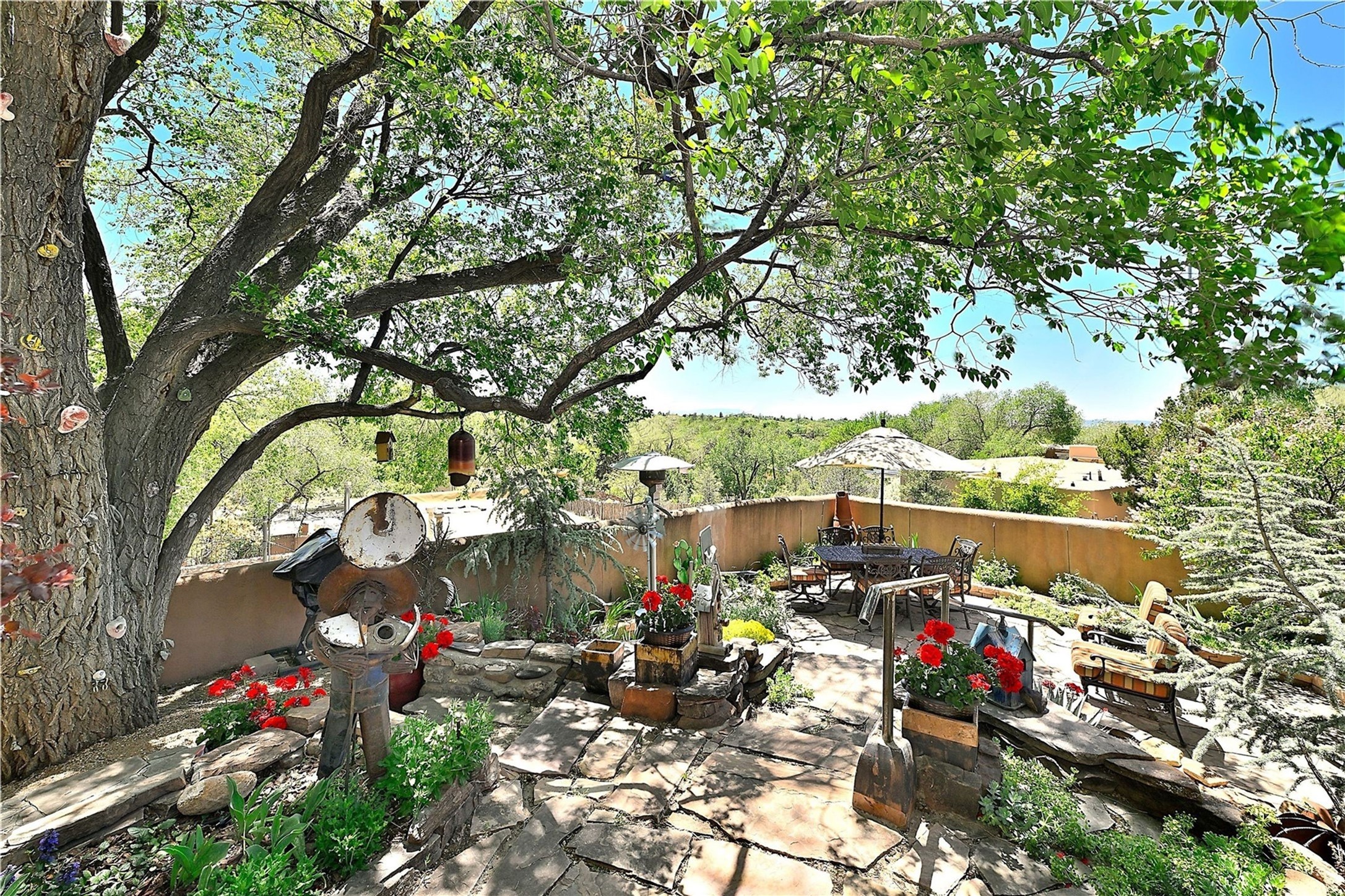 This historic and charming adobe split level home is nestled in the hills of Santa Fe's historic East Side, set just above Palace Avenue, offering views and walking distance to both Canyon Road and the historic Plaza. Portions of the home reflect its 100-year history. The kitchen is a dream for any cook; it has been updated with granite countertops, a generous gas range, and high-end appliances. Wide plank pine floors run through the kitchen, dining and living area. The living room features a high-pitched ceiling with exposed vigas and beams, abundant natural light, plaster walls and a custom, wood-burning fireplace. The primary bedroom located downstairs features a pitched ceiling, cobblestone floors, an en suite bathroom, vigas and a loft that is well suited for a reading nook or home office. The guest bedroom is nicely separated from the primary bedroom and living area to allow for comfort and privacy with a full bathroom nearby. A set of stairs takes you down to an additional den/living/family room with cobblestone floors and a wood burning fireplace. The two fireplaces and baseboard heat will keep you warm as you relax and enjoy the views of town. The Corten steel roof adds durability and reflects the quality of this distinctive home. This two-bedroom, two bath home, plus den and office is 1,807 square feet. Relax, dine, and enjoy mountain views on the extensive tiered outdoor patio that has been beautifully landscaped. Convenient access to dining, galleries, and your Santa Fe lifestyle! Short-term rental possibility, please verify. Private showings available.