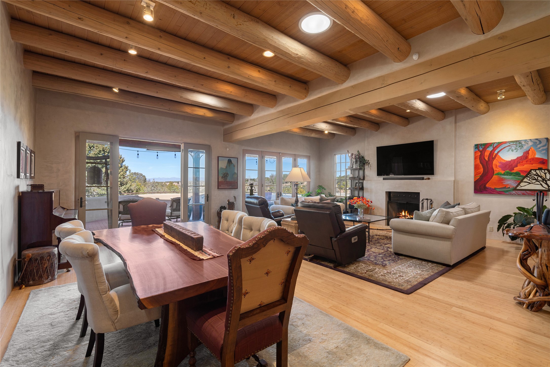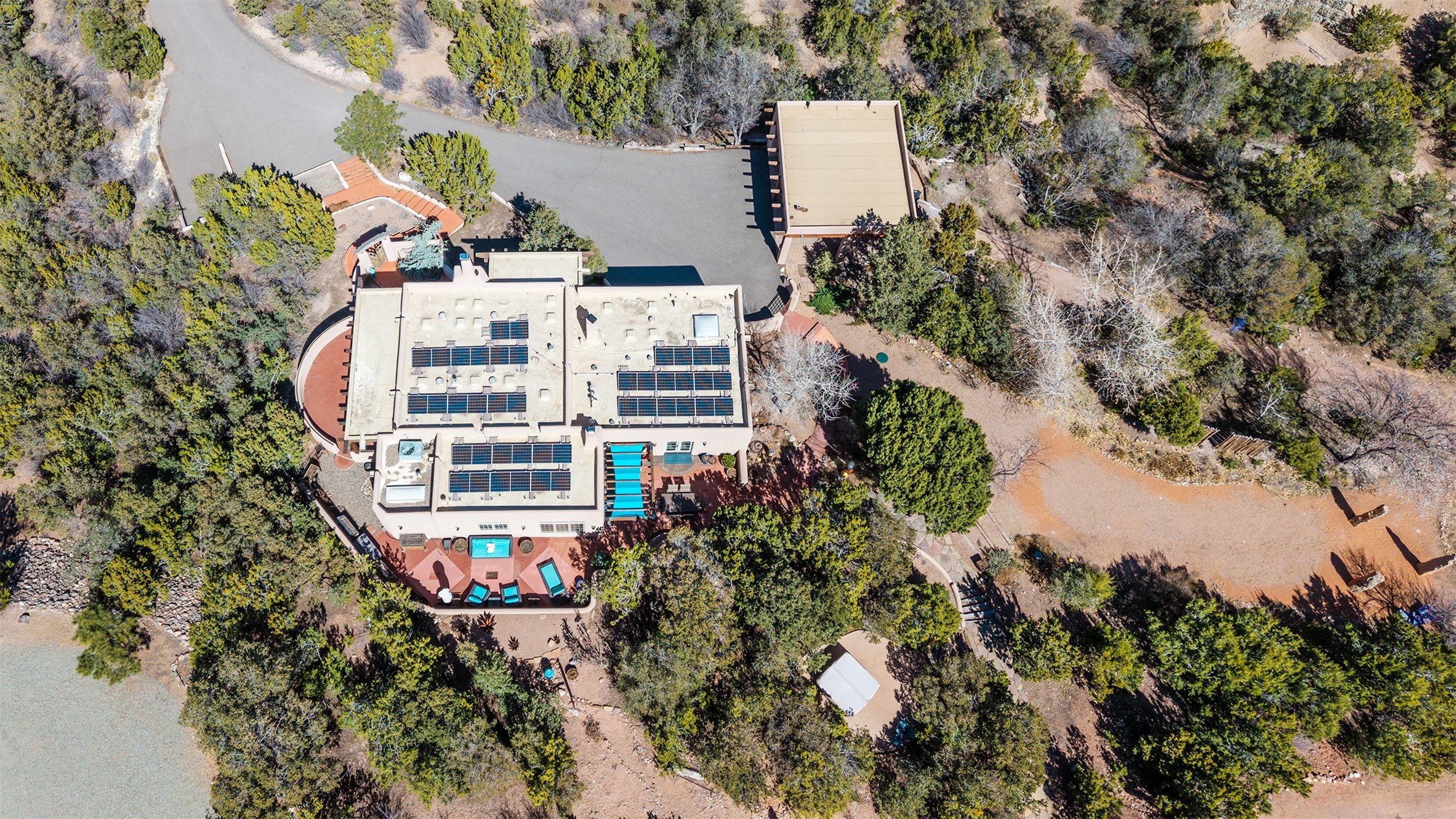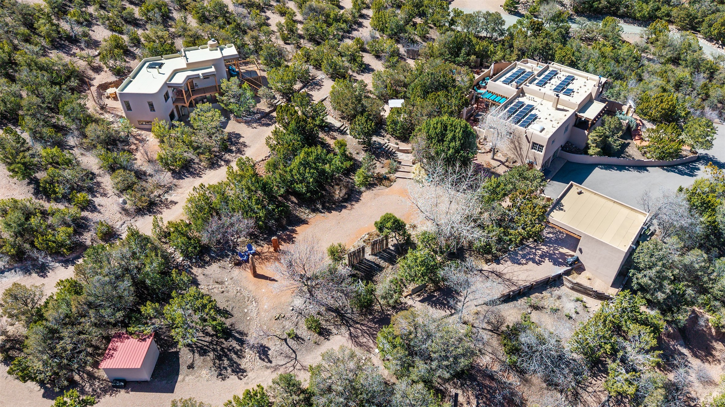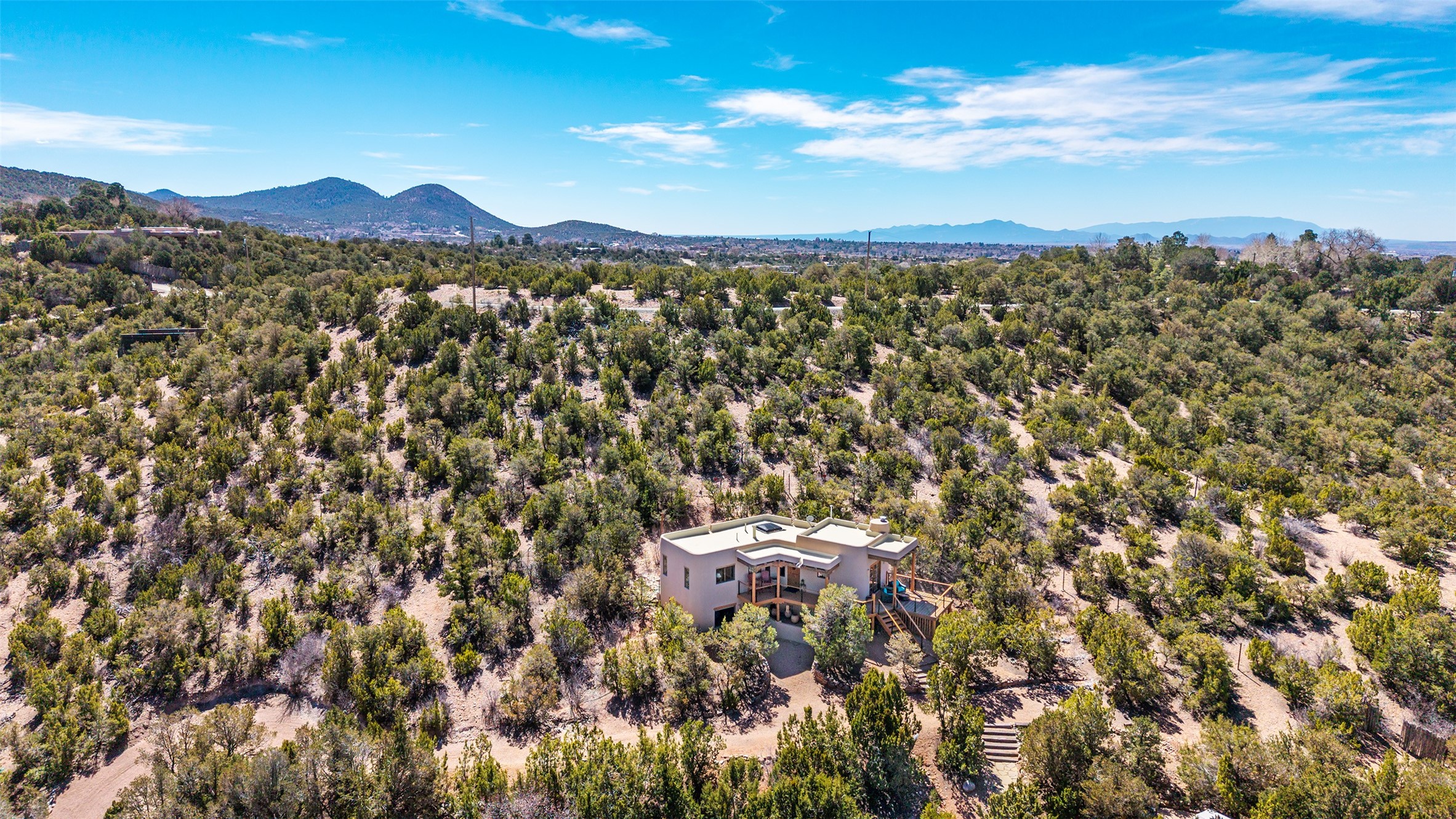 Set in the hills above Santa Fe with spectacular views of the Jemez Mountains, this distinctive 2.5-acre compound pairs privacy with proximity--just minutes from Canyon Road and the Plaza. The property includes a main residence and a separate guest casita, offering flexibility for visitors, creative space, or extended stays.The main home features high ceilings, arched doorways, vigas, bamboo floors, and diamond plaster walls. The open living and dining spaces face the Jemez Mountains through a wall of windows, with double French doors opening to a portal and patio positioned for sunset views.The kitchen is equipped with stainless Wolf and Sub-Zero appliances, granite countertops, a generous walk-in pantry, and a dining nook that opens through French doors to a patio perfect for morning coffee or an evening cookout with friends. The owner's suite sits down a quiet hallway and includes a spacious closet with custom shelving and a luxurious bath with bespoke stone and tile floors. A study completes the upper level, while the lower level offers a guest suite with ensuite bathroom that also works well as a studio or home office.Set apart at the rear of the 2.6 acre property, the guest casita has its own driveway access. The upper level includes a living area opening to a view deck, along with a bedroom, bath, and fully equipped kitchen with dining area. Below is a private second guest suite with bath, adaptable as a studio or workspace. A fully owned 8.3kW solar array provides the majority of the main home's electricity.