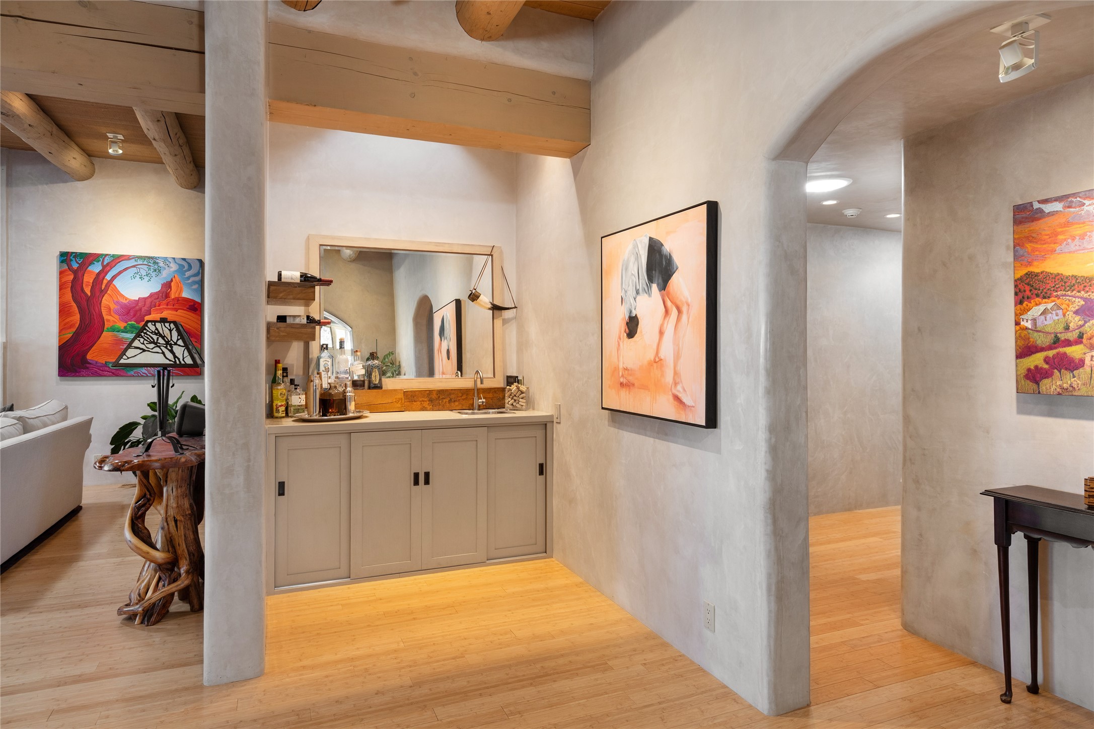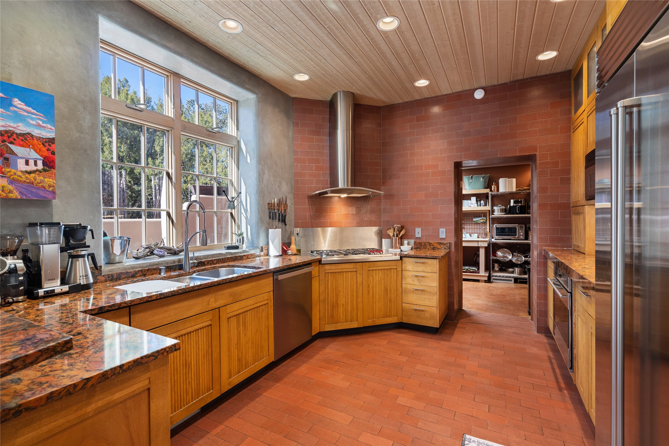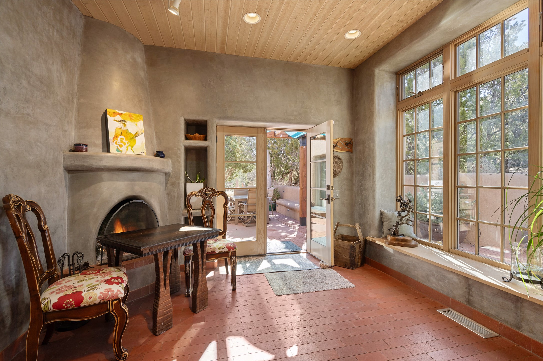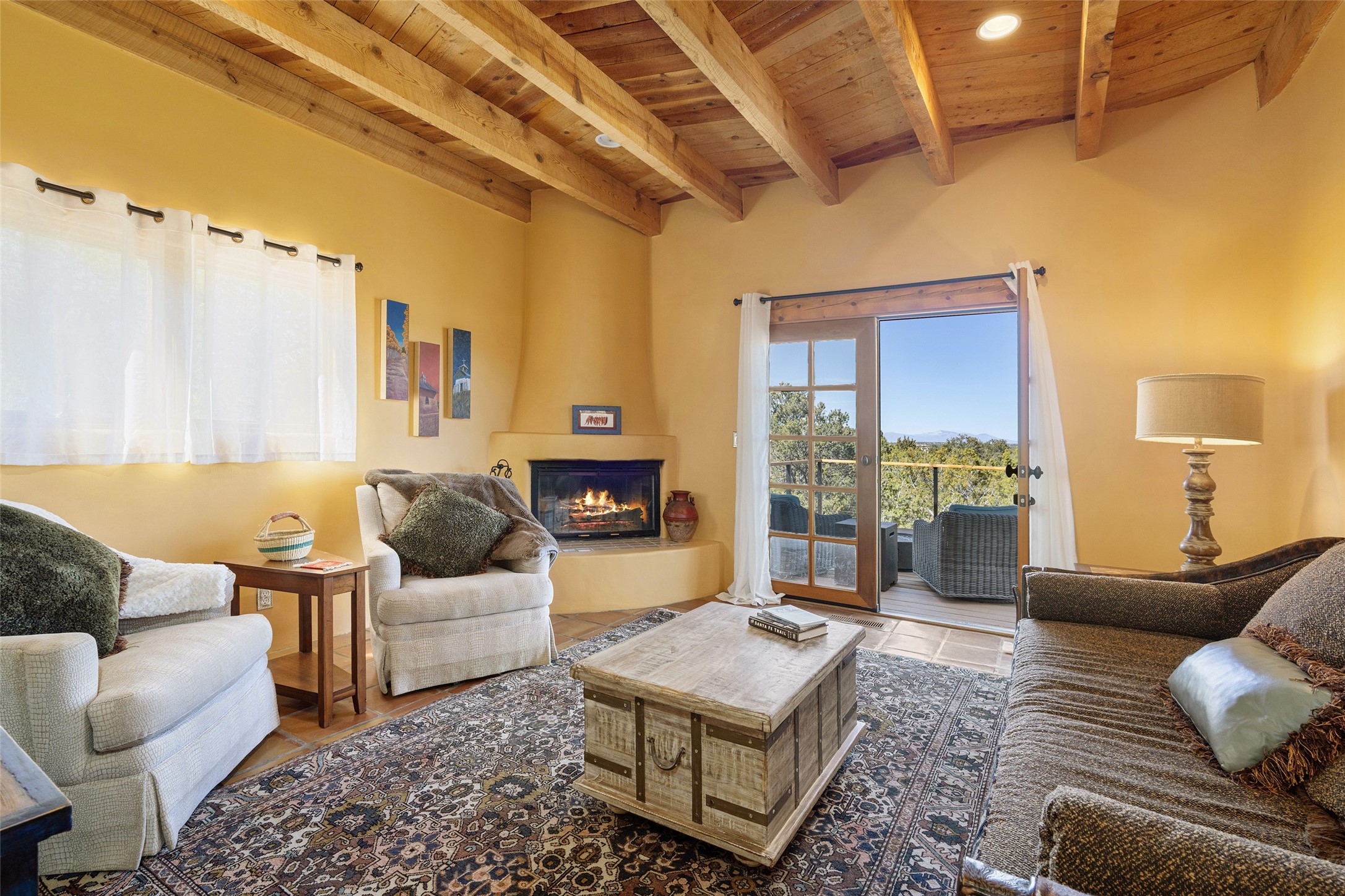 Set in the hills above Santa Fe with spectacular views of the Jemez Mountains, this distinctive 2.5-acre compound pairs privacy with proximity--just minutes from Canyon Road and the Plaza. The property includes a main residence and a separate guest casita, offering flexibility for visitors, creative space, or extended stays.The main home features high ceilings, arched doorways, vigas, bamboo floors, and diamond plaster walls. The open living and dining spaces face the Jemez Mountains through a wall of windows, with double French doors opening to a portal and patio positioned for sunset views.The kitchen is equipped with stainless Wolf and Sub-Zero appliances, granite countertops, a generous walk-in pantry, and a dining nook that opens through French doors to a patio perfect for morning coffee or an evening cookout with friends. The owner's suite sits down a quiet hallway and includes a spacious closet with custom shelving and a luxurious bath with bespoke stone and tile floors. A study completes the upper level, while the lower level offers a guest suite with ensuite bathroom that also works well as a studio or home office.Set apart at the rear of the 2.6 acre property, the guest casita has its own driveway access. The upper level includes a living area opening to a view deck, along with a bedroom, bath, and fully equipped kitchen with dining area. Below is a private second guest suite with bath, adaptable as a studio or workspace. A fully owned 8.3kW solar array provides the majority of the main home's electricity.