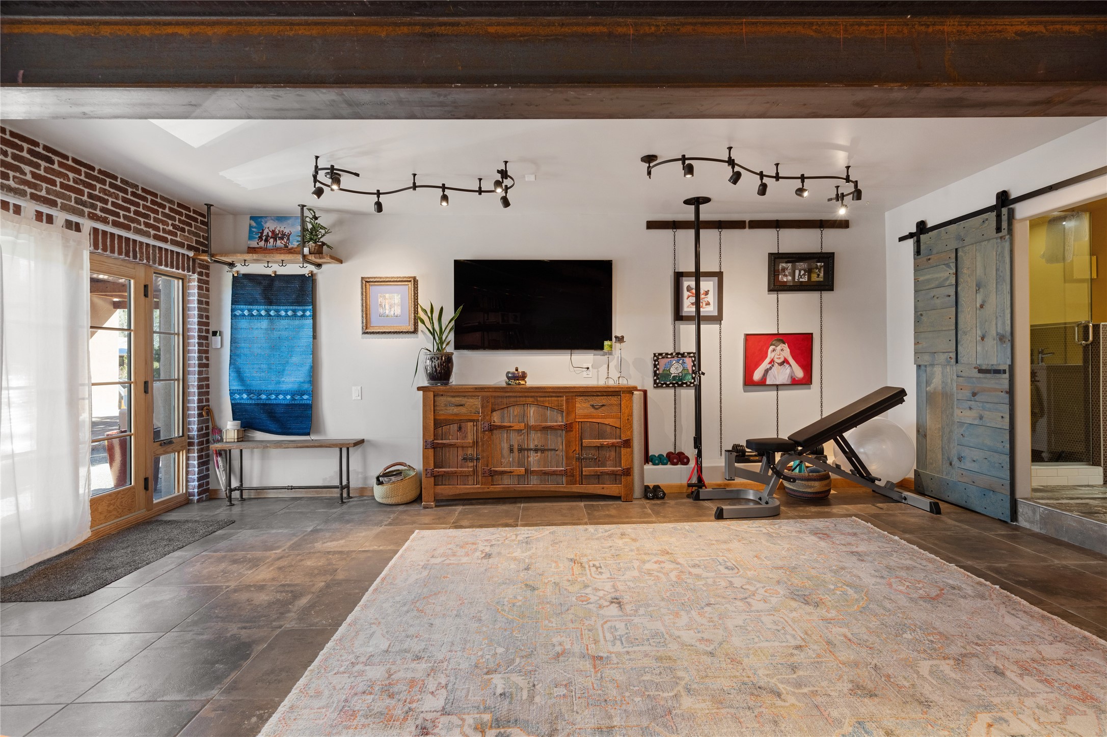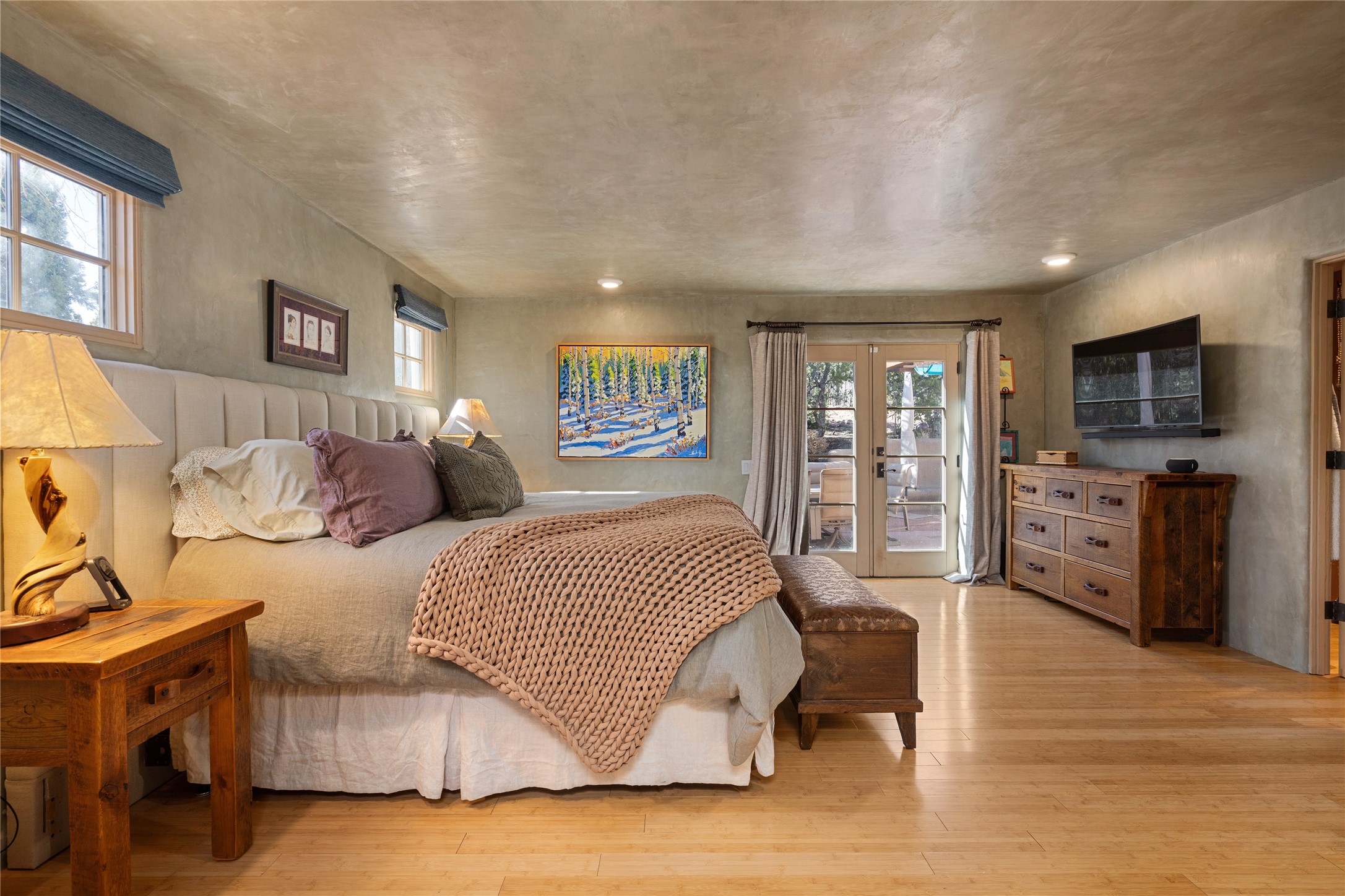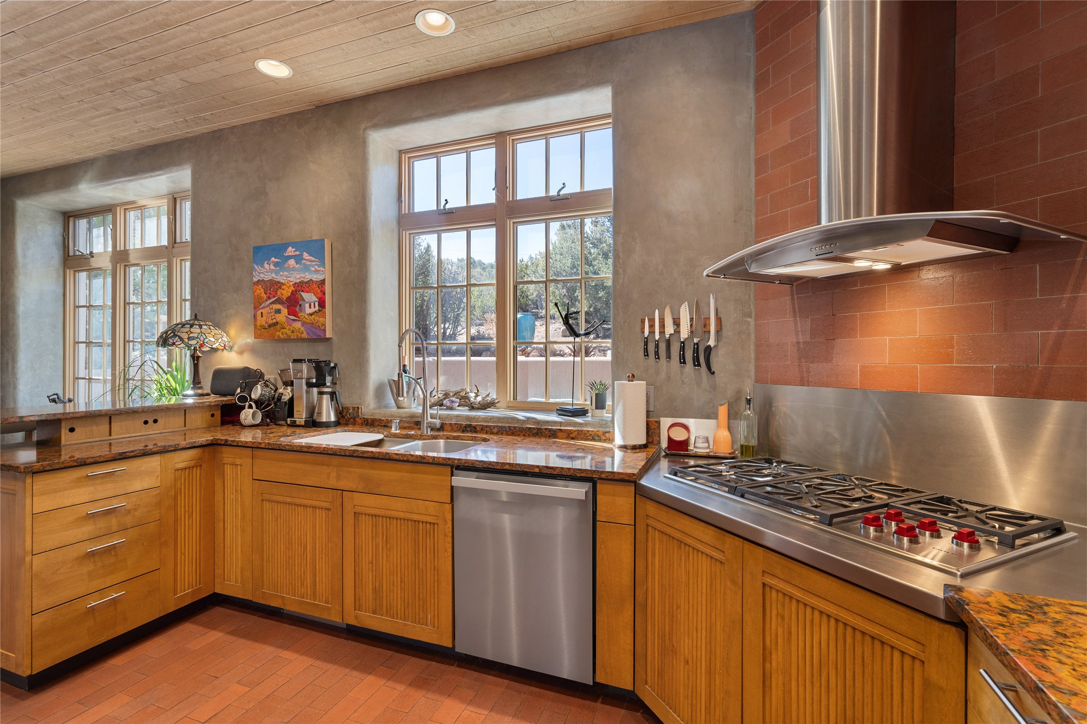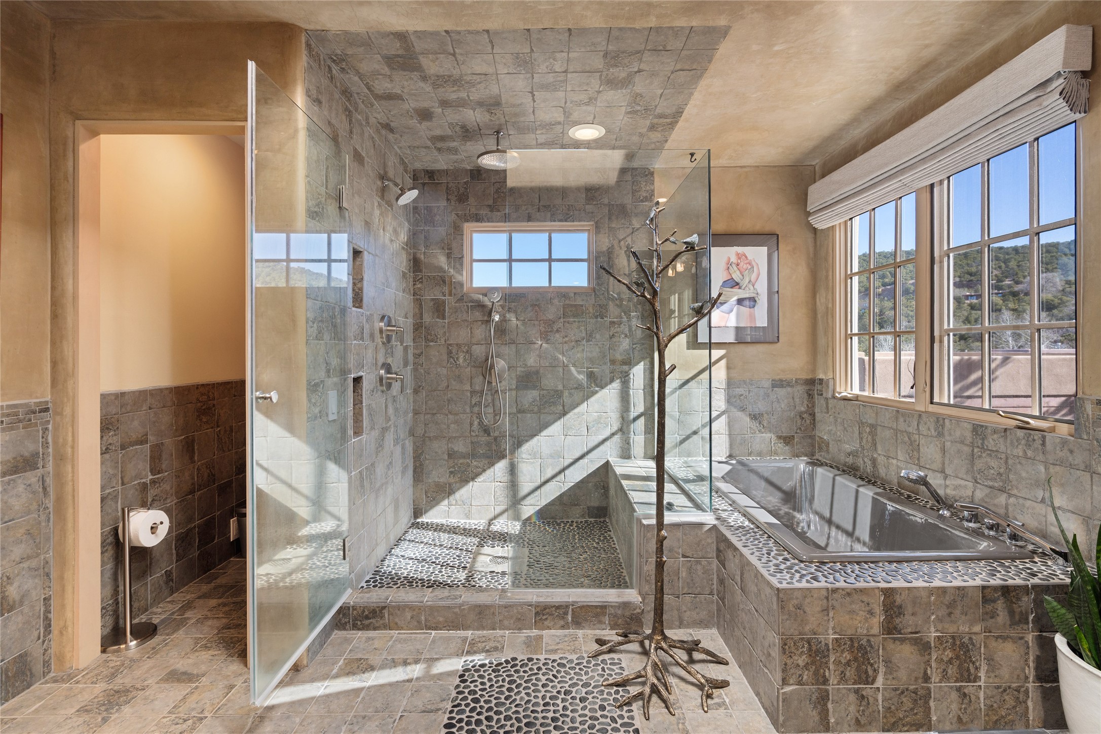 Set in the hills above Santa Fe with spectacular views of the Jemez Mountains, this distinctive 2.5-acre compound pairs privacy with proximity--just minutes from Canyon Road and the Plaza. The property includes a main residence and a separate guest casita, offering flexibility for visitors, creative space, or extended stays.The main home features high ceilings, arched doorways, vigas, bamboo floors, and diamond plaster walls. The open living and dining spaces face the Jemez Mountains through a wall of windows, with double French doors opening to a portal and patio positioned for sunset views.The kitchen is equipped with stainless Wolf and Sub-Zero appliances, granite countertops, a generous walk-in pantry, and a dining nook that opens through French doors to a patio perfect for morning coffee or an evening cookout with friends. The owner's suite sits down a quiet hallway and includes a spacious closet with custom shelving and a luxurious bath with bespoke stone and tile floors. A study completes the upper level, while the lower level offers a guest suite with ensuite bathroom that also works well as a studio or home office.Set apart at the rear of the 2.6 acre property, the guest casita has its own driveway access. The upper level includes a living area opening to a view deck, along with a bedroom, bath, and fully equipped kitchen with dining area. Below is a private second guest suite with bath, adaptable as a studio or workspace. A fully owned 8.3kW solar array provides the majority of the main home's electricity.