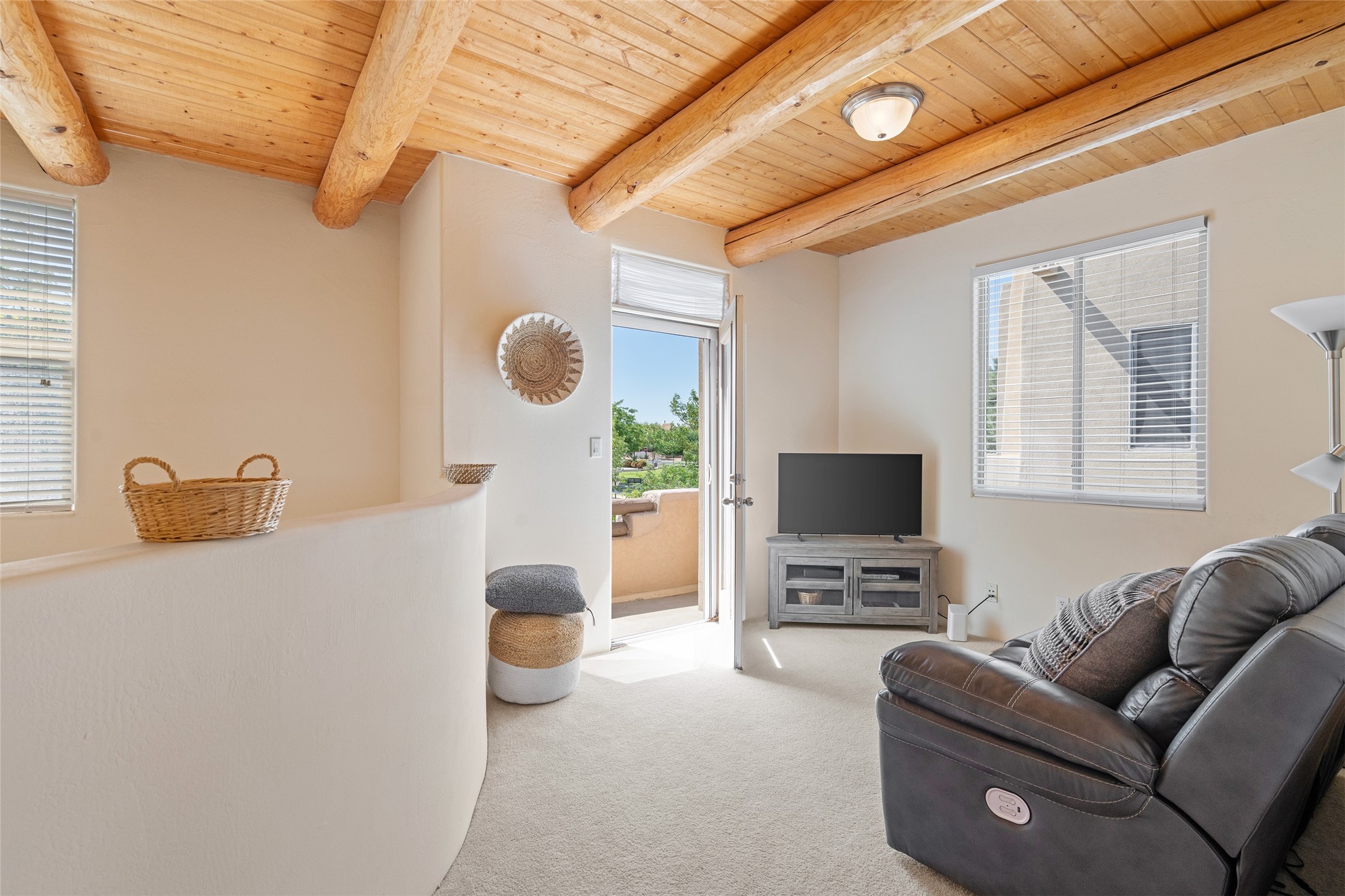 So lightly lived in, you'll be amazed at its pristine condition! Plus, a brand new heating and cooling HVAC system just installed! Located in the desirable Windmill Ridge area of Rancho Viejo, this turn-key property is ideal for full-time living or as a low-maintenance lock-and-leave aided by a smart thermostat Ecobee which is accessible through a smart phone. The main living area features beautiful tile floors and a soaring 20-foot ceiling, creating an open and expansive feel. A charming gas kiva fireplace, vigas, and wood ceilings add authentic Santa Fe warmth. The kitchen offers generous storage within maple cabinetry, complemented by soft neutral-toned tile countertops. A convenient laundry room and powder bath are located on the main level. Upstairs, a versatile loft provides the perfect space for a home office, media area, or reading nook, complete with a small balcony overlooking southern views and the neighborhood park. The primary suite boasts its own spacious balcony with sweeping views of designated open space and both the Jemez and Sangre de Cristo mountains. This immaculate home is part of a welcoming community featuring over 12 miles of paved walking trails, multiple parks, and an active HOA. Exterior maintenance is included in the townhome dues, making for stress-free living. Priced to sell and ready for its next owner!