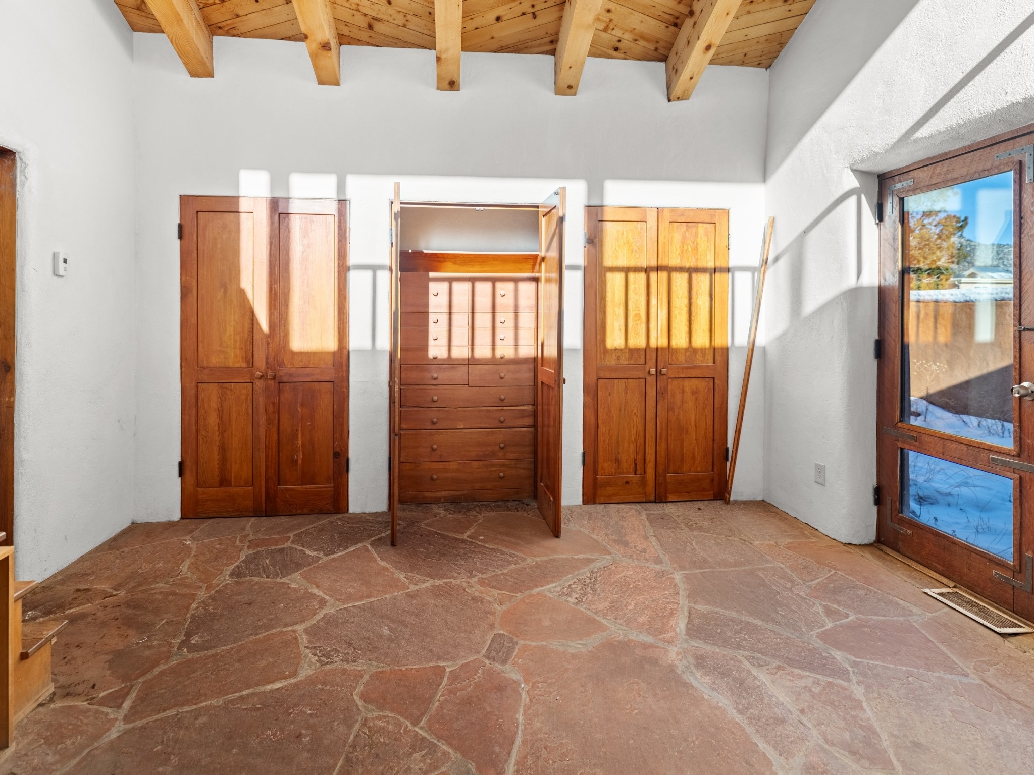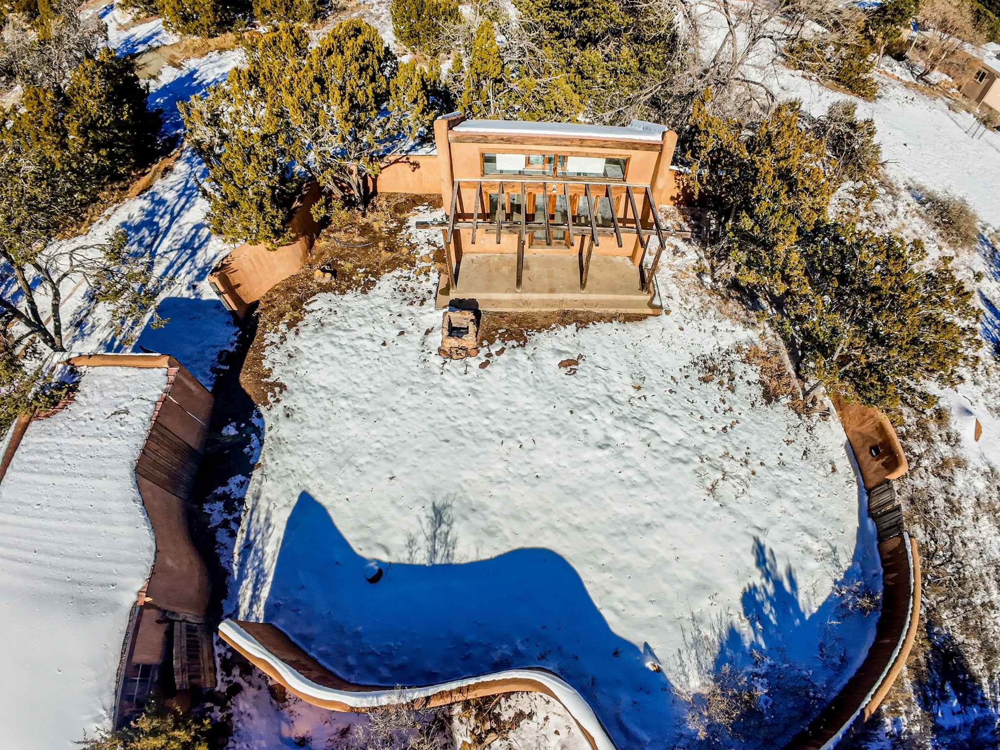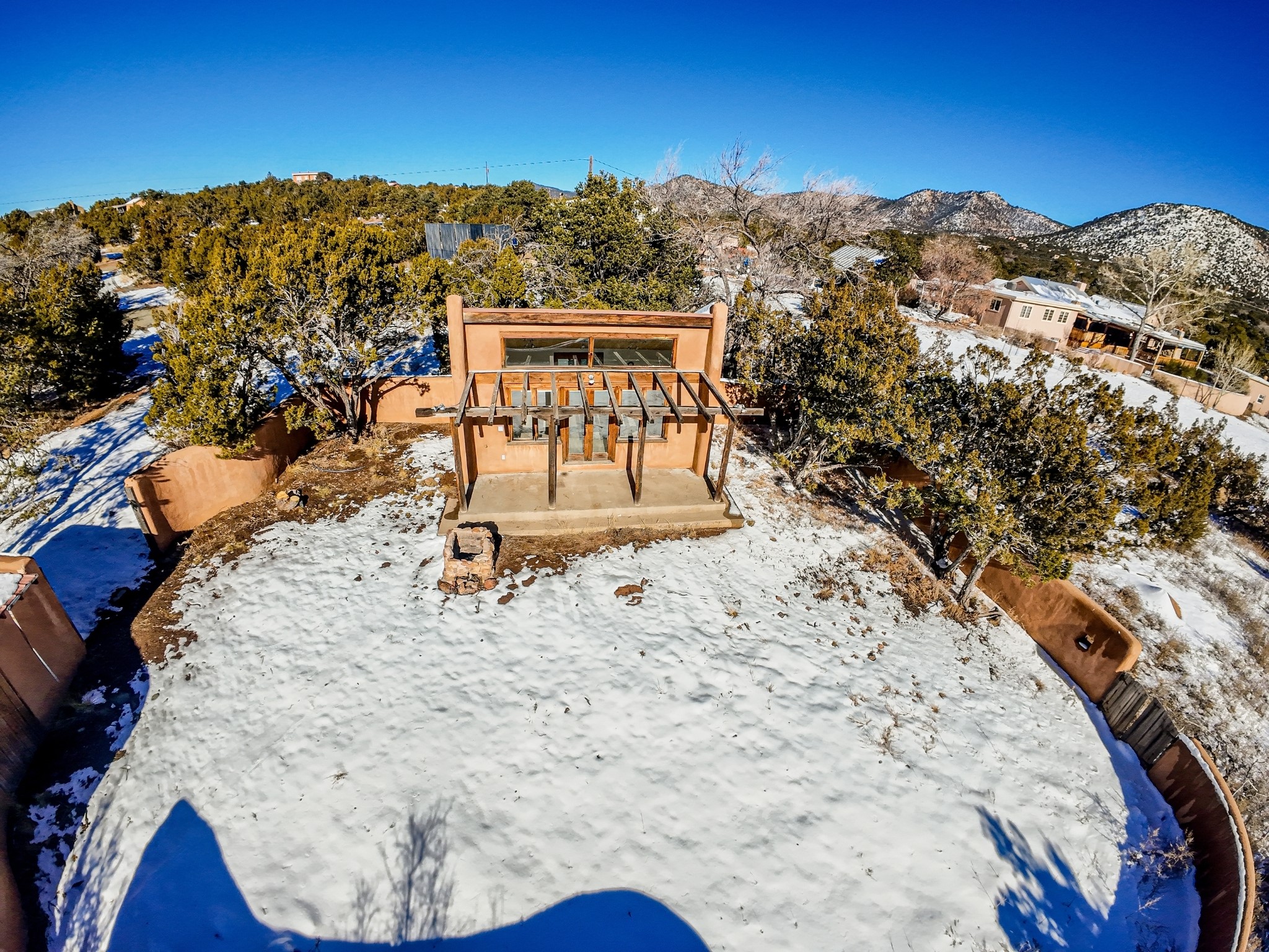 Nestled on 5 quiet, wooded acres, this 1523 sq. ft. passive solar home is bathed in natural light. A circular driveway makes coming and going a breeze. Inside you will find plenty of character, from the high clerestory windows to the rustic flagstone floors. Cozy up on chilly nights by the fireplace or the wood stove and read a book in the sun room in the afternoons. Primary bedroom features a loft, perfect for storage while a flexible den or hobby room could easily serve as a bedroom with addition of a closet. Creatives and artists will love the 240 sq. ft. separate studio and workshop area, both surrounded by a beautiful adobe wall.