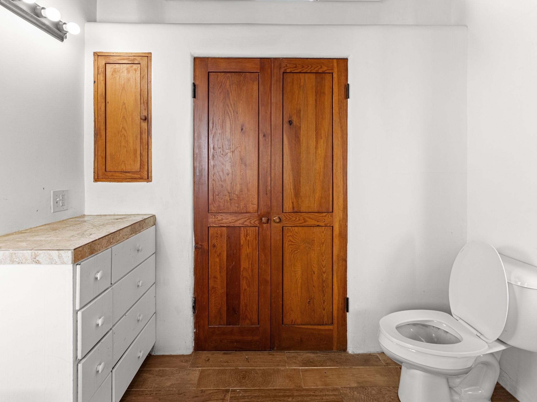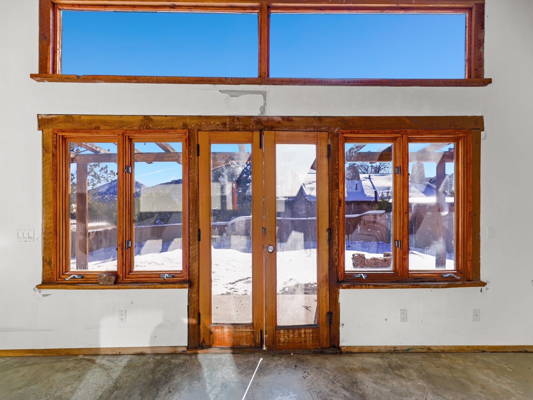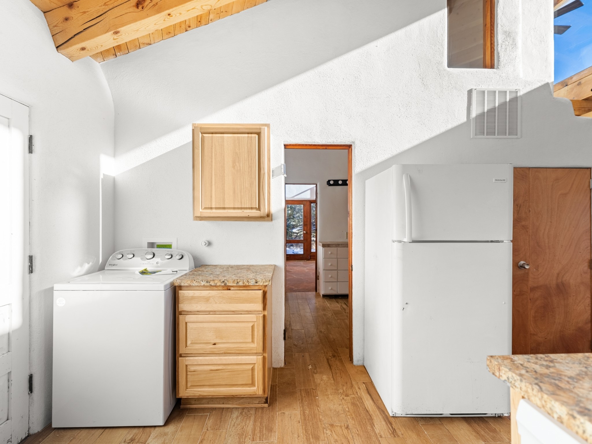 Nestled on 5 quiet, wooded acres, this 1523 sq. ft. passive solar home is bathed in natural light. A circular driveway makes coming and going a breeze. Inside you will find plenty of character, from the high clerestory windows to the rustic flagstone floors. Cozy up on chilly nights by the fireplace or the wood stove and read a book in the sun room in the afternoons. Primary bedroom features a loft, perfect for storage while a flexible den or hobby room could easily serve as a bedroom with addition of a closet. Creatives and artists will love the 240 sq. ft. separate studio and workshop area, both surrounded by a beautiful adobe wall.