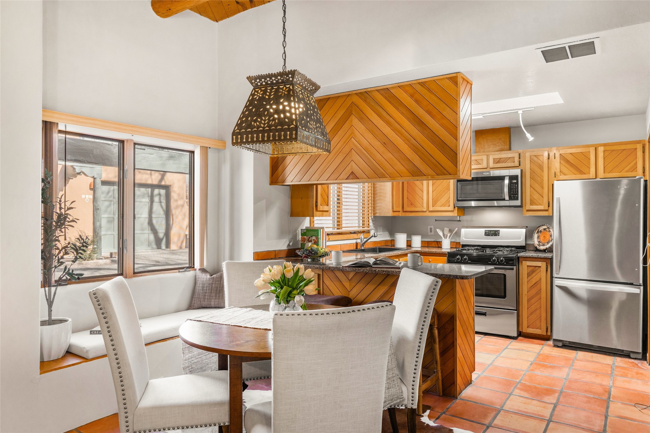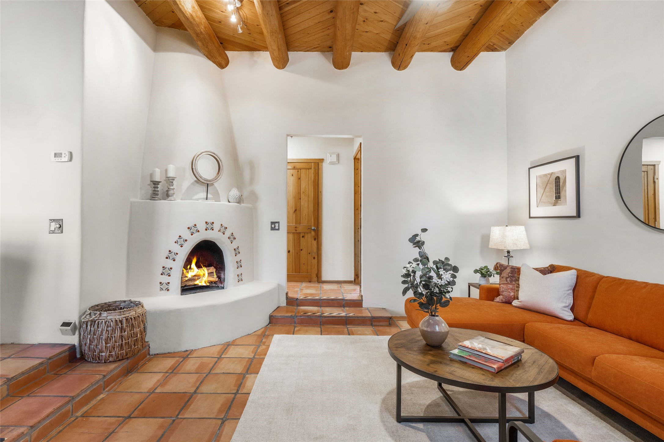 This is it: that coveted downtown Pied-a-Terre, a Santa Fe Stylish, single-level, 2-bedroom, 2-bath end unit with generous courtyard, and direct access, one-car garage. The living room, with its high ceiling, Vigas and corner Kiva fireplace adjoins the light-filled dining area, with Banco and well-ordered kitchen. Classic Saltillo tile runs throughout most of the freshly-painted home. The spacious Primary Bedroom has hardwood flooring, a carpeted, walk-in closet, an ensuite bath with walk-in shower, and French door access to the private, walled courtyard. The second bedroom, with adjacent three-quarter bath, is outfitted with brand new luxury vinyl flooring. The neighborhood has a pleasant, comparatively tranquil feel, yet is just blocks from many restaurants, shops, grocers, galleries and Santa Fe's Historic Plaza.