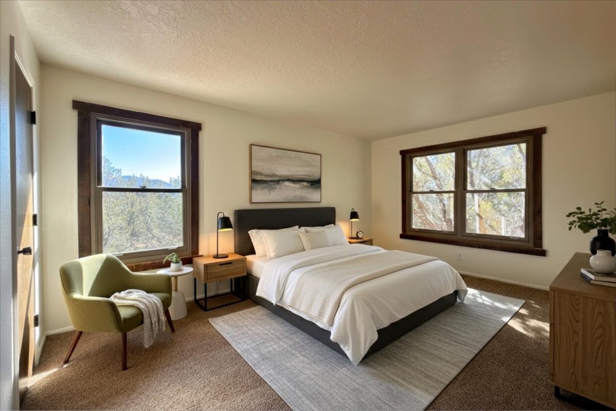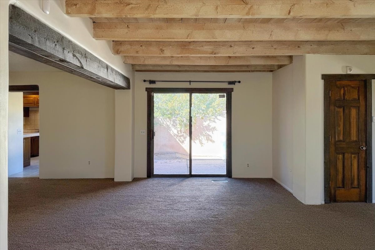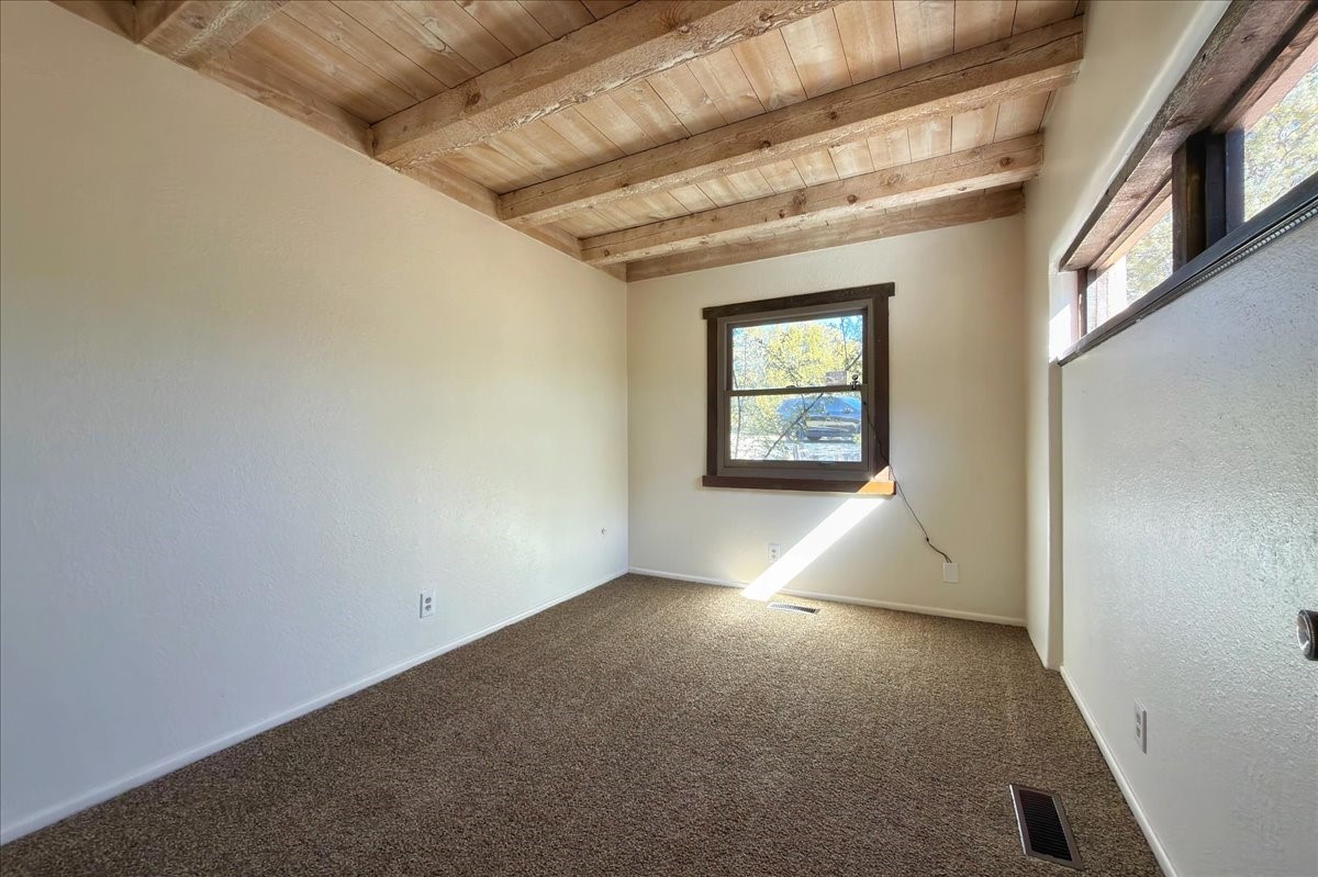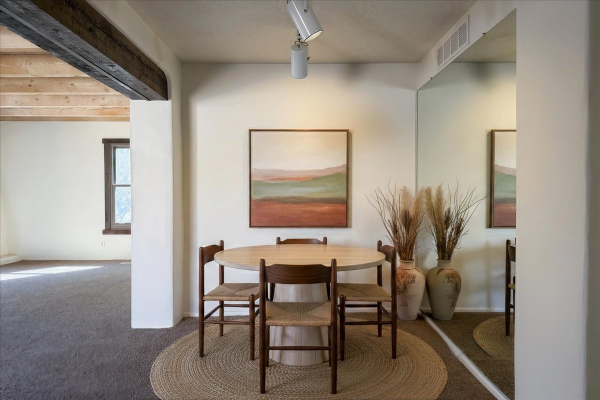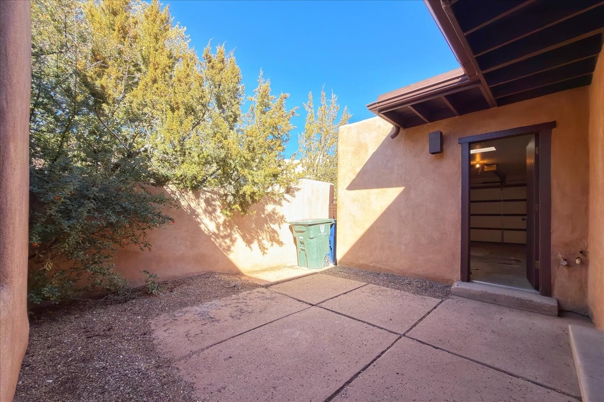 Only four minutes from Downtown, this rare free-standing condo offers the privacy of a single-family home in a sought-after community. The 1,840 sq ft layout includes 3 bedrooms and 2 full baths, with authentic vigas, wood-beam ceilings, and a Kiva fireplace creating a warm Southwestern feel.The kitchen and bathrooms feature Italian marble flooring, complemented by brand-new carpet in the living room and bedrooms. Enjoy mountain views from the primary suite and living room, plus recent upgrades such as Anderson double-pane windows and a new 2025 furnace.Perfect as a primary residence, second home, or investment property--this is a rare opportunity so close to the heart of Santa Fe.