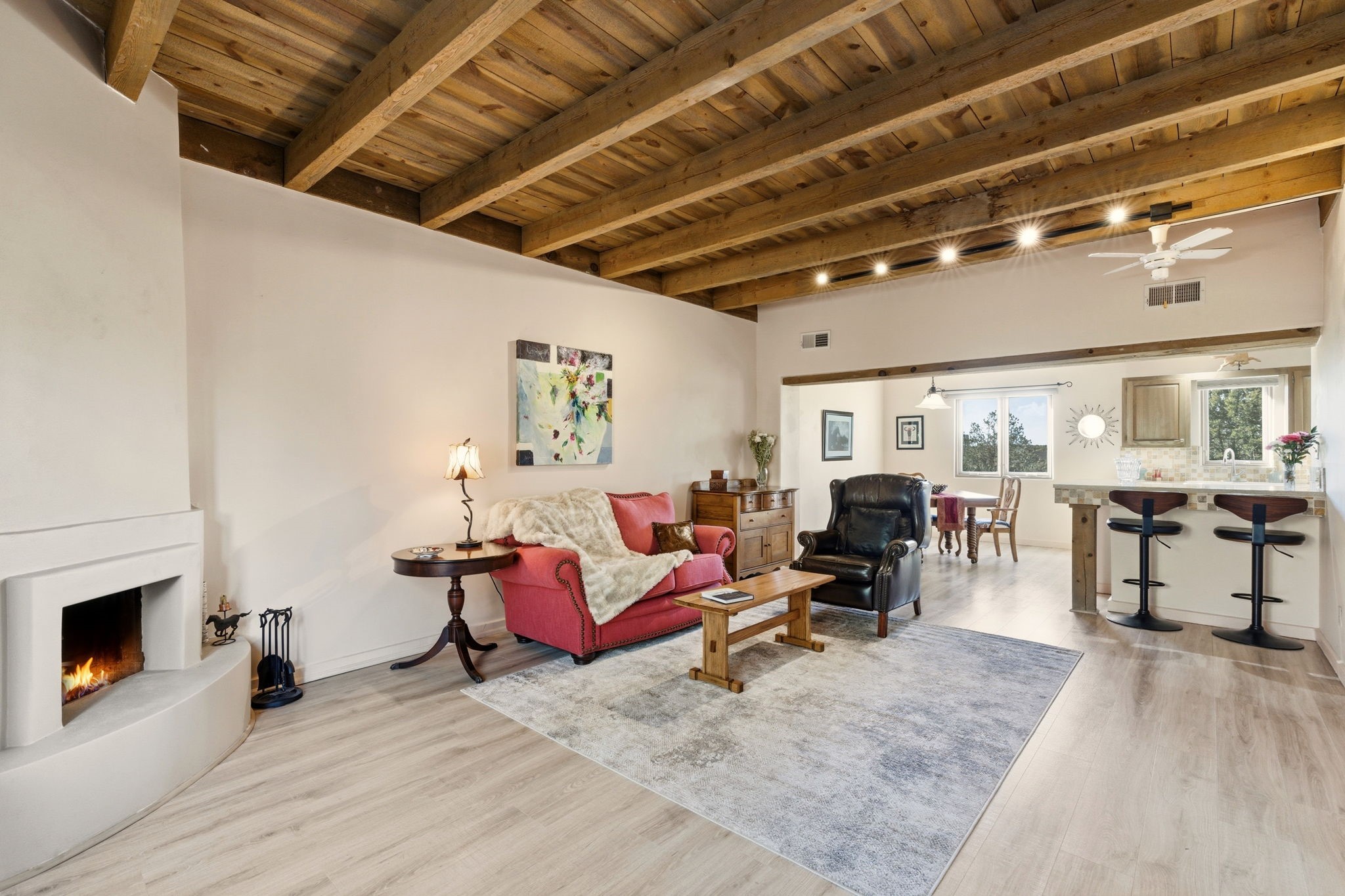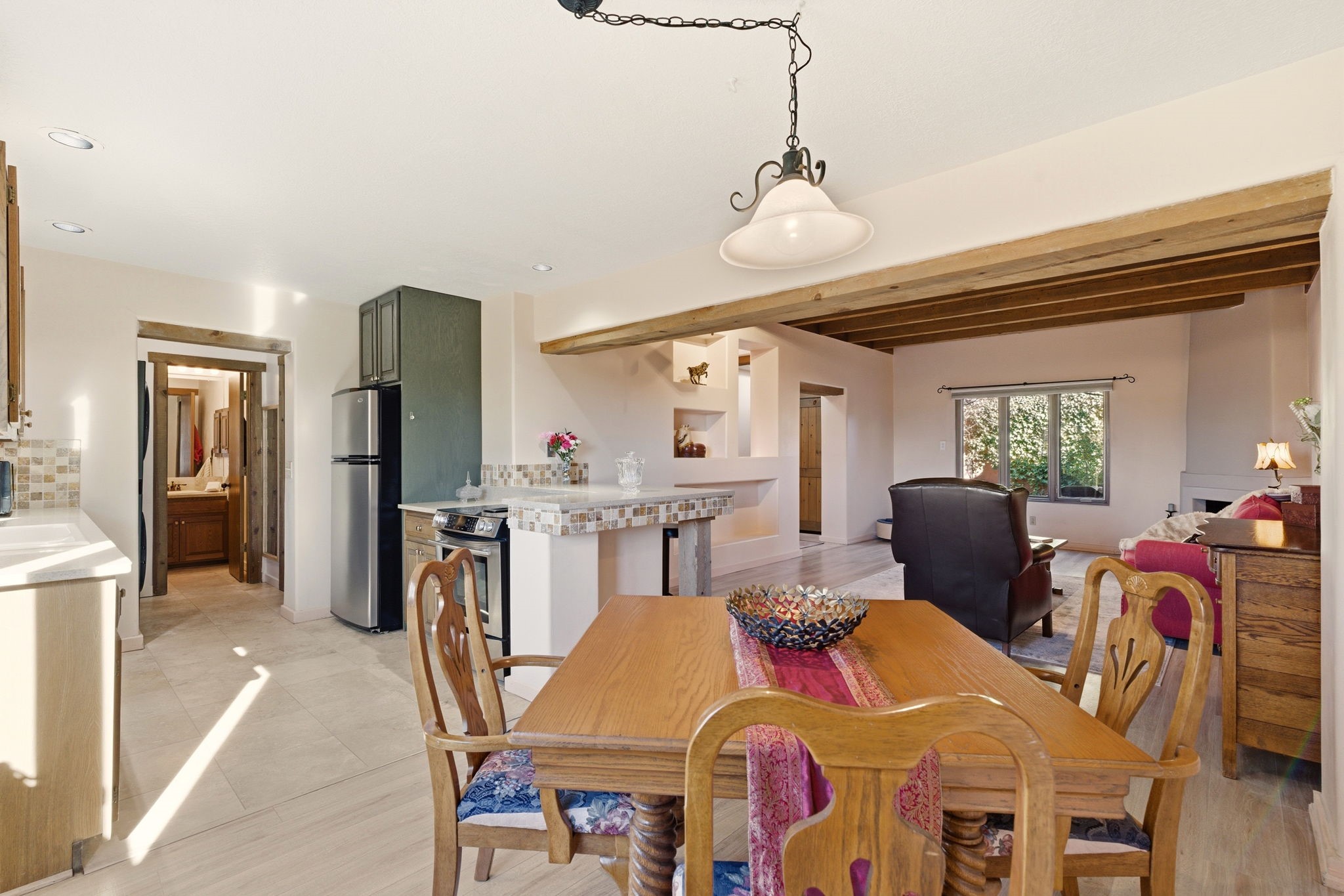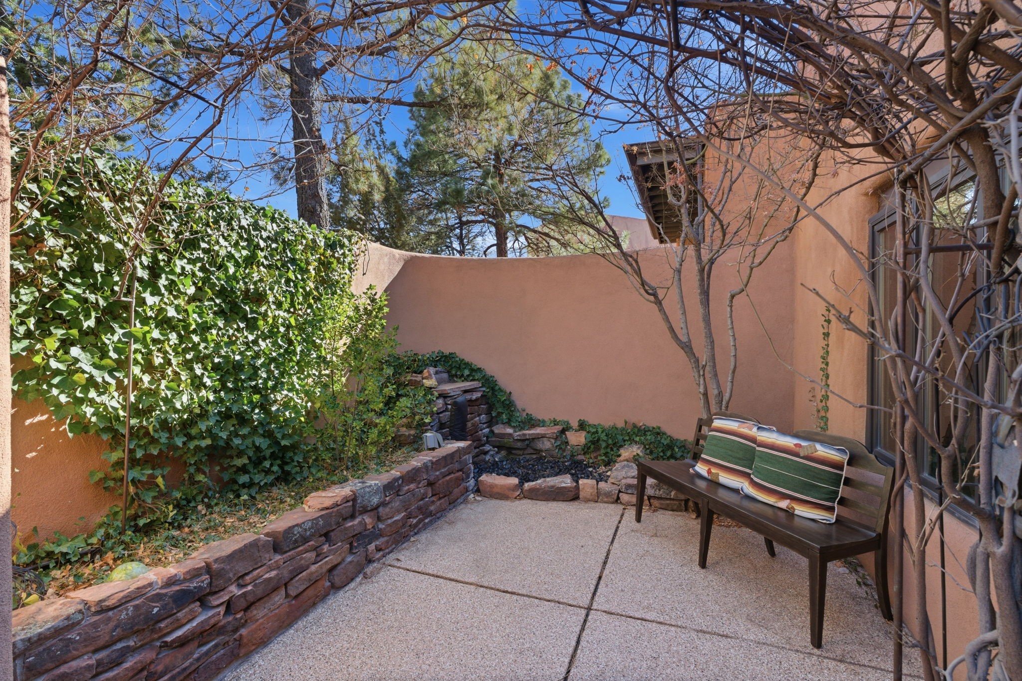 Step into serenity with this meticulous two-story Northside condo, tucked within a desirable gated neighborhood just minutes from the heart of Santa Fe. Enter through the gate into your own private, walled courtyard oasis--an enchanting welcome framed by a graceful Japanese maple, orchard rock, and ivy-lined walls that create a peaceful retreat before you even step inside. The interior offers an inviting open-concept living and dining area filled with architectural charm. Engineered wood floors, a striking corner wood-burning fireplace, high beamed ceilings, and thoughtful details throughout create warmth and character. Western views from the dining room window provide a stunning backdrop for evening meals and unforgettable sunsets. The beautifully appointed kitchen features newer appliances, including an electric stove with convection oven, elegant Silestone countertops, and timeless Travertine flooring. Just off the kitchen, you'll find a well-designed laundry room and pantry with convenient pull-out drawers, along with a stylishly remodeled bath--ideal for guests. An attached, oversized one-car garage with direct entry adds convenience, while a generous under-stairs storage closet ensures everything has its place. Upstairs, engineered wood stairs with tiled risers lead to two spacious bedrooms finished with plush wool Berber carpet. The updated full bath is a luxurious retreat, featuring a deep soaking tub, Silestone counters, and Travertine tile. Multiple skylights fill the home with natural light, enhancing the airy feel throughout. Comfort is ensured year-round with forced air heating and refrigerated A/C, and the newer foam roof with a lifetime warranty provides peace of mind for years to come. Located just a short drive to the Santa Fe Plaza, you'll enjoy easy access to shopping, coffee shops, galleries, and restaurants--while still savoring the tranquility of Northside living.