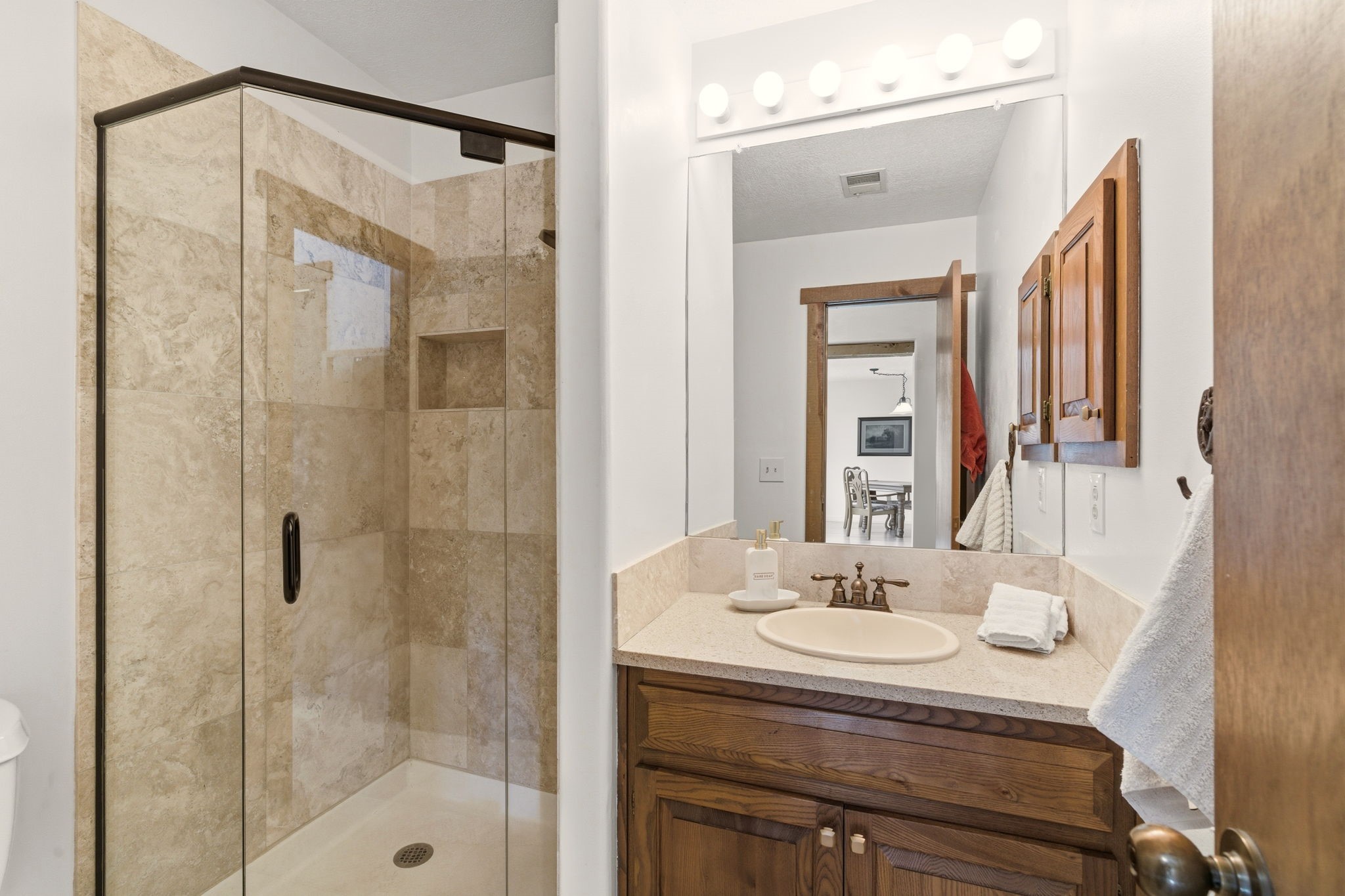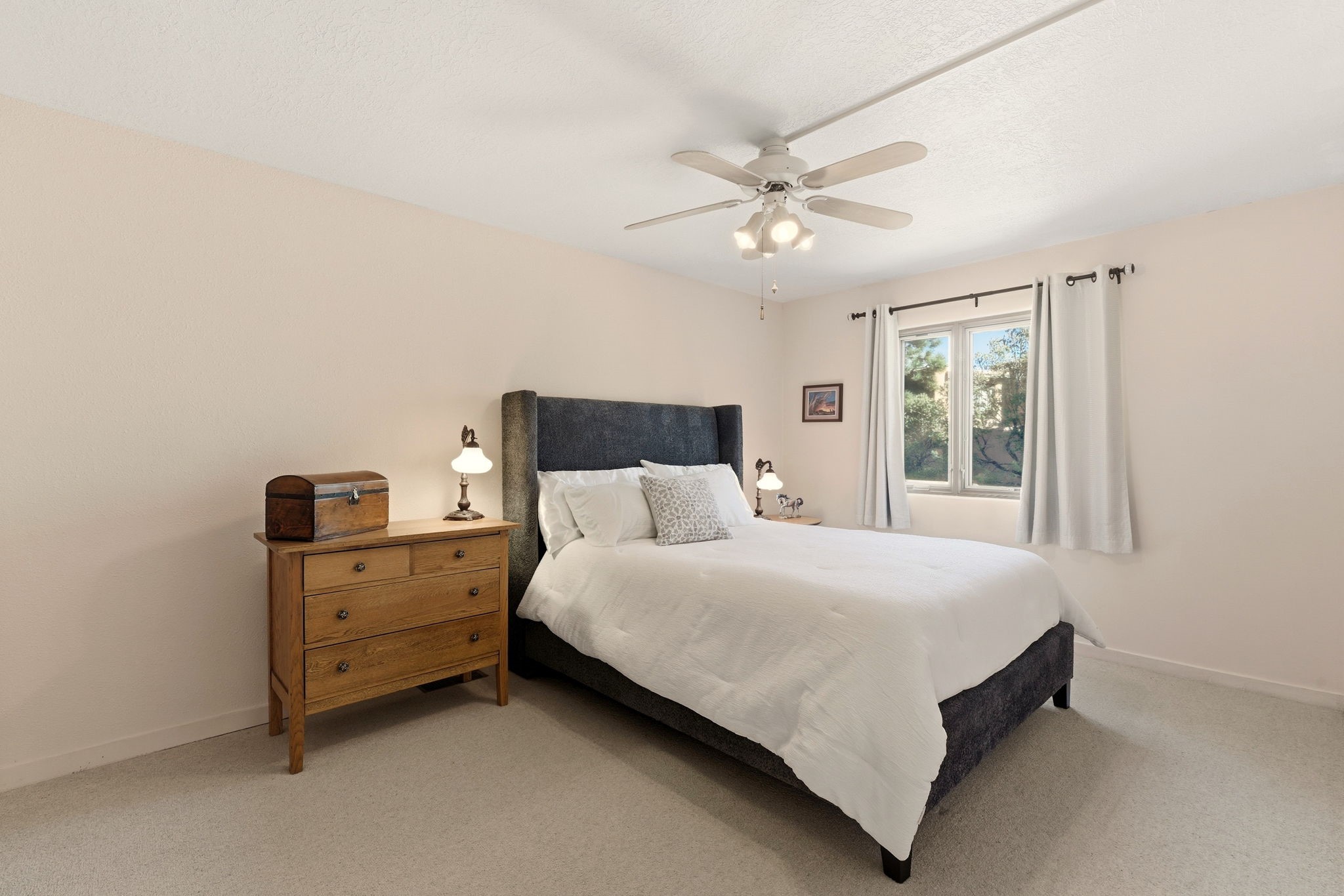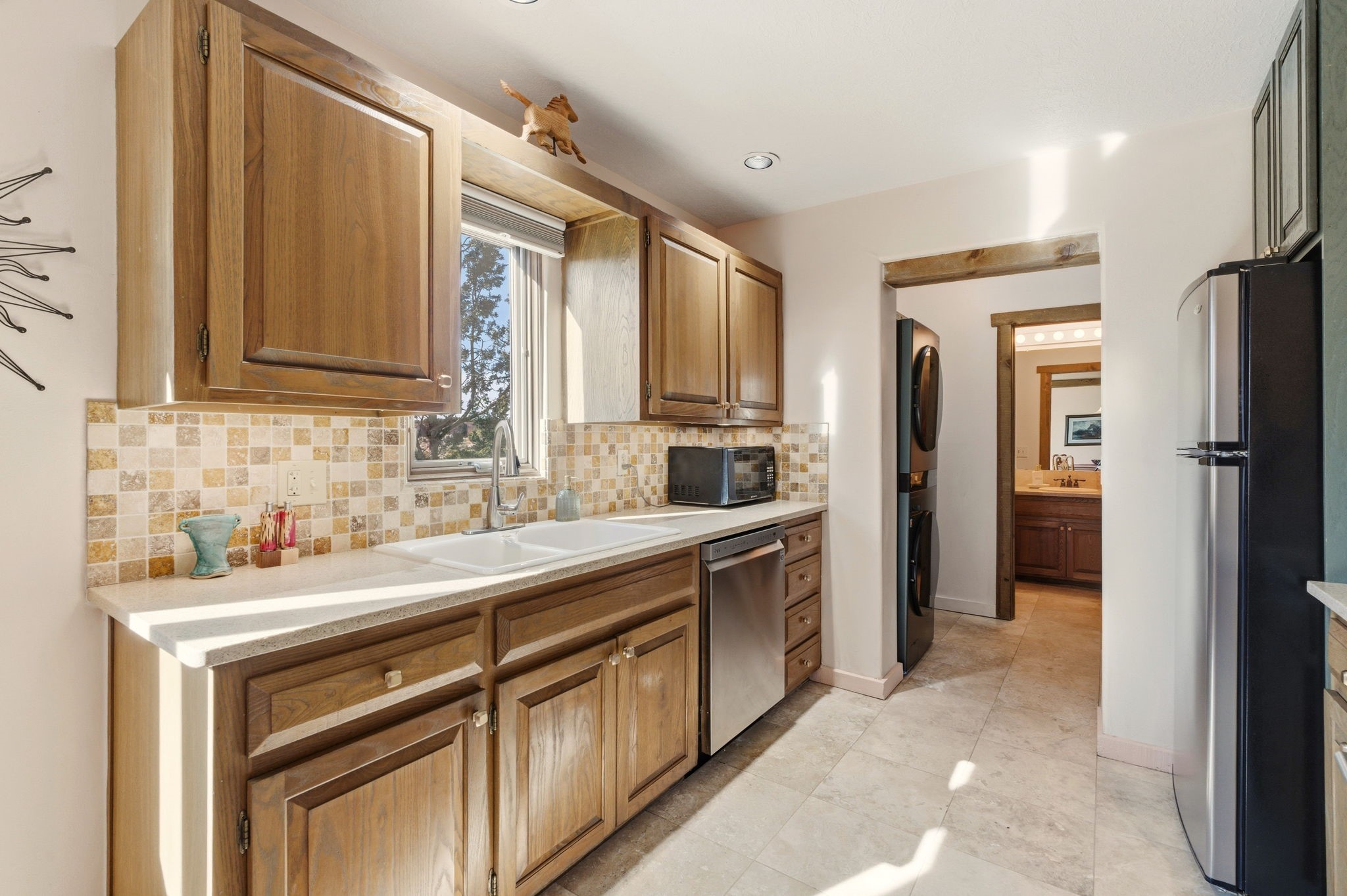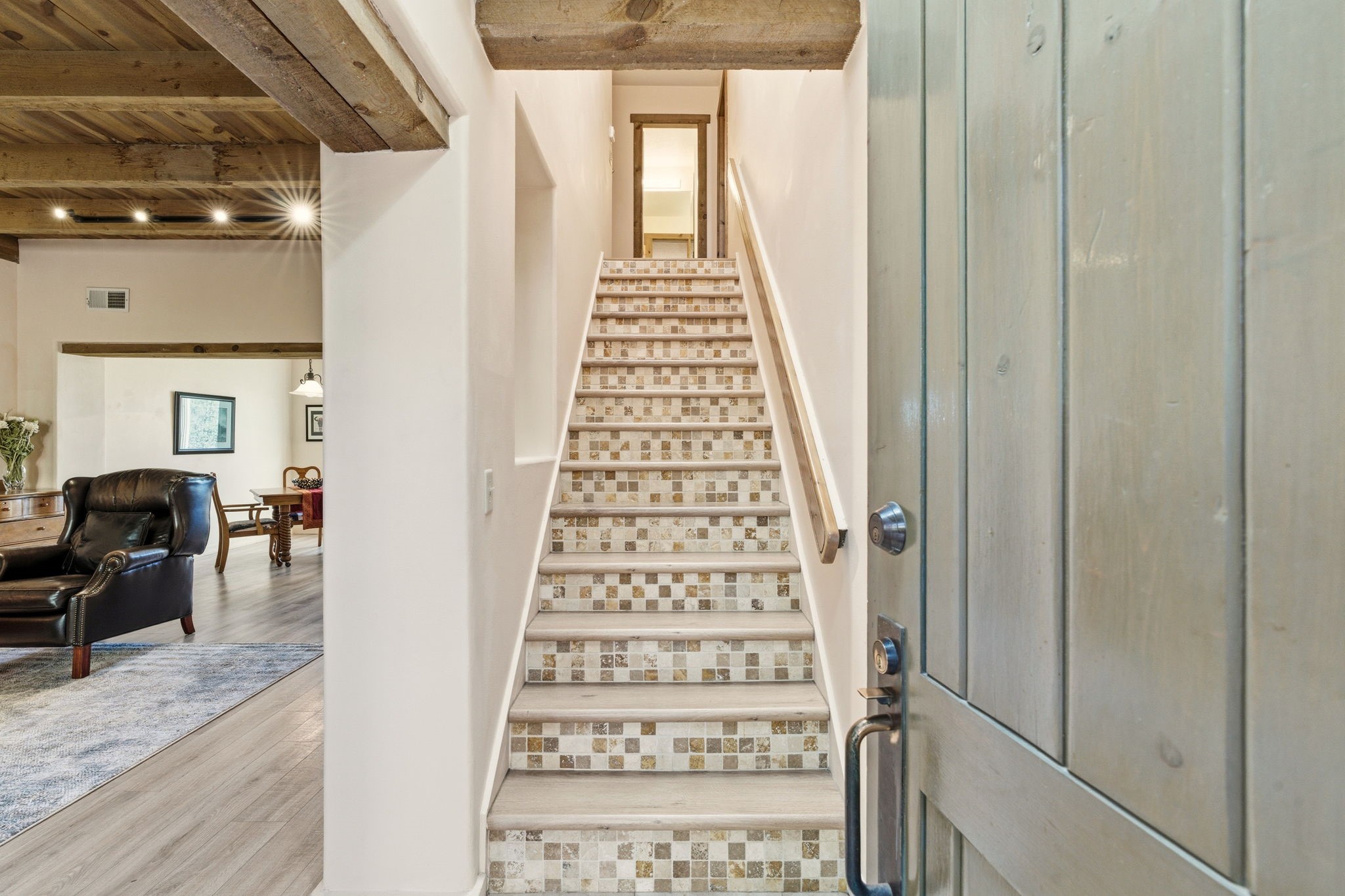 Step into serenity with this meticulous two-story Northside condo, tucked within a desirable gated neighborhood just minutes from the heart of Santa Fe. Enter through the gate into your own private, walled courtyard oasis--an enchanting welcome framed by a graceful Japanese maple, orchard rock, and ivy-lined walls that create a peaceful retreat before you even step inside. The interior offers an inviting open-concept living and dining area filled with architectural charm. Engineered wood floors, a striking corner wood-burning fireplace, high beamed ceilings, and thoughtful details throughout create warmth and character. Western views from the dining room window provide a stunning backdrop for evening meals and unforgettable sunsets. The beautifully appointed kitchen features newer appliances, including an electric stove with convection oven, elegant Silestone countertops, and timeless Travertine flooring. Just off the kitchen, you'll find a well-designed laundry room and pantry with convenient pull-out drawers, along with a stylishly remodeled bath--ideal for guests. An attached, oversized one-car garage with direct entry adds convenience, while a generous under-stairs storage closet ensures everything has its place. Upstairs, engineered wood stairs with tiled risers lead to two spacious bedrooms finished with plush wool Berber carpet. The updated full bath is a luxurious retreat, featuring a deep soaking tub, Silestone counters, and Travertine tile. Multiple skylights fill the home with natural light, enhancing the airy feel throughout. Comfort is ensured year-round with forced air heating and refrigerated A/C, and the newer foam roof with a lifetime warranty provides peace of mind for years to come. Located just a short drive to the Santa Fe Plaza, you'll enjoy easy access to shopping, coffee shops, galleries, and restaurants--while still savoring the tranquility of Northside living.