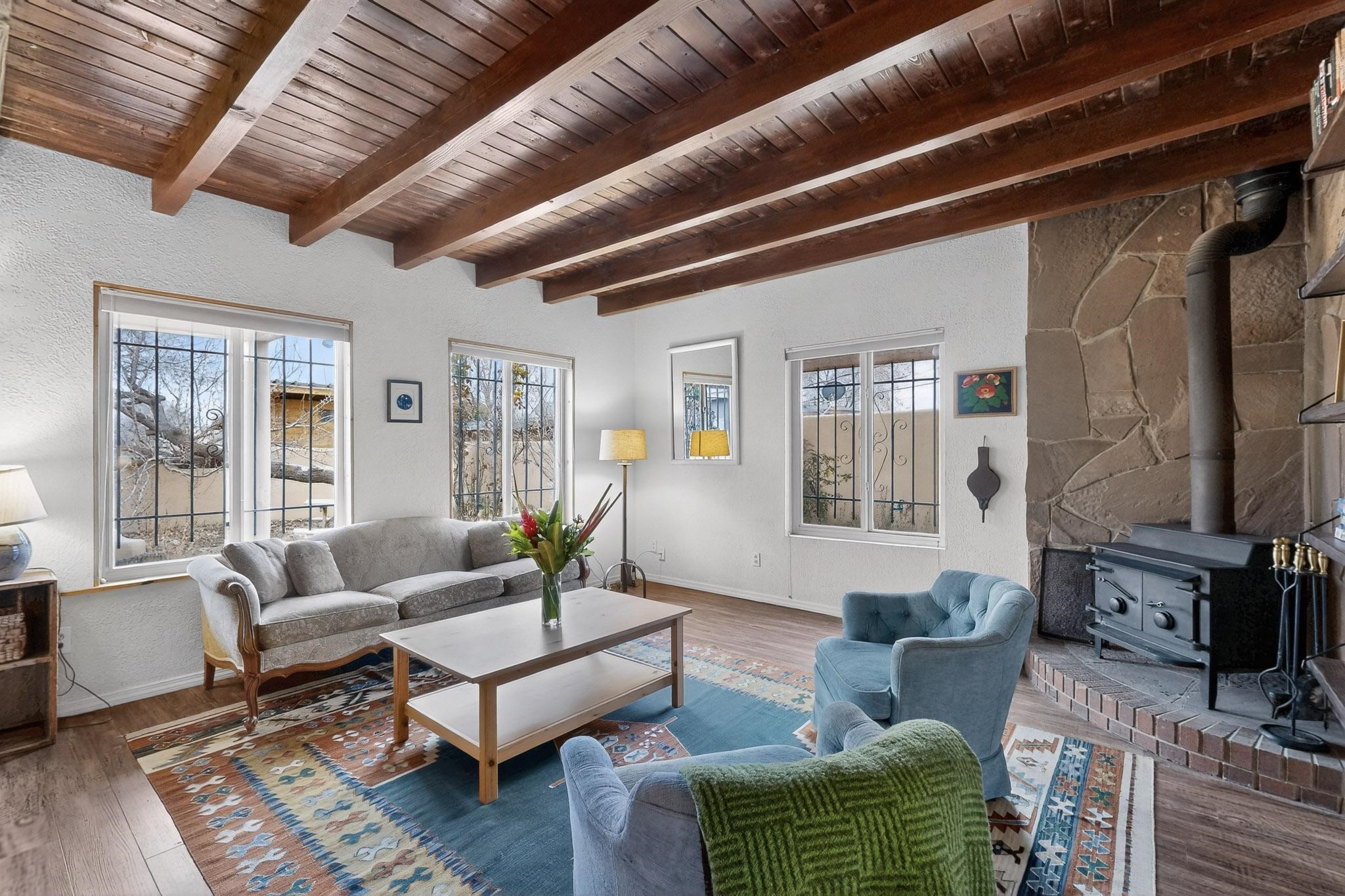 Beautifully updated, authentic Southwest home in the heart of midtown, blending timeless character with thoughtful modern upgrades. The charming 1950s original dwelling was expanded to include a light-filled dining room, creating the perfect space for gatherings. French doors open to a covered outdoor living area--ideal for slow mornings with coffee and a good book.The spacious kitchen, tastefully remodeled by the previous owners, features an eat-in bar and a dedicated wine and cold drink fridge. High ceilings with wood beams and tongue-and-groove detailing enhance the sense of openness, while luxury vinyl plank flooring runs seamlessly throughout the home.A welcoming front gate opens to your own private sanctuary. The generous lot provides ample off-street parking, multiple garden beds with drip irrigation, a well-built storage shed, and a traditional horno--perfect for wood-fired pizza nights. Lush landscaping makes this property a gardener's dream, complete with fruit trees, flowering shrubs, and fragrant herbs (see the owner's plant diagram in the photos).Ideally located near the redeveloping Midtown District--formerly the College of Santa Fe--this vibrant area is undergoing major transformation, including the newest Sky Cinema location and Tender Fire Pizza's new brick-and-mortar restaurant. This home truly offers the best of character, comfort, and convenience.