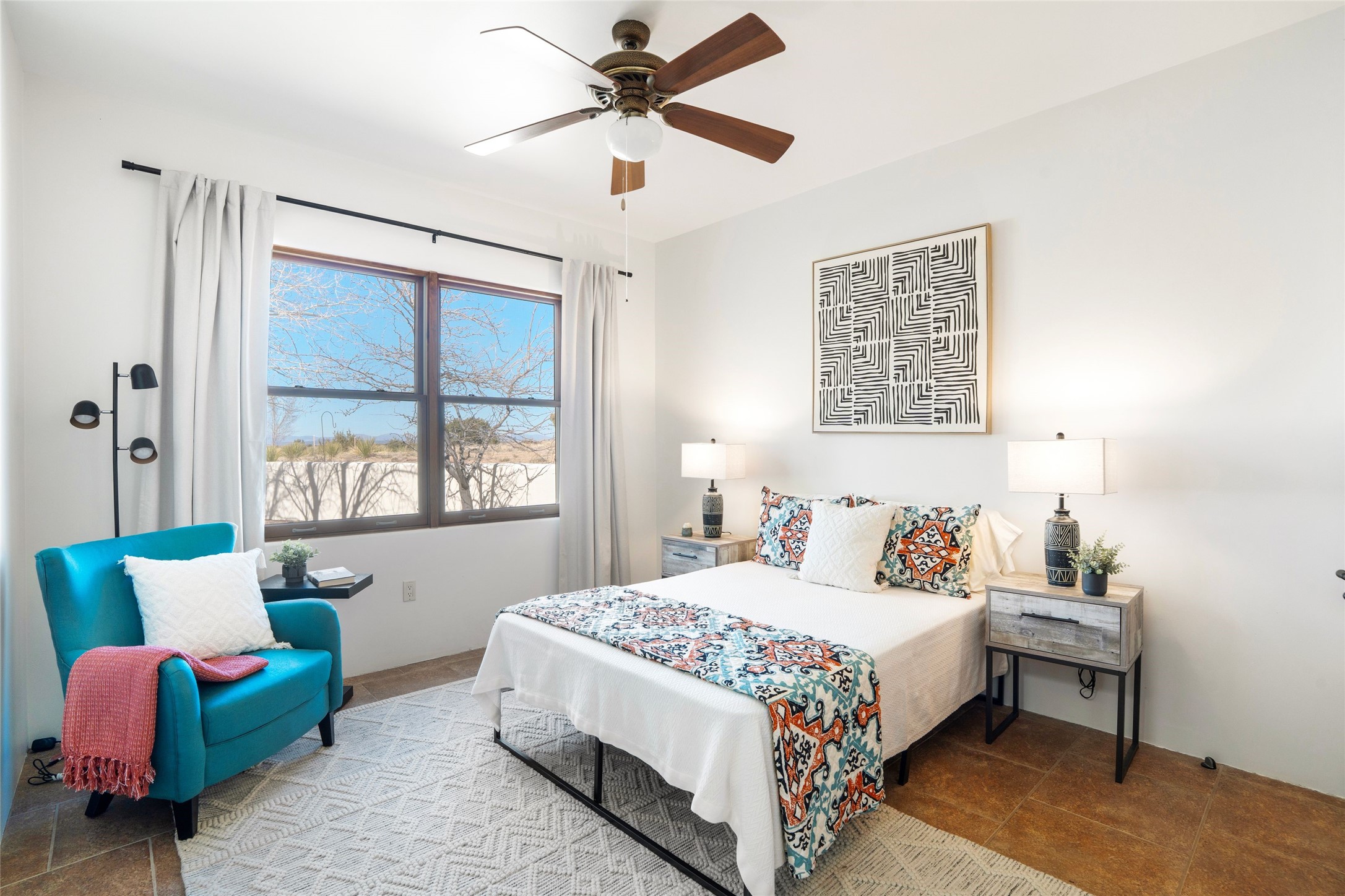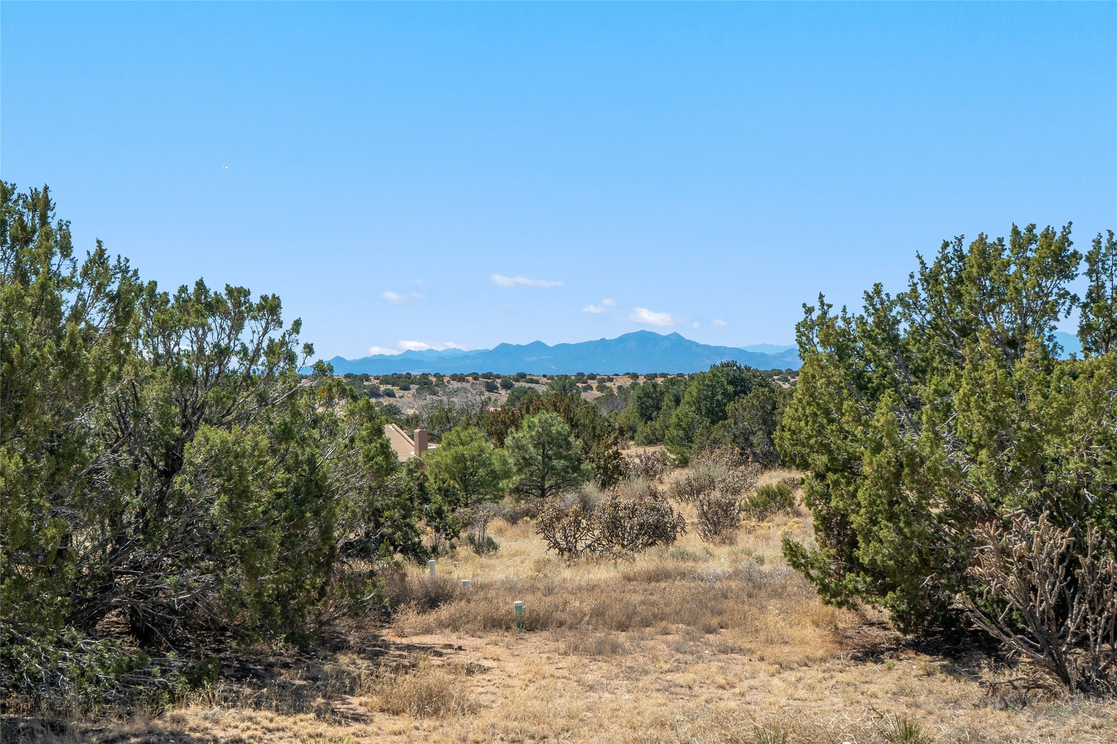 WALK IN AND BE WOWED! Gorgeous 2006 single-level Eldorado home with forever views and separate art studio with 2/3 bath and kitchenette. In-floor radiant heat is WIRSBO PEX and cooling is provided by a whole-house vented evaporative cooler. Kitchen has newer stainless appliances (2019), pretty custom cabinetry, a large copper farm sink and opens to dining and living rooms. Walk-in pantry. There is a gas stub behind the stove. Living room has gas Kiva fireplace and beautiful viga ceilings. Generous primary suite has doors to rear portal, closet system in walk-in closet, double sinks, rain shower head and soaking tub. Freestanding studio was built by Adobeworks in 2023 and has split for heat and air conditioning. Concrete floors, 3/4 bath and kitchenette. Good bedroom separation with bedrooms connected by long gallery hallway. Roof silicone coating in 2020 with a 10-year warranty. Ortiz, Jemez and Sangre de Cristo views! Walled back courtyard with a covered 650 sq. ft. portal that runs the length of the house with sunshades and offers multiple entertaining options. Guest room 1 has a wood burning fireplace, built-in bookshelves and doors to the exterior. Guest room 2 has a connecting full bath. NO STEPS, NO KITEC, NO CARPET. Canales have rainbarrels or french drains which routes the water outside courtyard wall. Property laundry room with sink and good storage. W/D stay. Finished oversized 2-car garage. New boiler and tankless hot water in 2019. Property has been inspected and most repairs completed. Report with repairs noted available on request. Property does have drip system in place, but has not been on for a year. Seller does not warrant the functionality.