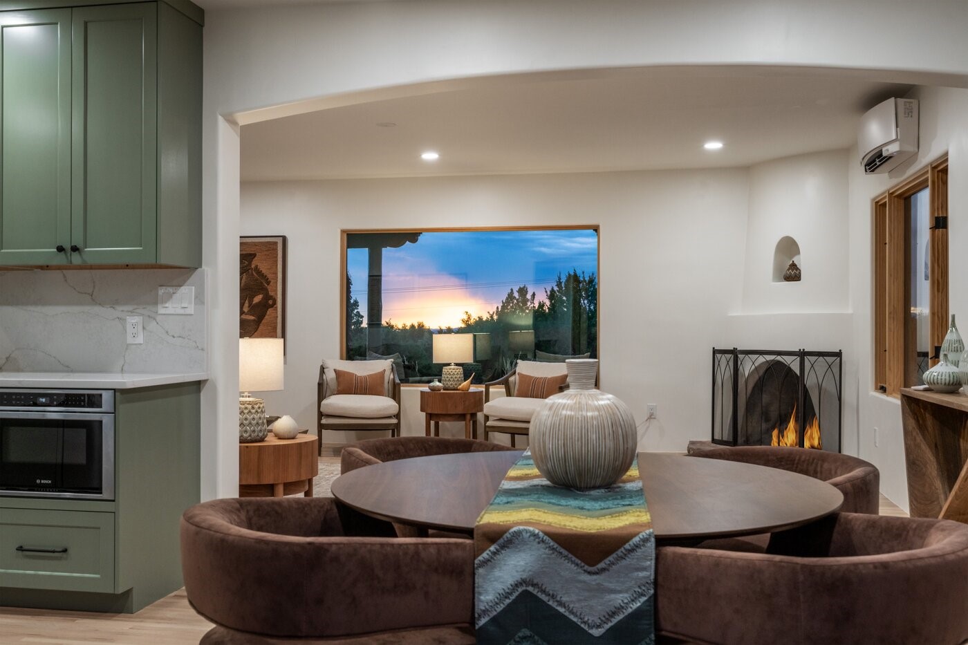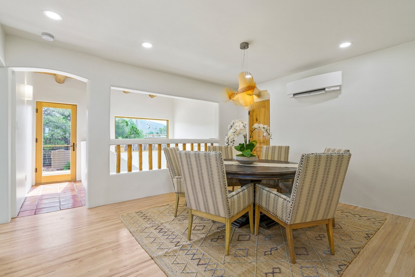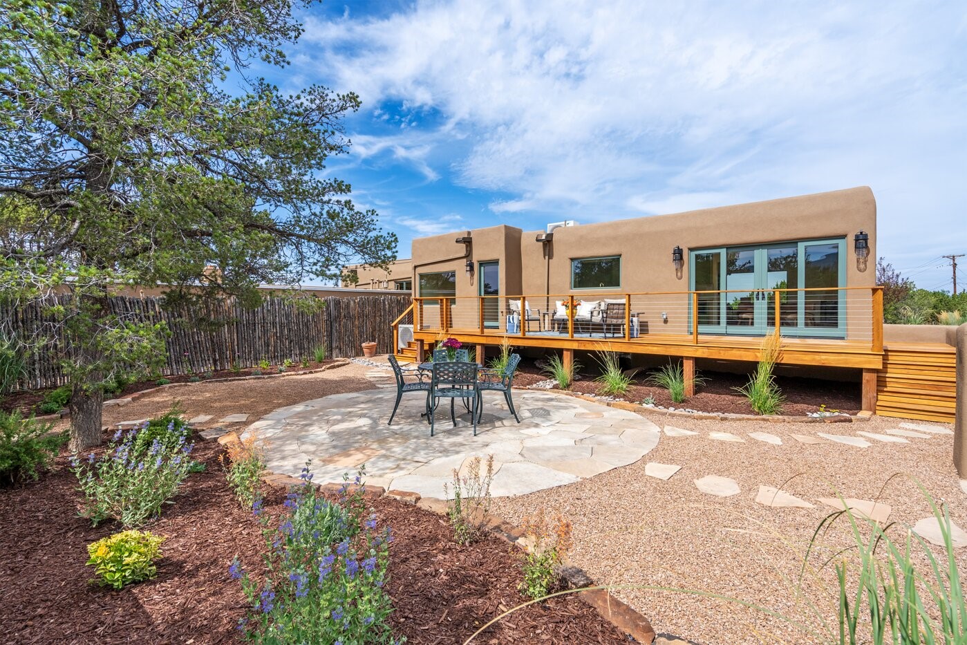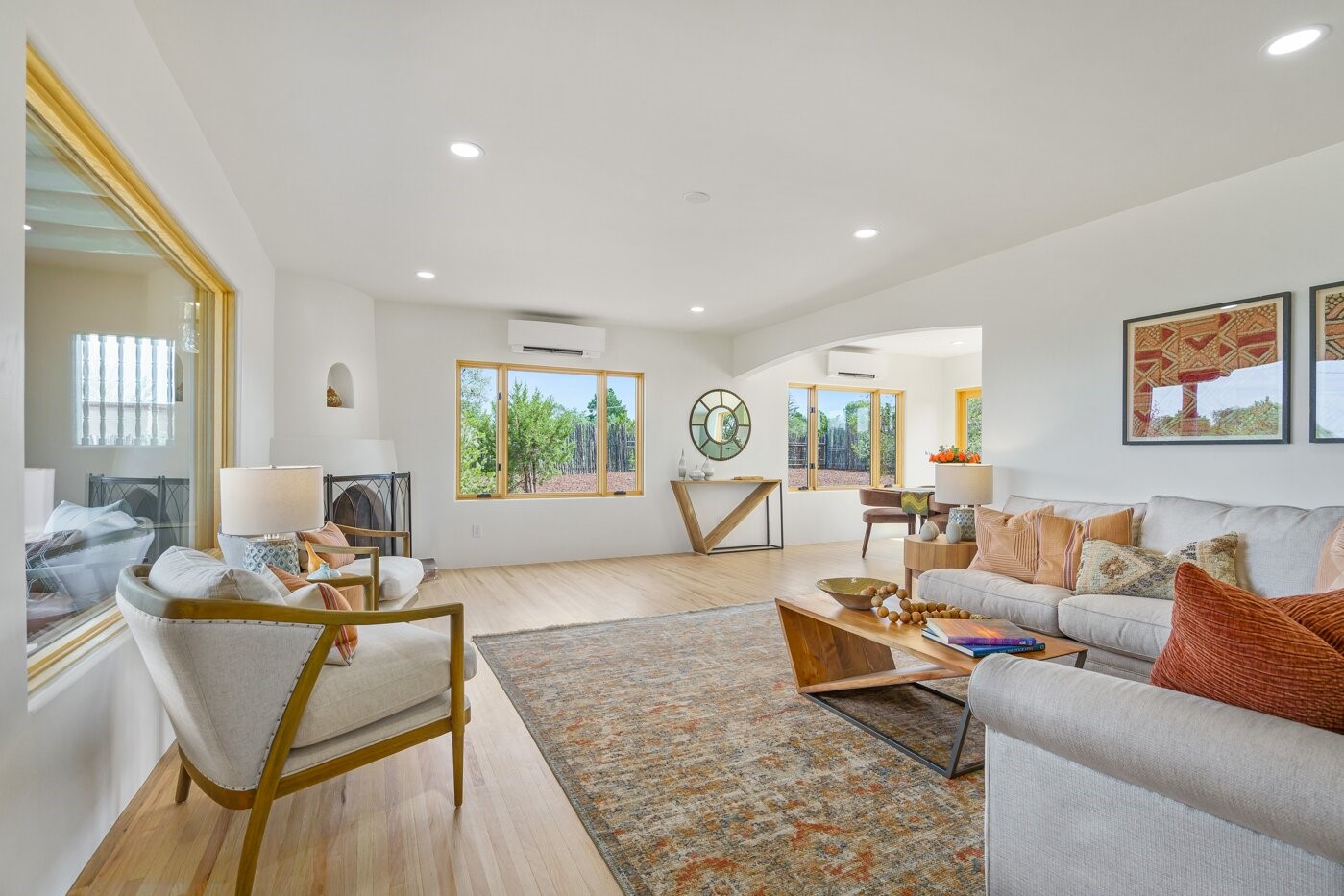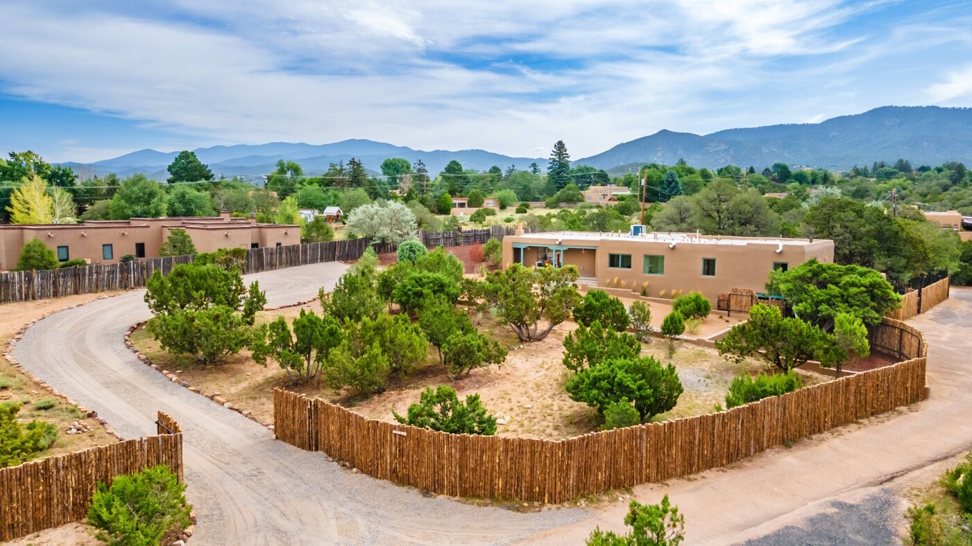 Extensively renovated and reimagined, this light and bright sanctuary sits on just over one acre, offering a rare walled and gated in-town oasis in a prime location near the Historic Santa Fe Plaza. Custom appointments and luxury finishes abound, while expansive windows capture breathtaking sunrise and sunset views of the Sangre de Cristo and Jemez mountains.Beautifully landscaped grounds with native pion and juniper create a private, park-like haven enjoyed from multiple decks, a flagstone patio, and the welcoming entry portal. Designed with flexibility in mind, the property offers exceptional multi-family or guest potential. The main level includes three bedrooms and a full kitchen, while the lower-level features two bedrooms, a media room, and a second kitchen. A separate, fully fenced one-bedroom casita provides additional privacy and independence.Natural light fills the living and informal dining areas, flowing into a well-appointed chef's kitchen with a single-basin farmhouse sink, Bosch appliance package, and custom appliance cabinet. The primary suite is a serene retreat with a spa-inspired bath, custom walk-in closet, and private deck for enjoying mountain views. The charming casita features a kiva fireplace, kitchen, and bedroom with en-suite bath with its own entrance. Parking is abundant with a two-car garage, deep carport, and additional guest parking.