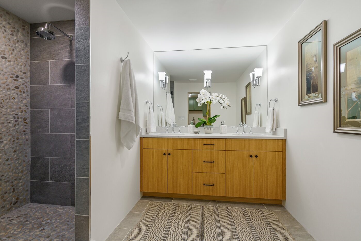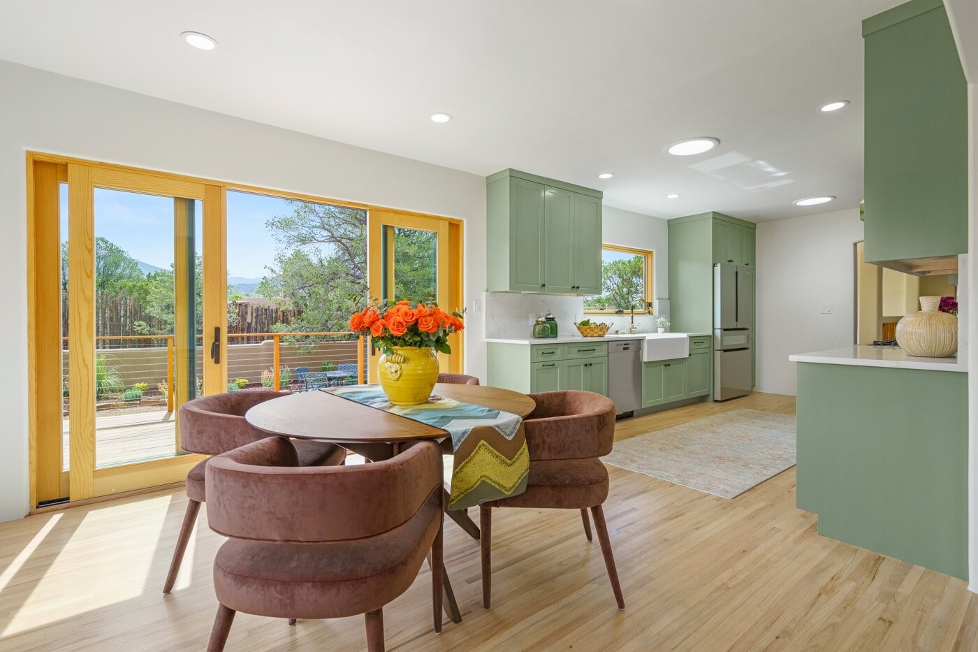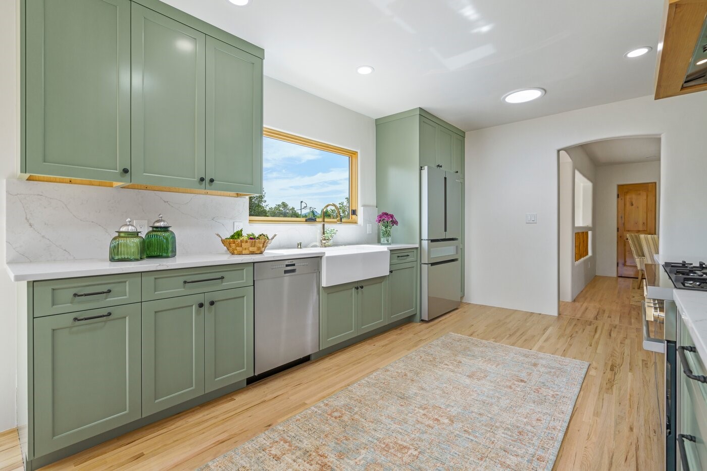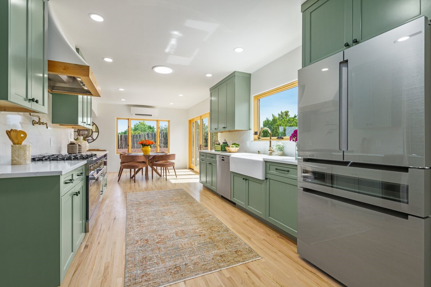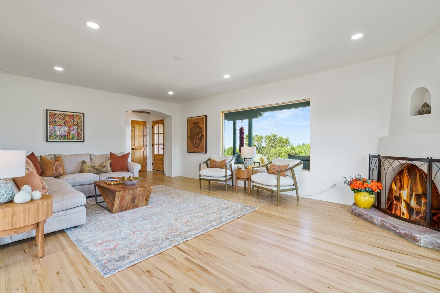 Extensively renovated and reimagined, this light and bright sanctuary sits on just over one acre, offering a rare walled and gated in-town oasis in a prime location near the Historic Santa Fe Plaza. Custom appointments and luxury finishes abound, while expansive windows capture breathtaking sunrise and sunset views of the Sangre de Cristo and Jemez mountains.Beautifully landscaped grounds with native pion and juniper create a private, park-like haven enjoyed from multiple decks, a flagstone patio, and the welcoming entry portal. Designed with flexibility in mind, the property offers exceptional multi-family or guest potential. The main level includes three bedrooms and a full kitchen, while the lower-level features two bedrooms, a media room, and a second kitchen. A separate, fully fenced one-bedroom casita provides additional privacy and independence.Natural light fills the living and informal dining areas, flowing into a well-appointed chef's kitchen with a single-basin farmhouse sink, Bosch appliance package, and custom appliance cabinet. The primary suite is a serene retreat with a spa-inspired bath, custom walk-in closet, and private deck for enjoying mountain views. The charming casita features a kiva fireplace, kitchen, and bedroom with en-suite bath with its own entrance. Parking is abundant with a two-car garage, deep carport, and additional guest parking.