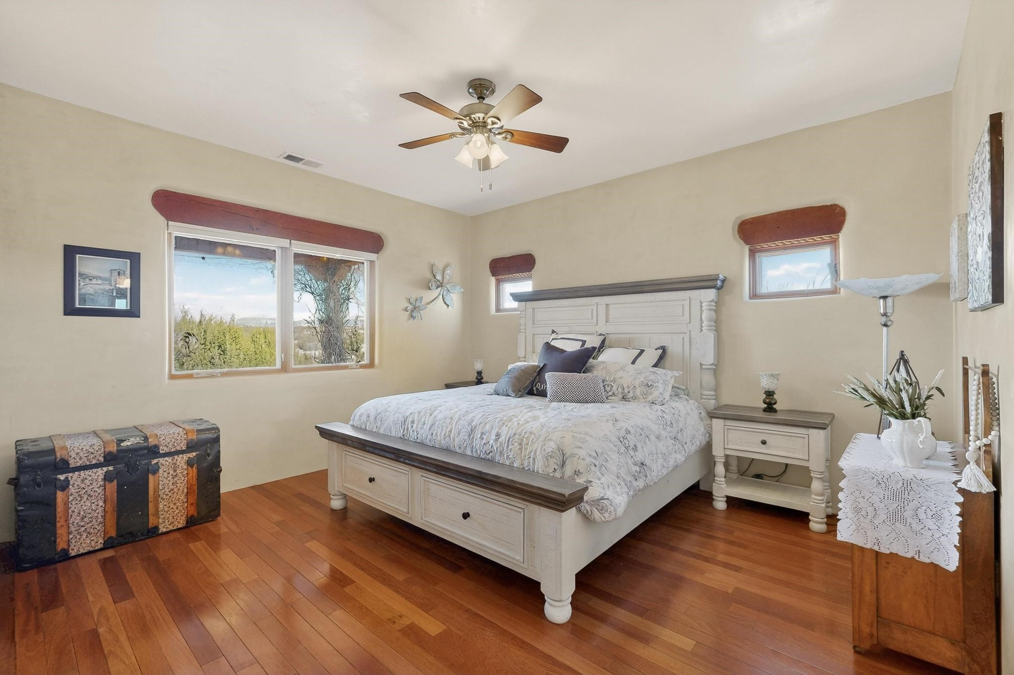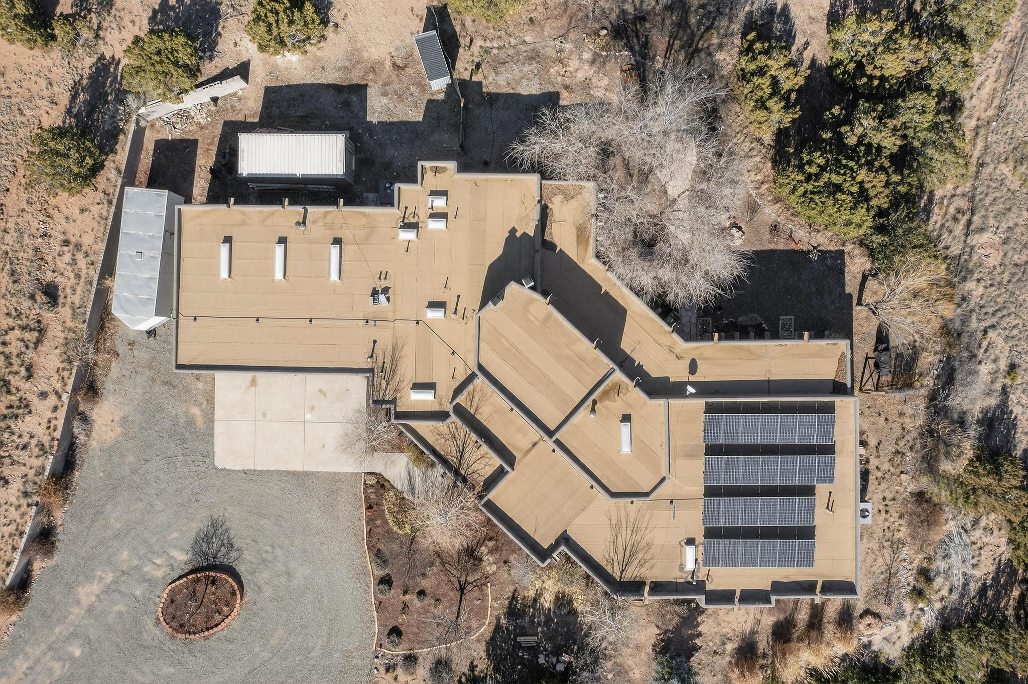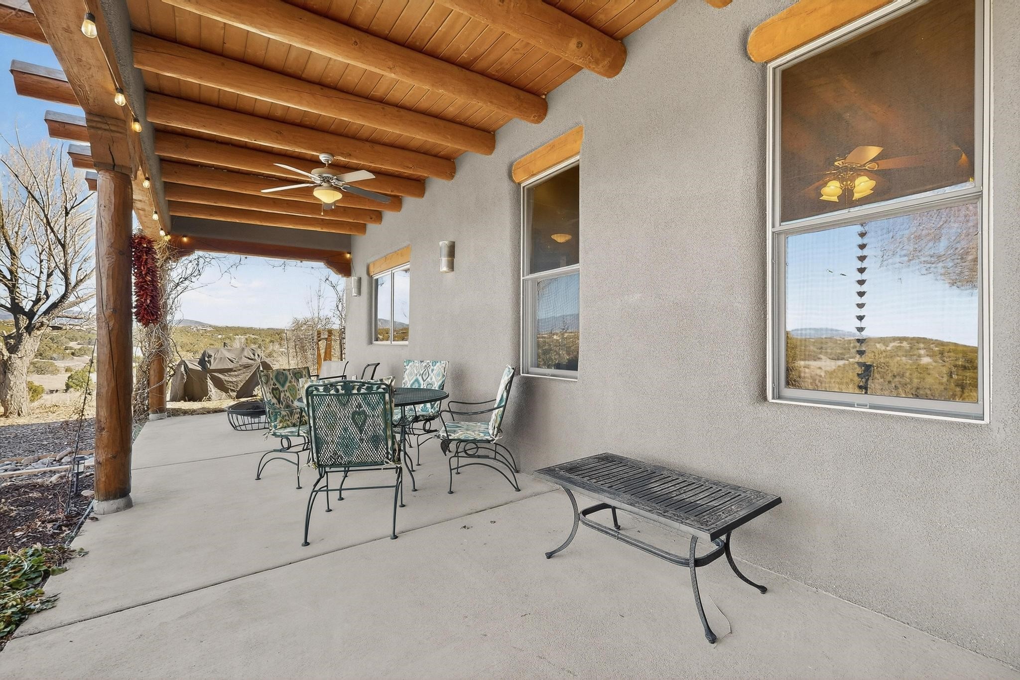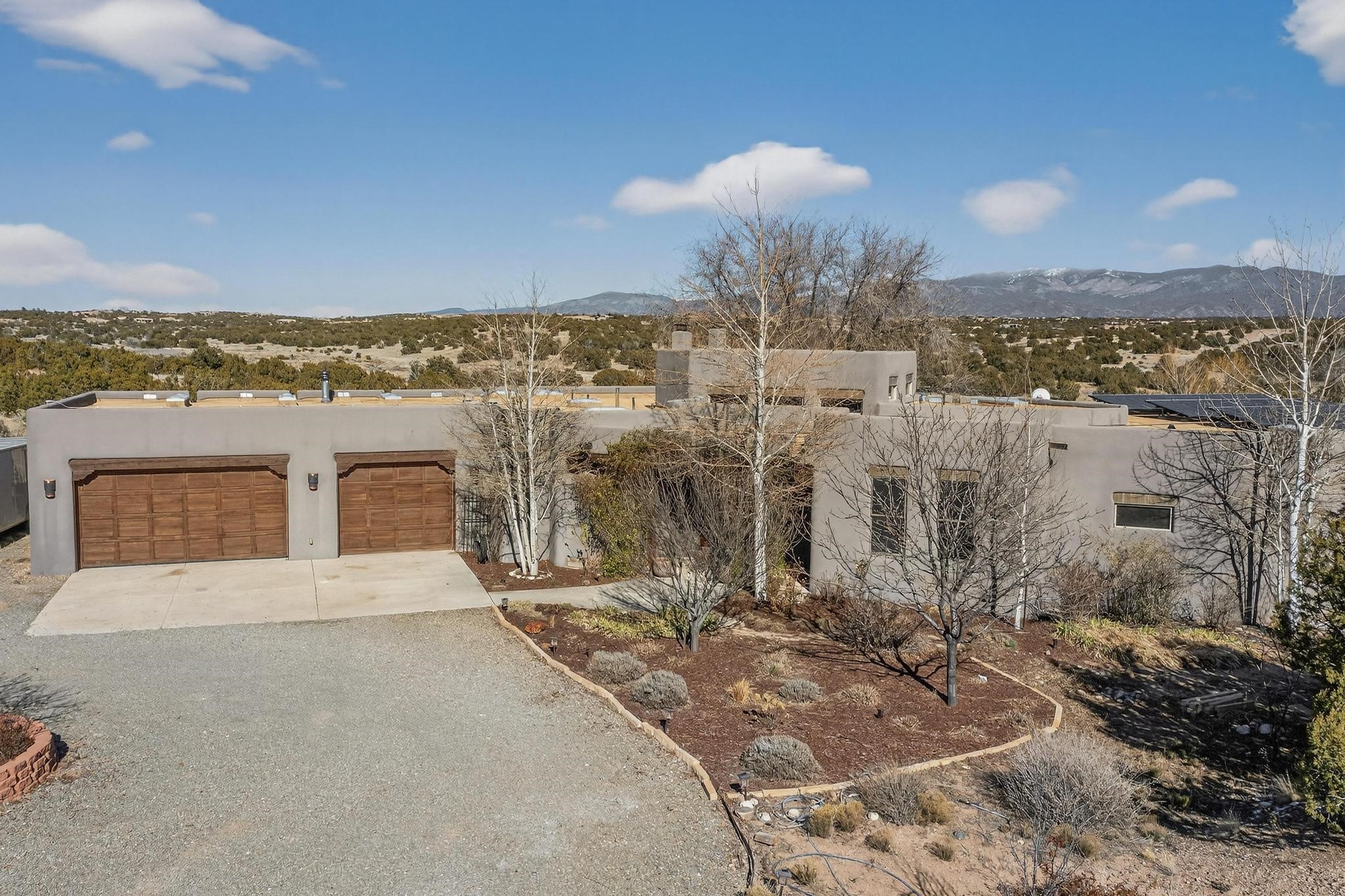 Welcome to 20 Vista Calabasas where Santa Fe style and luxury meet! This incredible home sitting on 5.5 acres of serene high desert landscape, offers 3491 square feet of elegance. Walk into the stunning front door to a grand great room with high ceilings and a direct view of mountain vistas. Continue down the hall enjoying exposed vigas, wood ceilings, diamond finished plaster walls, and tile and wood flooring throughout the home. You'll love preparing meals in the beautiful and large chefs kitchen, equipped with stunning granite countertops and an incredible Wolf range/oven that will make cooking a dream! This 4 bedroom home is cleverly designed with the primary suite on the other side of the home from the other bedrooms with a bonus/possible additional 5th bedroom. In the primary suite you will be charmed by a beautiful diamond finish plaster wood burning fireplace and a private patio door allowing for ample light and views of the Sangre de Cristo mountains. The primary bath has incredible finishes including a large free soaking tub, a large walk in steam shower, and beautiful and large granite countertops. The primary closet is cedar lined with ample space for all your belongings. This home is an entertainers delight! The large living room opens out onto a massive outdoor patio with wide open space stretching far into the distance with stunning views in all directions. This is the perfect place to hold all your upcoming summer gatherings on the cool Santa Fe evenings or wake up and enjoy the peaceful sound of the birds chirping while watching the sun rise in the distance. This home will not disappoint! Schedule your private showing today!
