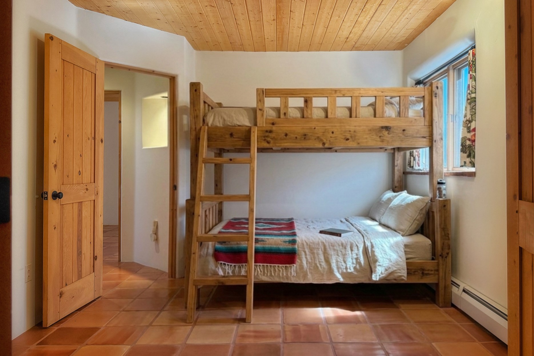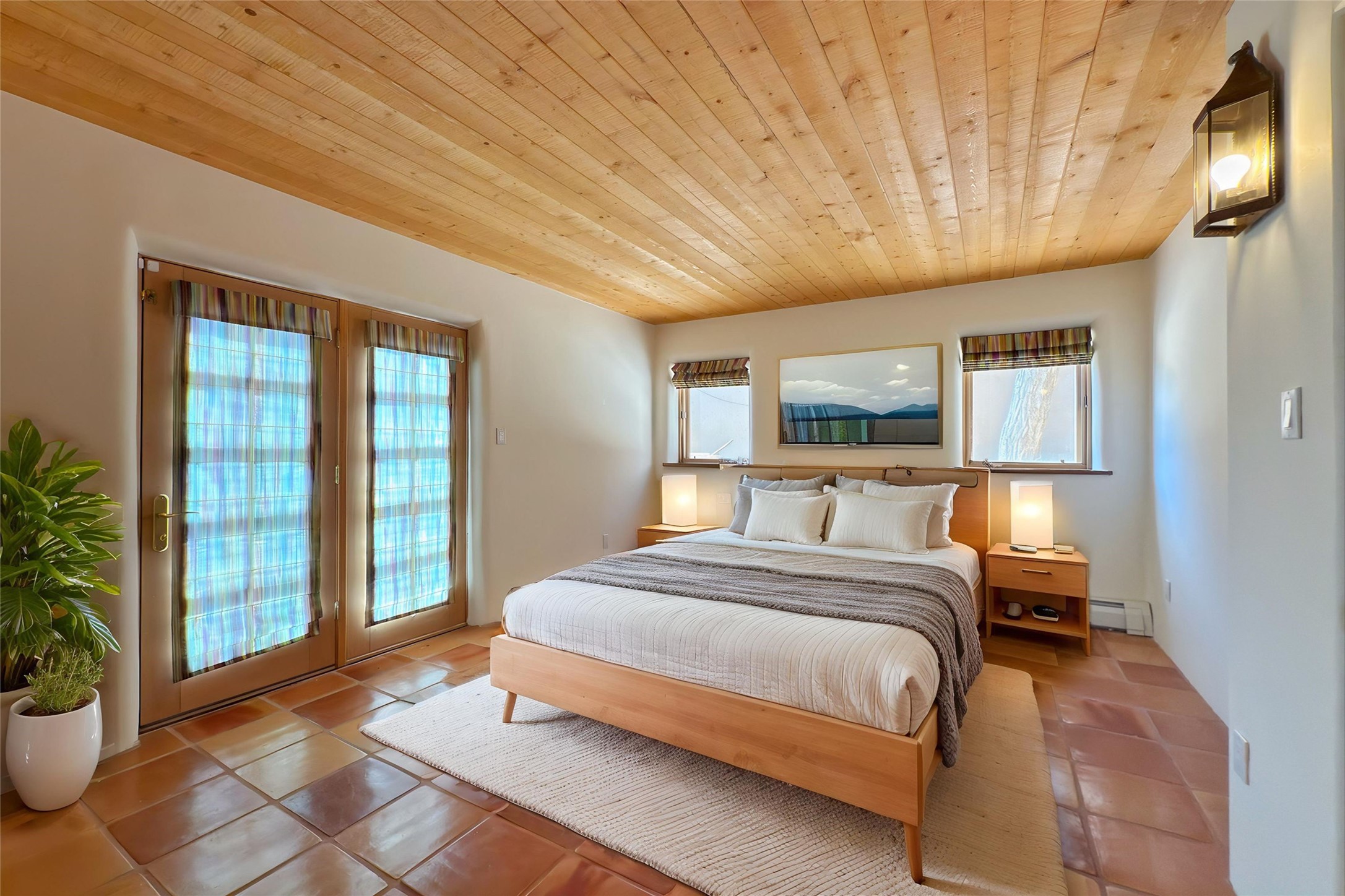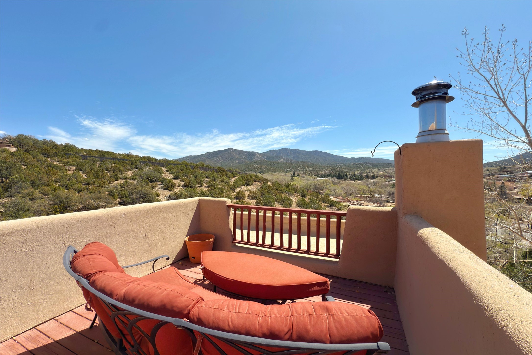 Pop-up, limited time opportunity! This property is partially renovated , complete the work and make it your own!Ideal east side location, in close proximity to Santa Fe's famous Canyon Road and renowned restaurants and boutiques. Nestled in a serene setting surrounded by pinon and juniper, this unique 4-level Santa Fe charmer combines style and comfort. Enjoy breathtaking mountain sunrise views and soak in the natural beauty from multiple level balconies and outdoor patios. Cozy up by the wood-burning fireplace on the main floors' living room, next to the dining room and kitchen. The primary suite is located on its own level, and boasts a private balcony with sunrise views, a jetted soaking tub, and large walk-in closet. The top floor's media room is highlighted by large built-in bookshelves, wood accents, a private balcony, and a wood-burning kiva. A true Santa Fe gem that blends traditional architectural elegance and panoramic views, perfect for those seeking charm and functionality in a peaceful setting.