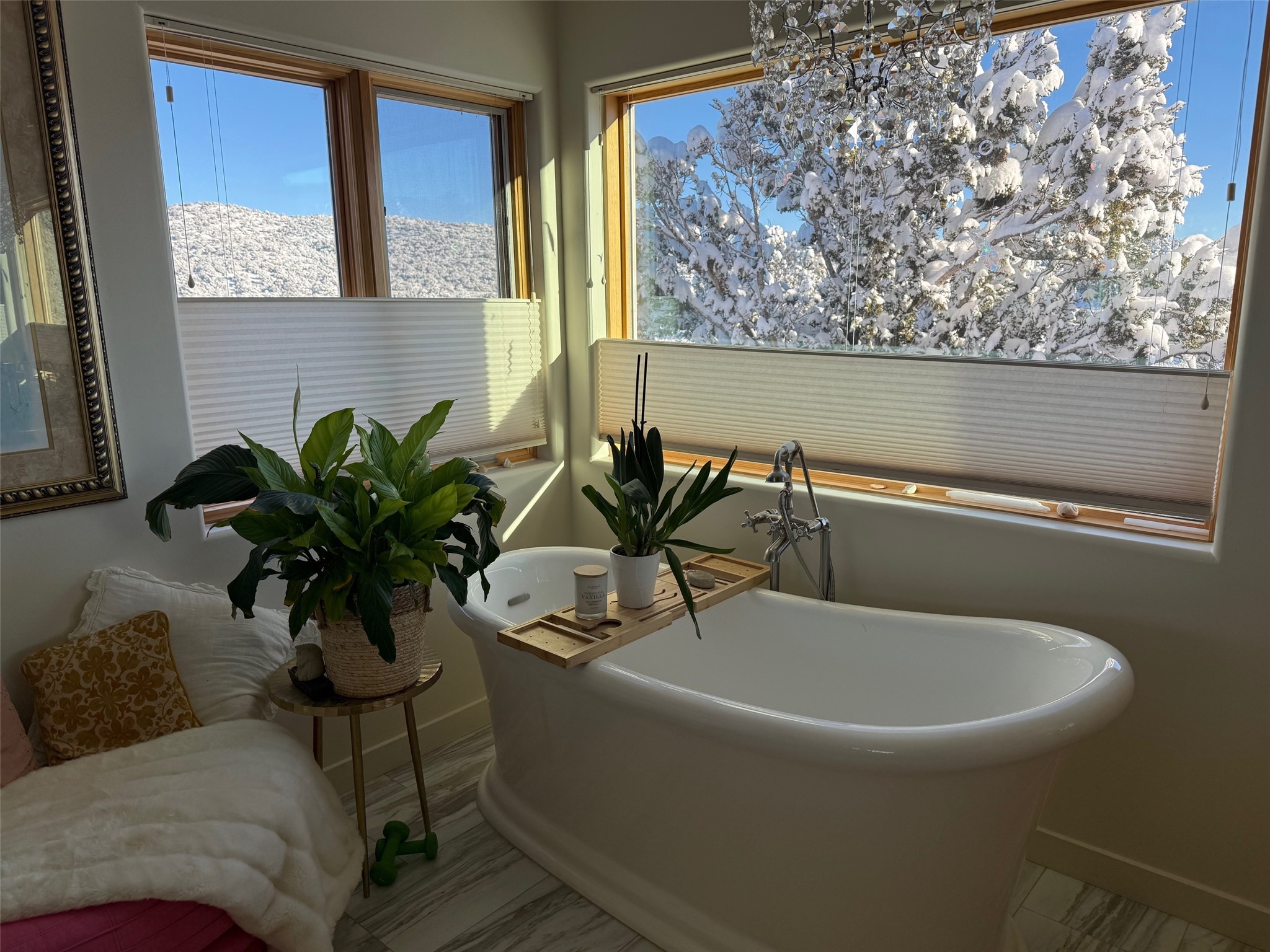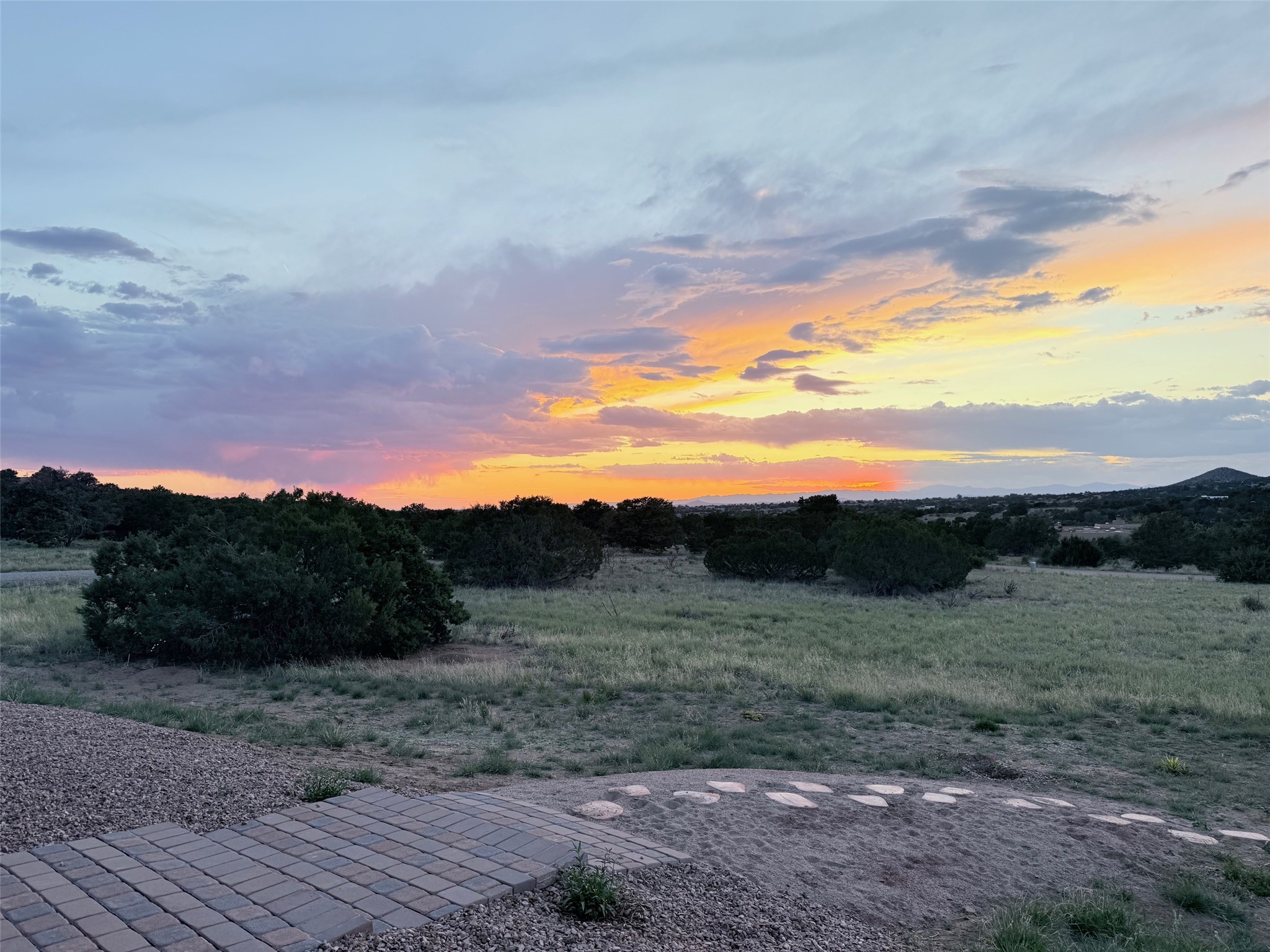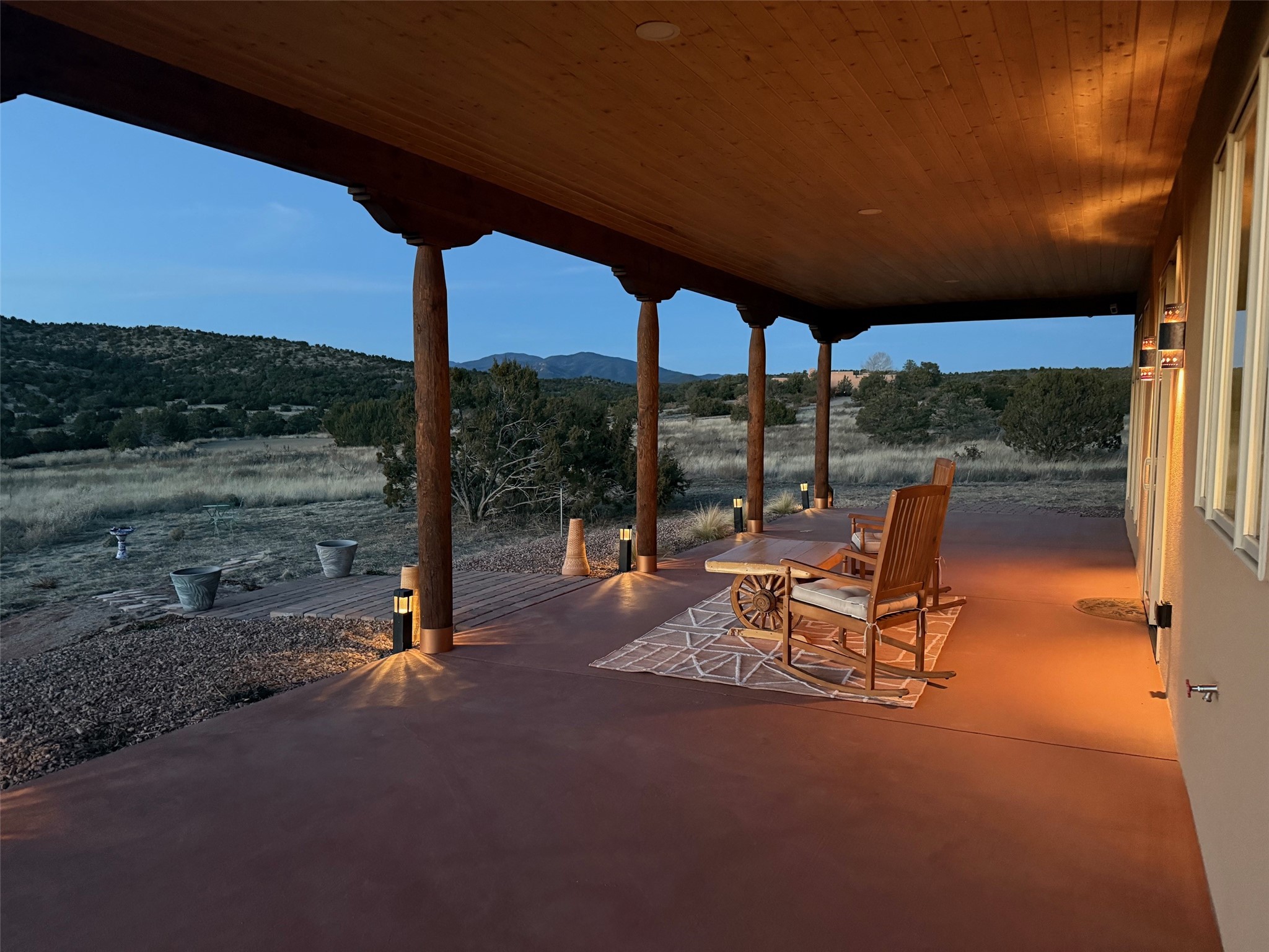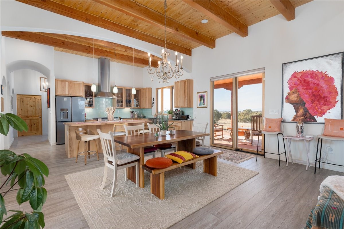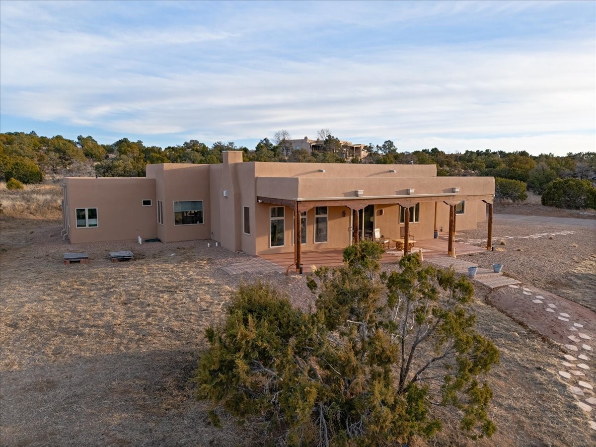 Completed in 2023 and gracefully set on nearly three pristine acres in The Ridges, this exceptional soft-contemporary residence captures the essence of refined New Mexico living. Designed to embrace expansive views, privacy, and serenity, the property offers a rare combination of architectural sophistication and natural beauty -- with ample space to accommodate a future guest house or casita. The home's light-filled interior is defined by soaring 12-foot ceilings in the great room, creating a dramatic yet welcoming atmosphere. An open-concept design enhances both everyday living and elegant entertaining, while three well-appointed bedrooms (or two bedrooms plus an office) and two luxurious full baths provide comfort and style in equal measure. The spacious and inviting primary suite serves as a private retreat, featuring a charming sitting area with French doors that open to the garden patio and framed expansive views. The en suite bath is a true showpiece, highlighted by a luxurious slipper tub illuminated by an overhanging crystal chandelier and dramatically appointed with dual rustic log cabin vanities, blending refined elegance with warm Southwestern character. The chef's kitchen serves as a striking focal point, outfitted with premium Caf appliances, including a six-burner gas cooktop and oven, Caf refrigerator, Bosch dishwasher, and exquisite level 5 granite countertops. Clean lines, quality craftsmanship, and thoughtful finishes throughout contribute to the home's bright, airy ambiance. Seamless indoor-outdoor living unfolds beneath covered portals ideal for year-round enjoyment. Landscaped garden beds await curated plantings, and a beautifully positioned fountain serves as a serene focal point, adding both movement and calming ambiance to the expansive back patio. Modern conveniences include an electric vehicle charging hookup, a comprehensive whole-house alarm system, water filtration, a bidet in the primary bathroom, and a gas fireplace. Located within The Ridges subdivision, known for its quiet surroundings, breathtaking vistas, and reasonable HOA guidelines, this nearly new residence represents a rare opportunity to enjoy privacy, luxury, and timeless Southwestern beauty. Select furnishings are available for purchase separately, offering the possibility of a refined, turnkey acquisition.