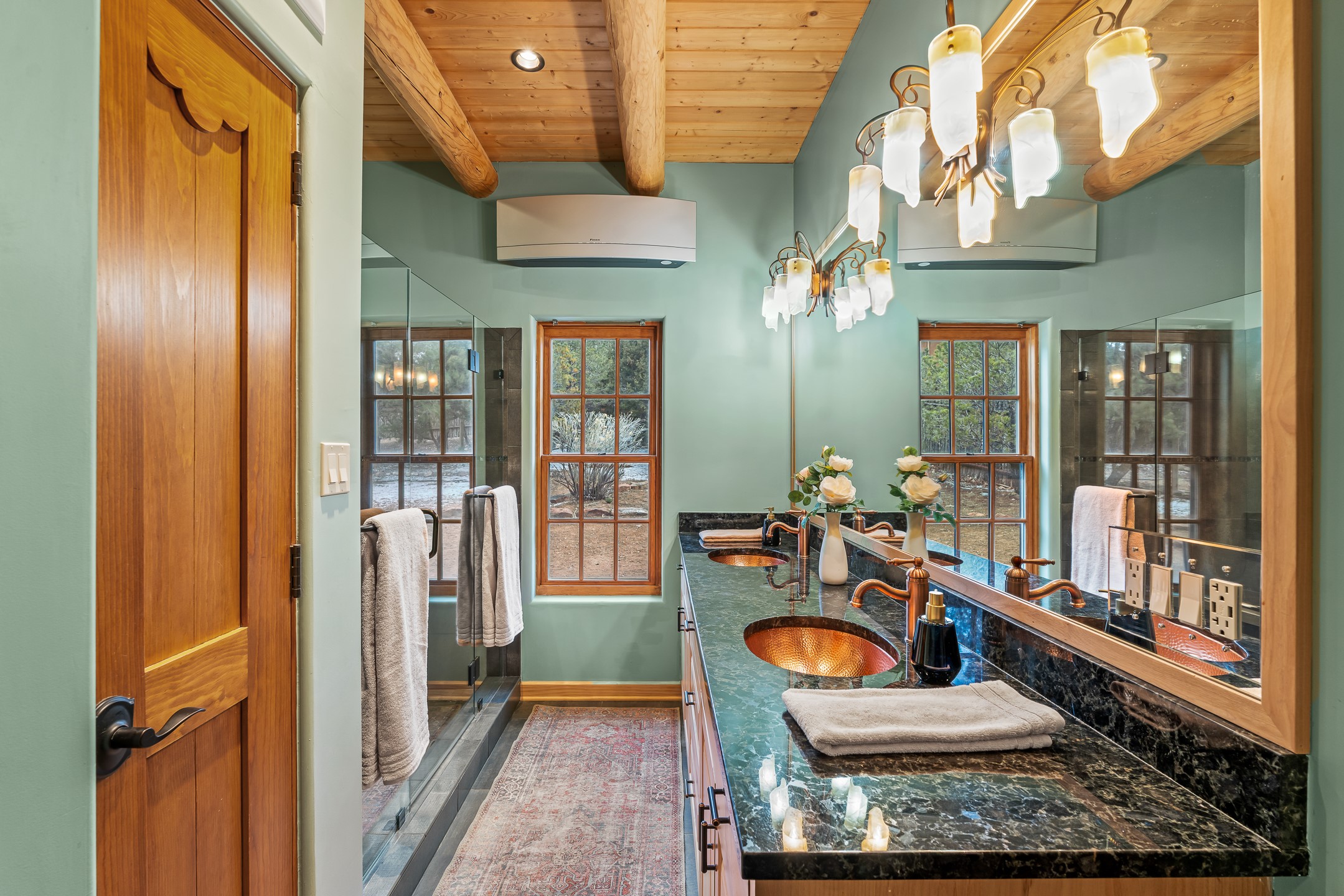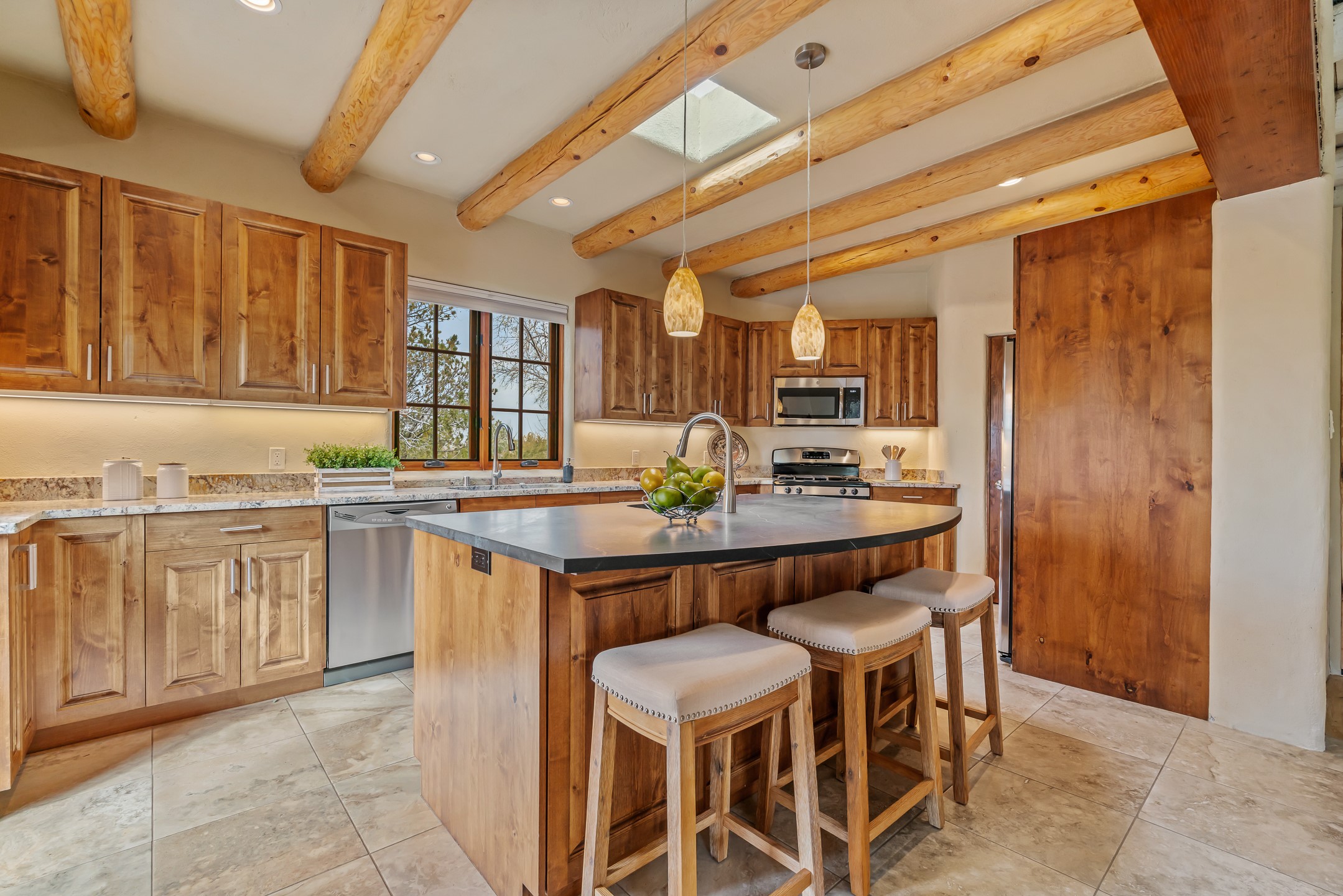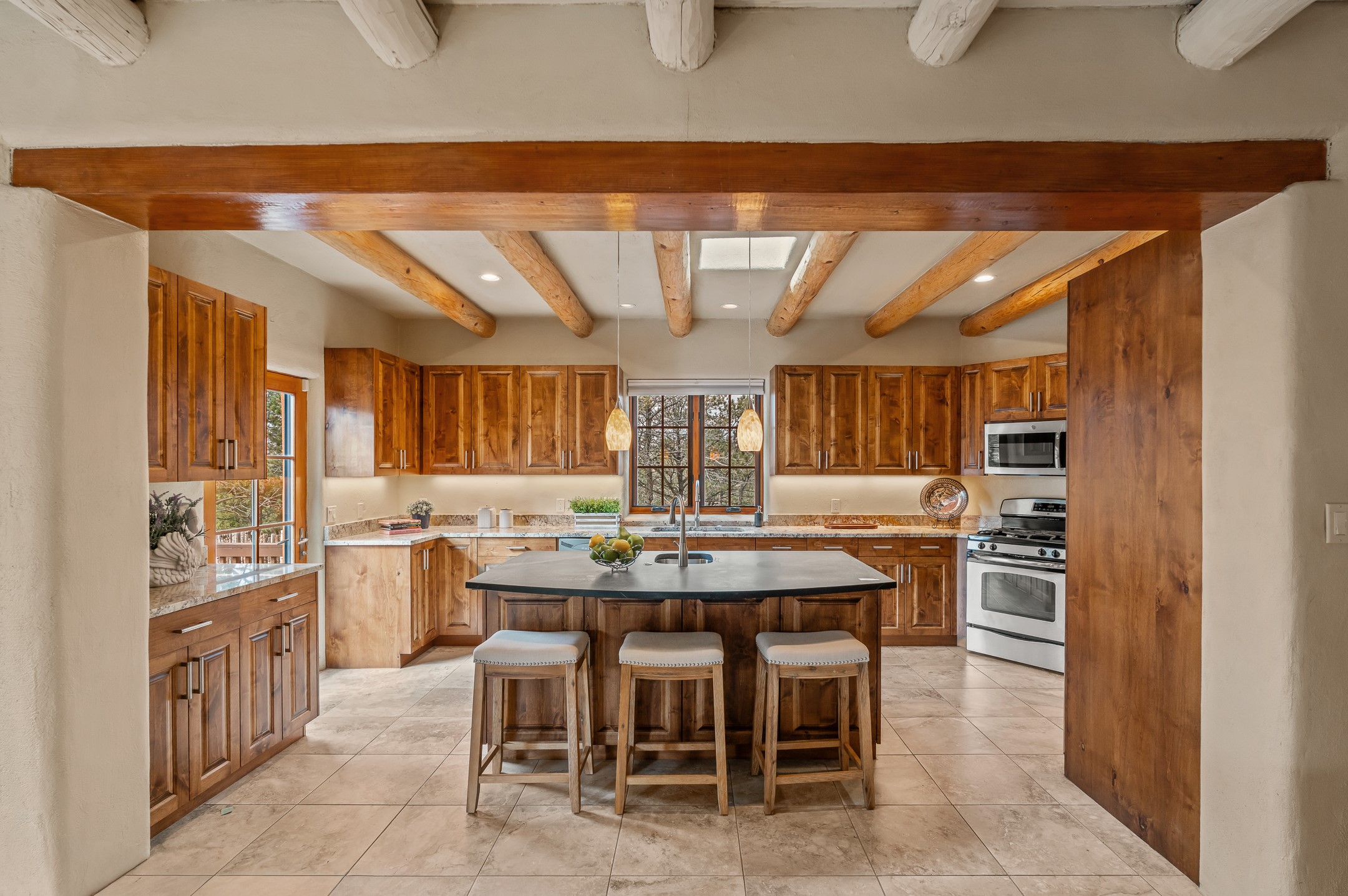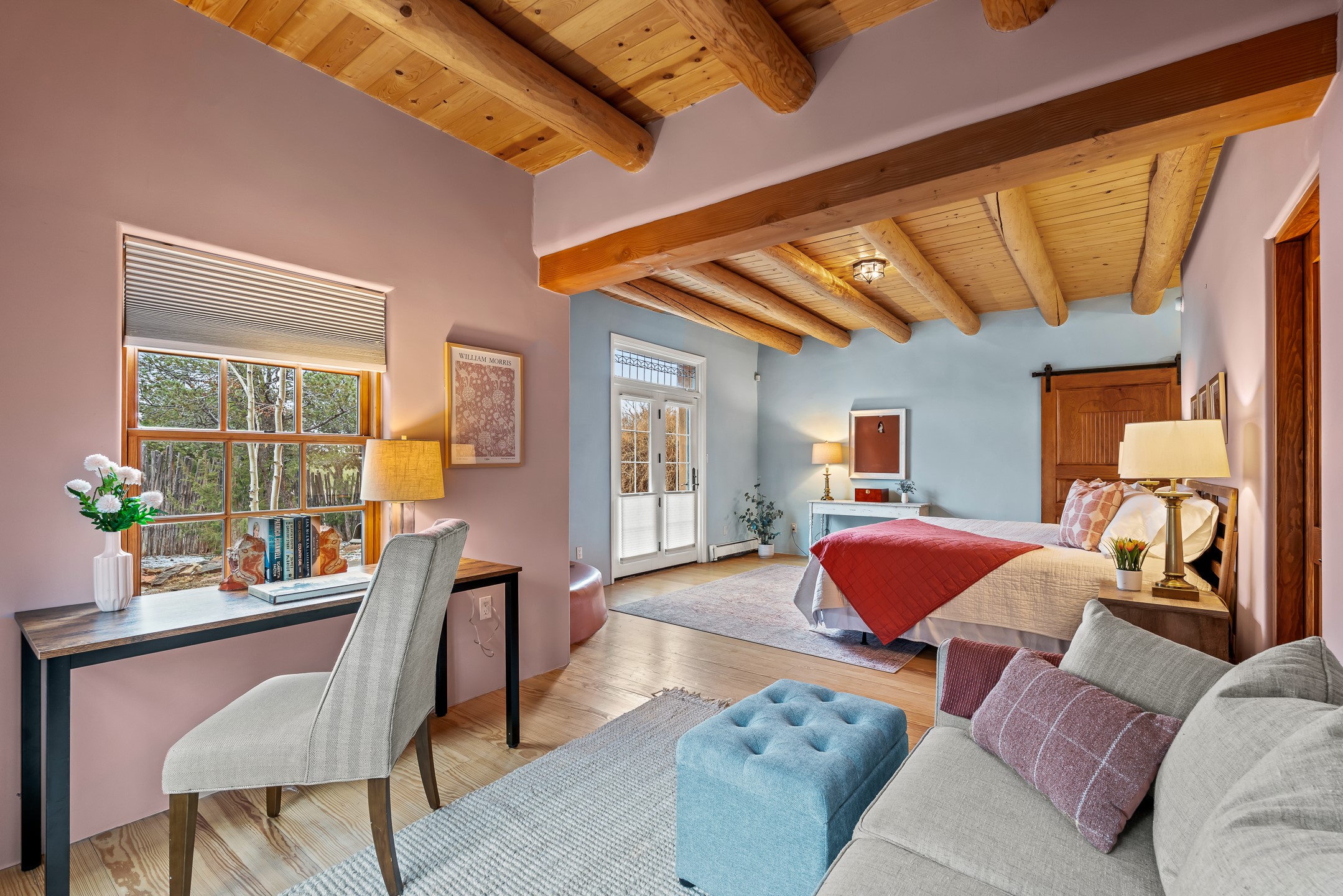 1300 Lejano Lane is a timeless Santa Fe retreat blending classic adobe charm with exceptional indoor-outdoor living. The 2,904-square-foot main residence, constructed of adobe and frame, showcases rich architectural detail and inviting spaces designed for both relaxation and entertaining. The spacious living room features knotty pine wood floors, exposed vigas, and a dramatic kiva fireplace, opening seamlessly to the kitchen. Just beyond, an outdoor deck overlooks the heated pool and hot tub, creating an effortless flow for gatherings. A separate dining room connects to the private guest wing and a light-filled sunroom with brick floors, beamed ceiling, kiva fireplace, and French doors leading to a bricked patio. The primary suite is a true sanctuary, complete with its own Owner's Lounge and kiva fireplace, Douglas fir floors, French doors to an enclosed patio, walk-in closet, double-sink vanity, walk-in shower, and mini-split for year-round comfort. The ensuite guest bedroom also offers a kiva fireplace and French doors to the back patio, near an exterior spiral staircase leading to a rooftop deck. A heated art studio/bonus room with cabinetry, utility sink and private entrance connects to the oversized two-car garage, offering ideal flex space for a gym or creative studio. The beautifully landscaped grounds include brick and natural landscaping, an orchard with apple, pear, apricot, cherry, and a jujube tree, plus two 2,500-gallon water catchment systems irrigating aspens and fruit trees. The heated pool (approx. 15' x 33') ranges from 3.5 to 8.5 feet deep. A charming teepee adds character. A separate all-adobe guesthouse, with it's own private gated entry, features vigas, Saltillo tile, kiva fireplace, full kitchen, dedicated laundry, one bedroom, and a full bath, perfect for guests or rental potential.
