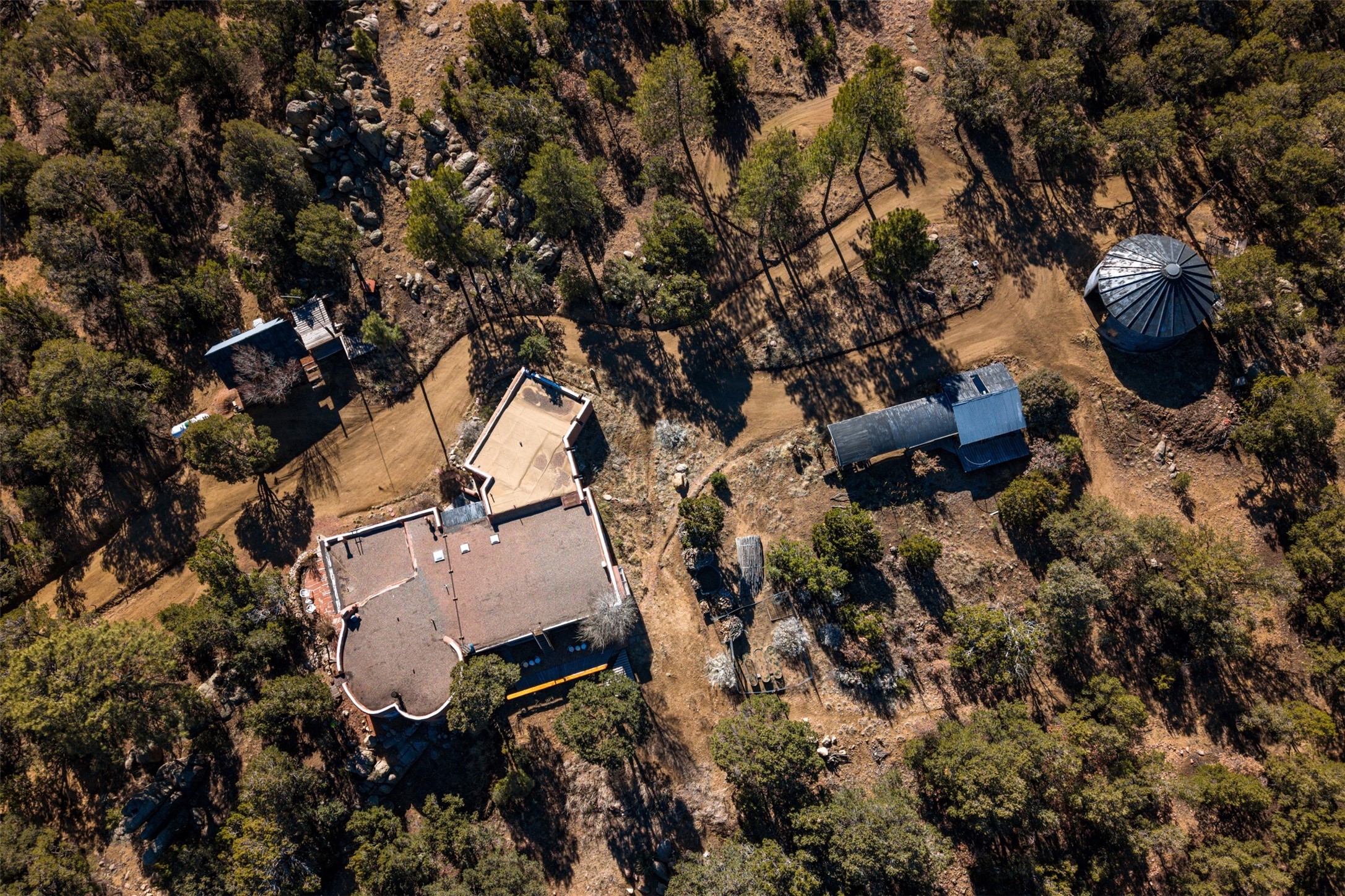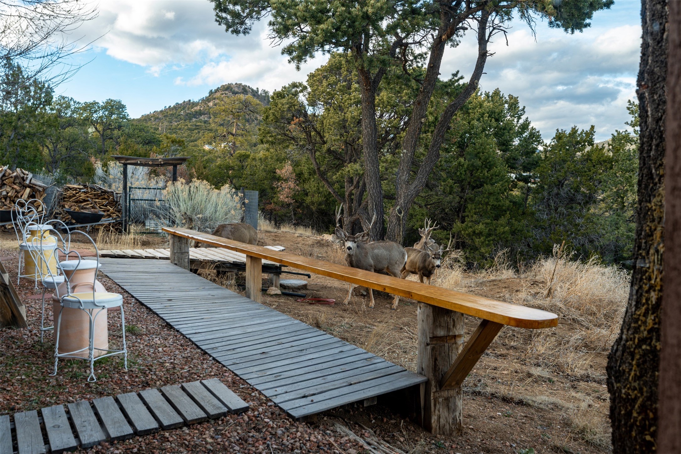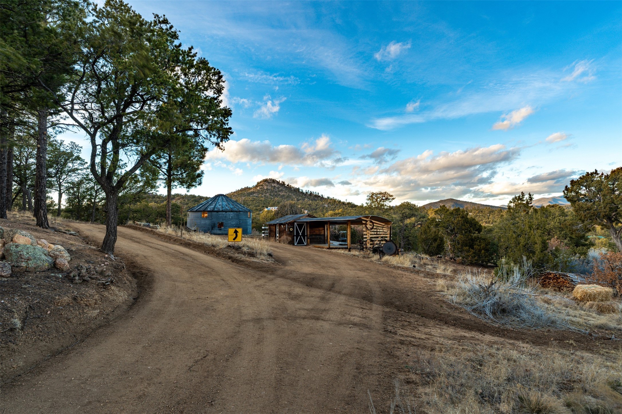 Perched along the historic Old Santa Fe Trail at approximately 7,777 feet in elevation, this hilltop residence spans ten peaceful acres with sweeping high desert views in every direction. Expansive skies, mature trees, and a wraparound vantage point create unforgettable sunsets and panoramic scenery from the elevated deck.The three bedroom, two and one half bath home has been carefully maintained and thoughtfully crafted with traditional Southwest character. Exposed vigas, handcrafted wood details, wood burning fireplaces, and generous windows invite warmth and natural light throughout the open living, dining, and kitchen areas.A welcoming gathering space near the entry sets the tone for celebrations and relaxed entertaining. A separate studio offers privacy for artistic or professional pursuits. Additional structures include a detached garage with barn and workshop space, plus an auxiliary outbuilding and covered parking area that add flexibility and utility.With approximately 3,000 square feet of living space, the floor plan offers the possibility of creating two distinct one bedroom living quarters, opening the door to income potential or comfortable guest accommodations. The land is served by a private well and septic system and may be split into two five acre parcels, providing future options.Surrounded by trails for hiking and cycling, yet only minutes from the Plaza, dining, and cultural destinations, this property offers both seclusion and accessibility. Equipment such as a tractor, implements, generator, and many operational tools related to the upkeep of the land may be available by separate consideration.This is an opportunity for the next steward to continue its legacy. Culmination of ownership is desired, expressions of interest are invited, all reasonable inquiries and sincere offers entertained.