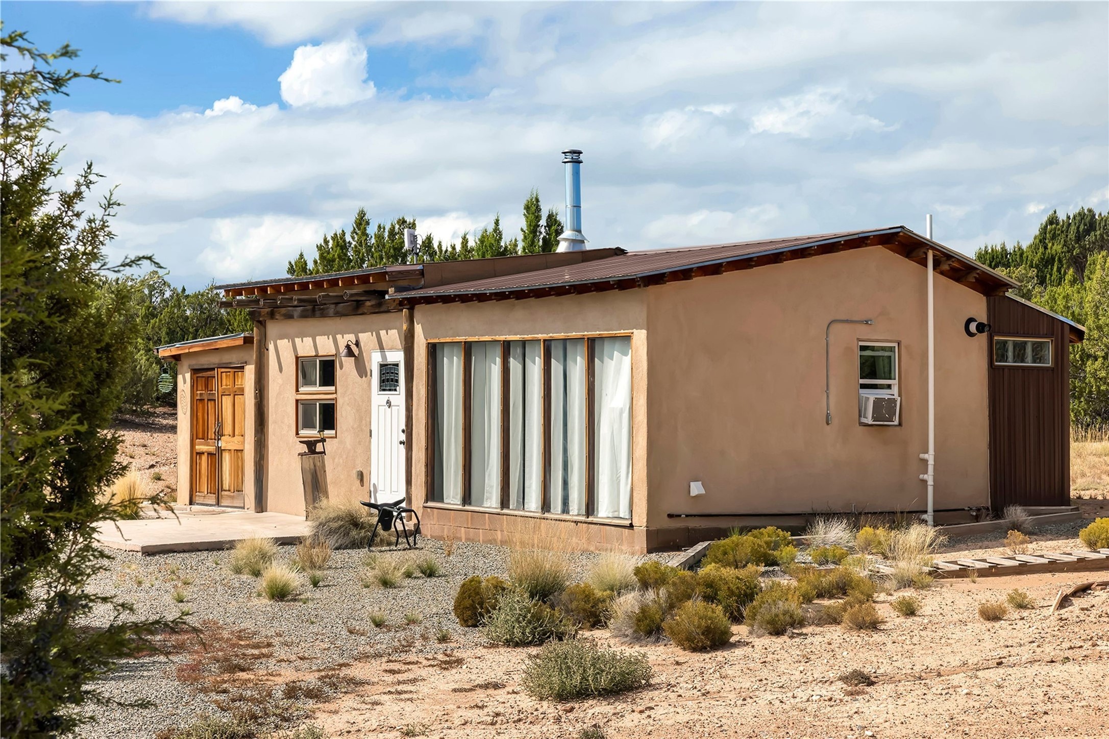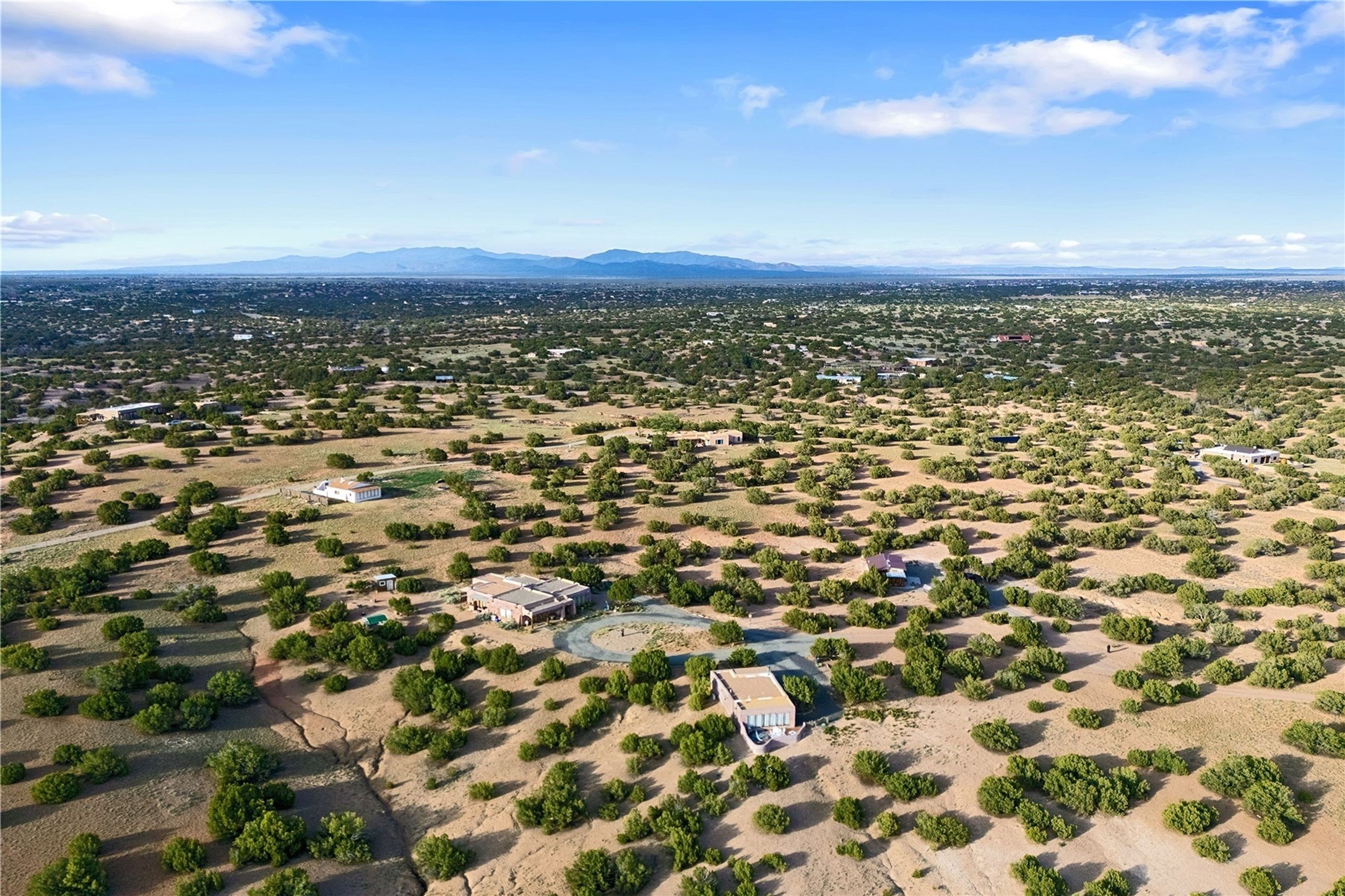 Experience authentic Southwestern living on 12.5 private acres along the historic Turquoise Trail, where panoramic skies, dramatic mountain views, and authentic Santa Fe architecture create a setting that feels both expansive and intimate. Just minutes from Santa Fe, this exceptional property offers a true compound lifestyle with three distinct structures: a two-bedroom, one-bath main residence, a one-bedroom, one-bath guest casita, and a thoughtfully designed studio with dedicated sleeping area and kitchen--ideal for creative pursuits, extended guests, or flexible living. The main home showcases classic Santa Fe craftsmanship with soaring ceilings, massive round vigas, hand-painted Mexican tile, custom wood doors, and hand-forged ironwork. Warm, inviting interiors open effortlessly to multiple patios and portals, creating seamless indoor-outdoor living. Every angle captures sweeping views of surrounding mountain ranges and the endless New Mexico sky--perfect for sunset gatherings, morning coffee, or quiet reflection. The freestanding guest casita offers privacy and comfort, enhanced by multiple outdoor living spaces that frame breathtaking views of the Ortiz Mountains. The nearby studio, filled with natural light, provides inspiring space for artists, writers, or anyone seeking a peaceful retreat. Set on land once part of the ancient San Marcos Pueblo, the property carries a deep sense of history and connection to place. Here, wide-open space, tranquility, and authenticity define daily life--while Santa Fe's renowned dining, galleries, and cultural attractions remain an easy scenic drive away.