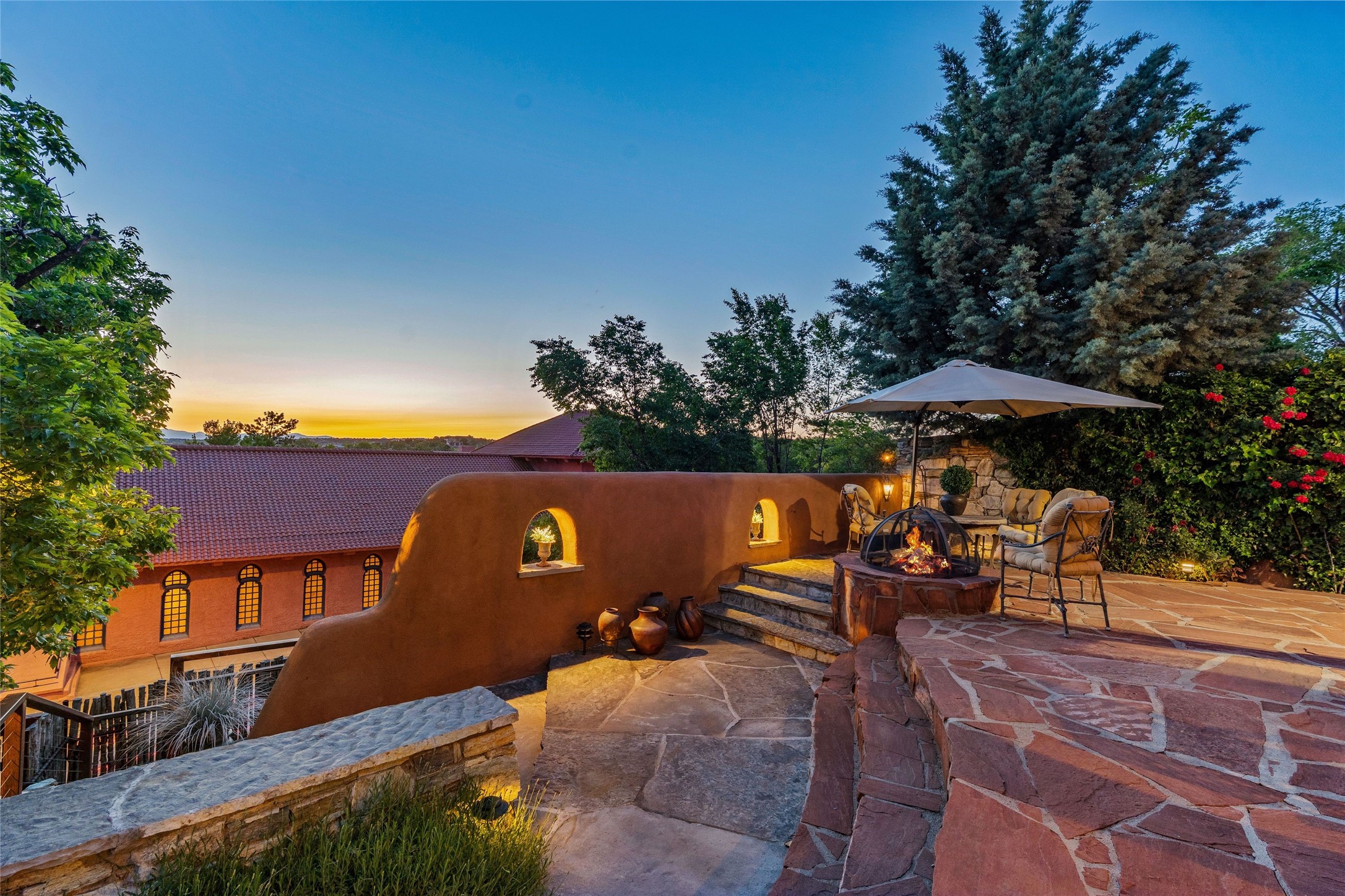 Historic District 2-bedroom 2.5 bath home located 2 blocks from The Plaza with city lights and mountain views. Gorgeous old-world details reimagined with contemporary updates and artistic flair. Iconic Santa Fe style with hard wood and brick floors, hand carved doors, beams and lintels, 3 kiva fireplaces, coved ceilings, split cedar latillas, vigas, nichos, plaster, antique sconces, and Talavera tiles. The foyer opens to a 22 ft atrium and a wooden carved staircase. The open-concept living/dining space is anchored by a double-sided wood-burning fireplace that connects the dining and living rooms. In the living room, romantic shuttered windows frame a scenic picture of the city with views of the Ortiz, Sun and Moon, and the Jemez mountains. The renovated chef's kitchen is appointed with embedded shell limestone honed countertops, a chiseled brick cream limestone backsplash, custom cream cabinetry, and state-of-the-art AGA appliances, including a $15,000 AGA Elise gas stove with a wok burner The primary bedroom has French doors that open to a private patio, where tiered terraces and lush landscaping offer expansive Jemez Mountain views and Santa Fe sunsets while the primary bath is a serene retreat with floor-to-ceiling river rock walls and a 4" deep white onyx double vanity lit from below, allowing the onyx geode sinks to glow. In addition to a second guestroom, there is a bonus office/study. Multiple portals offer impressions of the rose gleam of the hallmark Scottish Rite Temple as well as plentiful areas for entertaining and enjoying the incredible New Mexico weather. A curved stone stairway lined with 10 ft stone walls leads down to antique Indian elephant doors and a secret, storybook passage to The Plaza. A prime location where culinary enthusiasts will enjoy the short distance to SantaCaf, Market Street Steakhouse and other noteworthy restaurants.