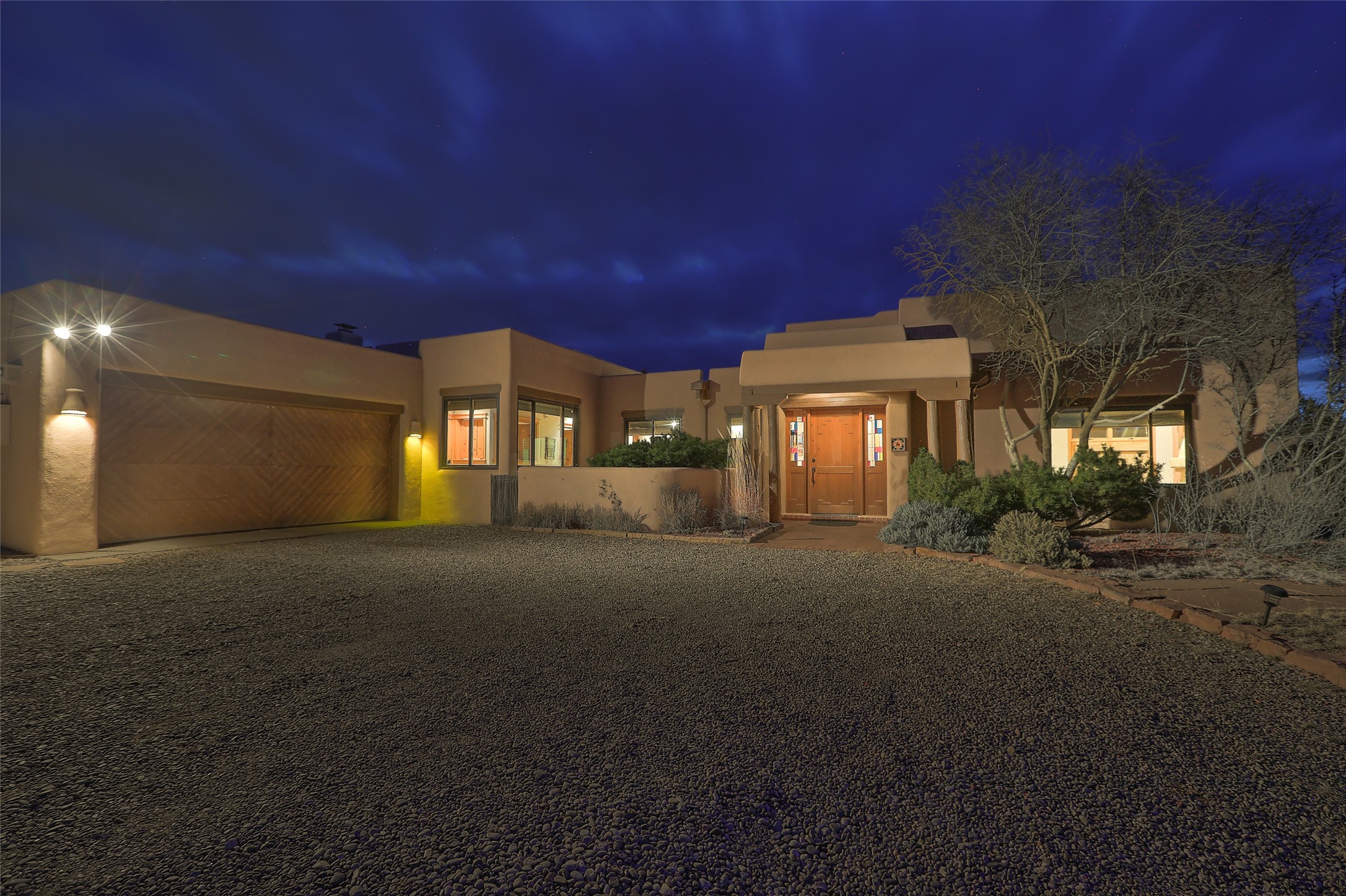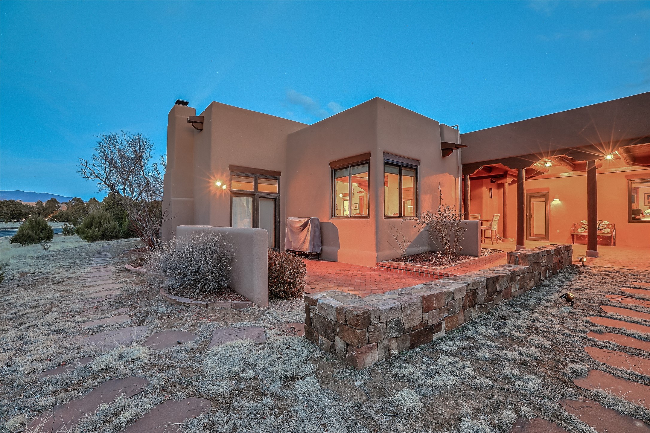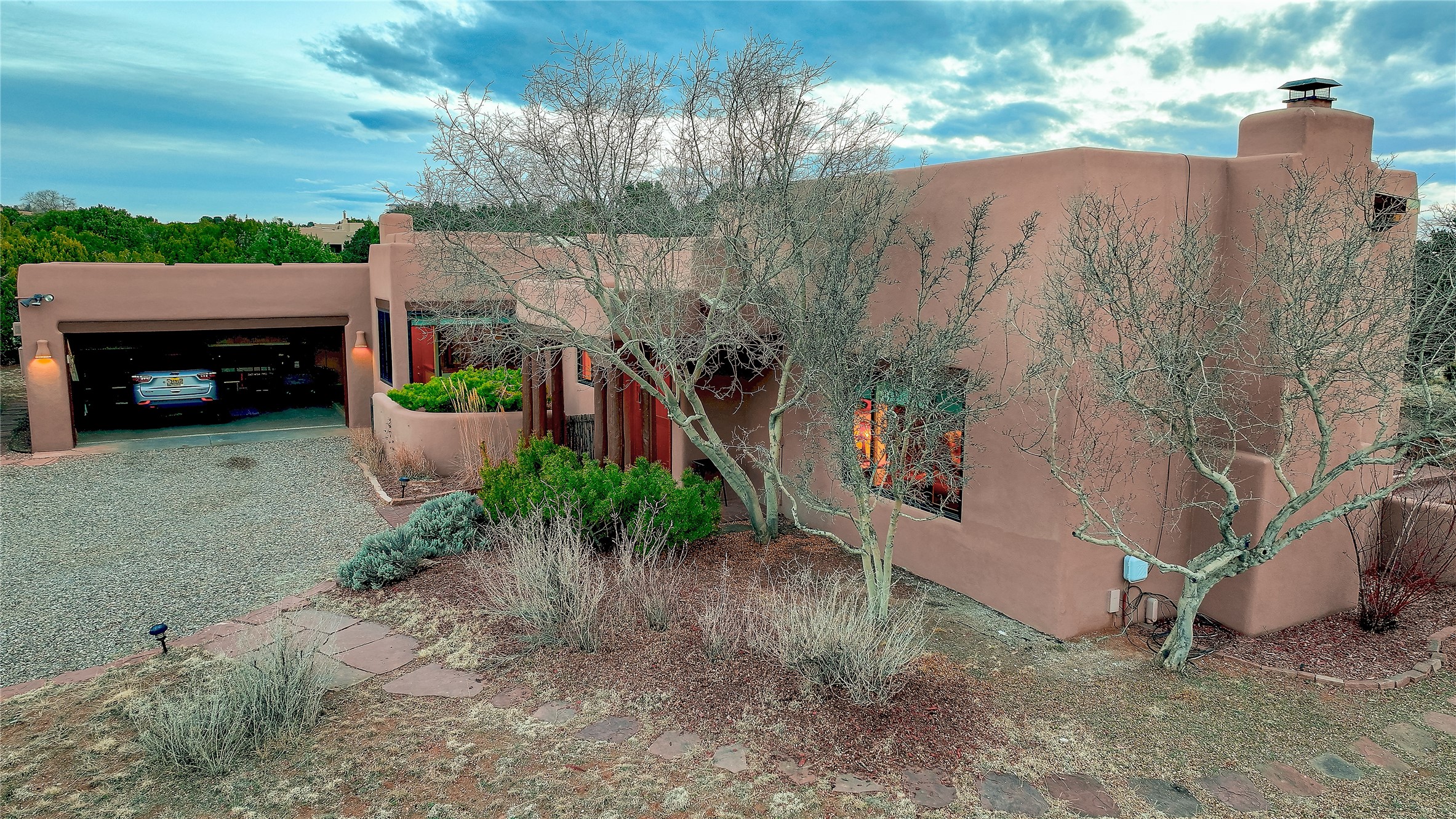 Welcome to lovely 4 Morning Glory! Salva Tierra home with Sangre views and sunset beauty. This is a SHOWCASE HOME. Thoughtful architectural custom design and handcrafted woodwork throughout with lots of natural light, this single level home (two steps to living room) is in absolutely pristine condition. Spacious master suite with kiva fireplace and sparkly custom bathroom near well planned powder room and walk in closet. Love to cook? This is a great space for entertaining! The kitchen is more than a kitchen... it is a welcoming place to spend time with loved ones, with a wonderful layout and is cozy yet also has generous counter and cabinet space plus an eat-in breakfast nook that is a favorite spot. Formal dining area too with a walk out dining area under the back portal. Private and quiet third bedroom with fireplace, has great natural light & can also be a bright office or studio space with a walk out door to access the back portal. Beautifully landscaped & low maintenance gardens. Multiple outdoor patio spaces; with a back sunset portal and a walled master bedroom patio that also has garage access and access to the yard. All rooms have outside access. This makes indoor/outdoor living truly accessible and enjoyable! Forced air heating system + AIR CONDITIONING. Newer windows & newer roof. Dream 2 car garage with lots of built-in storage keeps everything neat & organized. Sonos sound system stays too!