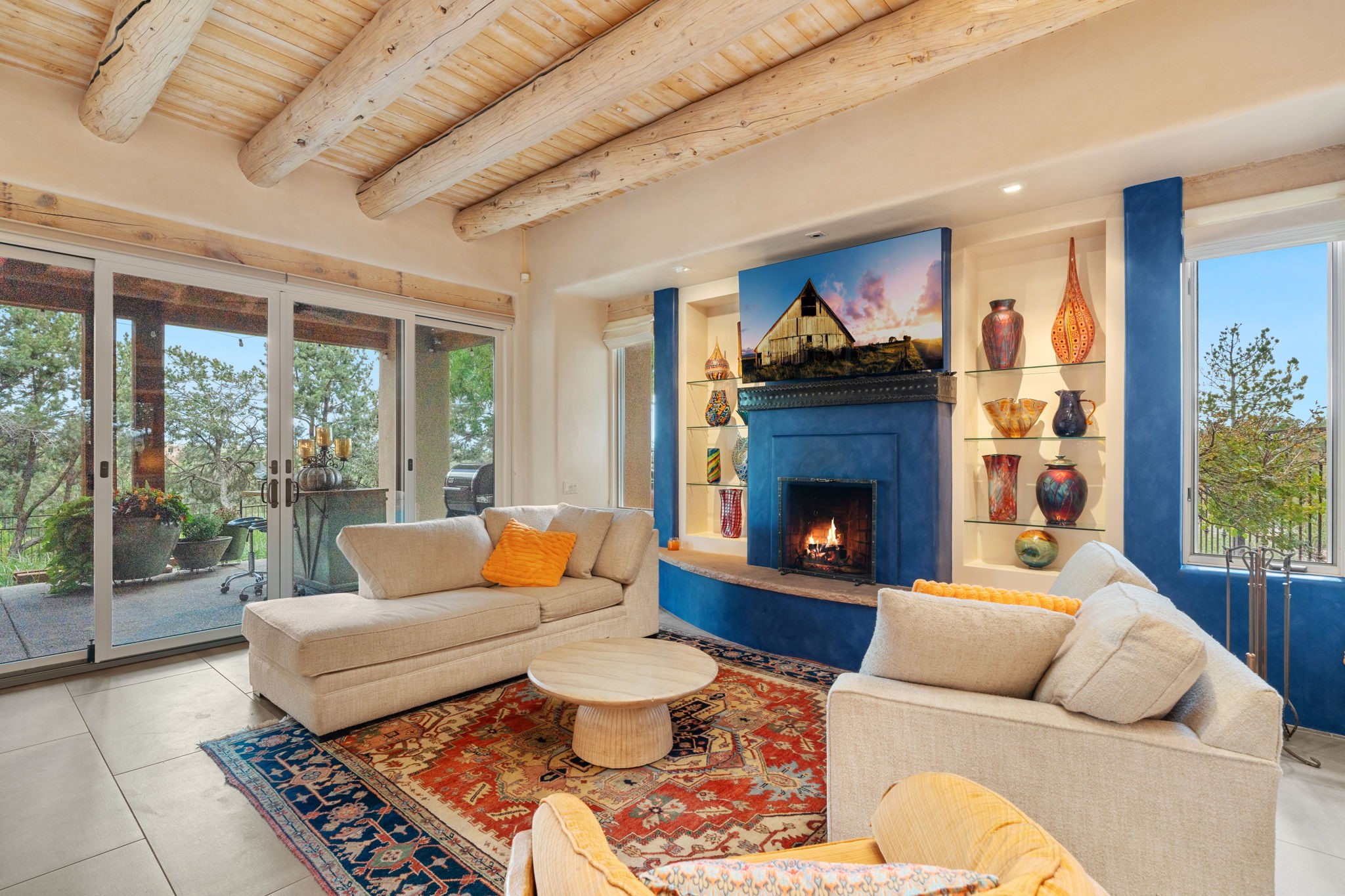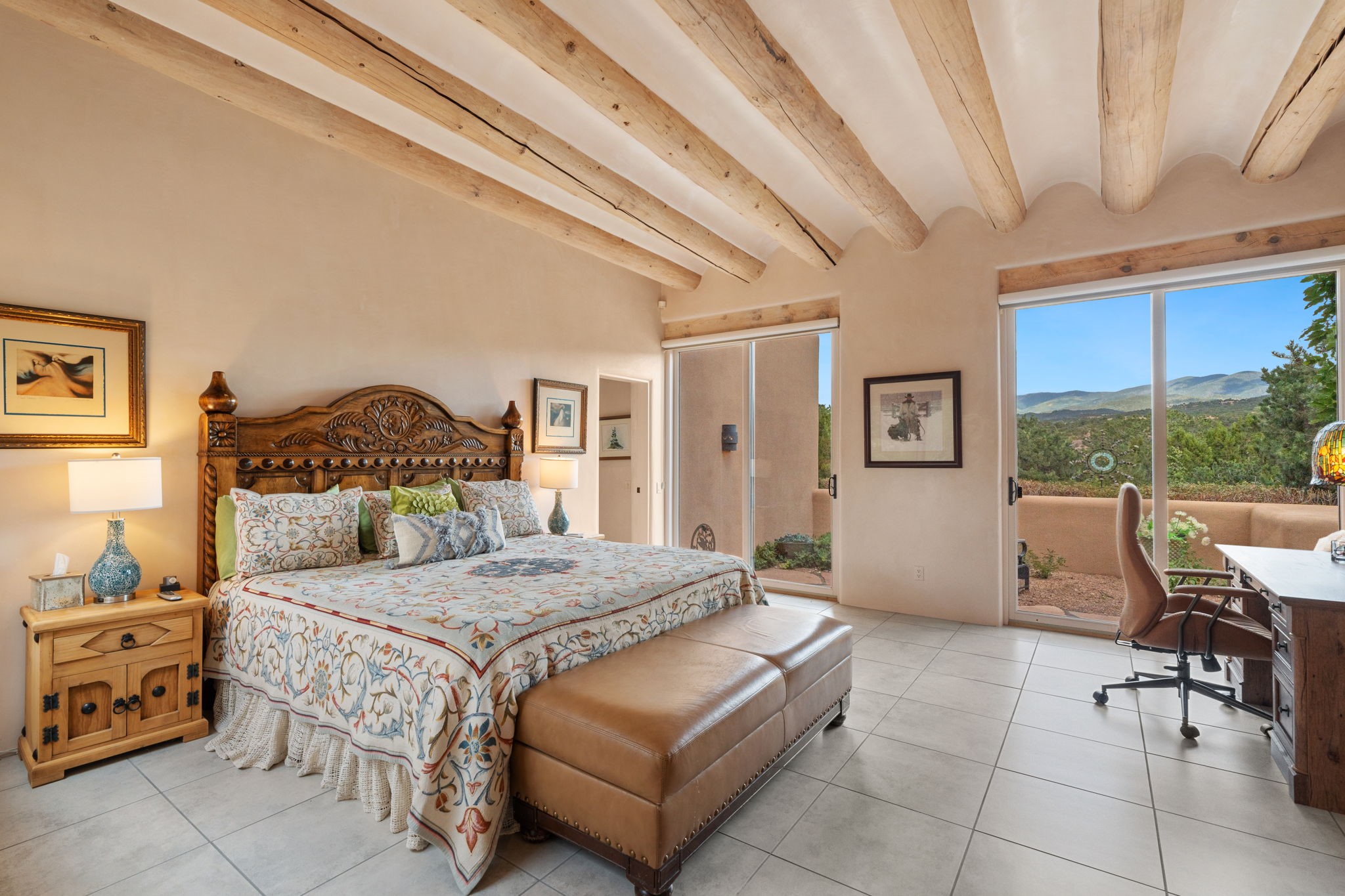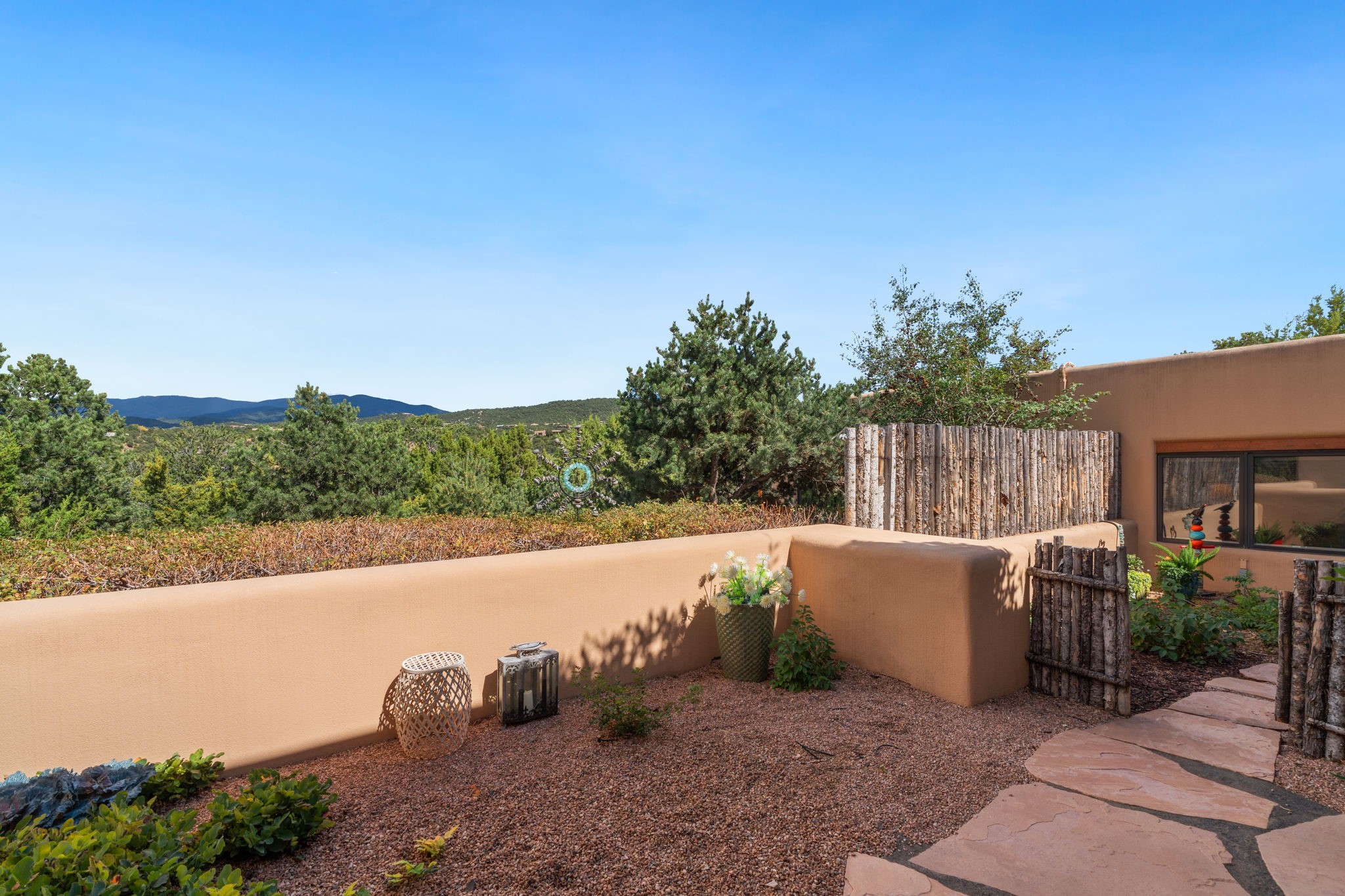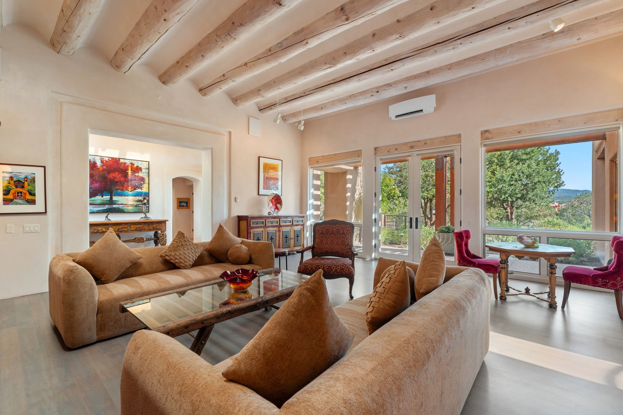 Tucked just a mile from the historic Santa Fe Plaza, this exceptional adobe estate blends classic Northern New Mexico architecture with modern sophistication. Set on a wooded, private property, it features a 3,263 sq. ft. main house and a 1,340 sq. ft. detached casita--ideal for guests or extended family. Handcrafted details abound: viga beams, tile and hardwood floors, and softly curved adobe walls that invite natural light. The great room offers tall ceilings, a grand fireplace, and picture windows framing mountain views. Double doors open to a covered portal with outdoor fireplace and seating for year-round entertaining. Remodeled in 2024, the chef's kitchen includes a six-burner range, convection oven, oversized island, premium appliances, built-in bar, and coffee station--perfect for gatherings large or small. The primary suite is a serene retreat with fireplace, private portal, and spa-style bath with dual closets, double vanities, soaking tub, and glass-enclosed shower. A guest suite, radiant heating, skylights, and seven mini-splits enhance comfort throughout. The detached casita echoes the main home's charm, offering two bedrooms, two baths, a kiva fireplace, wet bar, breakfast nook, and office area--an ideal guest or studio space. Outdoors, multiple patios and sitting areas blend seamlessly with the landscape. A 3,000-gallon cistern supports irrigation, and an EV-ready outlet adds modern convenience. With timeless adobe design, curated upgrades, and proximity to downtown Santa Fe, 1085 Camino Maana captures the essence of refined Southwestern living.