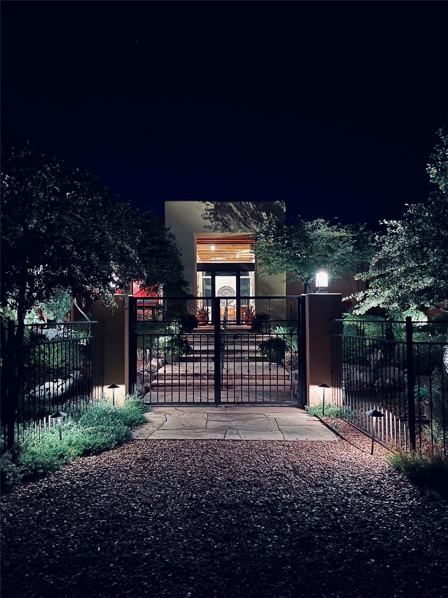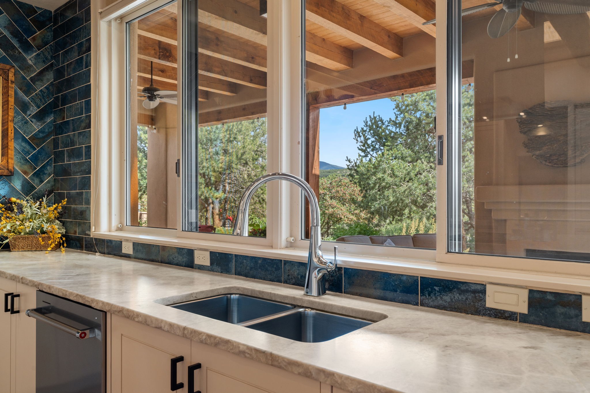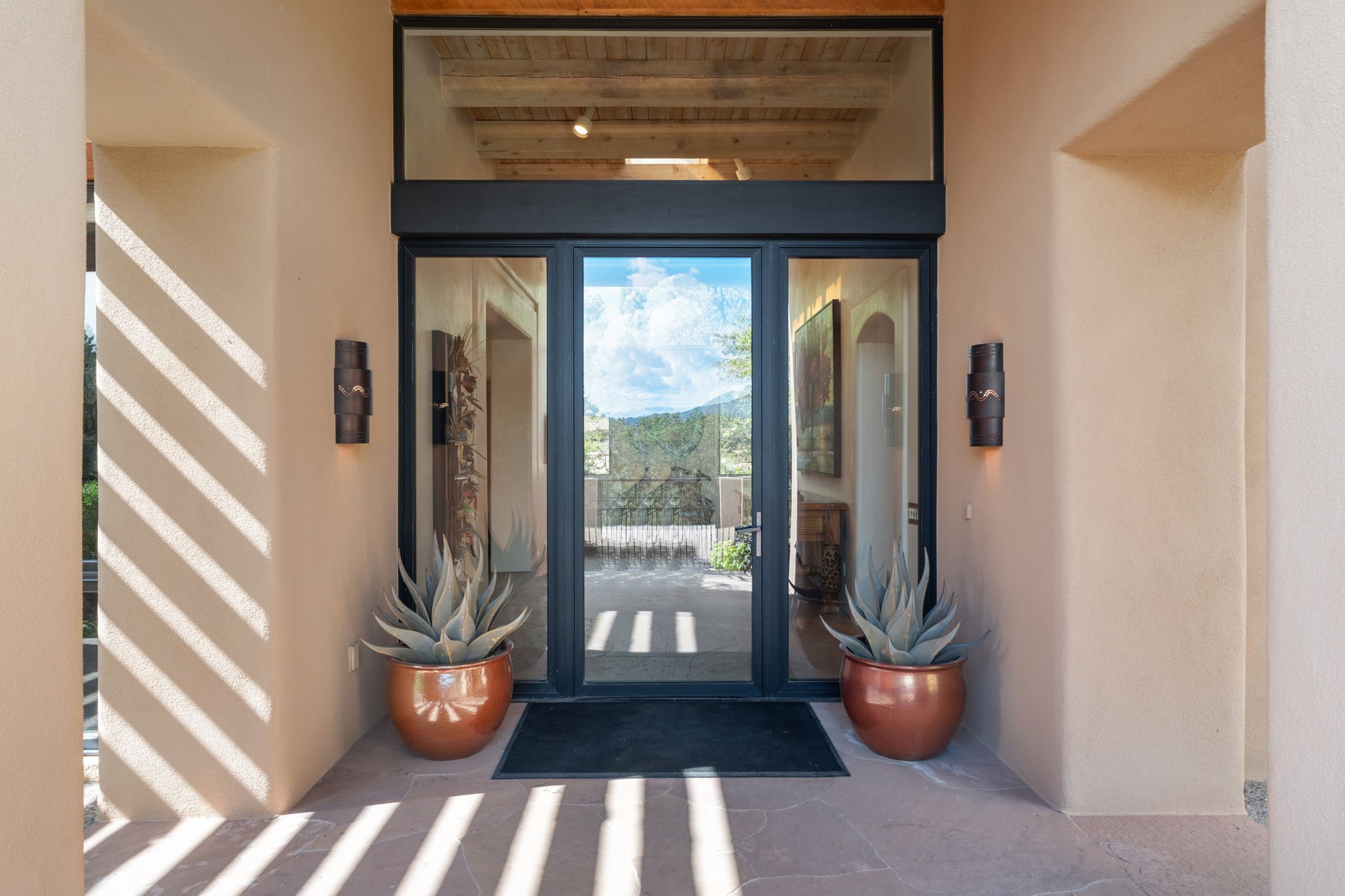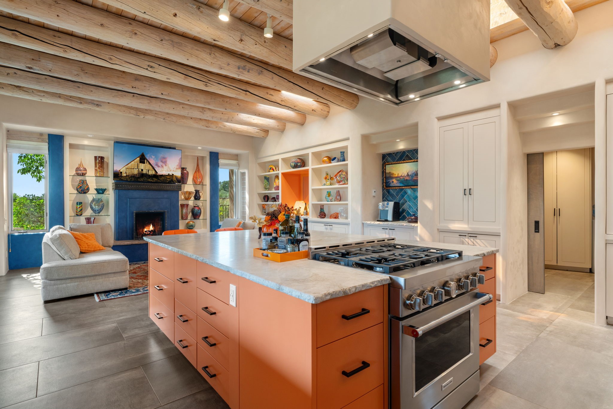Tucked just a mile from the historic Santa Fe Plaza, this exceptional adobe estate blends classic Northern New Mexico architecture with modern sophistication. Set on a wooded, private property, it features a 3,263 sq. ft. main house and a 1,340 sq. ft. detached casita--ideal for guests or extended family. Handcrafted details abound: viga beams, tile and hardwood floors, and softly curved adobe walls that invite natural light. The great room offers tall ceilings, a grand fireplace, and picture windows framing mountain views. Double doors open to a covered portal with outdoor fireplace and seating for year-round entertaining. Remodeled in 2024, the chef's kitchen includes a six-burner range, convection oven, oversized island, premium appliances, built-in bar, and coffee station--perfect for gatherings large or small. The primary suite is a serene retreat with fireplace, private portal, and spa-style bath with dual closets, double vanities, soaking tub, and glass-enclosed shower. A guest suite, radiant heating, skylights, and seven mini-splits enhance comfort throughout. The detached casita echoes the main home's charm, offering two bedrooms, two baths, a kiva fireplace, wet bar, breakfast nook, and office area--an ideal guest or studio space. Outdoors, multiple patios and sitting areas blend seamlessly with the landscape. A 3,000-gallon cistern supports irrigation, and an EV-ready outlet adds modern convenience. With timeless adobe design, curated upgrades, and proximity to downtown Santa Fe, 1085 Camino Maana captures the essence of refined Southwestern living.