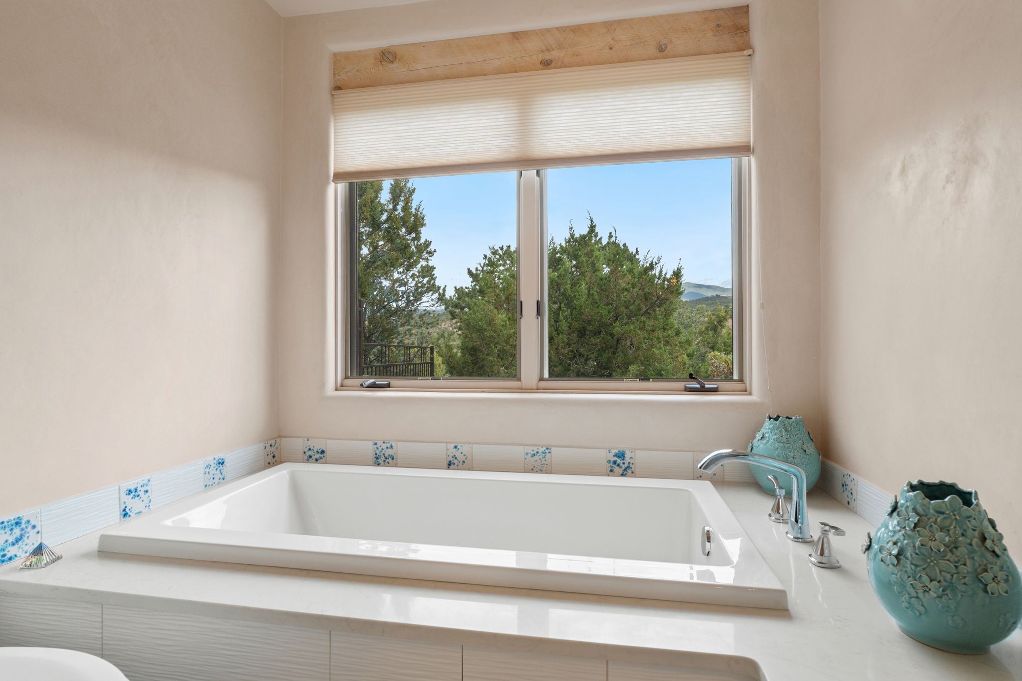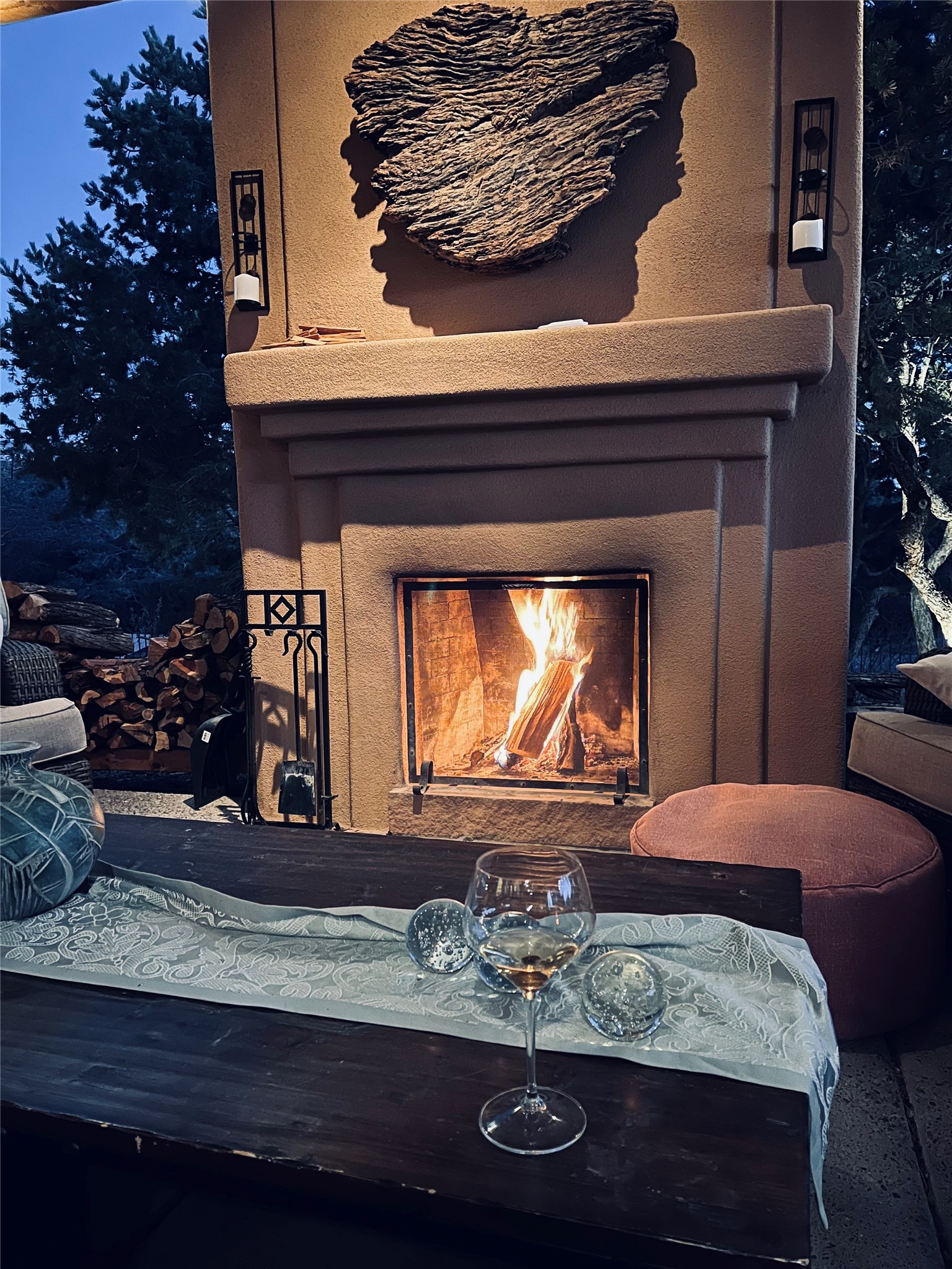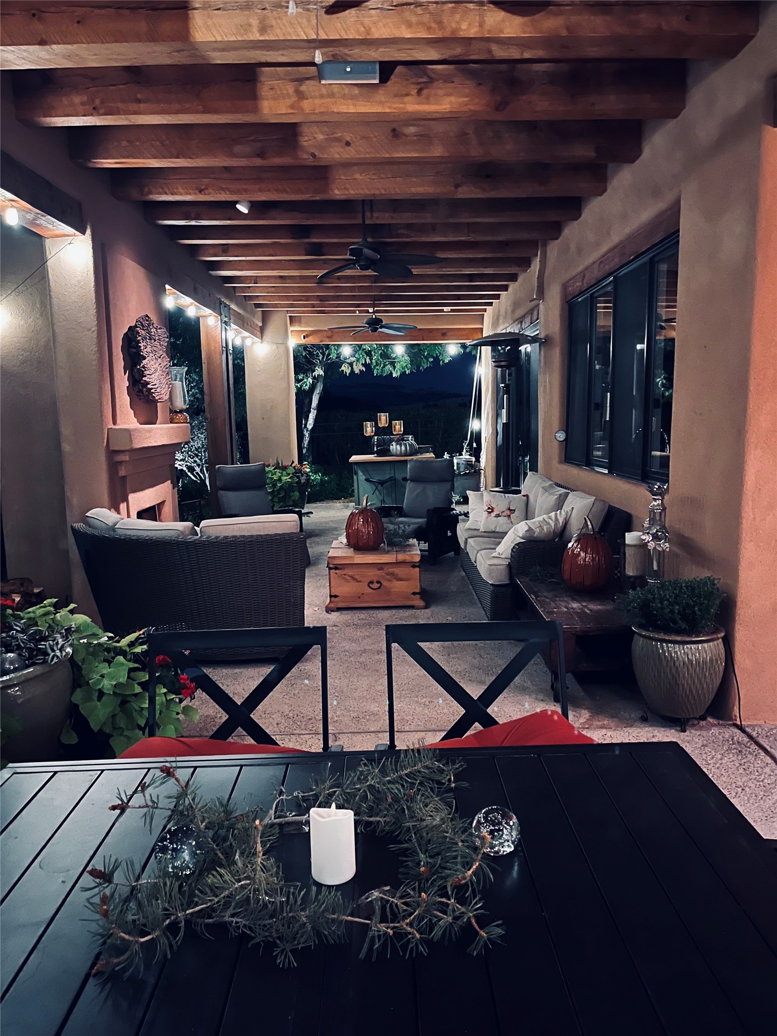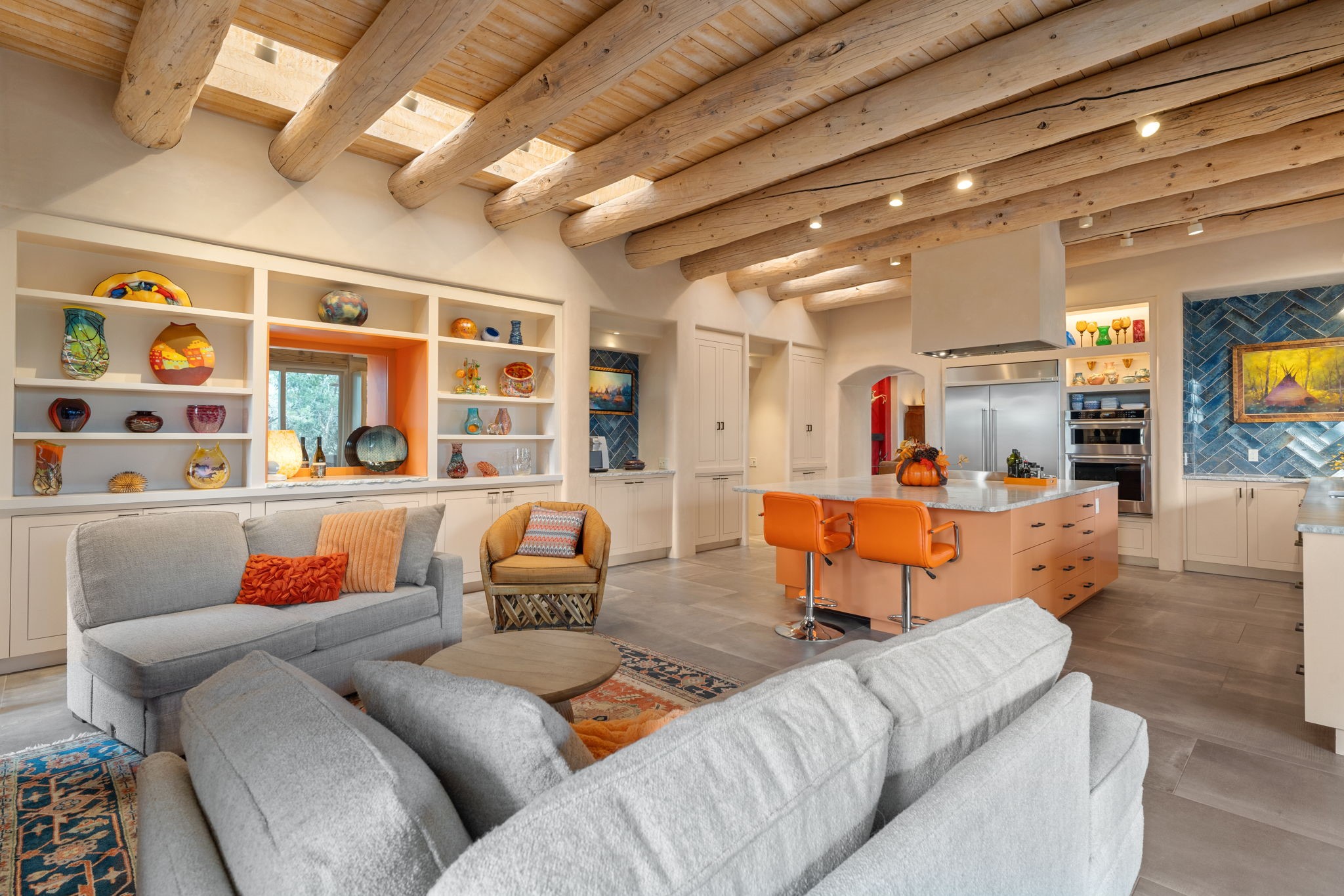Tucked just a mile from the historic Santa Fe Plaza, this exceptional adobe estate blends classic Northern New Mexico architecture with modern sophistication. Set on a wooded, private property, it features a 3,263 sq. ft. main house and a 1,340 sq. ft. detached casita--ideal for guests or extended family. Handcrafted details abound: viga beams, tile and hardwood floors, and softly curved adobe walls that invite natural light. The great room offers tall ceilings, a grand fireplace, and picture windows framing mountain views. Double doors open to a covered portal with outdoor fireplace and seating for year-round entertaining. Remodeled in 2024, the chef's kitchen includes a six-burner range, convection oven, oversized island, premium appliances, built-in bar, and coffee station--perfect for gatherings large or small. The primary suite is a serene retreat with fireplace, private portal, and spa-style bath with dual closets, double vanities, soaking tub, and glass-enclosed shower. A guest suite, radiant heating, skylights, and seven mini-splits enhance comfort throughout. The detached casita echoes the main home's charm, offering two bedrooms, two baths, a kiva fireplace, wet bar, breakfast nook, and office area--an ideal guest or studio space. Outdoors, multiple patios and sitting areas blend seamlessly with the landscape. A 3,000-gallon cistern supports irrigation, and an EV-ready outlet adds modern convenience. With timeless adobe design, curated upgrades, and proximity to downtown Santa Fe, 1085 Camino Maana captures the essence of refined Southwestern living.