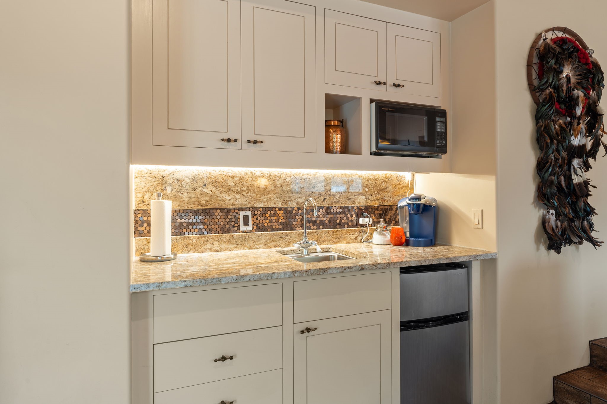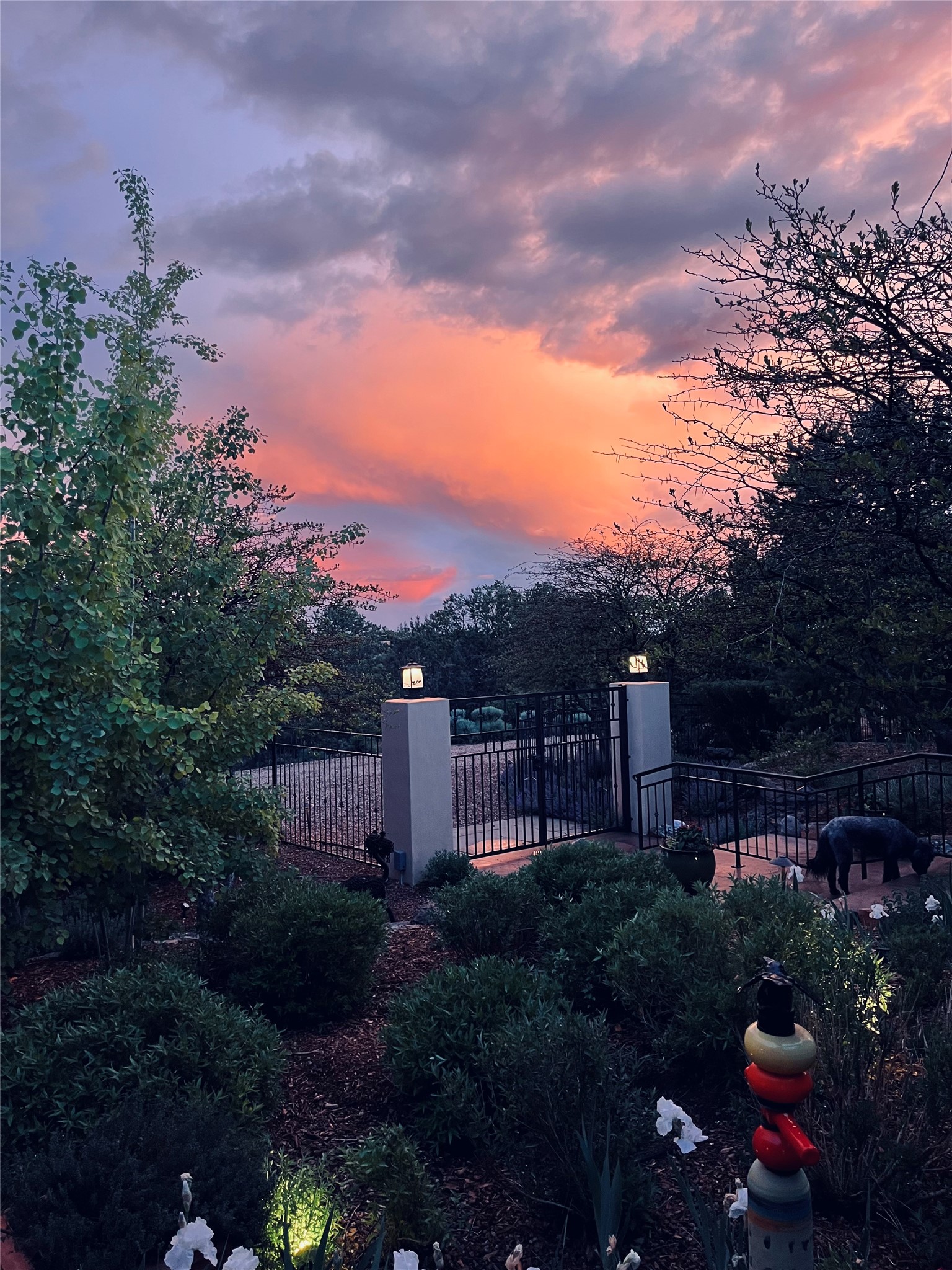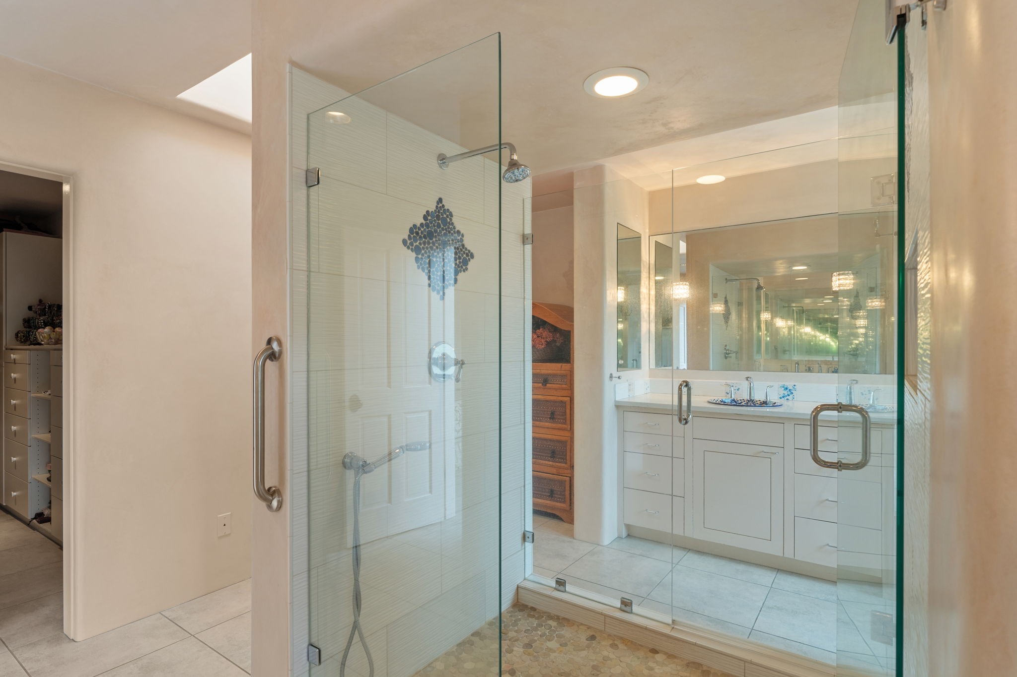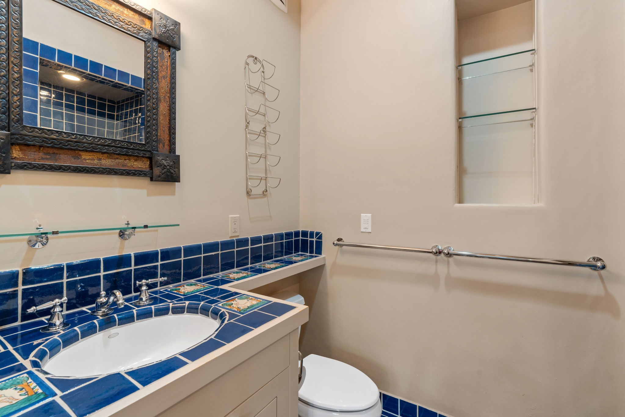 Tucked just a mile from the historic Santa Fe Plaza, this exceptional adobe estate blends classic Northern New Mexico architecture with modern sophistication. Set on a wooded, private property, it features a 3,263 sq. ft. main house and a 1,340 sq. ft. detached casita--ideal for guests or extended family. Handcrafted details abound: viga beams, tile and hardwood floors, and softly curved adobe walls that invite natural light. The great room offers tall ceilings, a grand fireplace, and picture windows framing mountain views. Double doors open to a covered portal with outdoor fireplace and seating for year-round entertaining. Remodeled in 2024, the chef's kitchen includes a six-burner range, convection oven, oversized island, premium appliances, built-in bar, and coffee station--perfect for gatherings large or small. The primary suite is a serene retreat with fireplace, private portal, and spa-style bath with dual closets, double vanities, soaking tub, and glass-enclosed shower. A guest suite, radiant heating, skylights, and seven mini-splits enhance comfort throughout. The detached casita echoes the main home's charm, offering two bedrooms, two baths, a kiva fireplace, wet bar, breakfast nook, and office area--an ideal guest or studio space. Outdoors, multiple patios and sitting areas blend seamlessly with the landscape. A 3,000-gallon cistern supports irrigation, and an EV-ready outlet adds modern convenience. With timeless adobe design, curated upgrades, and proximity to downtown Santa Fe, 1085 Camino Maana captures the essence of refined Southwestern living.
