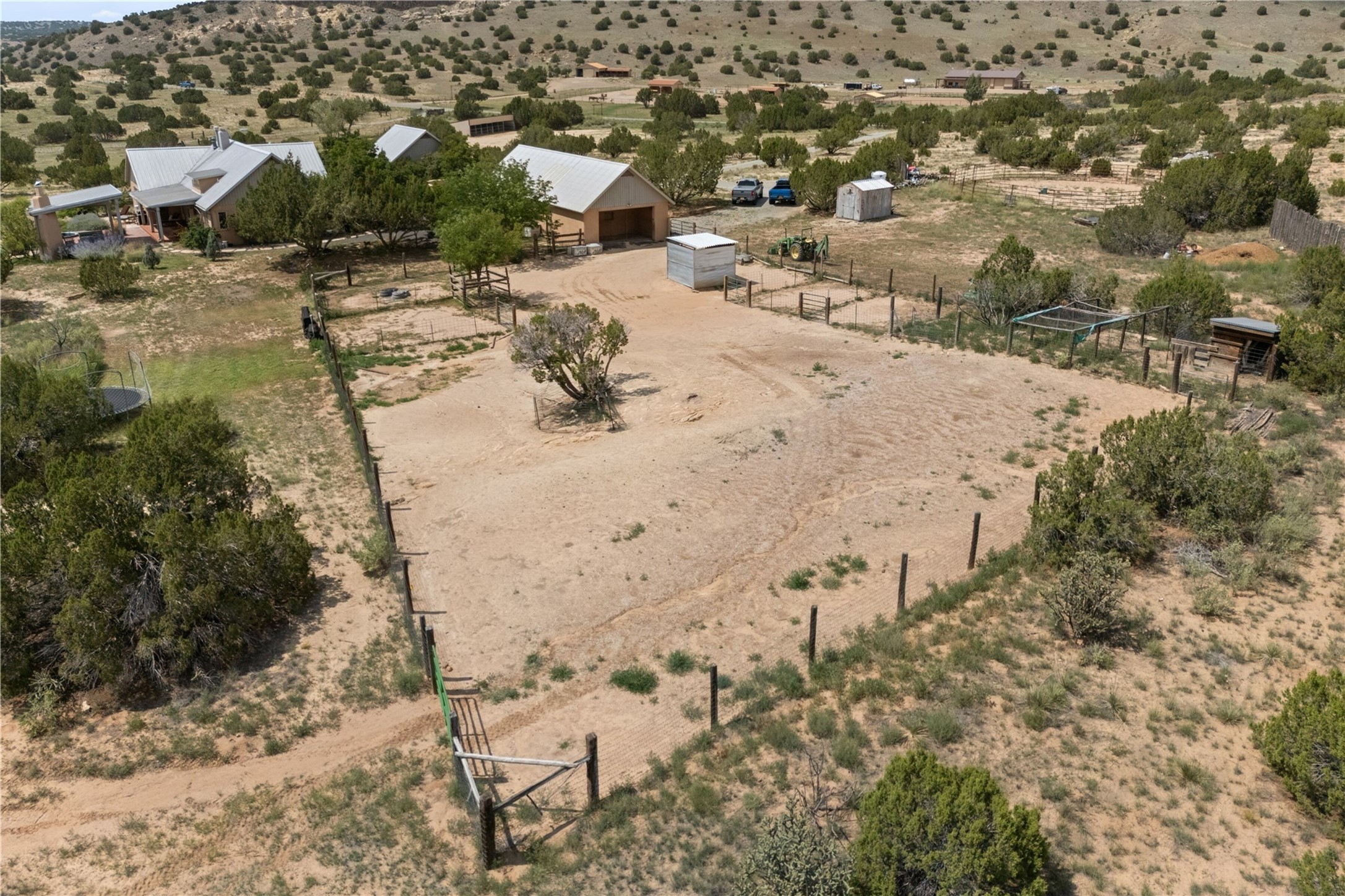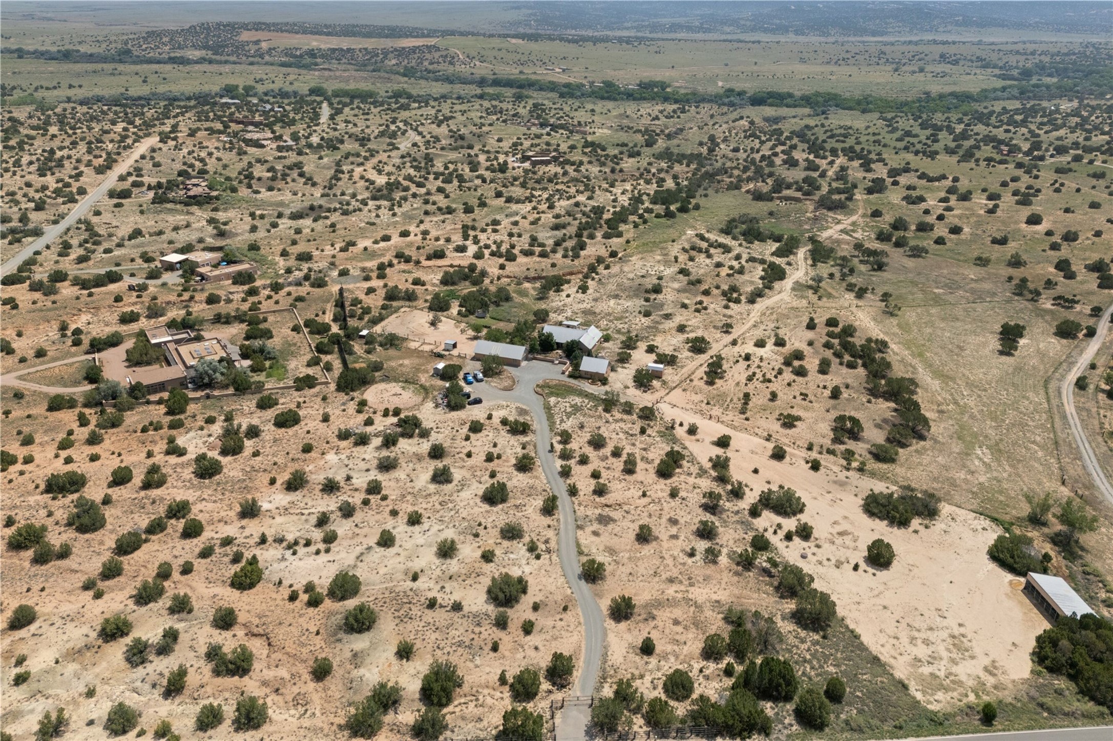 Set within the highly coveted hamlet of Galisteo, this extraordinary 70-acre gated compound offers something increasingly rare: true privacy, panoramic views, and a fully realized equestrian lifestyle -- all within easy reach of Santa Fe. Spanning three contiguous lots, the property delivers both immediate livability and long-term flexibility. The charming Northern New Mexican-style main residence anchors the compound with wood beamed high ceilings, plaster walls, an arched fireplace, two bedrooms, and a sleeping loft. A brick-floored portal extends living space outdoors, where a covered dining area, outdoor fireplace, and hot tub frame sweeping southern views of the Galisteo Basin and the iconic Cerro Pelon Ranch. For the serious equestrian, the property accesses miles of stunning extensive riding, complemented by five fenced interlocking pastures, internal roads, two horse and hay barns, and no restrictions on horse numbers. A detached guest casita, bunkhouse, garden workshop and large two-car garage with extensive storage accommodate guests and equipment with ease. The property has been thoughtfully manicured for horse activity, striking a rare balance between function and serenity. The two adjoining lots preserve unobstructed vistas while offering a compelling opportunity for future expansion. Just minutes from Eldorado shopping amenities and within easy reach of Santa Fe and Albuquerque, Galisteo is celebrated for its historic charm, artistic community, world-renowned neighbors and wide-open high-desert landscapes -- one of Northern New Mexico's most scenic and culturally rich settings.