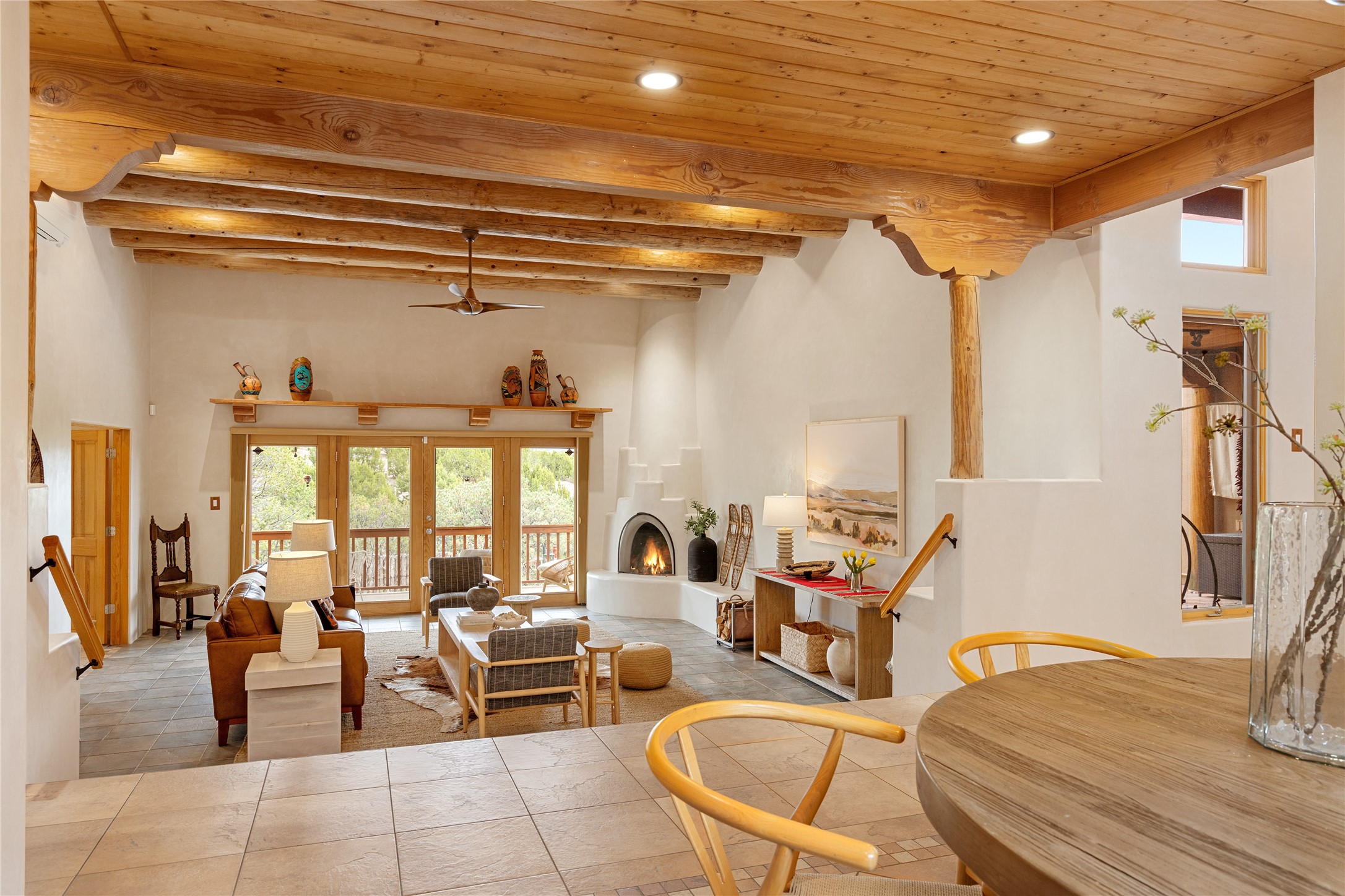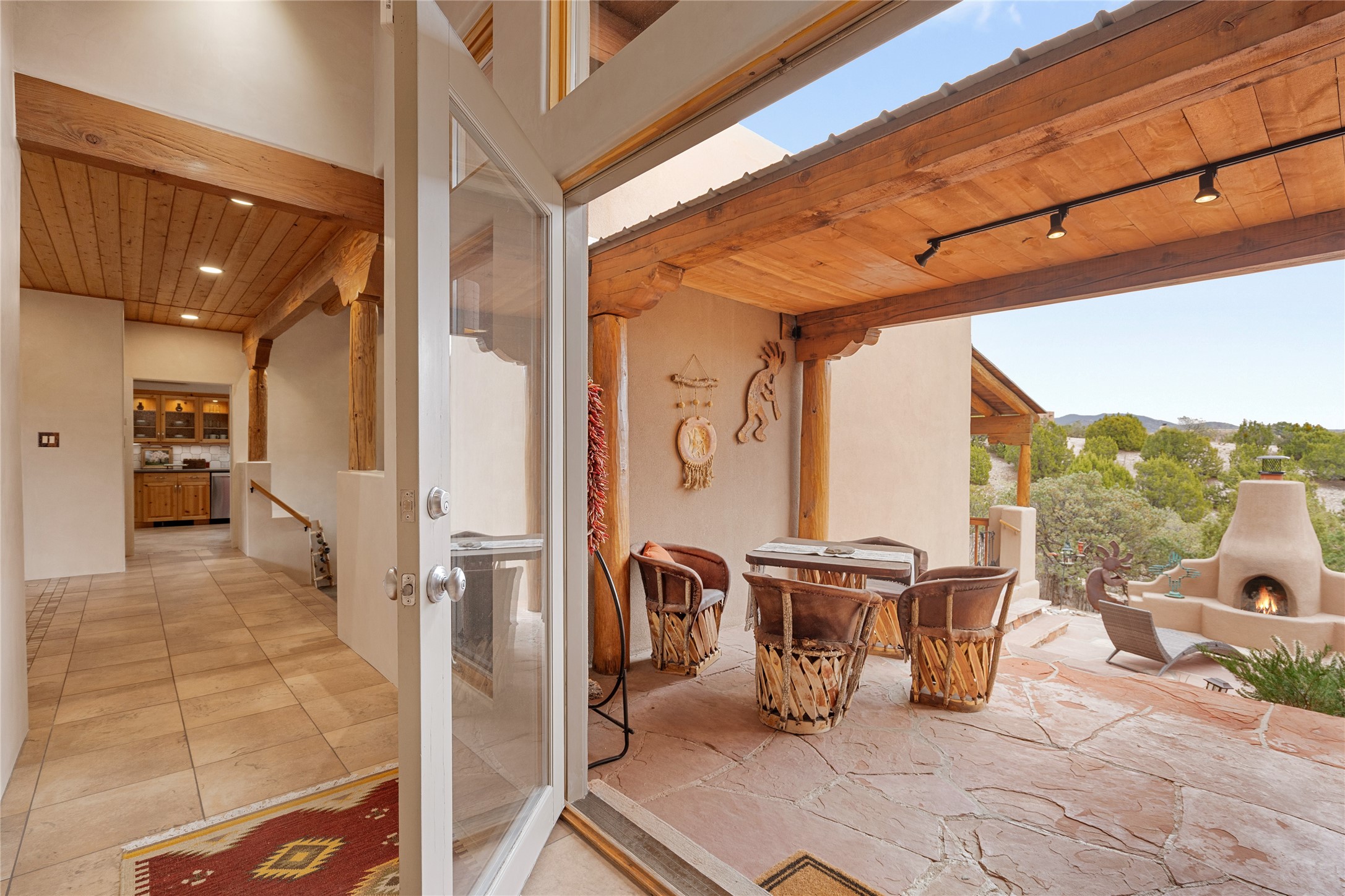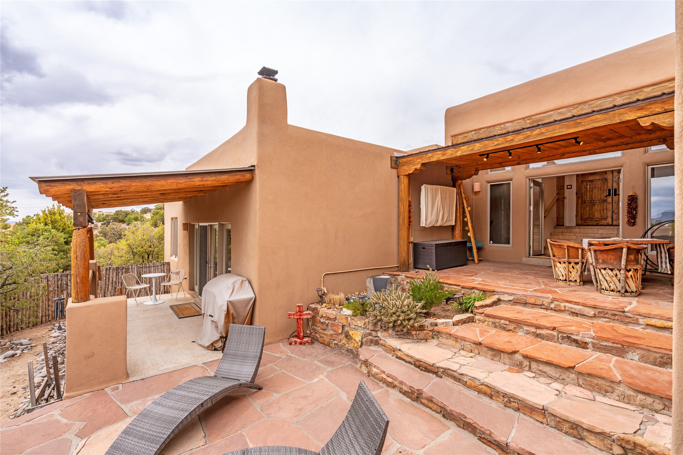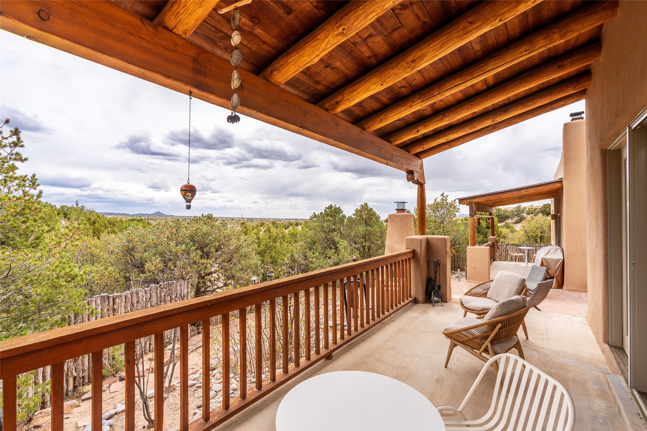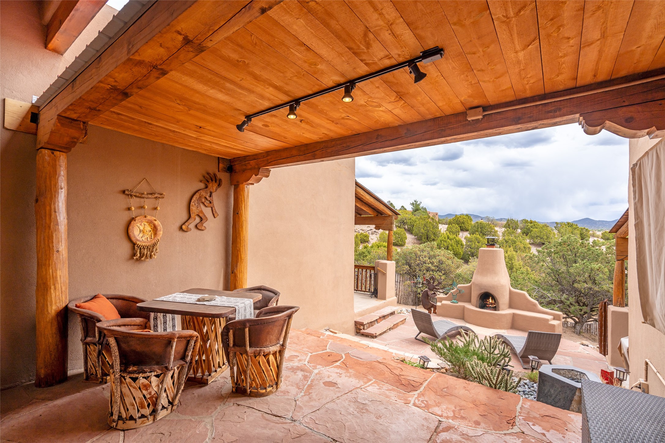 This exceptional custom Pueblo-style residence is positioned to capture sweeping mountain views and city lights across the horizon. Set within the desirable Las Lomas neighborhood, the property is minutes from the historic downtown Plaza and convenient to the Santa Fe River Trail. 1702 Watchpoint is a classic Santa Fe offering that authentically blends New Mexico architecture with modern comfort across 2,745 square feet of thoughtfully designed living space. Hand-carved entry doors open to immediate, expansive views off the patio, a first impression that sets the tone throughout. The living room anchors the main level with a classic kiva fireplace and hand-troweled plaster walls, also, directly off the living room is a flex-space suitable for a home office or studio. The multi-level layout flows naturally from formal dining with recessed lighting to an updated chef's kitchen featuring Silestone quartz countertops, stainless appliances, and a handsome tile backsplash. Many rooms connect to the outdoors, making indoor-outdoor living effortless whether for a quiet morning or a gathering on one of the home's covered portales.The primary suite is a private retreat, complete with a kiva fireplace, walk-in closet, outdoor portal, and spa-inspired bath with deep soaking tub, oversized pebble shower, and dual sinks. Two additional guest rooms share a generous full bath.An oversized two-car garage provides direct kitchen access and a dedicated laundry area. The home has been meticulously maintained and thoughtfully improved -- a full list of upgrades is available upon request. 1702 Watchpoint is a rare opportunity to own one of Las Lomas' finest homes, where authentic Santa Fe character, breathtaking views, and careful stewardship come together in one distinguished property.