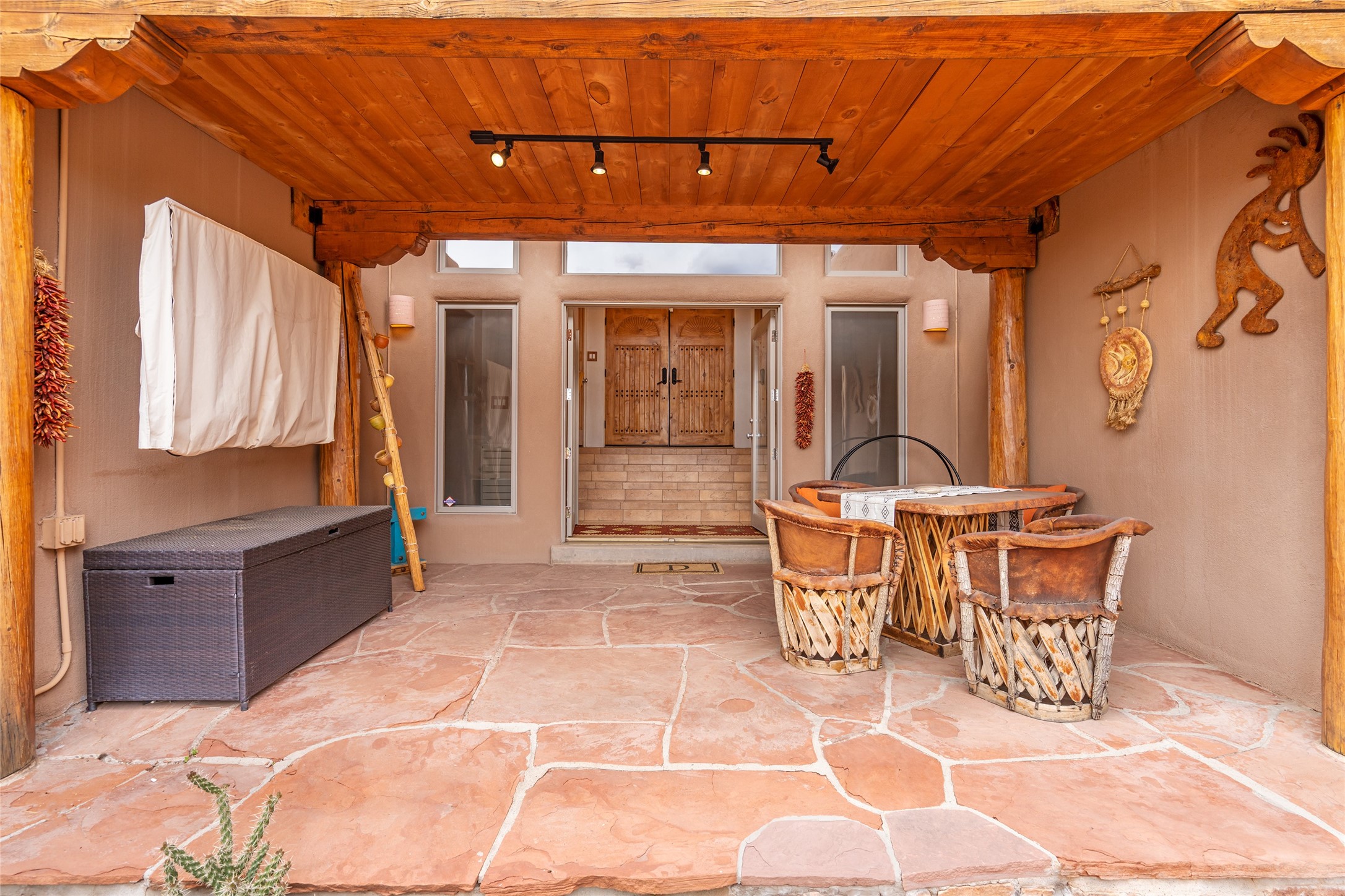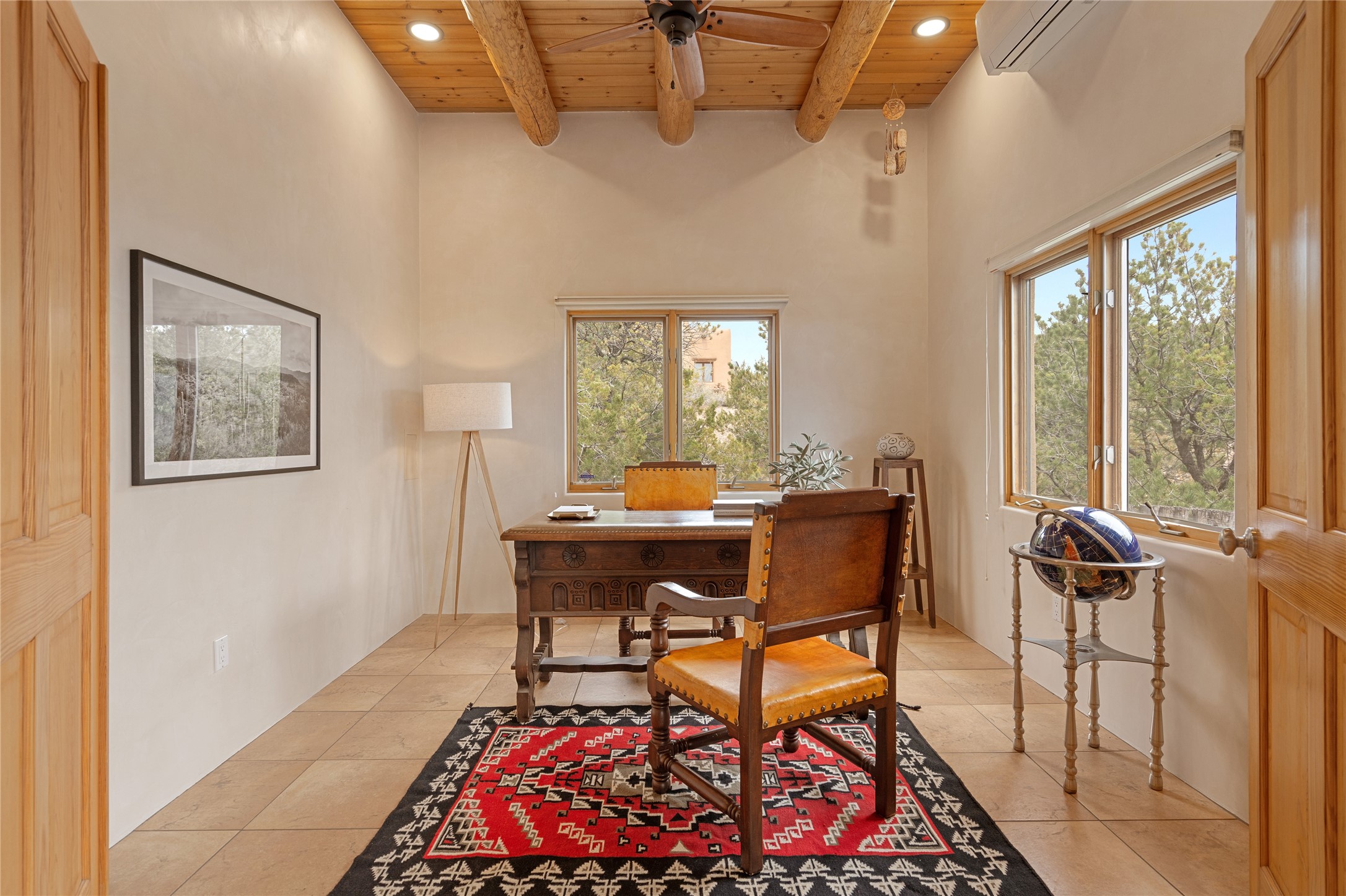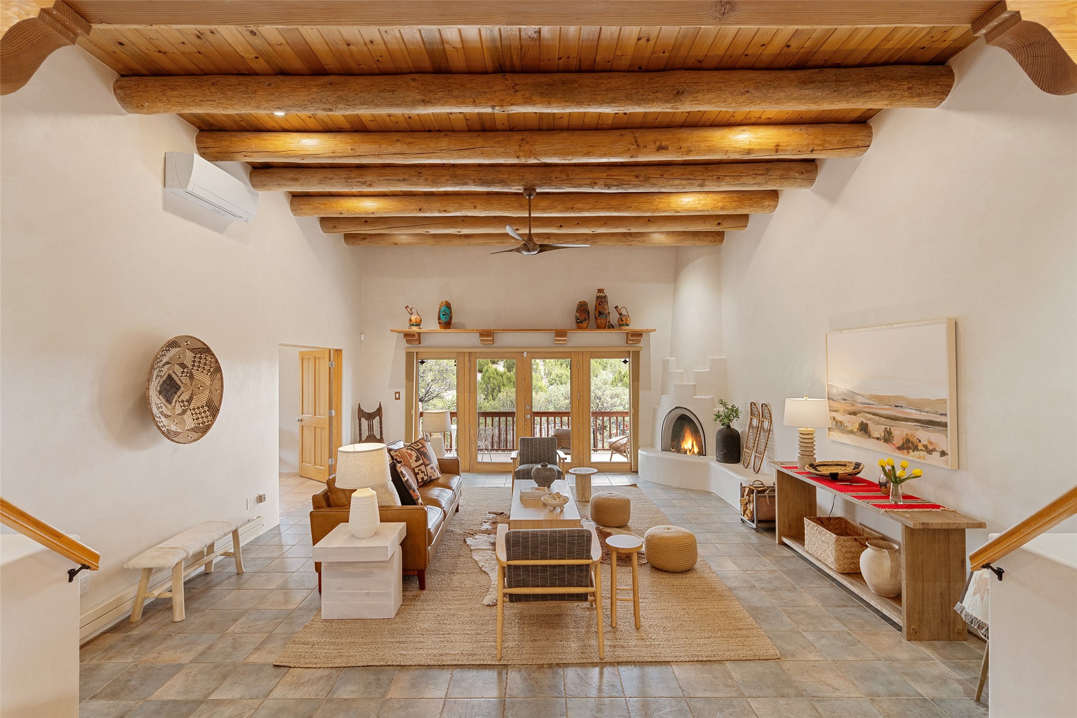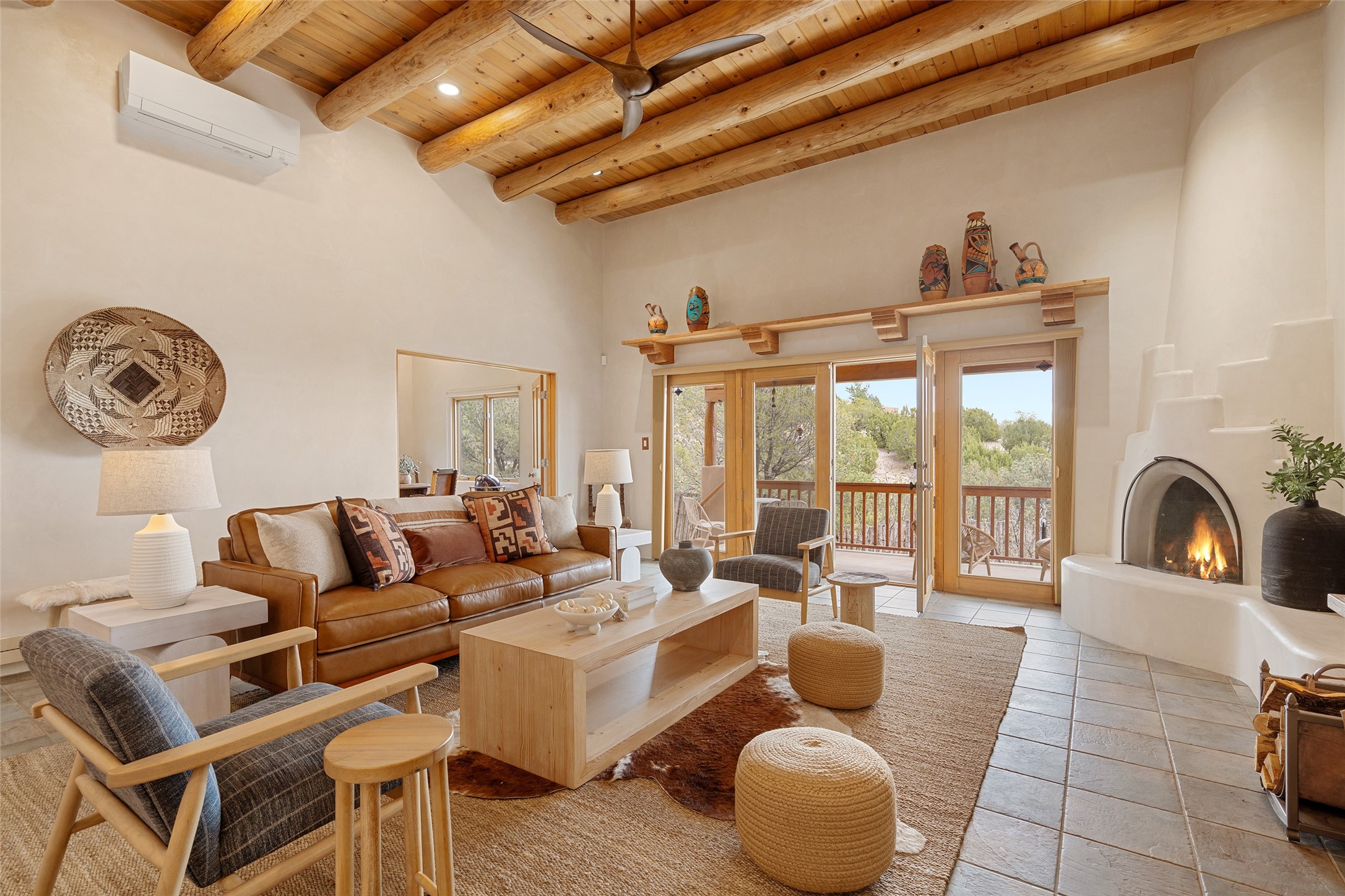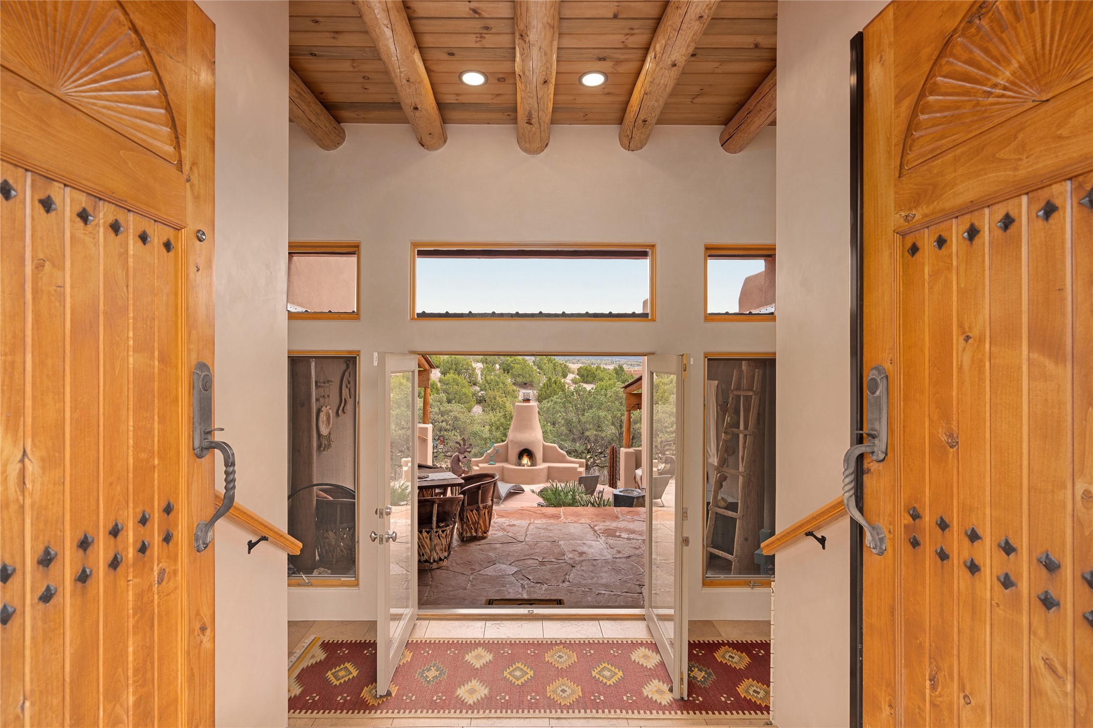 This exceptional custom Pueblo-style residence is positioned to capture sweeping mountain views and city lights across the horizon. Set within the desirable Las Lomas neighborhood, the property is minutes from the historic downtown Plaza and convenient to the Santa Fe River Trail. 1702 Watchpoint is a classic Santa Fe offering that authentically blends New Mexico architecture with modern comfort across 2,745 square feet of thoughtfully designed living space. Hand-carved entry doors open to immediate, expansive views off the patio, a first impression that sets the tone throughout. The living room anchors the main level with a classic kiva fireplace and hand-troweled plaster walls, also, directly off the living room is a flex-space suitable for a home office or studio. The multi-level layout flows naturally from formal dining with recessed lighting to an updated chef's kitchen featuring Silestone quartz countertops, stainless appliances, and a handsome tile backsplash. Many rooms connect to the outdoors, making indoor-outdoor living effortless whether for a quiet morning or a gathering on one of the home's covered portales.The primary suite is a private retreat, complete with a kiva fireplace, walk-in closet, outdoor portal, and spa-inspired bath with deep soaking tub, oversized pebble shower, and dual sinks. Two additional guest rooms share a generous full bath.An oversized two-car garage provides direct kitchen access and a dedicated laundry area. The home has been meticulously maintained and thoughtfully improved -- a full list of upgrades is available upon request. 1702 Watchpoint is a rare opportunity to own one of Las Lomas' finest homes, where authentic Santa Fe character, breathtaking views, and careful stewardship come together in one distinguished property.