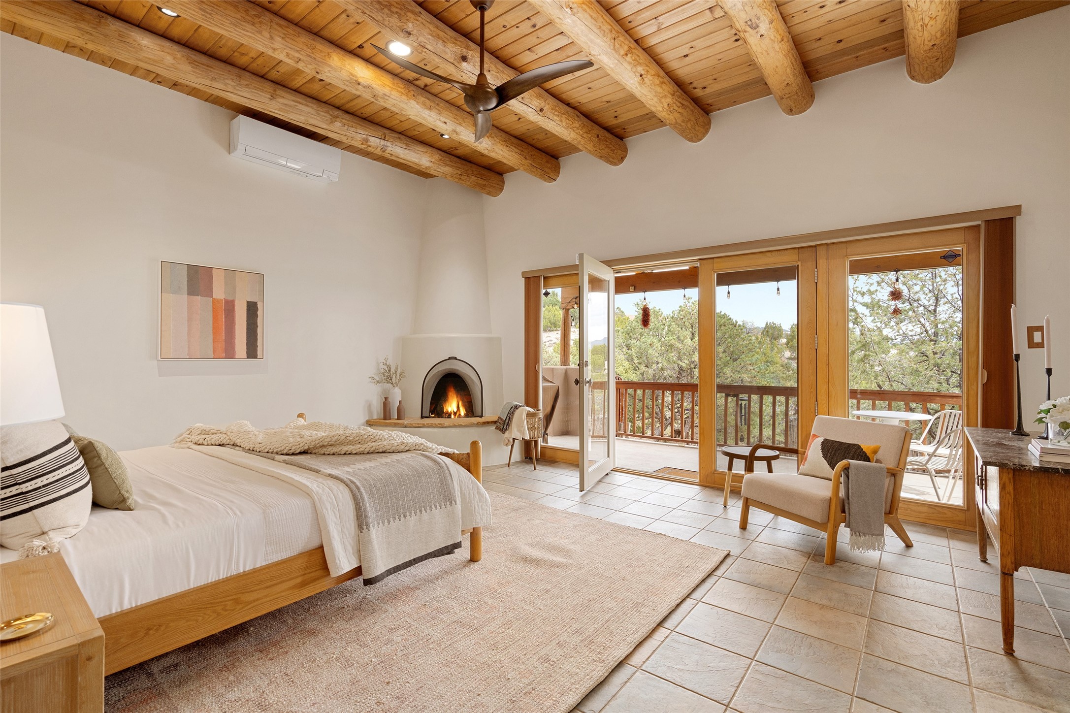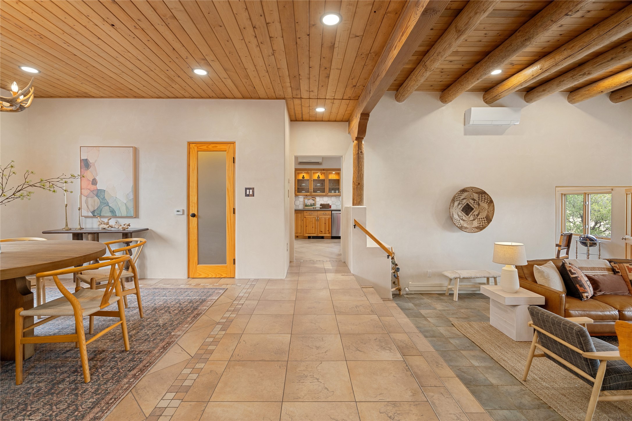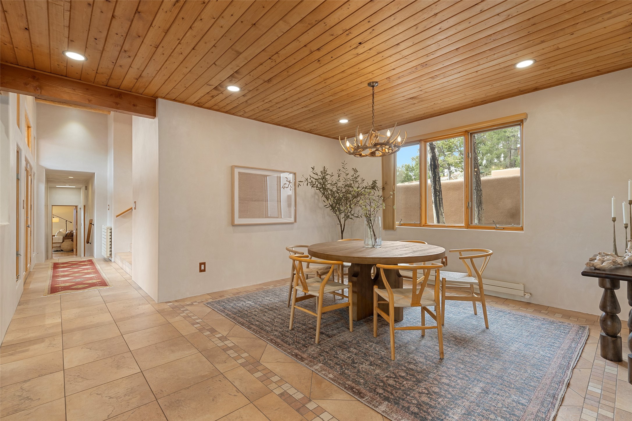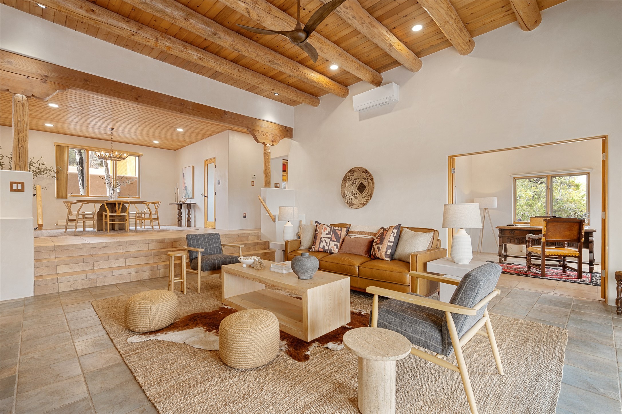 This exceptional custom Pueblo-style residence is positioned to capture sweeping mountain views and city lights across the horizon. Set within the desirable Las Lomas neighborhood, the property is minutes from the historic downtown Plaza and convenient to the Santa Fe River Trail. 1702 Watchpoint is a classic Santa Fe offering that authentically blends New Mexico architecture with modern comfort across 2,745 square feet of thoughtfully designed living space. Hand-carved entry doors open to immediate, expansive views off the patio, a first impression that sets the tone throughout. The living room anchors the main level with a classic kiva fireplace and hand-troweled plaster walls, also, directly off the living room is a flex-space suitable for a home office or studio. The multi-level layout flows naturally from formal dining with recessed lighting to an updated chef's kitchen featuring Silestone quartz countertops, stainless appliances, and a handsome tile backsplash. Many rooms connect to the outdoors, making indoor-outdoor living effortless whether for a quiet morning or a gathering on one of the home's covered portales.The primary suite is a private retreat, complete with a kiva fireplace, walk-in closet, outdoor portal, and spa-inspired bath with deep soaking tub, oversized pebble shower, and dual sinks. Two additional guest rooms share a generous full bath.An oversized two-car garage provides direct kitchen access and a dedicated laundry area. The home has been meticulously maintained and thoughtfully improved -- a full list of upgrades is available upon request. 1702 Watchpoint is a rare opportunity to own one of Las Lomas' finest homes, where authentic Santa Fe character, breathtaking views, and careful stewardship come together in one distinguished property.